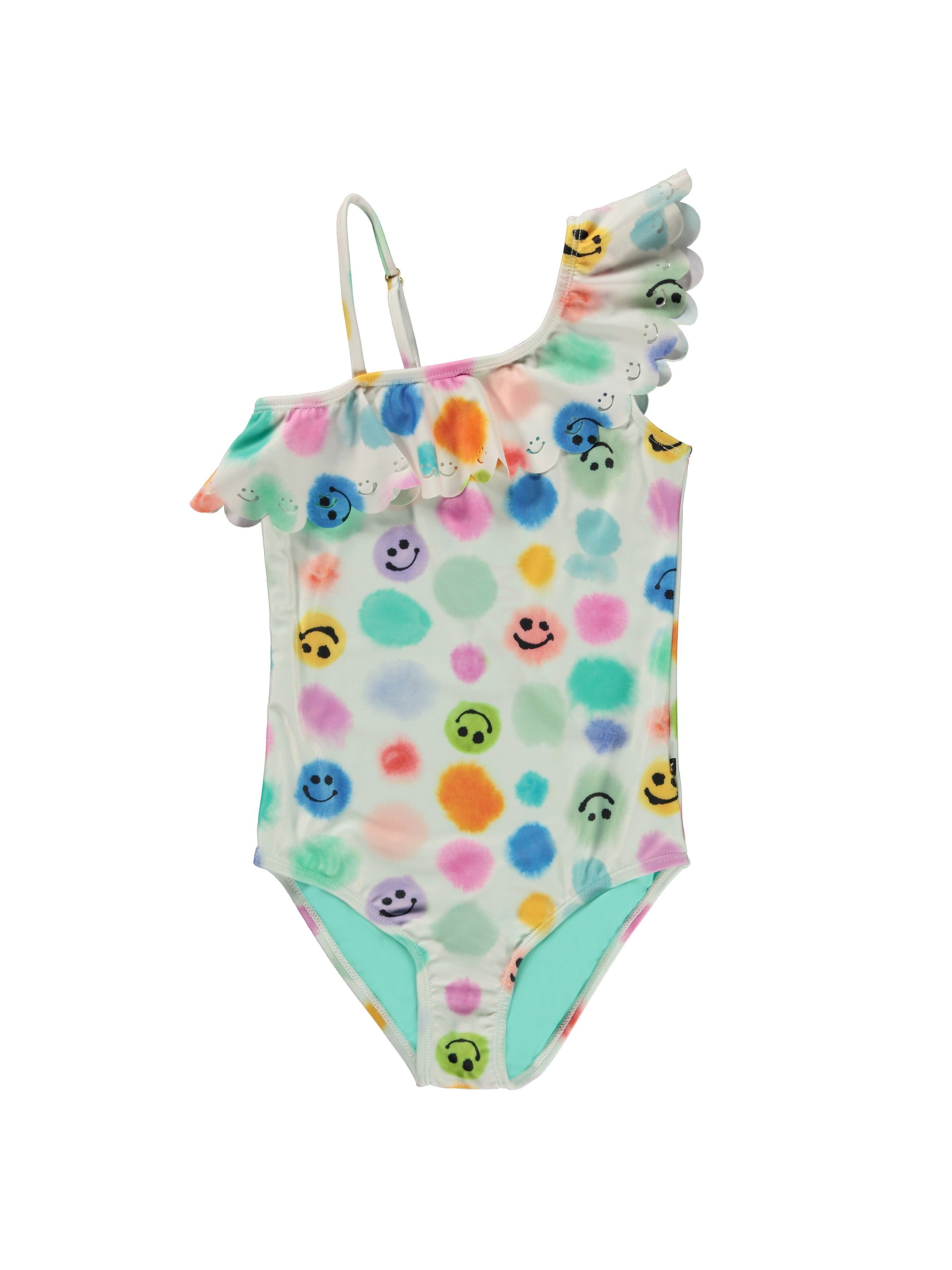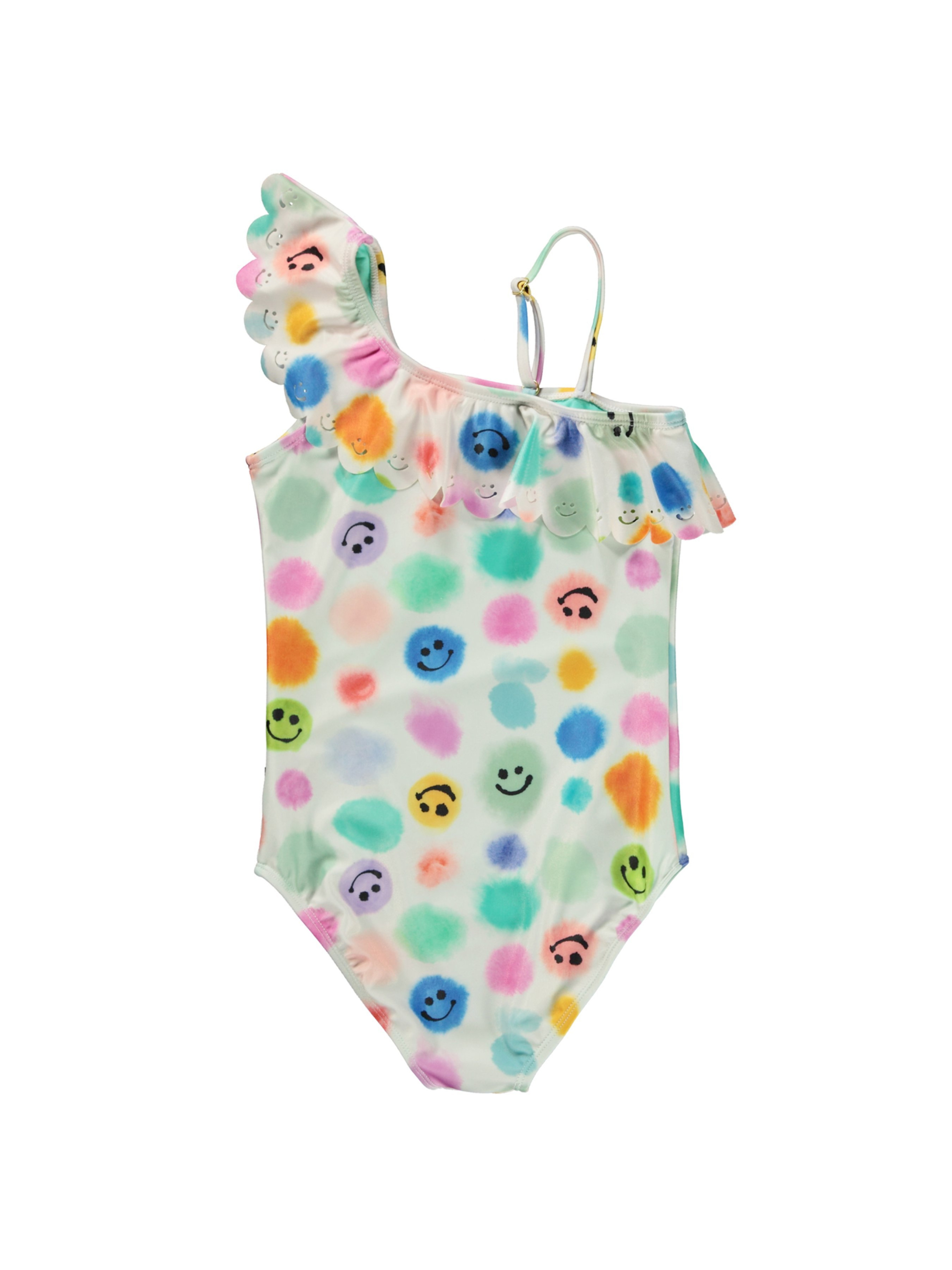 Закрытый купальник Molo "Net Painted Dots". Особенности: защита от ультрафиолетового излучения – UPF 50+; содержит не менее 50% полиэстера из переработанных материалов, сертифицированного GRS (Global Recycled Standard)*; декорировано оборками и сплошным принтом – разноцветные точки и счастливые эмодзи; асимметричный дизайн; тонкая регулируемая бретелька на одном плече. Купальник Molo – это отличный выбор для купания, отдыха на пляже и ярких фотосессий юной леди. *GRS – это международный и добровольный стандарт, проверяющий и отслеживающий переработанные материалы от исходного сырья до конечного продукта.