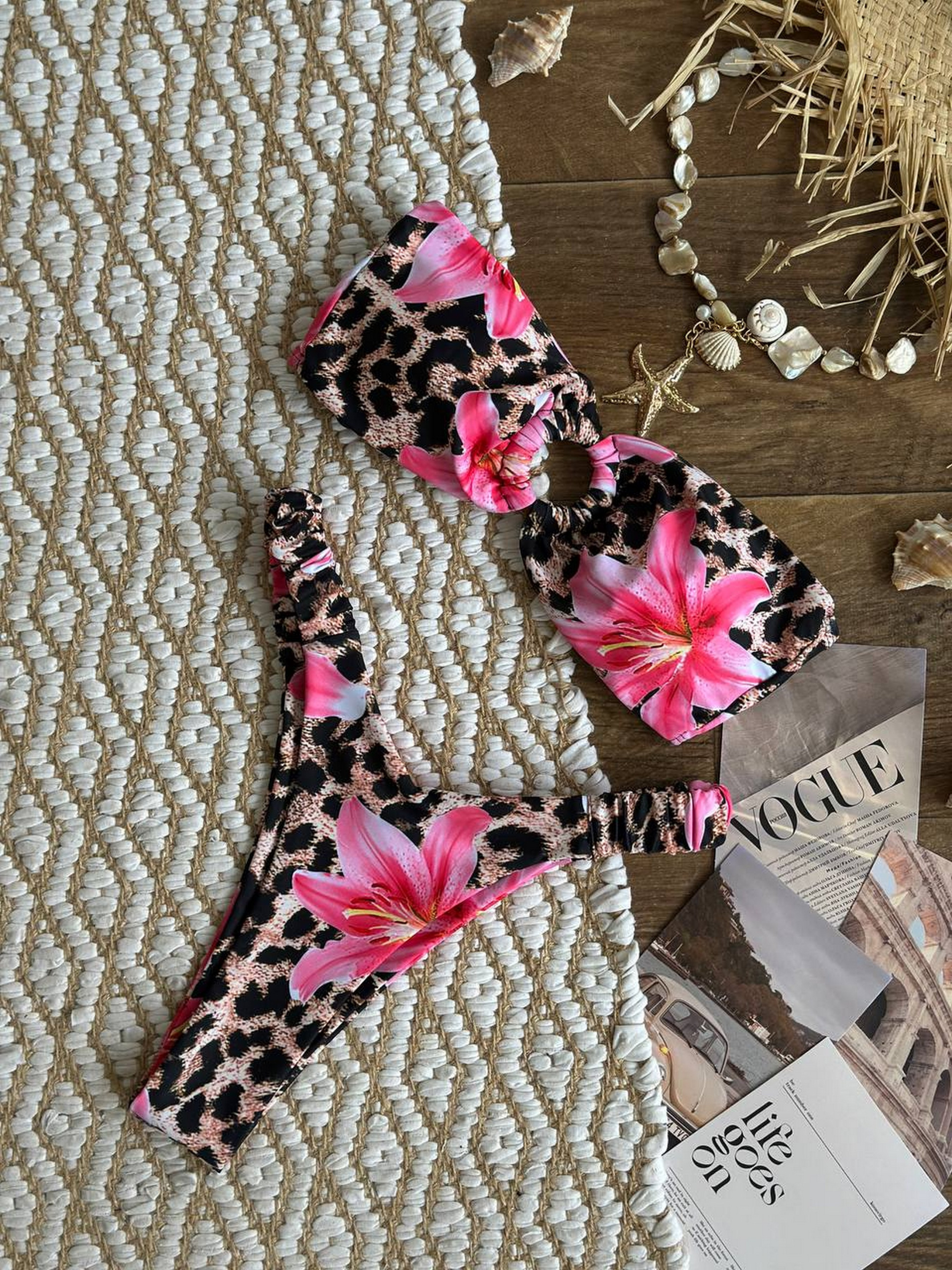 Раздельный женский купальник Трендовый принт с леопардом и цветами + акцент на бюсте с декоративным кольцом = твой пляжный must-have этим летом! Бюст бандо без бретелей – идеально для ровного загара. Поролоновые чашки в бюсте. Трусики с высокой V-посадкой – визуально удлиняют ноги и подчеркивают талию. Плотная ткань бифлекс, которая держит форму и не просвечивает. Размерная сетка: S: грудь 85-91, бедра 86-94 М: грудь 90-94, бедра 94-98 L : грудь 95-98, бедра 98-105 Товар обмену и возврату не подлежит!