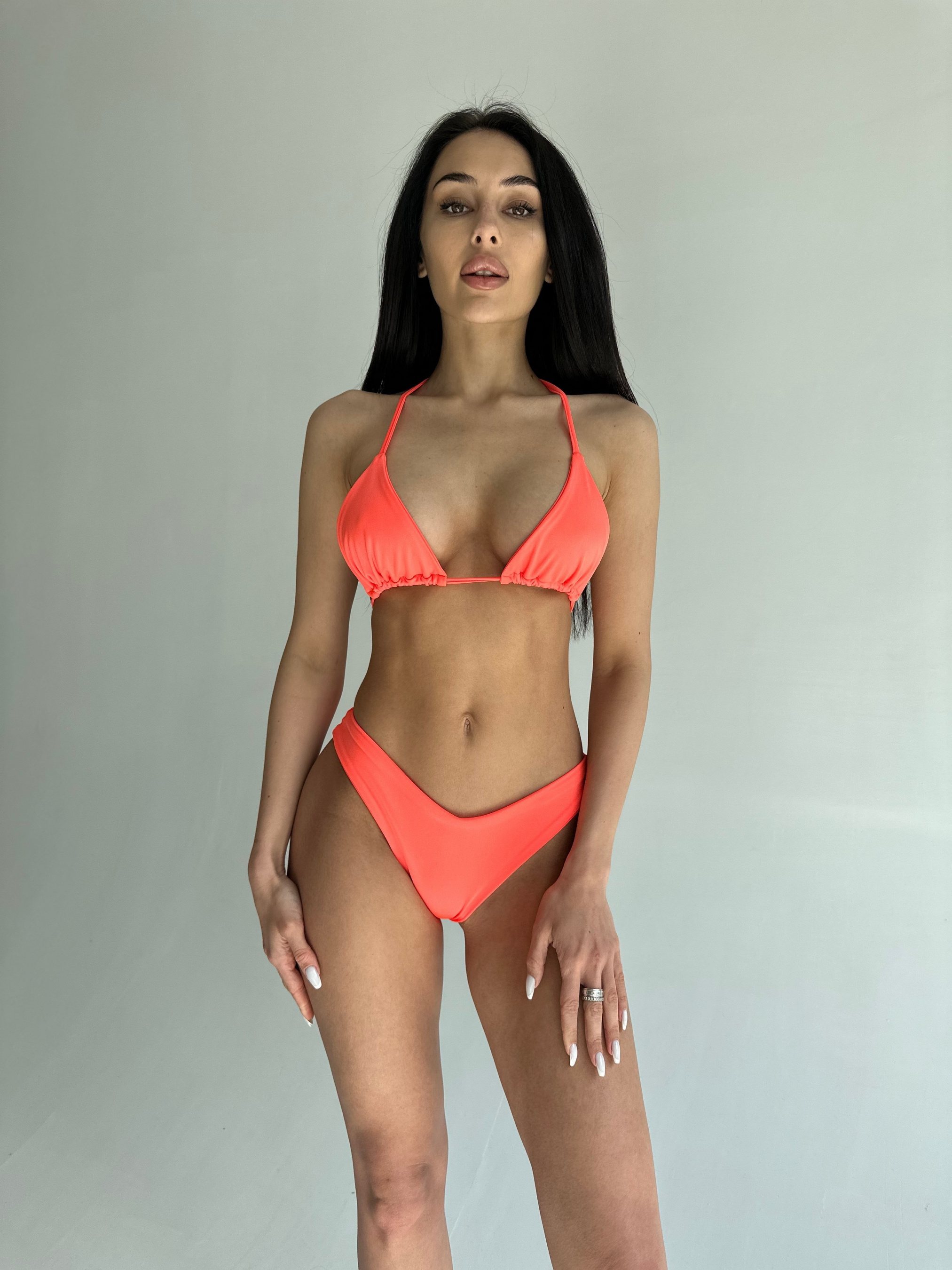 Женский раздельный купальник для бассейна и пляжного отдыха. Треугольная форма верха на тонких завязках. Плавки стринги на средней посадке. Купальник изготовлен из прочного, быстросохнущего, высококачественного материала. Ткань не линяет и не выгорает на солнце. Купальник без карманов для чашек вкладышей.