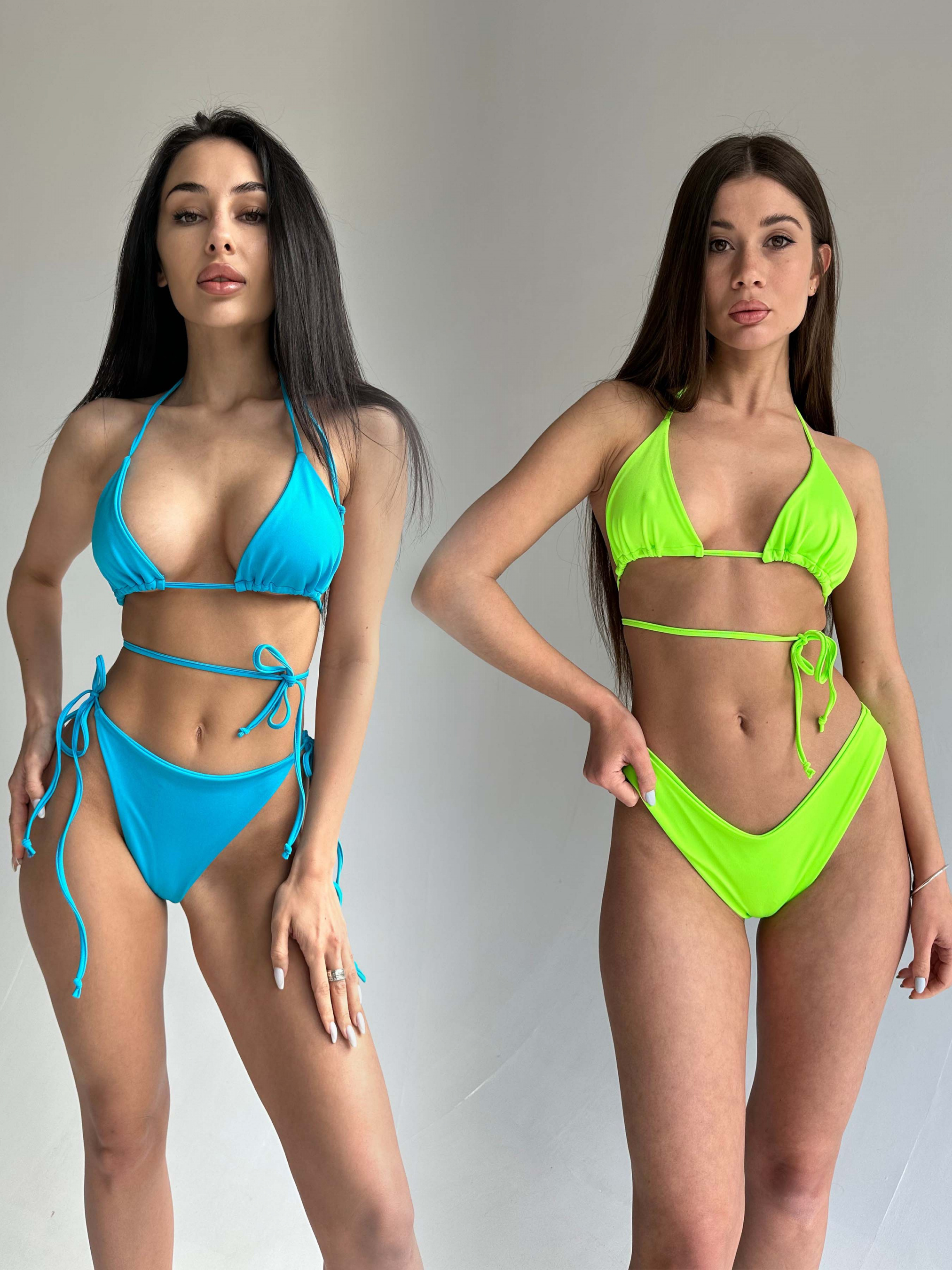 Женский комплект из двух раздельных купальников для бассейна и пляжного отдыха. Треугольная форма верха на тонких завязках. Плавки стринги на средней посадке и плавки стринги на завязках. Купальники изготовлены из прочного, быстросохнущего, высококачественного материала. Ткань не линяет и не выгорает на солнце. Купальники без карманов для чашек вкладышей.