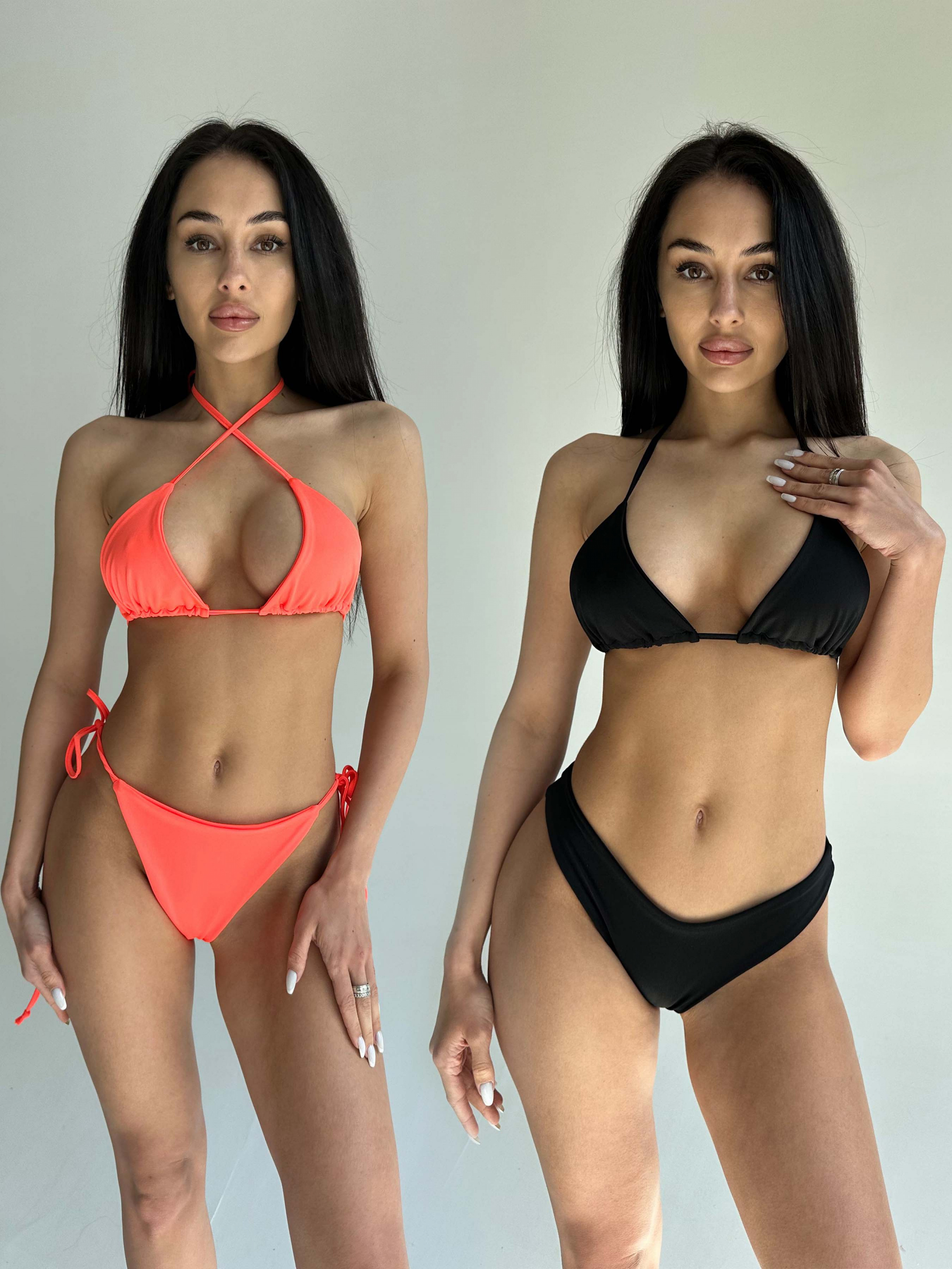 Женский комплект из двух раздельных купальников для бассейна и пляжного отдыха. Треугольная форма верха на тонких завязках. Плавки стринги на средней посадке и плавки стринги на завязках. Купальники изготовлены из прочного, быстросохнущего, высококачественного материала. Ткань не линяет и не выгорает на солнце. Купальники без карманов для чашек вкладышей.