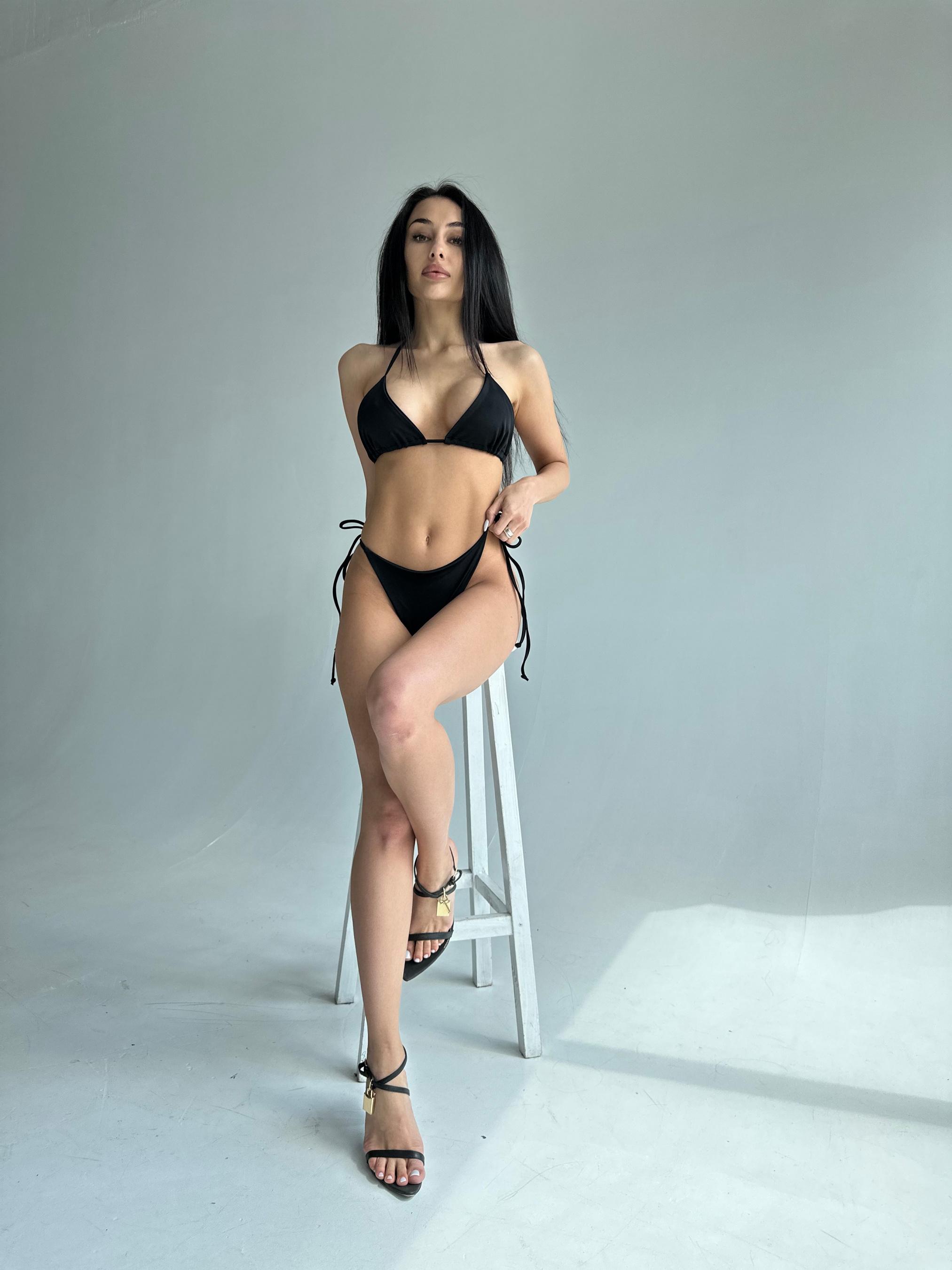 Женский комплект из двух раздельных купальников для бассейна и пляжного отдыха. Треугольная форма верха на тонких завязках. Плавки стринги на средней посадке и плавки стринги на завязках. Купальники изготовлены из прочного, быстросохнущего, высококачественного материала. Ткань не линяет и не выгорает на солнце. Купальники без карманов для чашек вкладышей.