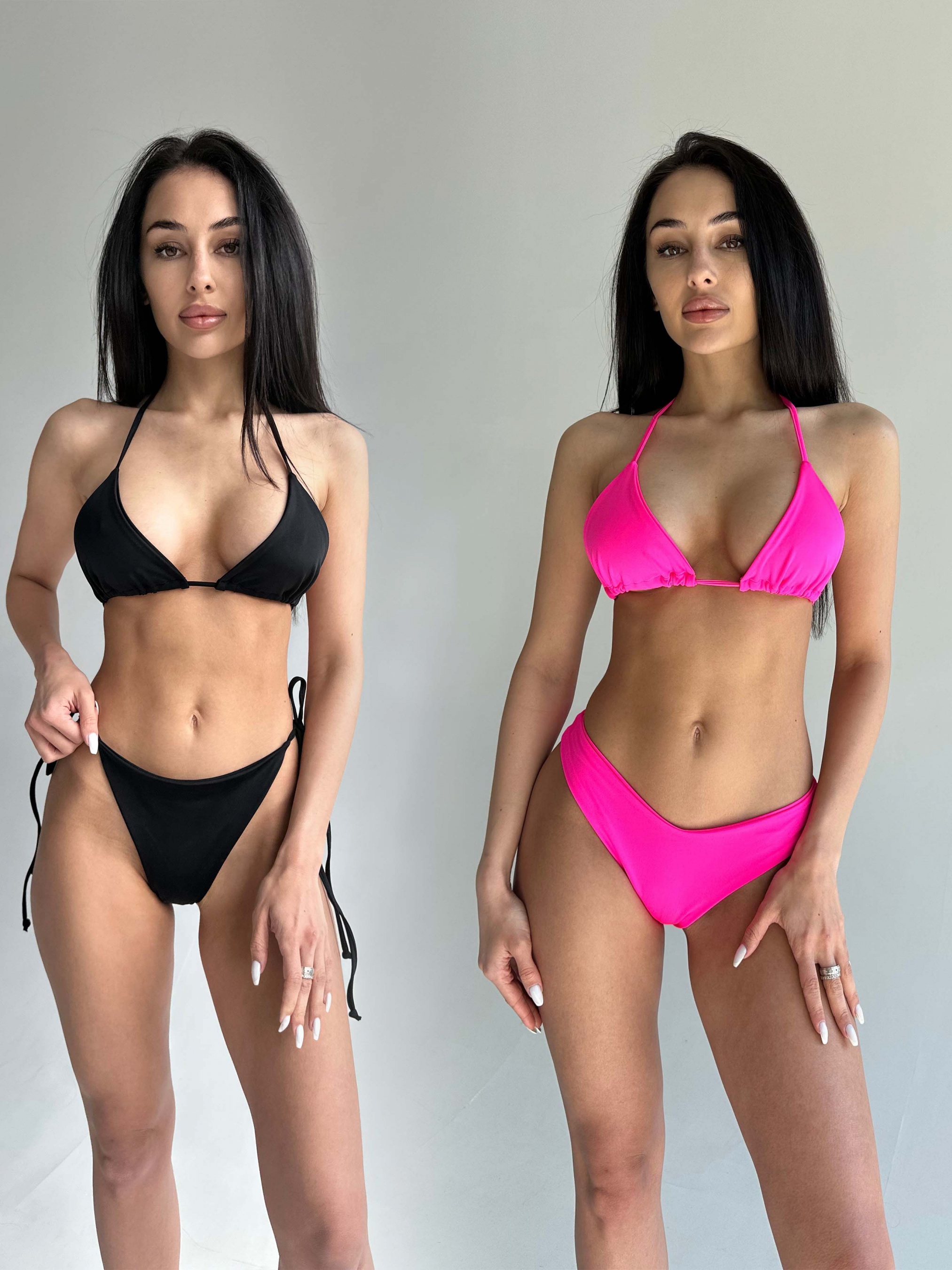 Женский комплект из двух раздельных купальников для бассейна и пляжного отдыха. Треугольная форма верха на тонких завязках. Плавки стринги на средней посадке и плавки стринги на завязках. Купальники изготовлены из прочного, быстросохнущего, высококачественного материала. Ткань не линяет и не выгорает на солнце. Купальники без карманов для чашек вкладышей.
