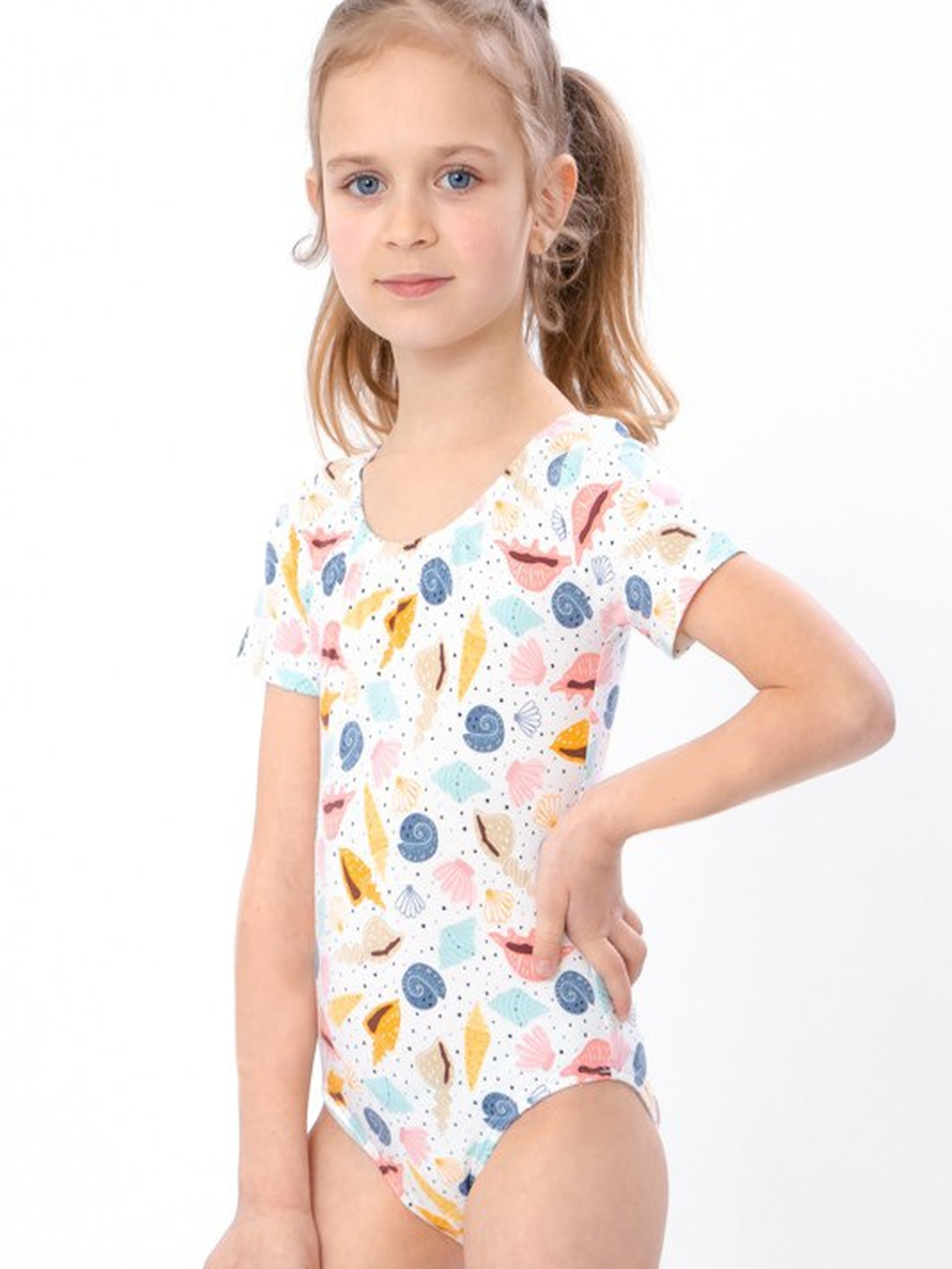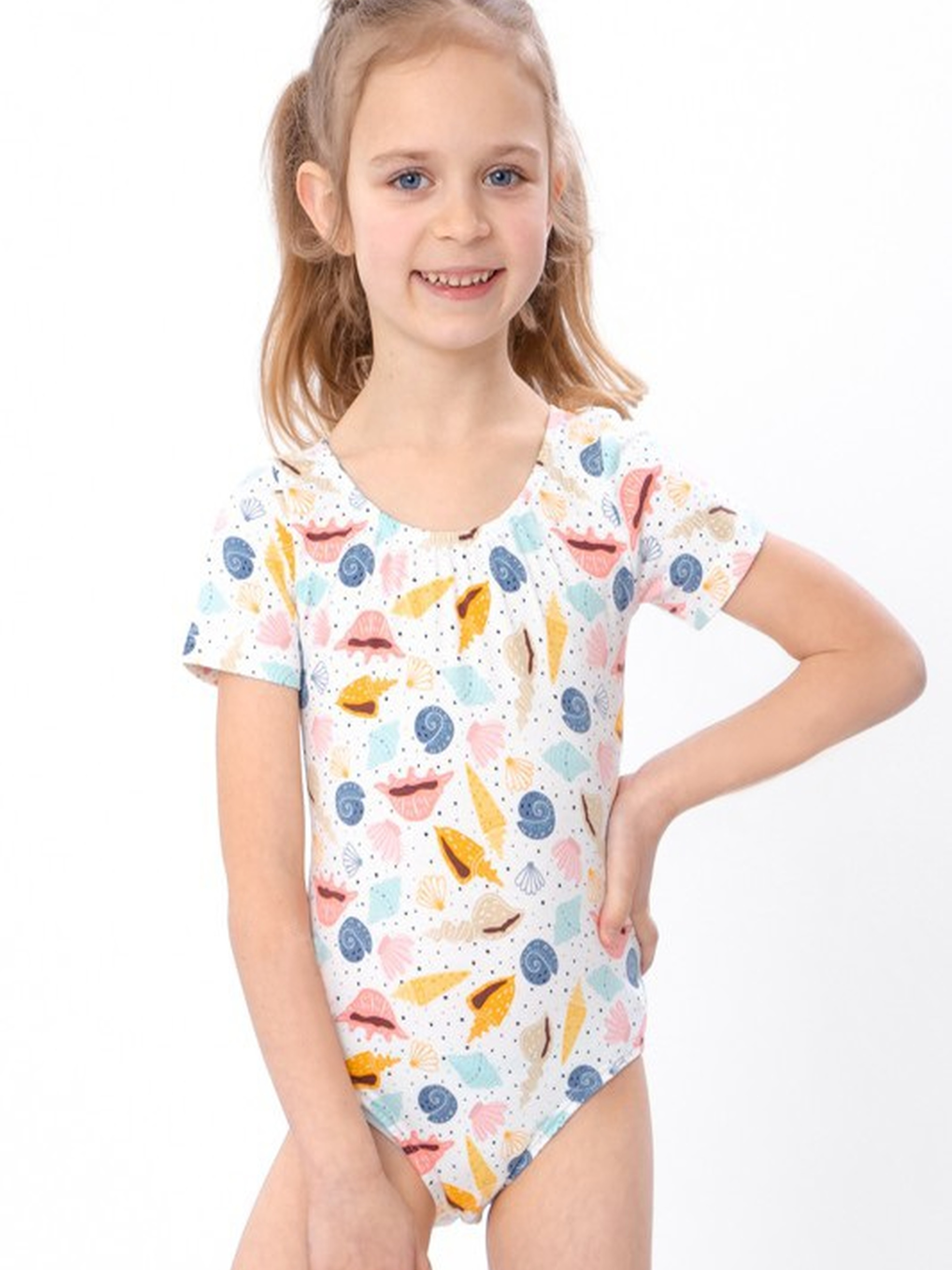 Полотно: фулікра принтована Склад полотна: 95% бавовна, 5% лайкра Зріст: 104-134 Купальник для дівчинки з коротким рукавом — комфортна та мила модель для літнього відпочинку. Виготовлений із м’якої бавовняної тканини з додаванням лайкри, він приємно прилягає до тіла та не сковує рухів. Представлений у двох ніжних варіантах принтів: "Мушлі" і "Сердечка", обидва — на молочному фоні. Доступний для дівчаток на зріст від 104 до 134 см.