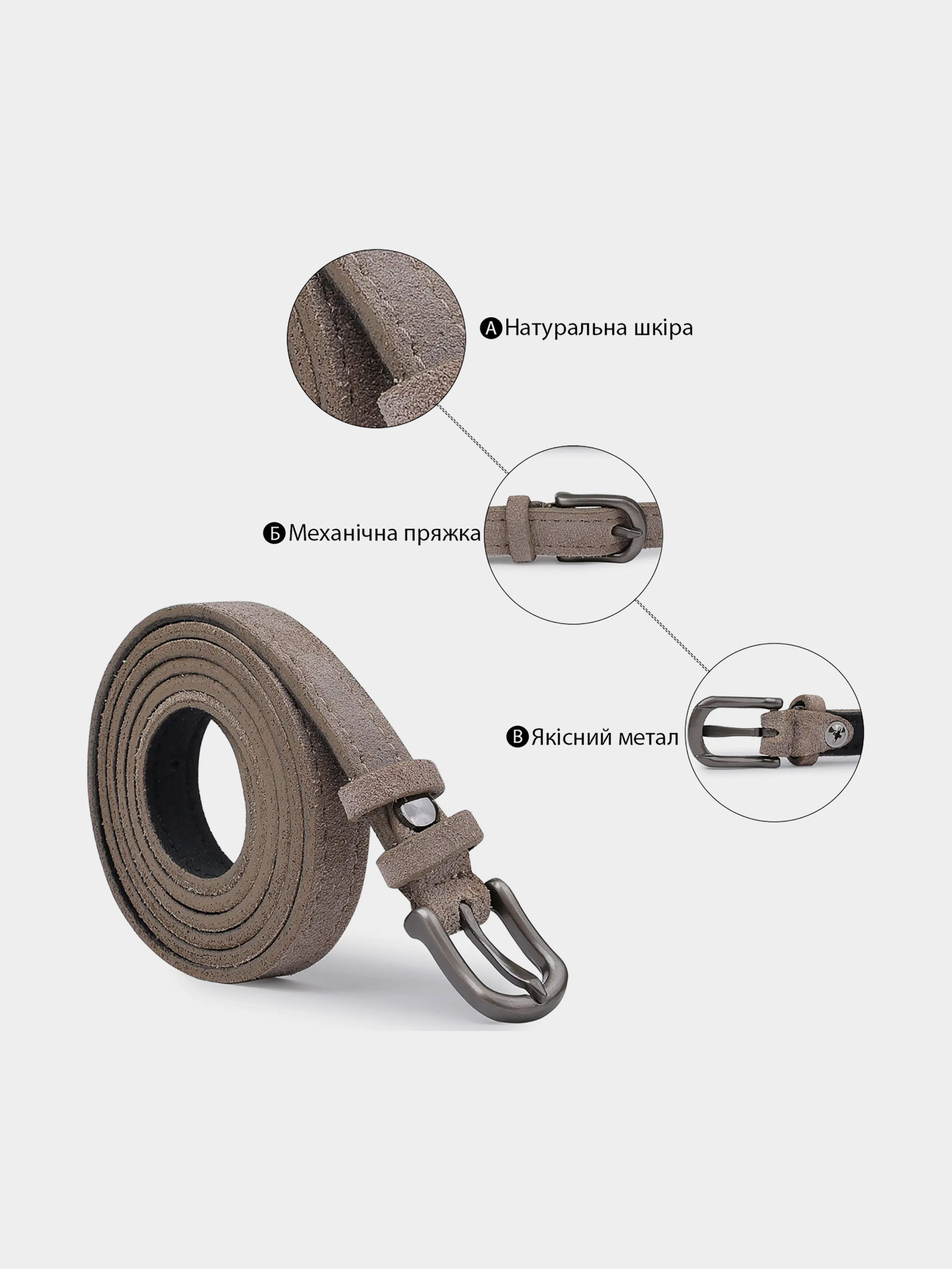 Материал: натуральная кожа. Цвет: серый. Размер: ширина 1,4 см; Длина: 115 см ; Страна производитель: Украина. Бренд: Vintage. Интересный женский тонкий ремень от украинского производителя. Имеет красивый светло-серый цвет, приятную на ощупь фактуру и классическую пряжку. Материал изготовления натуральная высококачественная кожа с отличными показателями износостойкости. Такой ремешок дополнит Ваш образ и станет любимым аксессуаром в Вашем гардеробе.