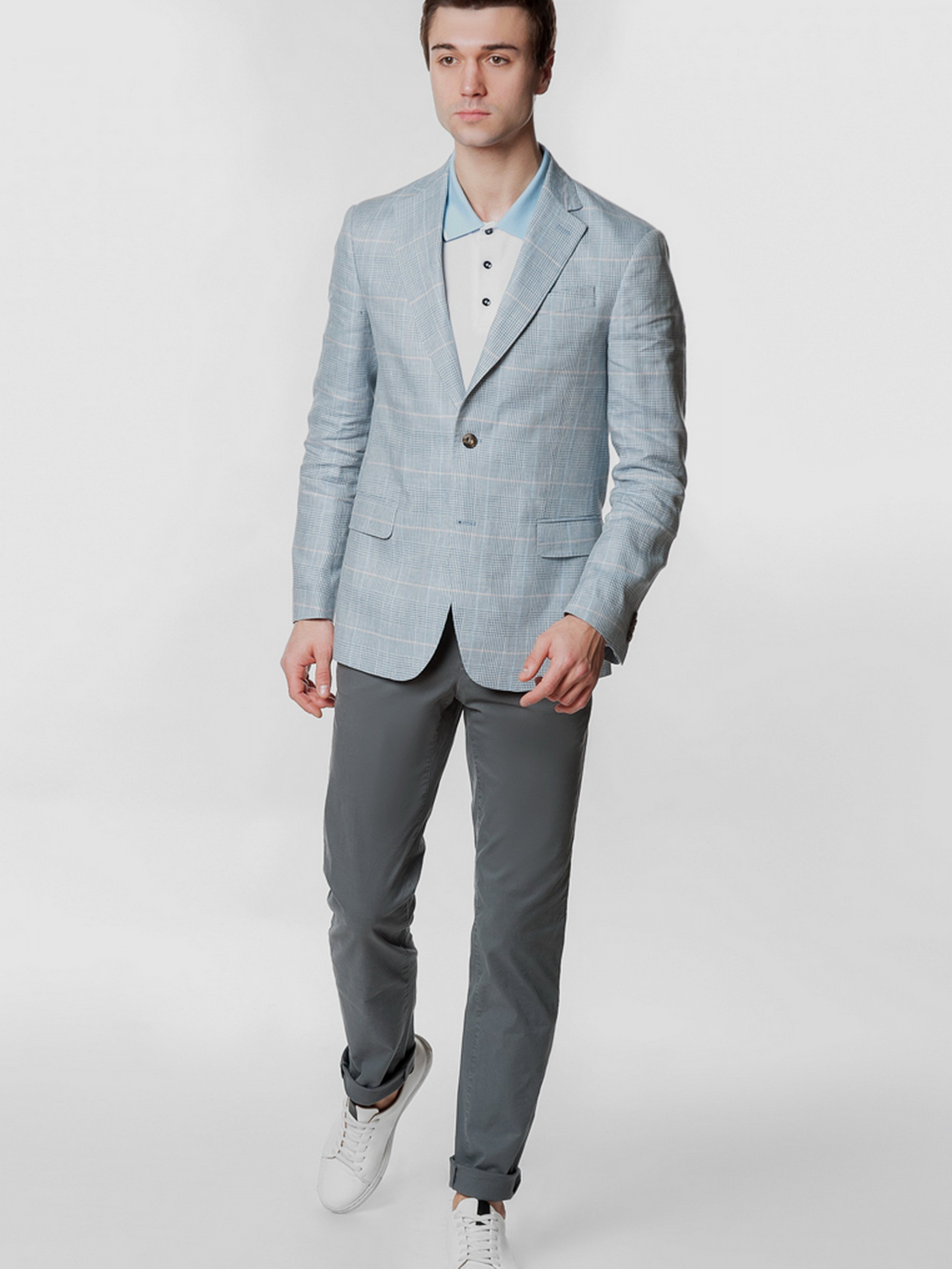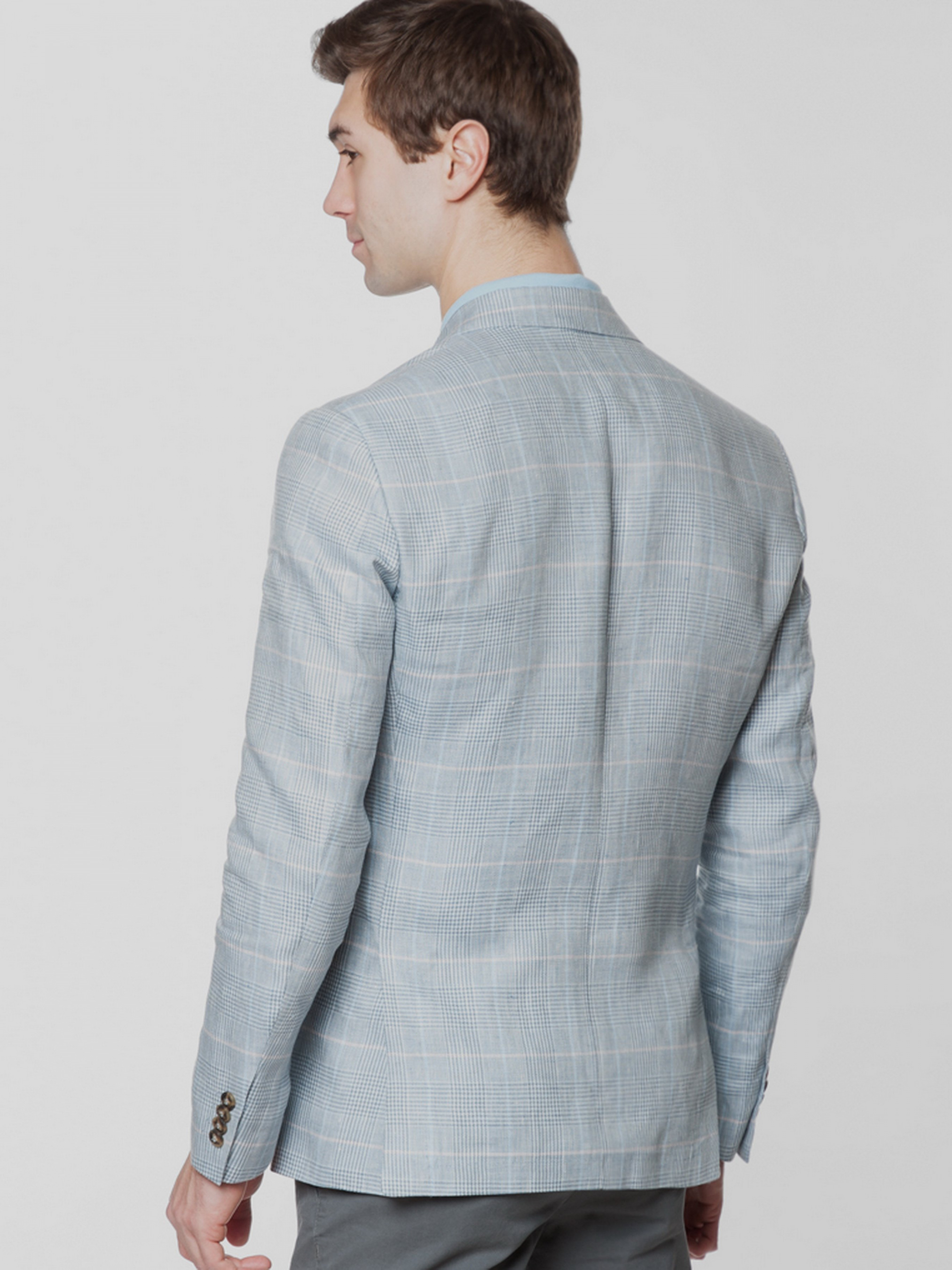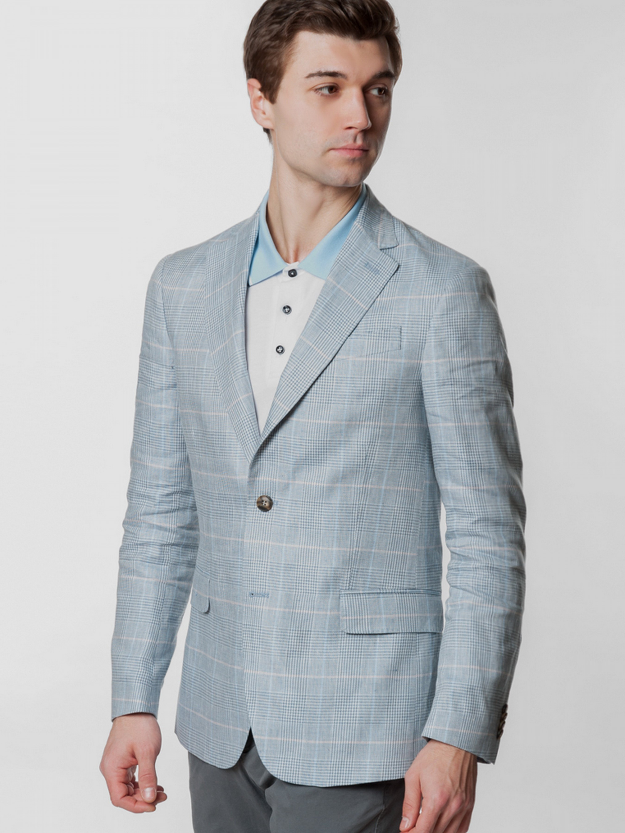 Мужской пиджак в клетку от Gregory Arber создан из натуральной дышащей ткани на основе льна. Модель пиджака, на укороченной подкладке, что делает его подходящим для теплых солнечных дней, полуприлегающий силуэт с плавной линией плеча, прорезные карманы с клапаном, прямой лацкан и две шлицы. Пиджак прекрасно сочетается с брюками из хлопка или льна, дополнить образ можно тонким трикотажем, сорочкой casual и неформальной обувью.