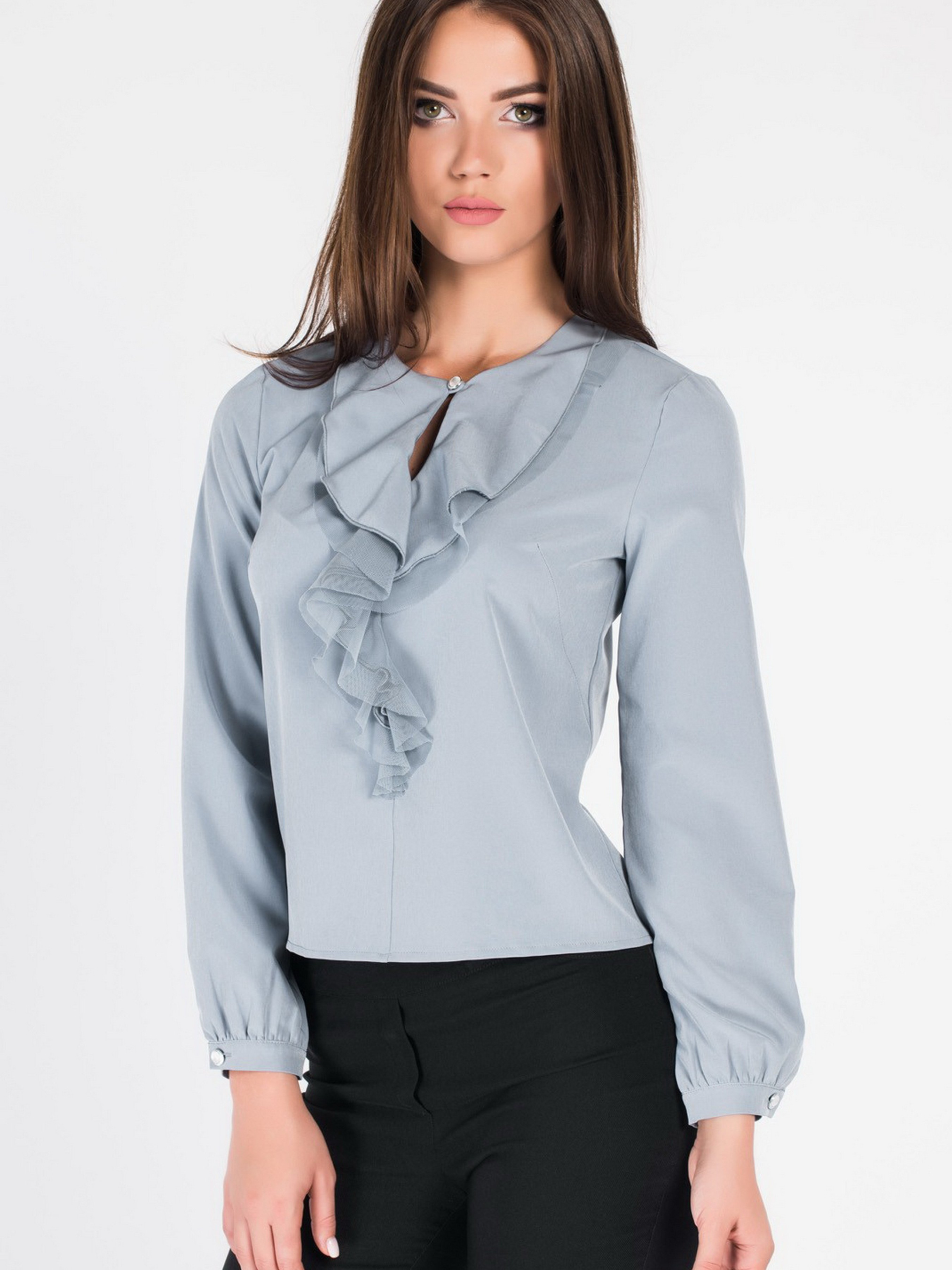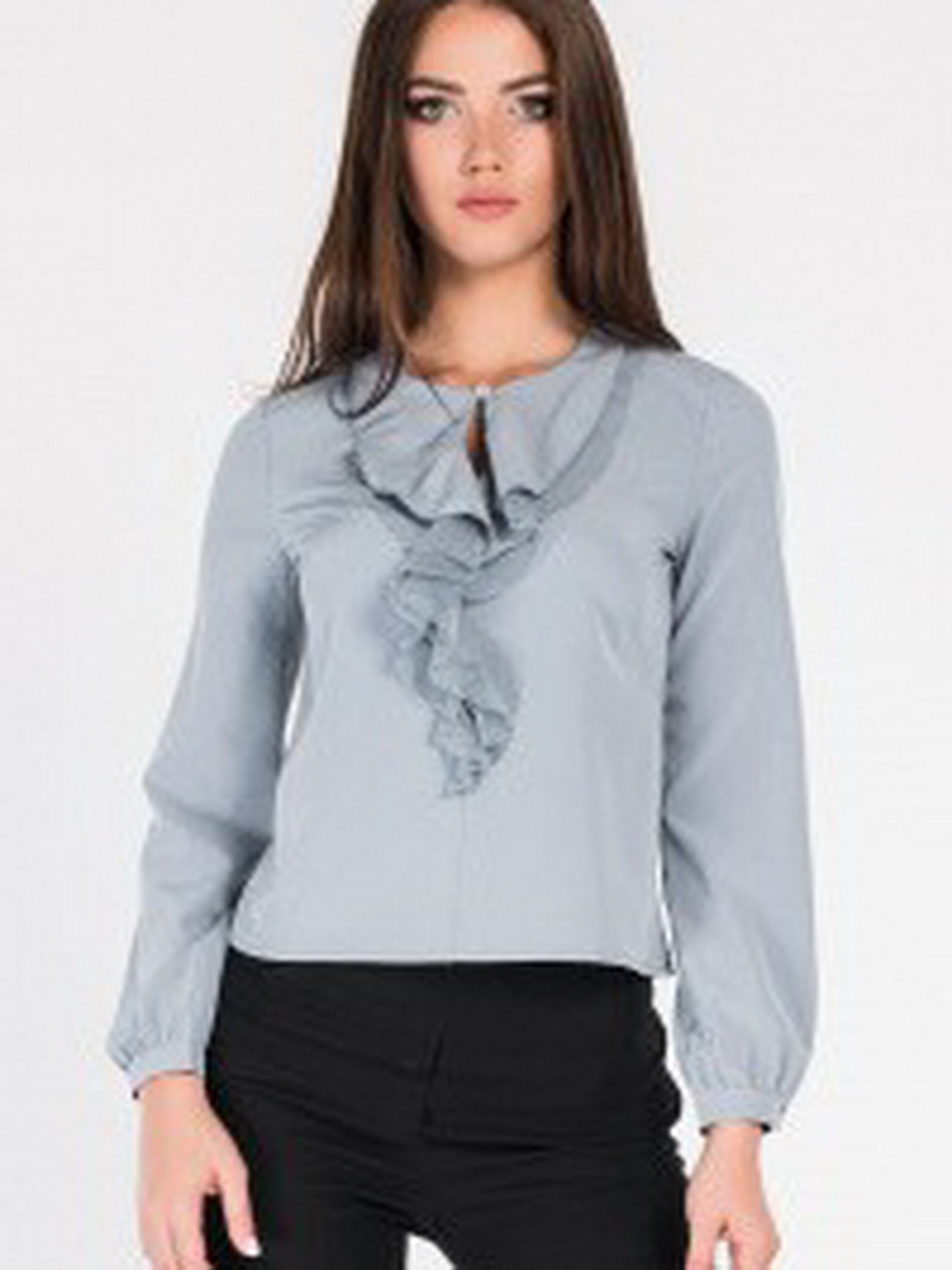 Блуза модного фасона подойдет многим женщинам. Ее изюминкой является оборка в несколько слоев, красиво ниспадающая от верха и до линии талии. Горловина отмечена округлой формой, что красиво подчеркивает шею девушки. Крой модели свободный, рукав длинный, его низ на резинке. Изделие средней длины, поэтому его можно носить, как с юбкой, так и брюками. В пошиве была использована легкая прочная ткань, отличающаяся практичностью в уходе и пользовании.