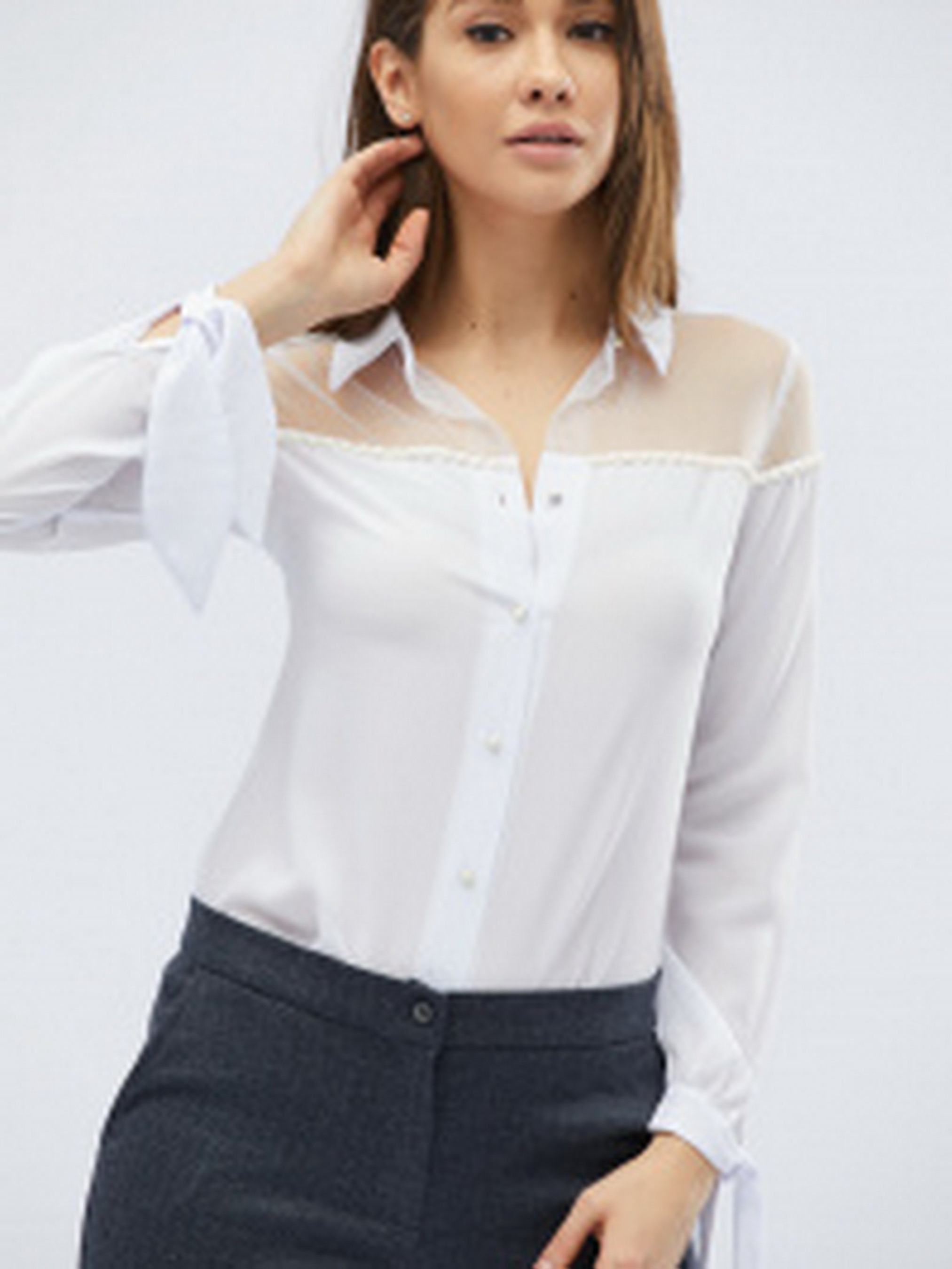 Эффектная шифоновая блузка декорирована белыми жемчужинками. Верх изделия выполнен из легкой сеточки. Спереди изделие застегивается на пуговицы. Округлый вырез оформлен воротником стоечкой. Длинные рукава внизу на завязочках.