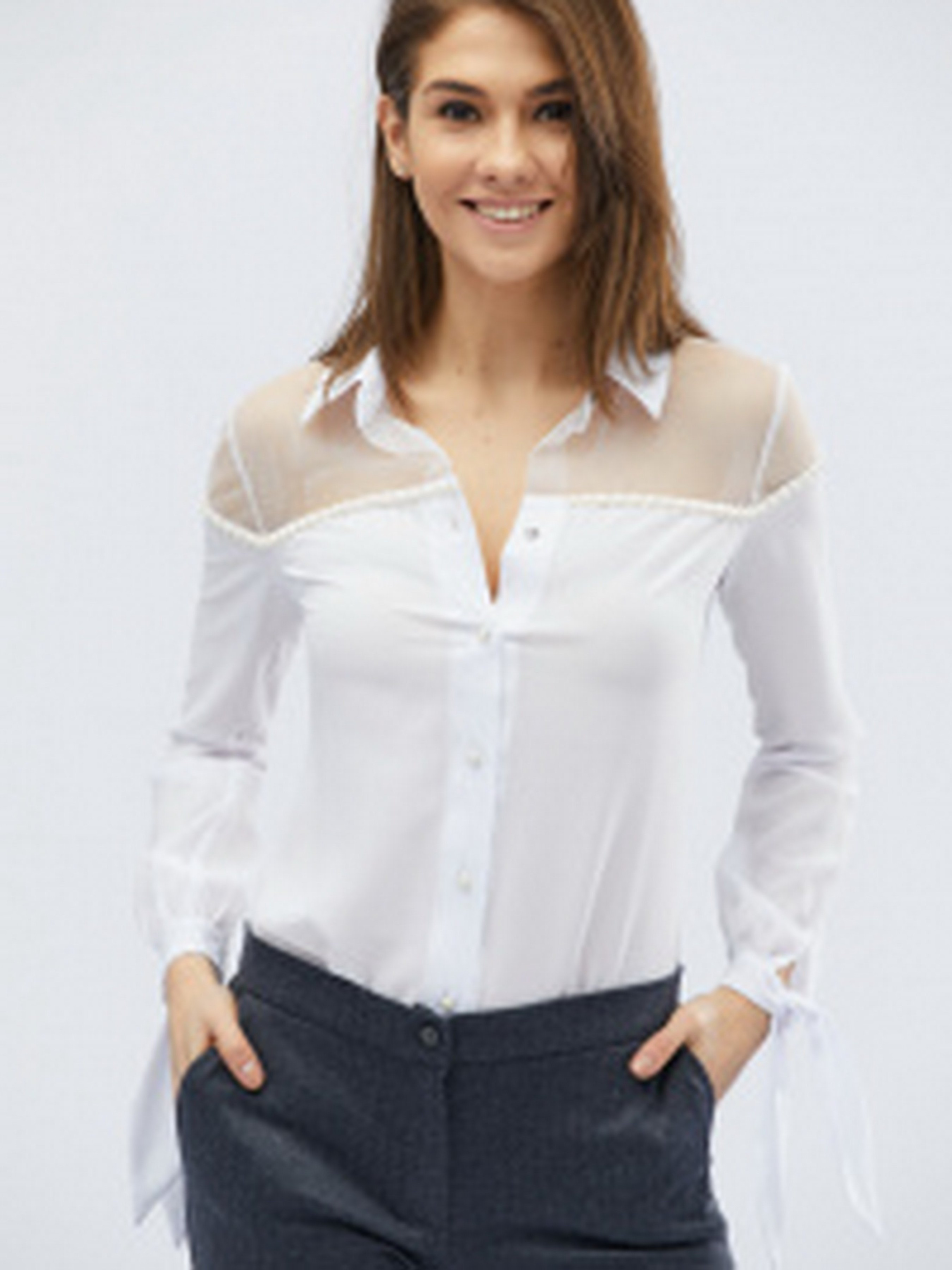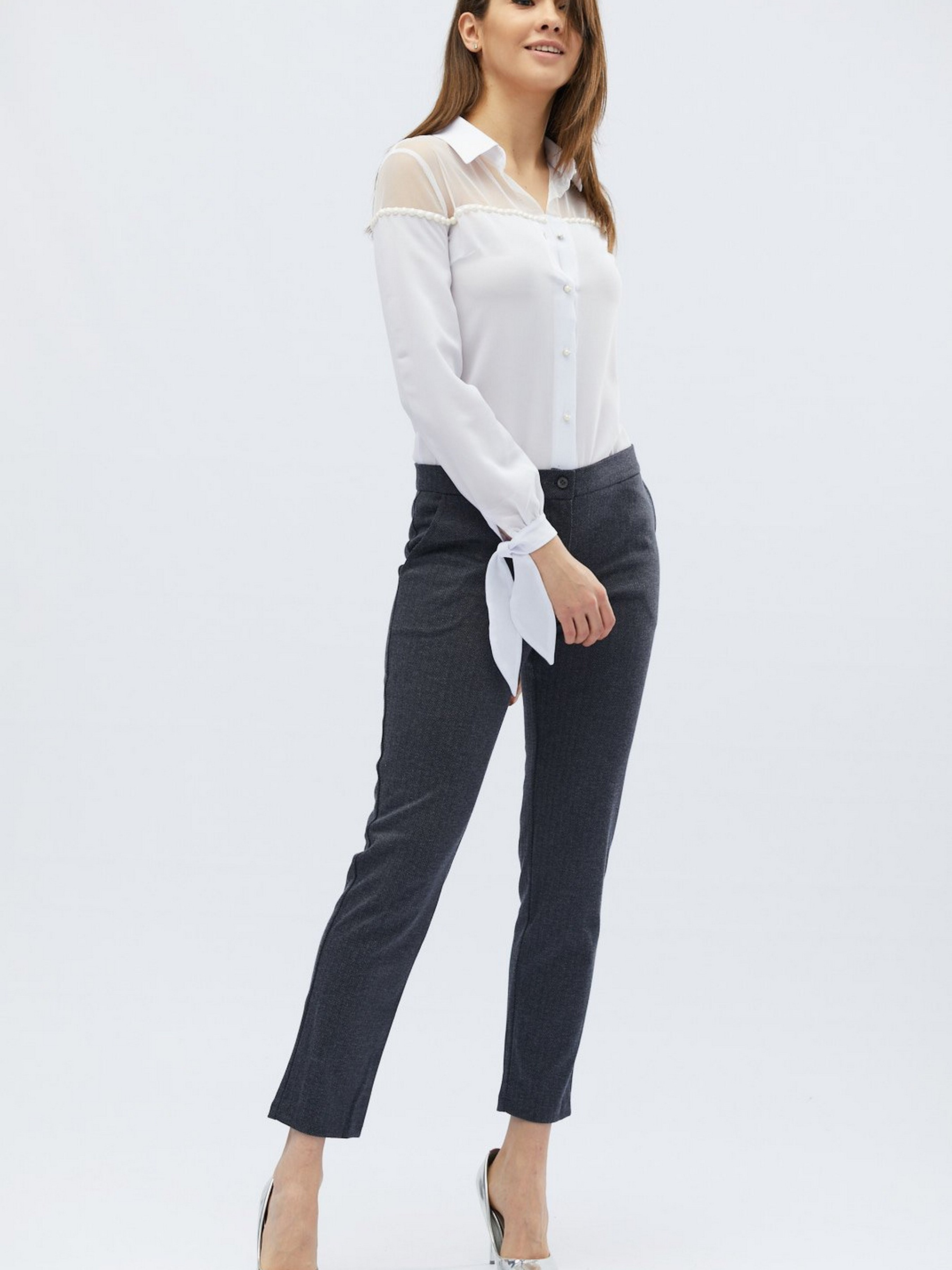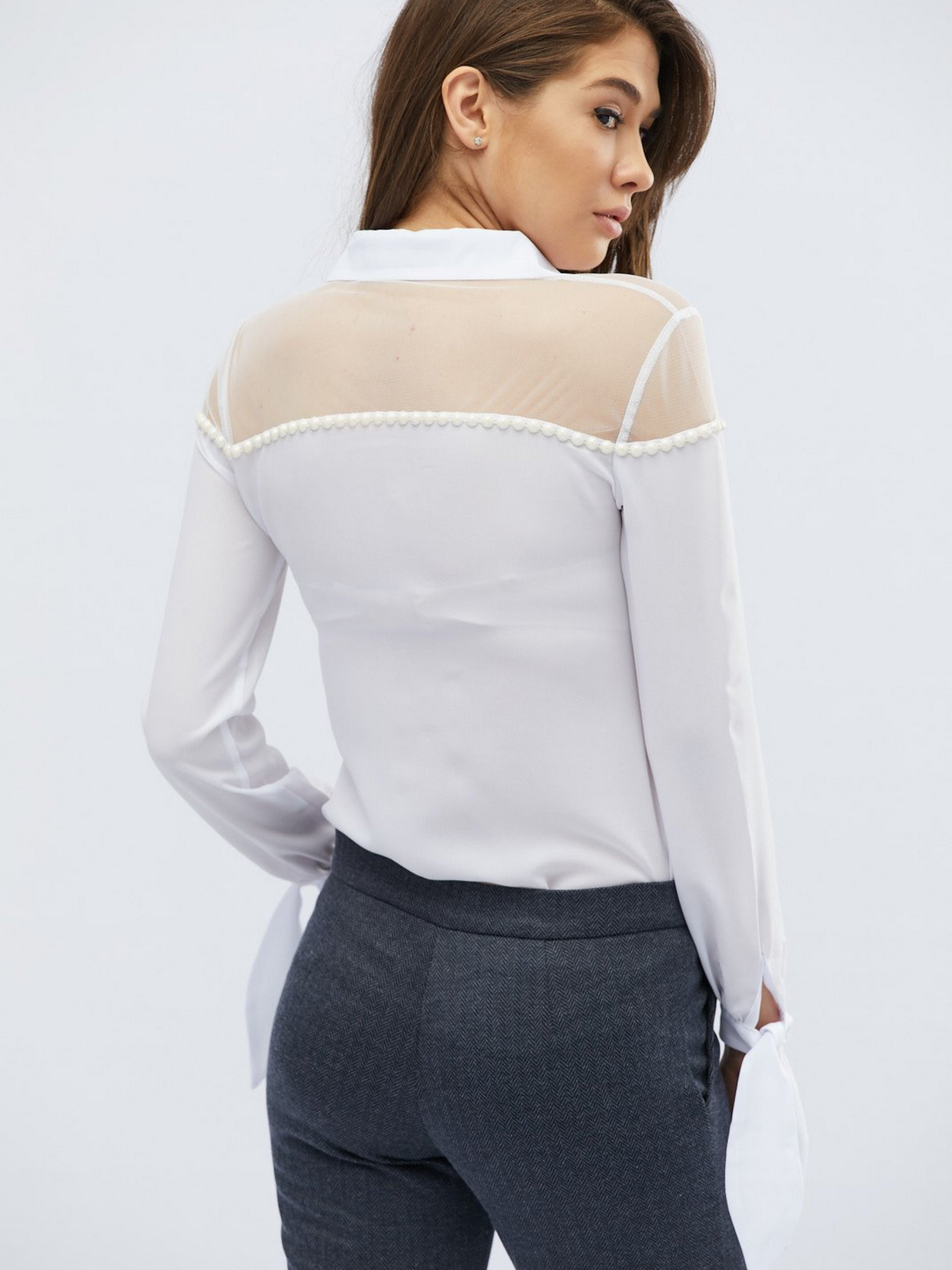 Эффектная шифоновая блузка декорирована белыми жемчужинками. Верх изделия выполнен из легкой сеточки. Спереди изделие застегивается на пуговицы. Округлый вырез оформлен воротником стоечкой. Длинные рукава внизу на завязочках.