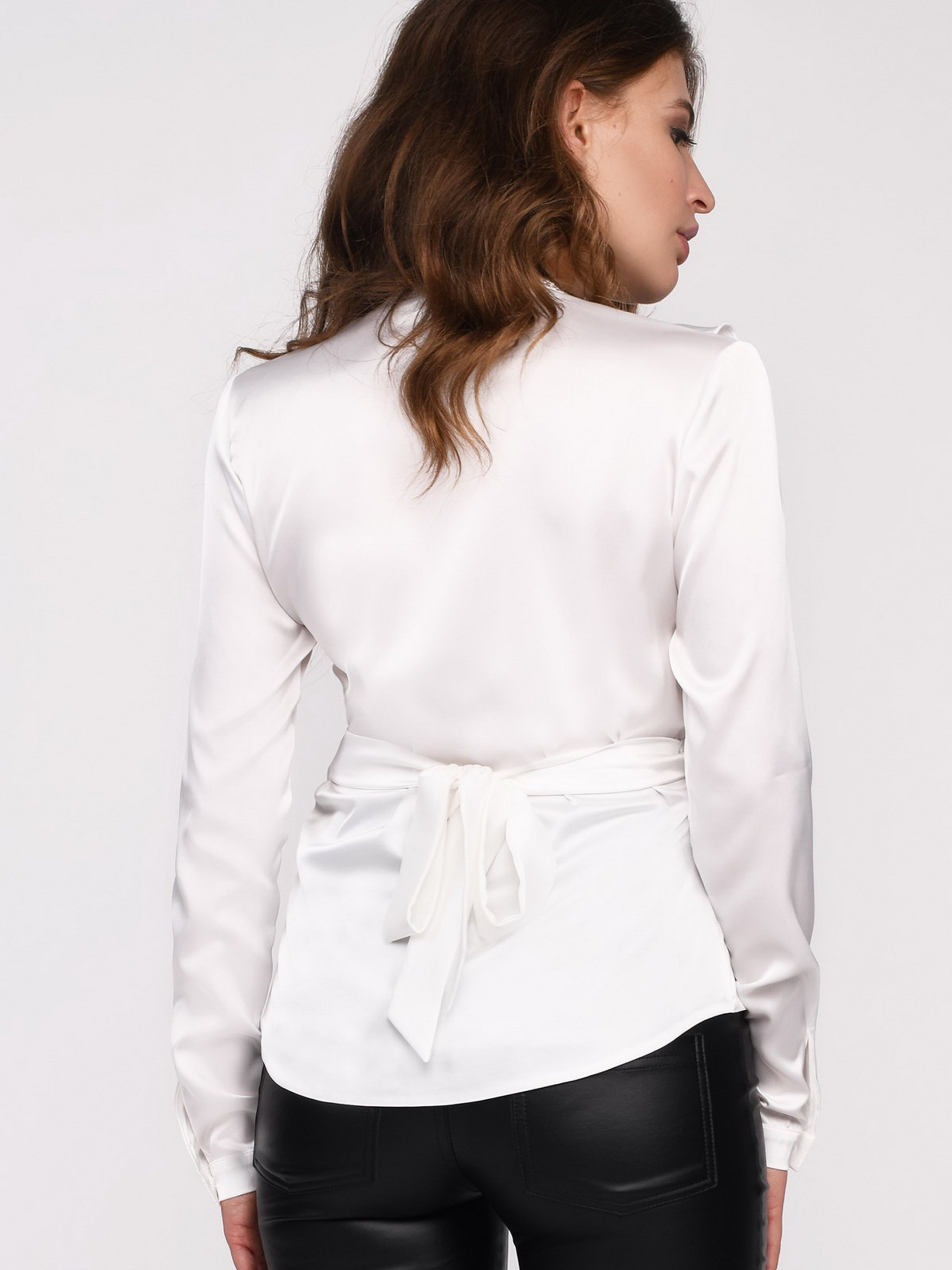 Женская шелковая блузка с длинным рукавом. Модель имеет V-образный вырез с отделкой из ажурного кружева, украшенный асимметричной рюшей. Для удобства, сзади изделия есть завязка.