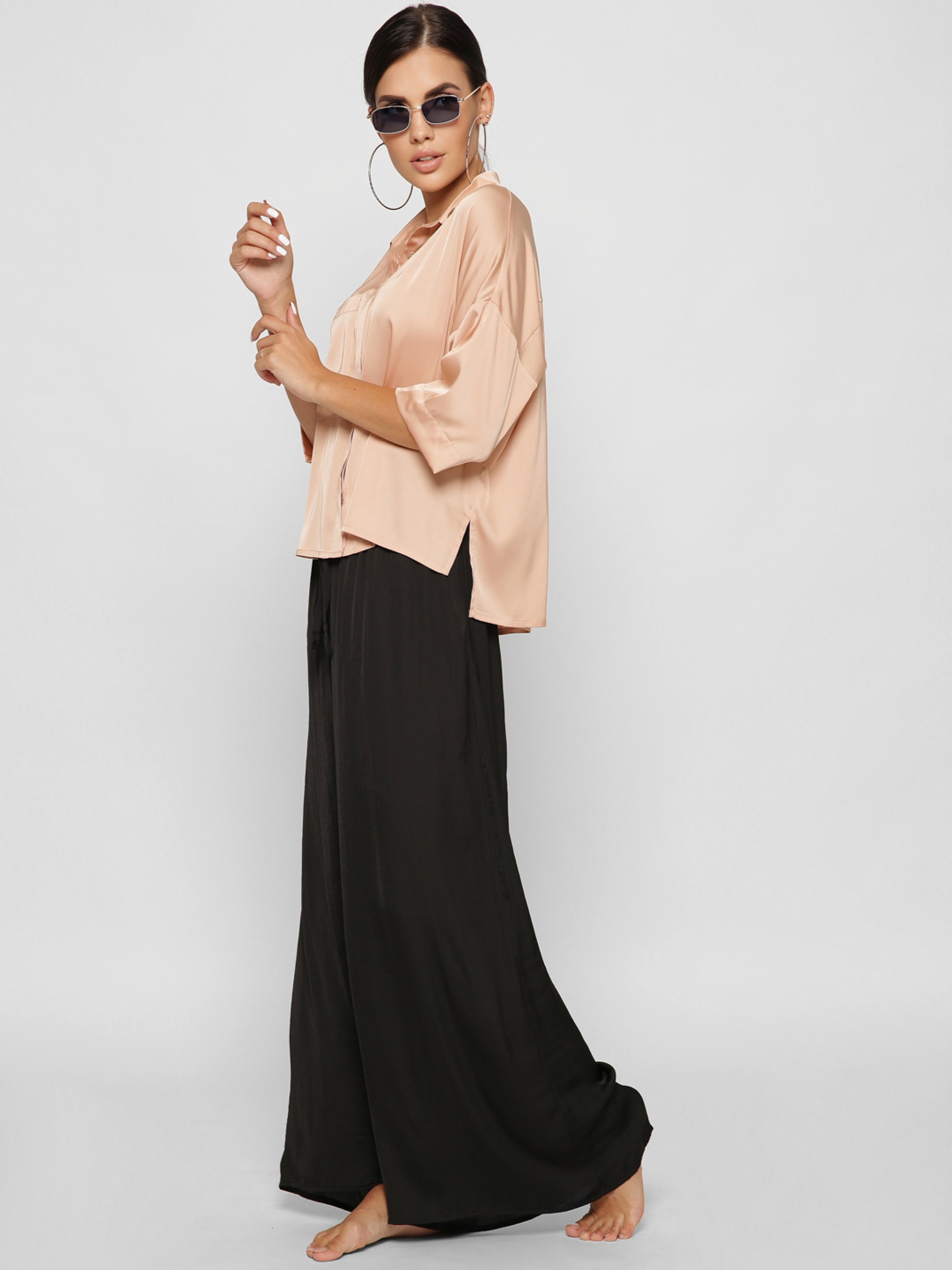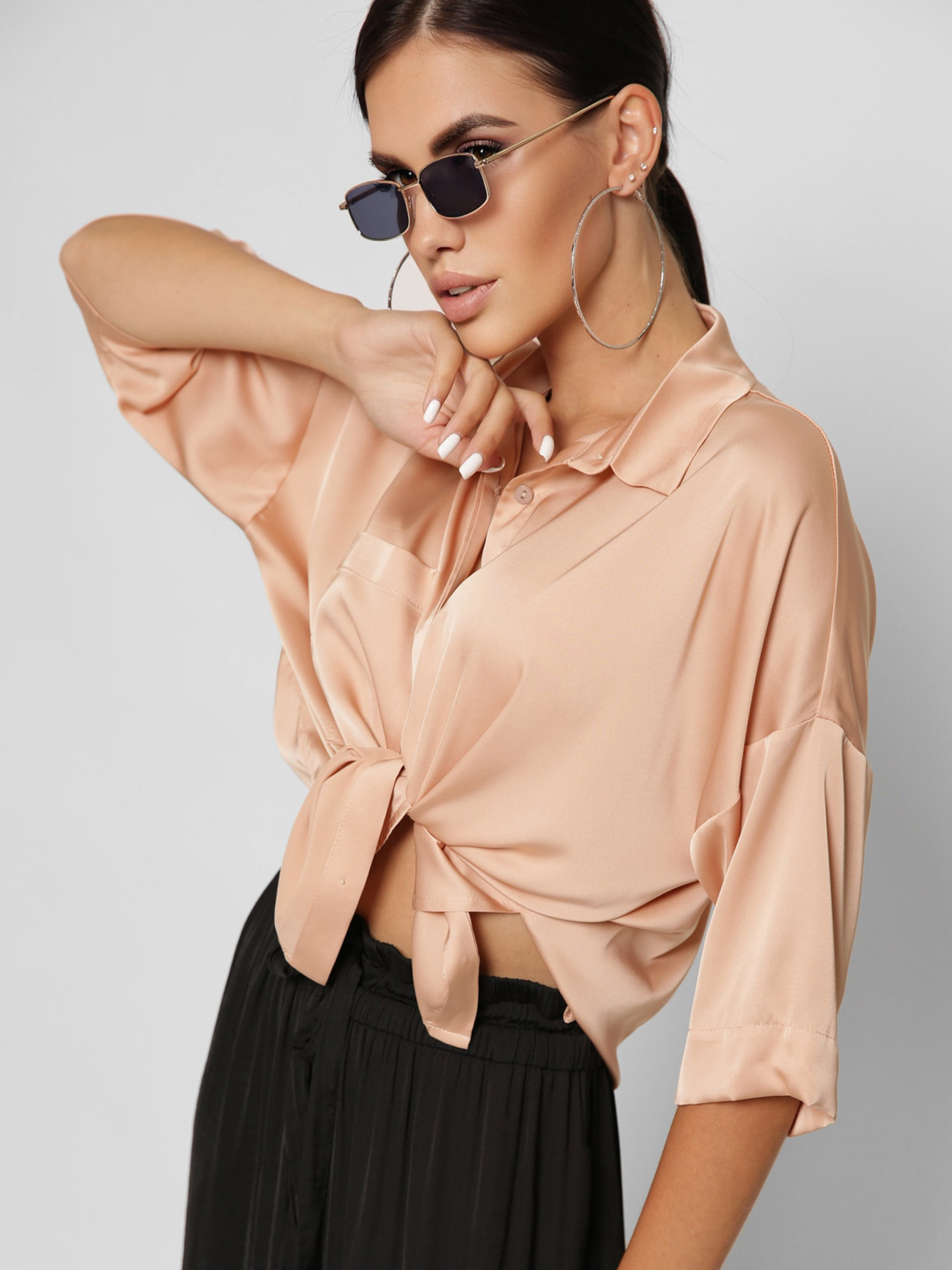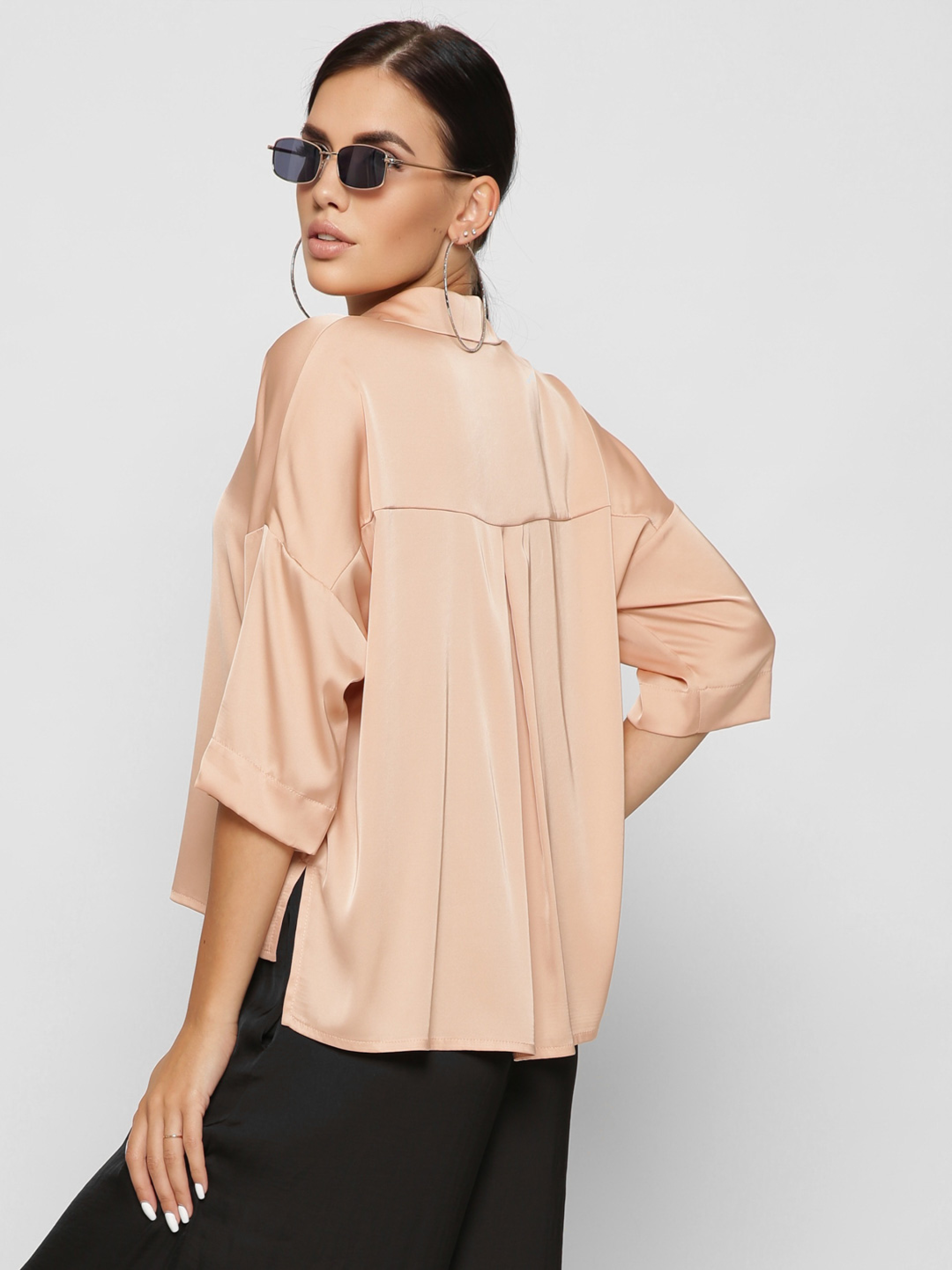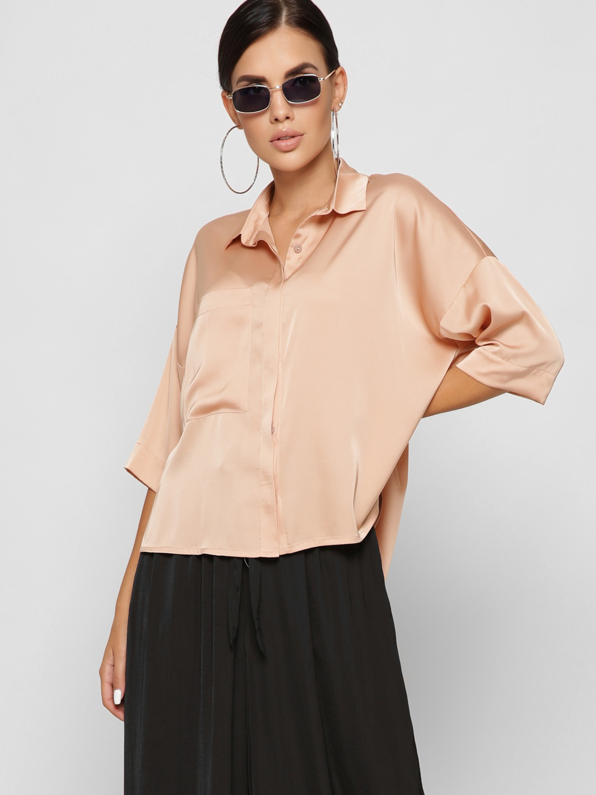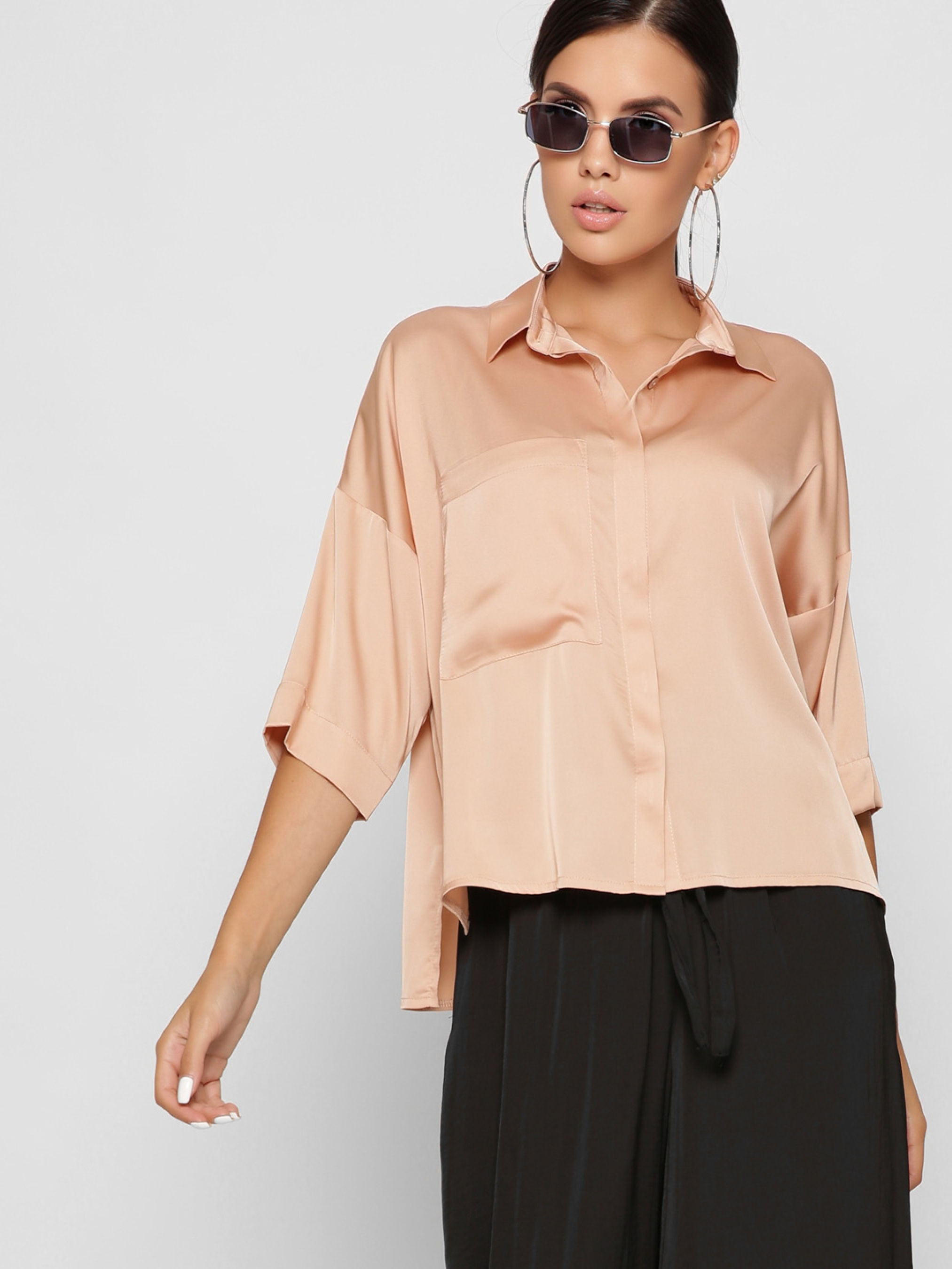 Изящная шелковая блузка. Воротник-стойка, рукав в ¾, удлиненная спинка. По бокам разрезы. На груди глубокий карман. Спереди застежка на пуговицы. Рекомендуем носить в застегнутом виде или завязывать спереди.