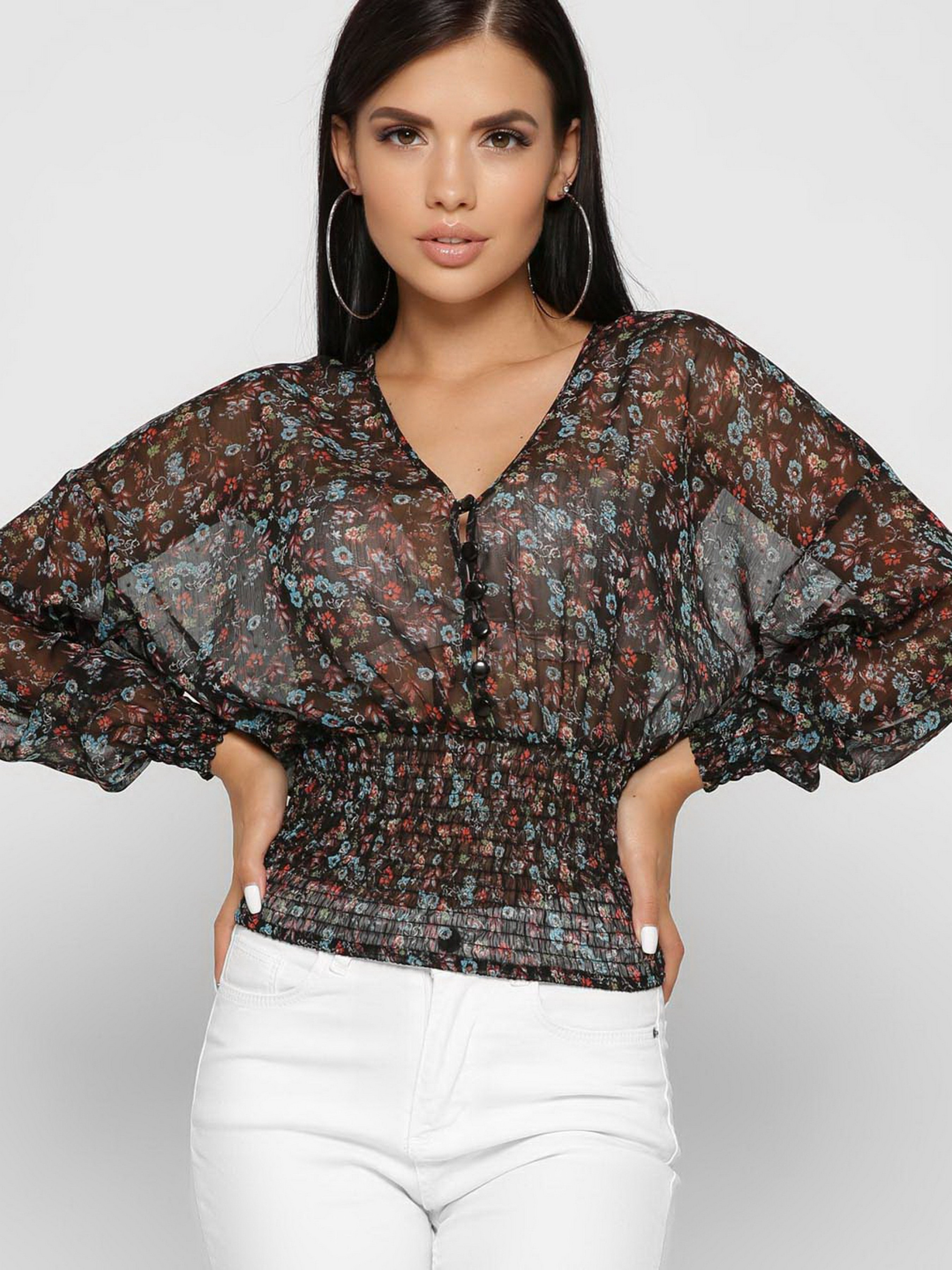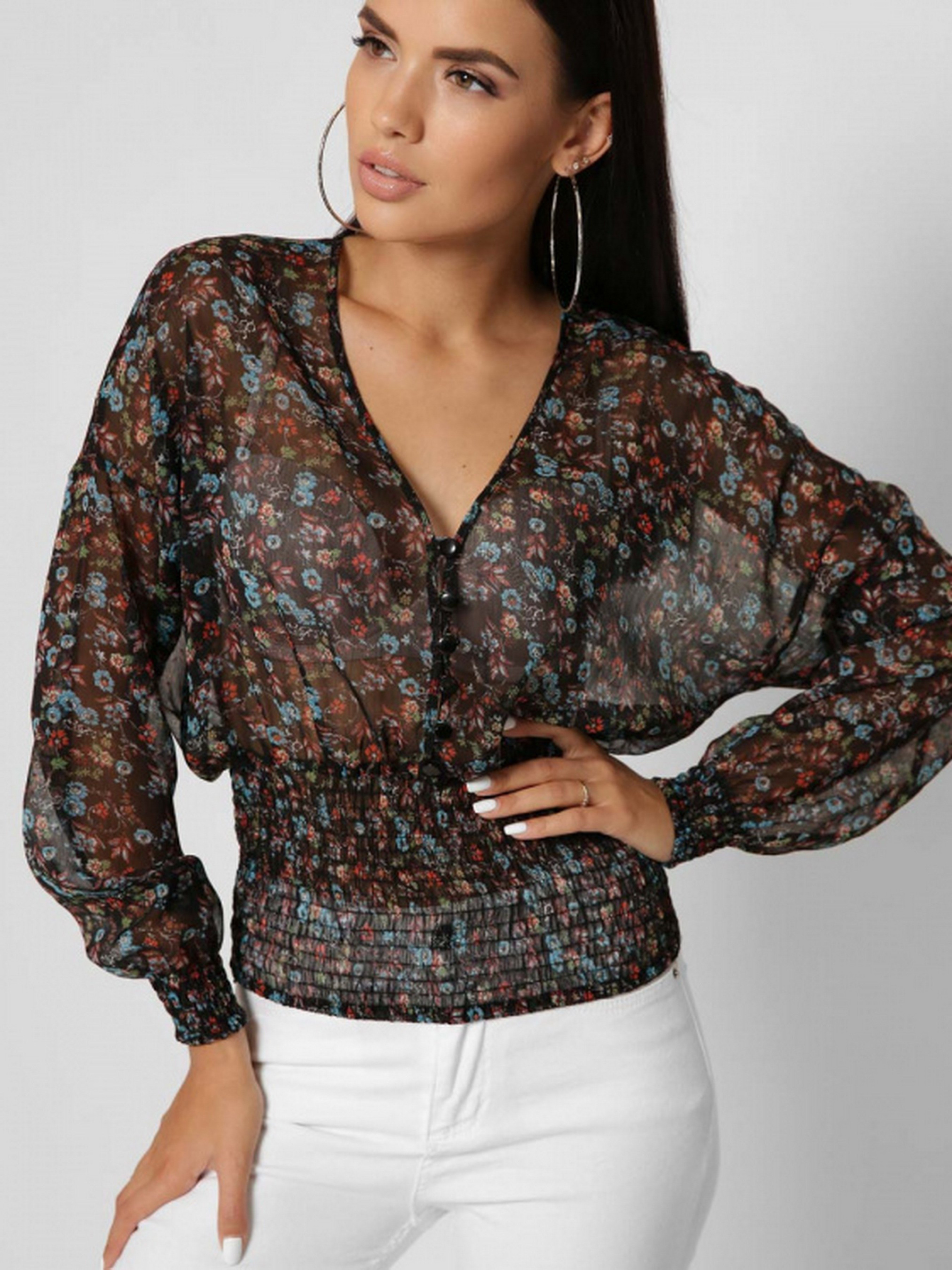 Утонченная шифоновая блузка. V-образный вырез, длинный рукав, застежка на пуговицы. По ткани нежный цветочный узор с добавлением люрекса. Акцентная деталь – эластичная манжета на талии и рукаве. Модель подчеркивает талию и удачно выделяет линию декольте.
