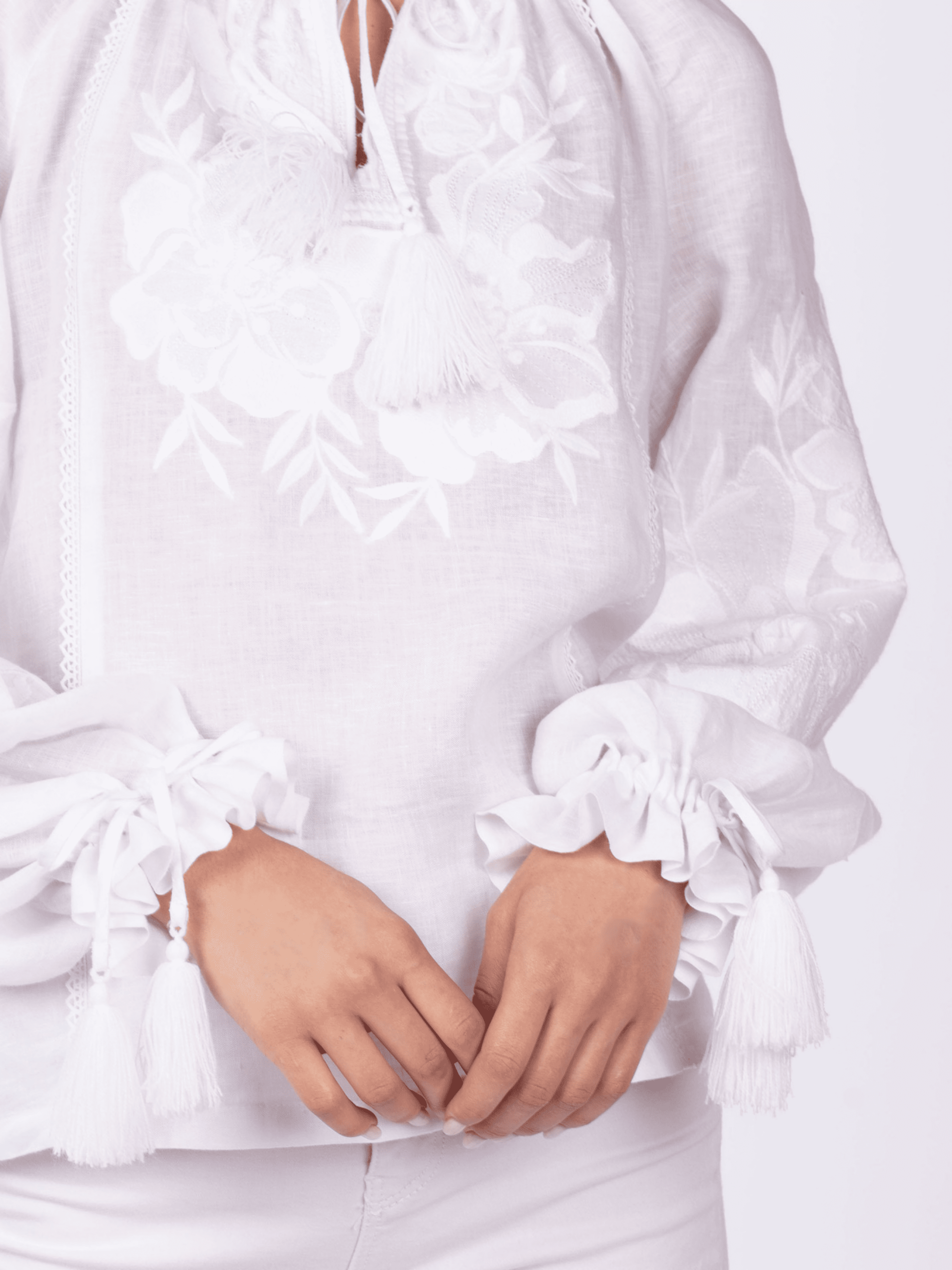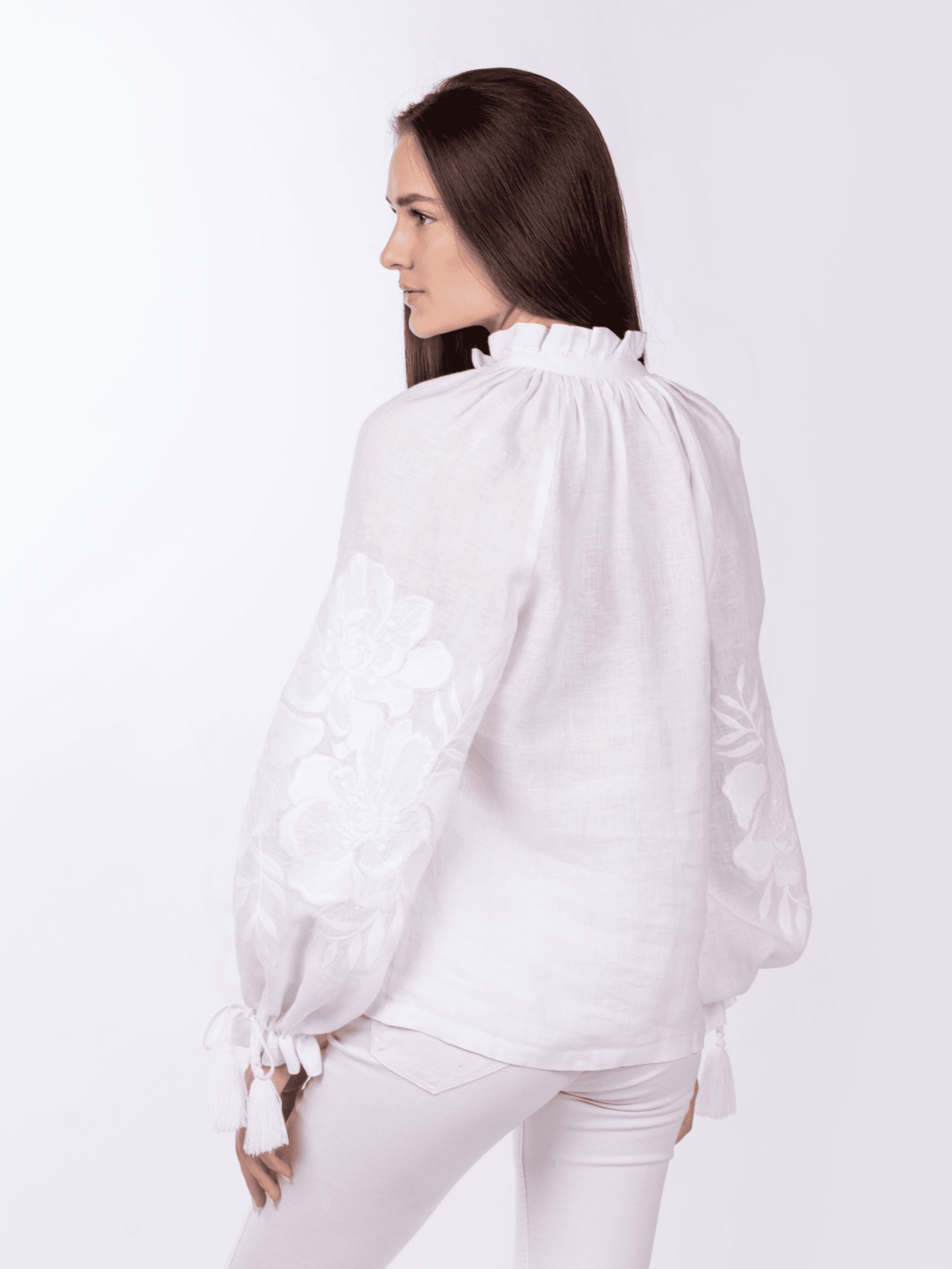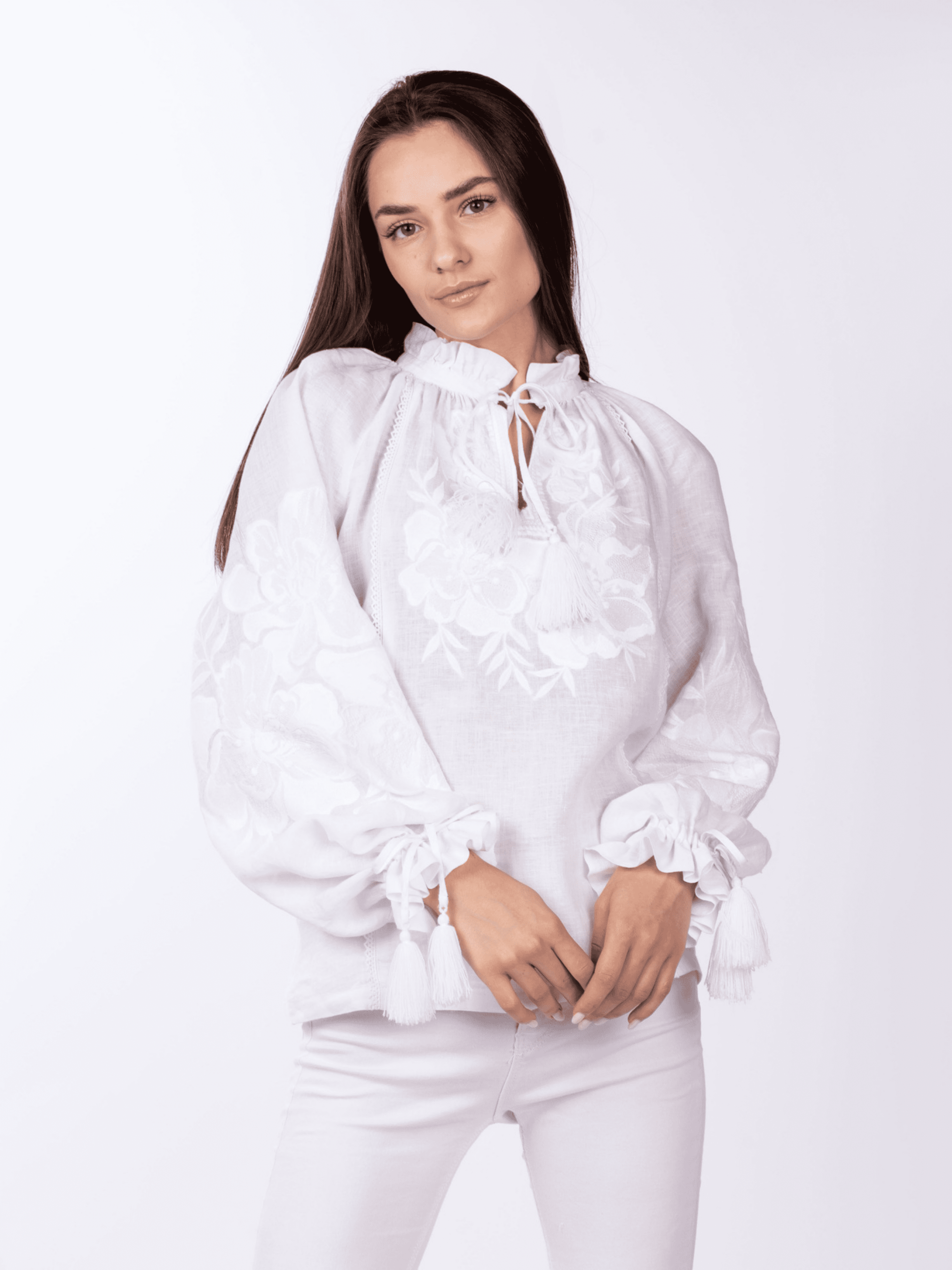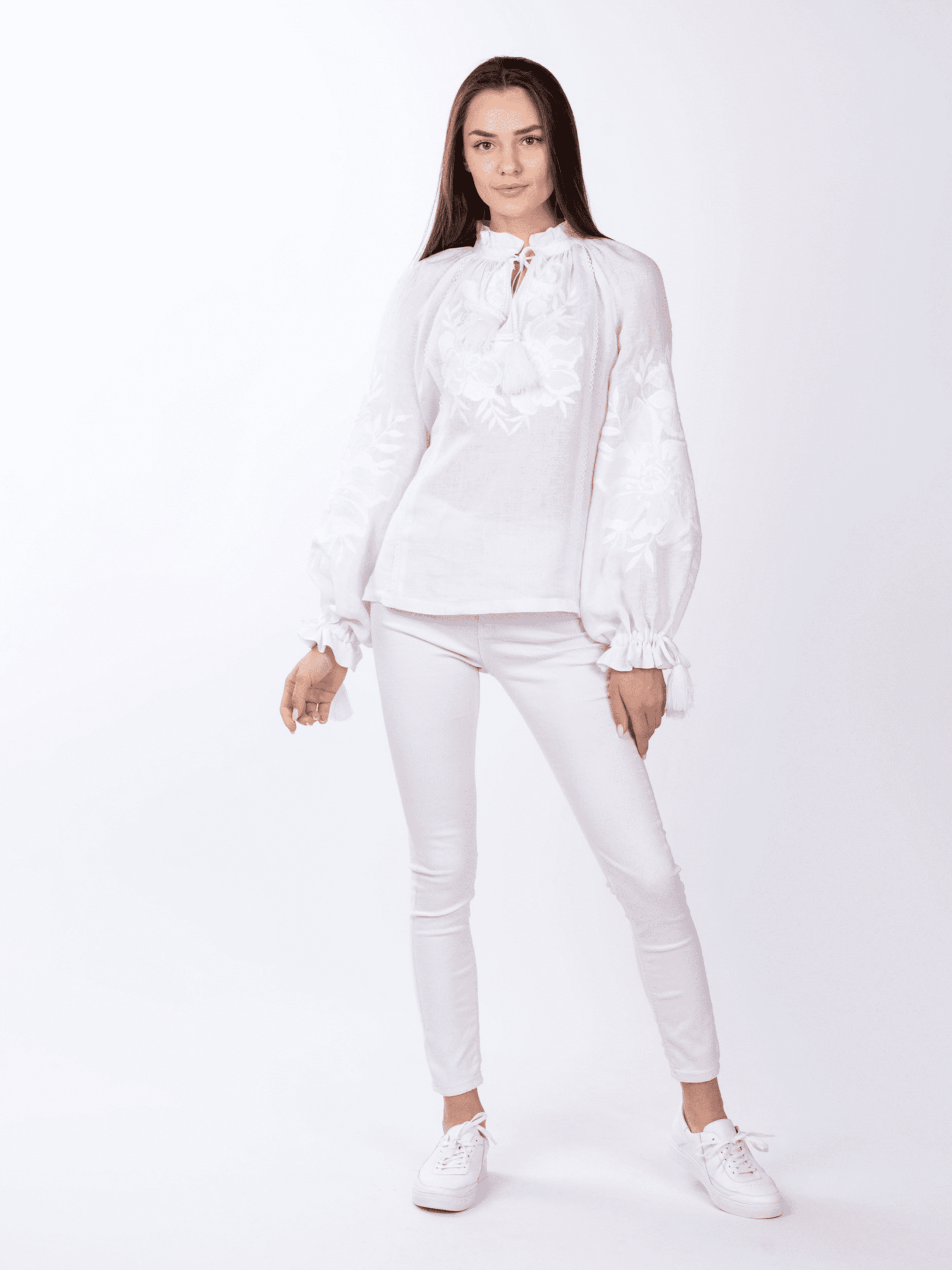 Ніжність лляної тканини у поєднанні зі сніжно-білими нитками – це чудовий дует стилю та практичності. Квітковий орнамент ніби оповиває жіночі груди та руки турботою, ласкою і дарує безліч захоплених поглядів. Вишиванка слугуватиме Вам довгі роки, адже вона створена із природньої тканини – льону, а як відомо, таке полотно вирізняється міцністю та довговічністю. А ще, льон - ідеальний варіант для теплої та спекотної погоди, адже він не дає тілу перегрітися, максимально добре «дихає», вбирає вологу та дуже швидко висихає. Наша блуза прямого крою ідеально підійде і власницям пишних форм, і струнким жінкам. А особливістю цієї вишиванки є рукав-реглан, він спадає до низу пишним силуетом, утворюючи «дзвоник» на зап'ястку. В такій сорочці Ви виглядатимете впевнено та вишукано.
