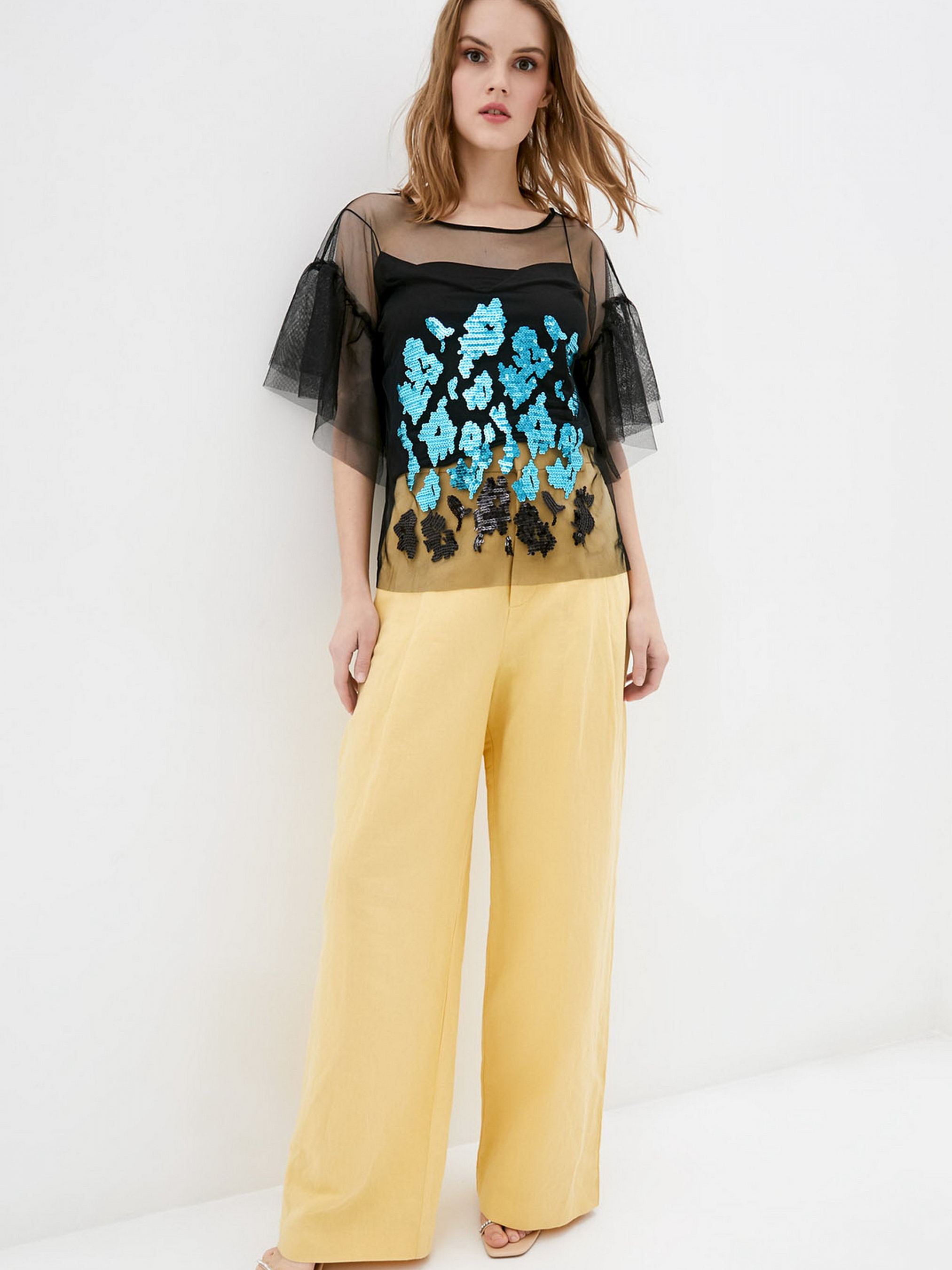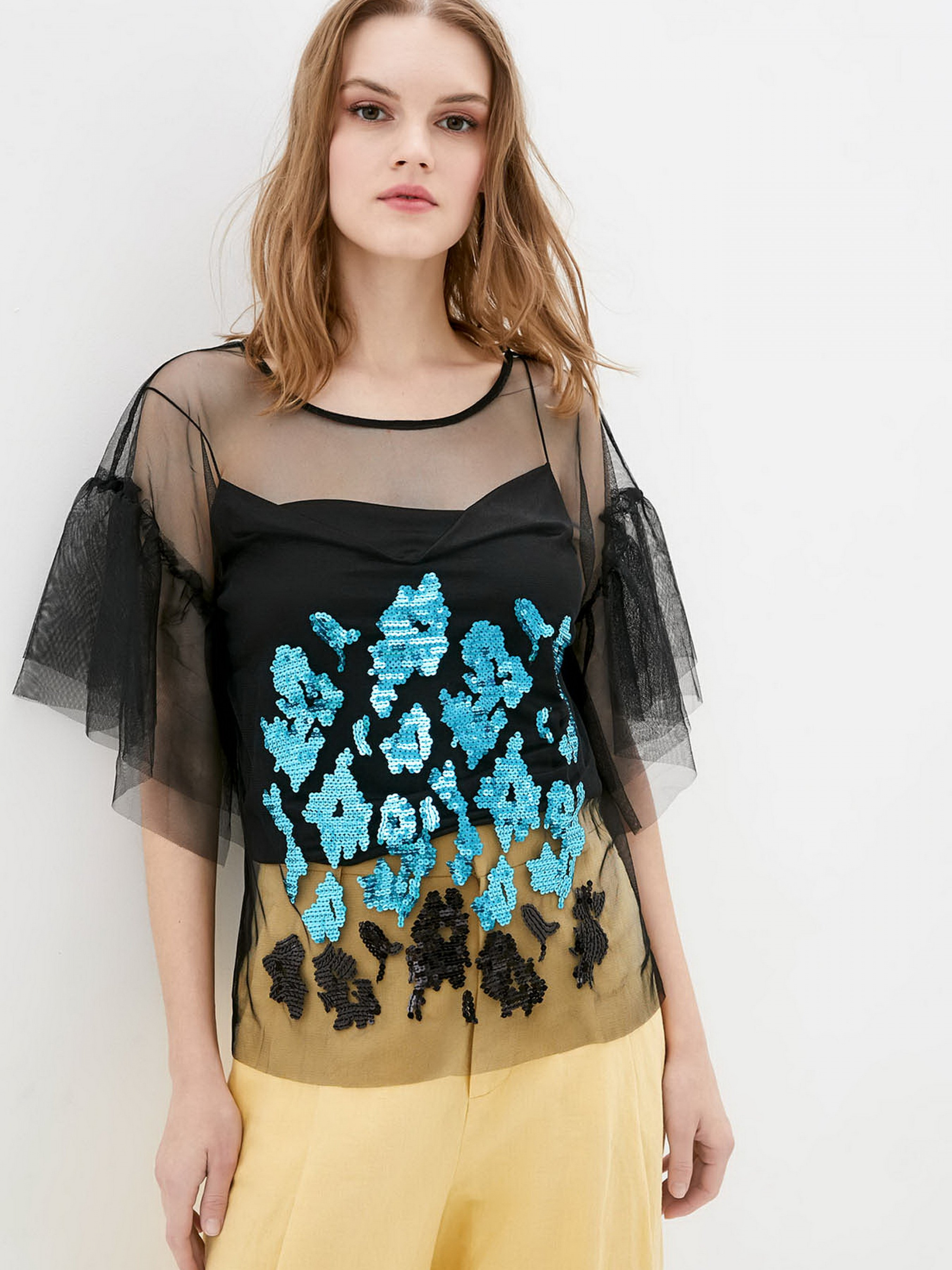 Блуза из сетки - это прекрасный вариант для создания многослойных и интересных образов. Изделие выполнено из тонкой сетки, декором выступает авторский принт в виде пайеток. Состав: polyester 75%, viscose 20%, elastane 5%. Параметры размеров: Охват груди: XS - 84; S - 88; М - 92; L - 96; XL - 100. Охват талии: XS - 64; S - 68; М - 72; L - 76; XL - 80. Охват бедер: XS - 92; S - 96; М - 100; L - 104; XL - 108. Размер на модели S.