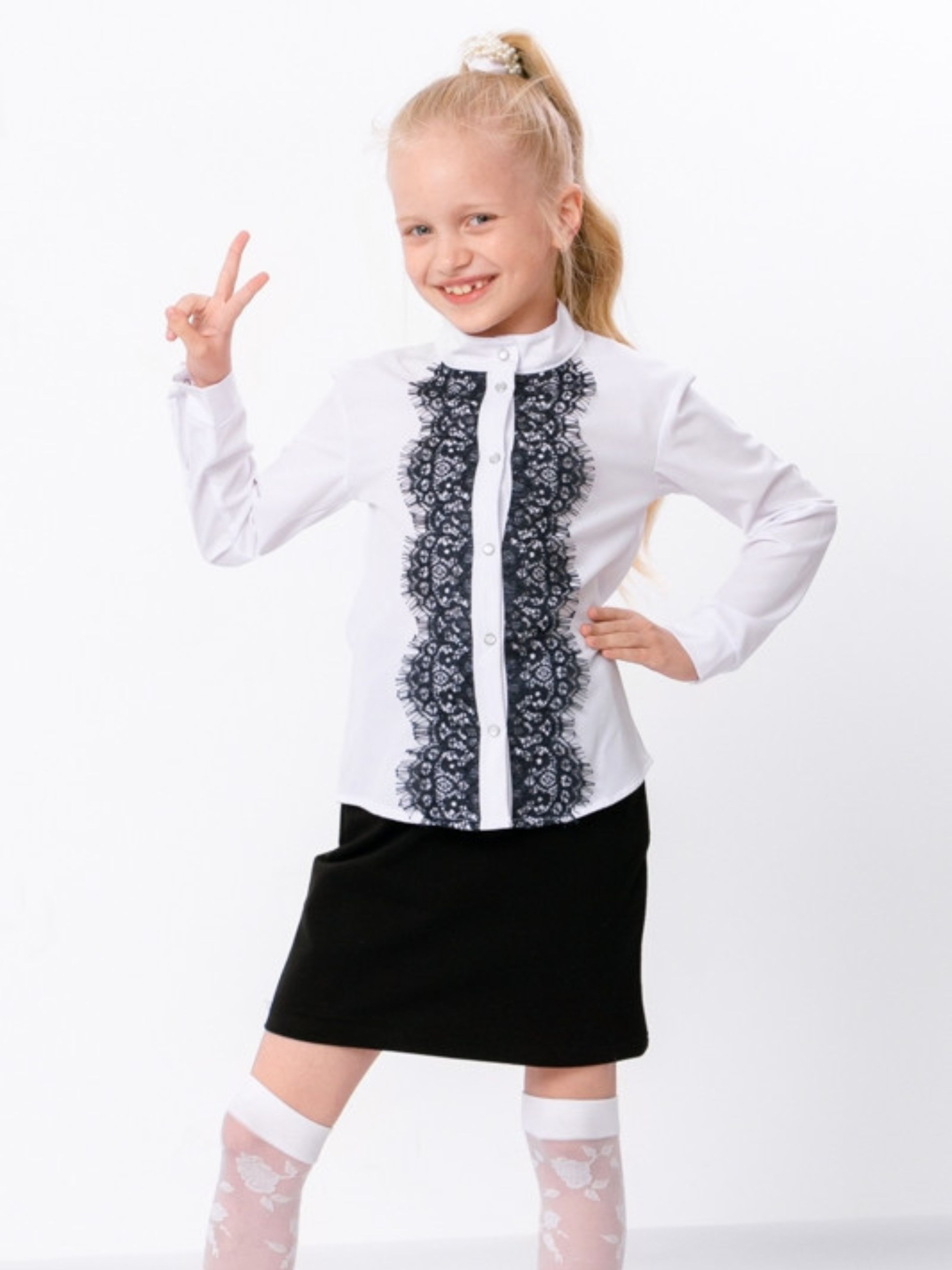 Полотно: софт Склад полотна: 20% бавовни 80% поліестру Зріст: 146-158 Блуза легка та ніжна. Це чудова модна і неймовірно красива річ актуальна для святкових і урочистих випадків. Вона підкреслює елегантність і жіночність юної панянки прекрасно гармонує з спідницями і брюками. Модель з довгим рукавом по всій довжині застібається на кнопки. Виконано виріб з такого полотна як софт. Софт дуже тонкий м'який еластичний матеріал. Відмінно пропускає повітря що дозволяє шкірі дихати. При прасуванні дає усадку на розмір що портібно враховувати при замовленні товару. Мереживо ідеально доповнює блузу надаючи їй кокетливу нотку.