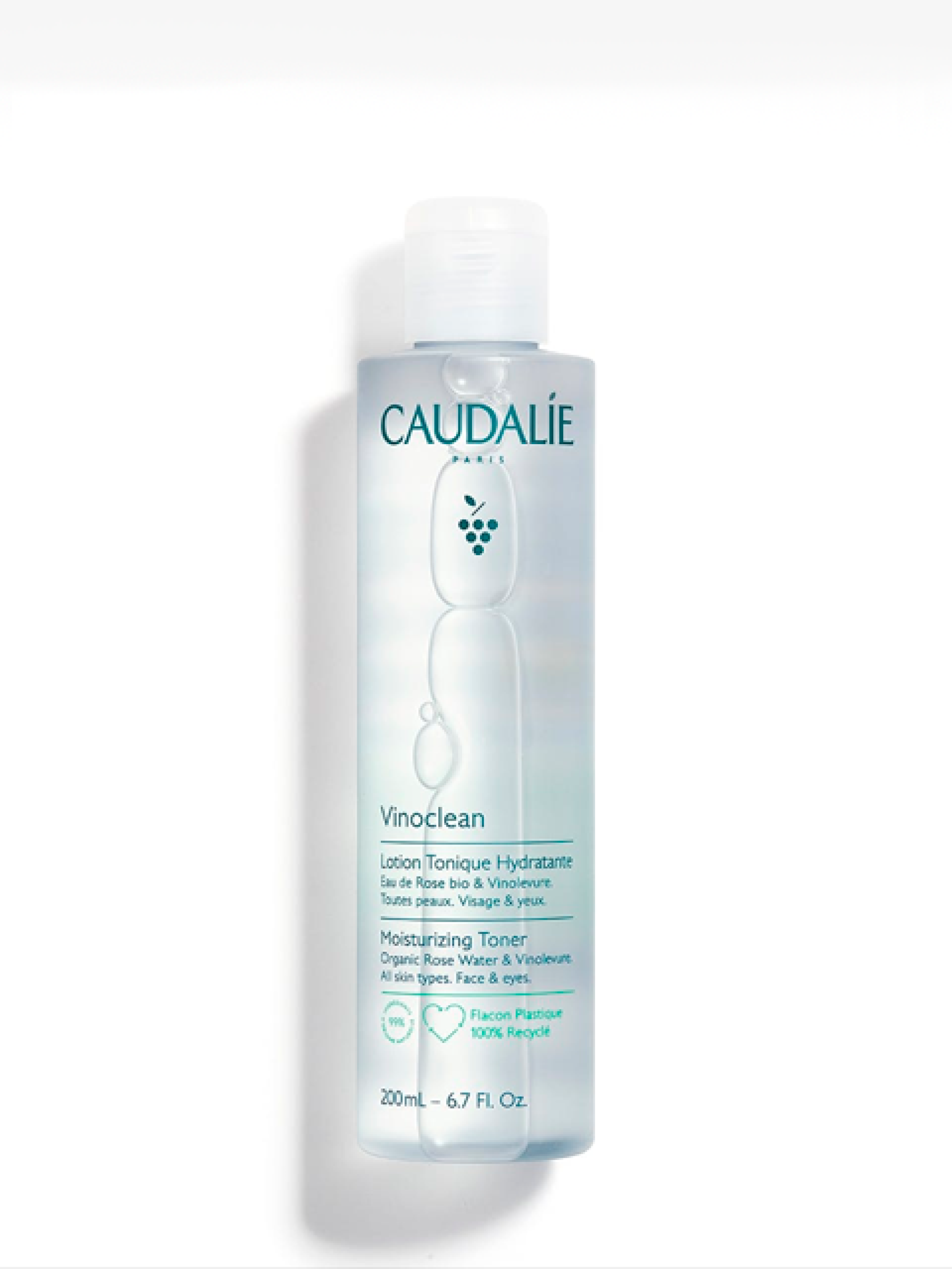 Наши средства для очищения кожи и снятия макияжа в обновленном эстетичном оформлении составляют новую серию экологически безопасных очищающих средств VINOCLEAN, имеющих формулу из ингредиентов неживотного, максимально натурального происхождения. Увлажняющий Тоник, завершающий процесс идеального снятия макияжа, убирает остатки загрязнений и следы макияжа, при этом тонизируя кожу. Успокаивающие и увлажняющие свойства винодрожжей в сочетании с матирующим эффектом органической розовой воды обеспечивают свежесть и чистоту кожи, дарят ей комфорт и подготавливают ее к дальнейшим процедурам ухода для их более эффективного действия. На 99 % состоит из ингредиентов природного происхождения и за счет отсутствия в составе спиртов не нарушает естественный баланс кожи. Благодаря нежному аромату органической розовой воды процедура снятия макияжа превращается в приятный и расслабляющий ритуал. Caudalie берет на себя обязательства: - Флаконы на 100 % изготовлены из переработанного и подлежащего переработке пластика.* - Снижение использования нефтехимического пластика на 50 тонн.** - Сокращение углеродного следа на 45 %.** * Там, где есть технические возможности. Пригодных для переработки помп не существует: они принимаются в бутиках Caudalie благодаря партнерству с TerraCycle. ** В сравнении со старой серией средств Caudalie для очищения кожи и снятия макияжа. Преимущества Завершает процесс снятия макияжа Тонизирует кожу Увлажняет и успокаивает Формула: 99% ингредиентов натурального происхождения. Не содержит спиртов, одобрено дерматологами и офтальмологами. Как и во всех других продуктах Caudalie, в нем нет парабенов, феноксиэтанола, фталатов, минеральных масел, ПЭГ, силиконов, лауретсульфата натрия и ингредиентов животного происхождения. Оценка по классификации Yuka: 100 из 100 Состав ПРИМЕНЕНИЕ 1. Выполняйте процедуру утром и вечером. Тремя нажатиями смочите ватный диск Увлажняющим тоником. 2. С помощью этого ватного диска мягко проведите по очищенной коже лица и шеи. Не смывать.