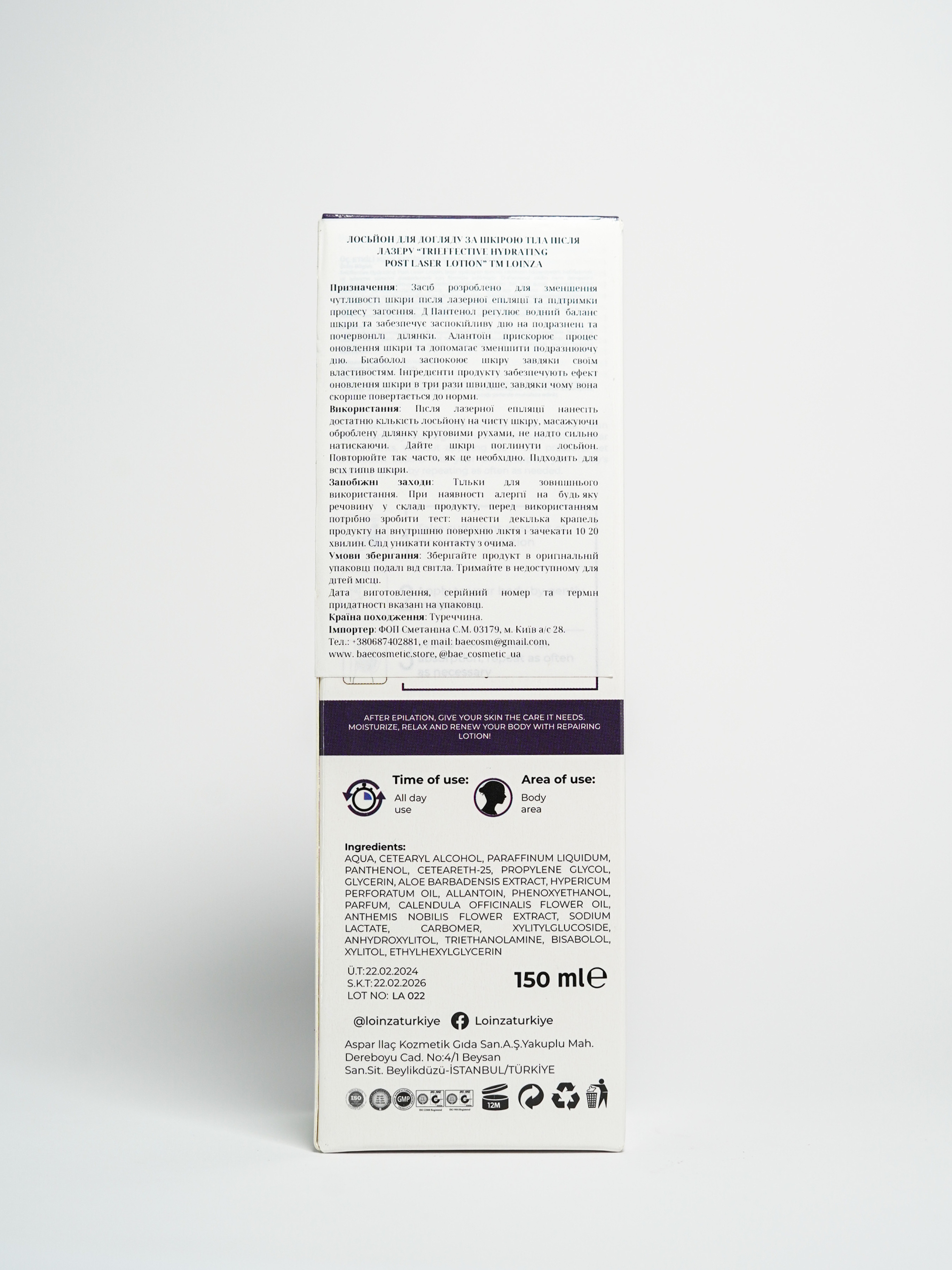 Средство разработано для уменьшения чувствительности кожи после лазерной эпиляции и поддержания процесса заживления. Д-пантенол регулирует водный баланс кожи и обеспечивает успокаивающее действие на раздраженные и покрасневшие участки. Аллантоин ускоряет процесс обновления кожи и помогает снизить раздражающее действие. Бисаболол успокаивает кожу благодаря своим свойствам. Ингредиенты продукта обеспечивают эффект обновления кожи в три раза быстрее, благодаря чему она скорее возвращается в норму. Использование: После лазерной эпиляции нанесите достаточное количество лосьона на чистую кожу, массируя обработанный участок круговыми движениями, не слишком сильно нажимая. Дайте коже поглотить лосьон. Повторяйте так часто, как это необходимо. Подходит для всех типов кожи. Возможно использование для успокоения кожи после депиляции. Меры предосторожности: Только для наружного использования. При наличии аллергии на любое вещество в составе продукта перед использованием нужно сделать тест: нанести несколько капель продукта на внутреннюю поверхность локтя и подождать 10-20 минут. Не наносите на кожу лица и избегайте контакта с глазами. Условия хранения: Храните продукт в оригинальной упаковке вдали от света. Держите в недоступном для детей месте. Состав: AQUA, CETEARYL ALCOHOL, PARAFFINUM LIQUIDUM, PANTHENOL, CETEARETH-25, PROPYLENE GLYCOL, GLYCERIN, ALOE BARBADENSIS EXTRACT, HYPERICUM PERFORATUM OIL, ALLANTOIN, PHENOXYETHANOL HEMIS NOBILIS FLOWER EXTRACT, SODIUM LACTATE, CARBOMER, XYLITYLGLUCOSIDE, ANHYDROXYLITOL, TRIETHANOLAMINE, BISABOLOL, XYLITOL, ETHYLHEXYLGLYCERIN.