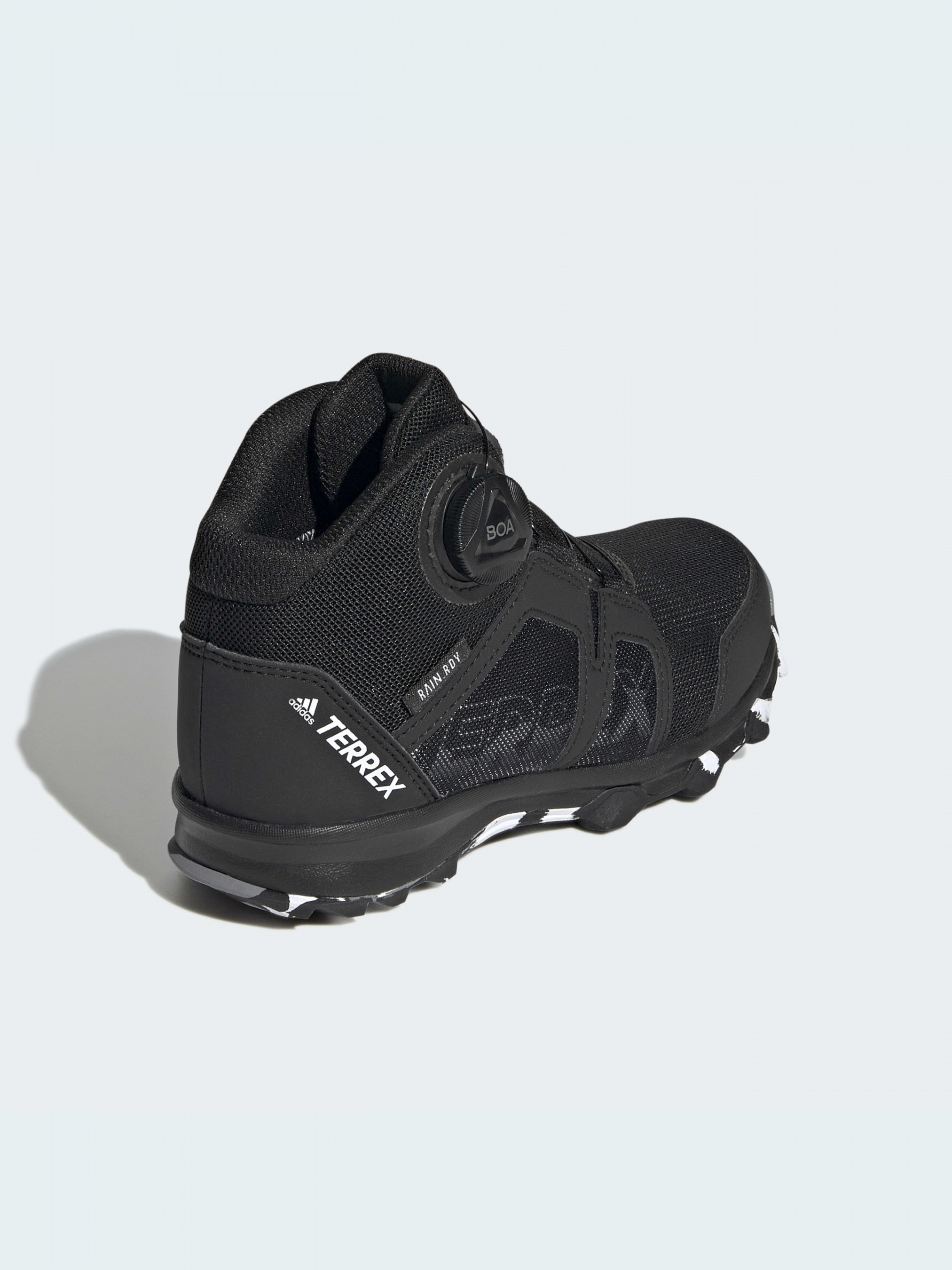 Каждая лужа и валун манят к себе. Мокро или сухо, высоко или низко, дети могут исследовать с уверенным сцеплением и сухими ногами в этих походных ботинках adidas Terrex Boa Mid RAIN.RDY. Удобная посадка позволяет малышам самостоятельно регулировать обувь и не уставать.