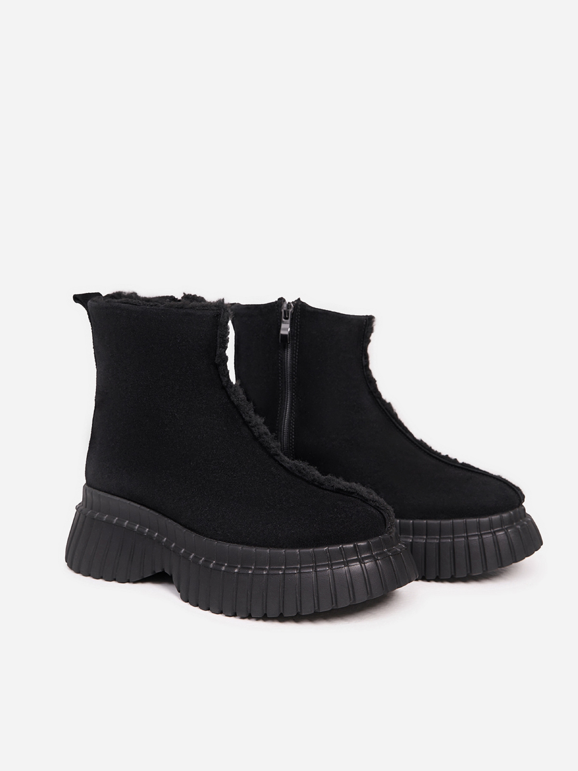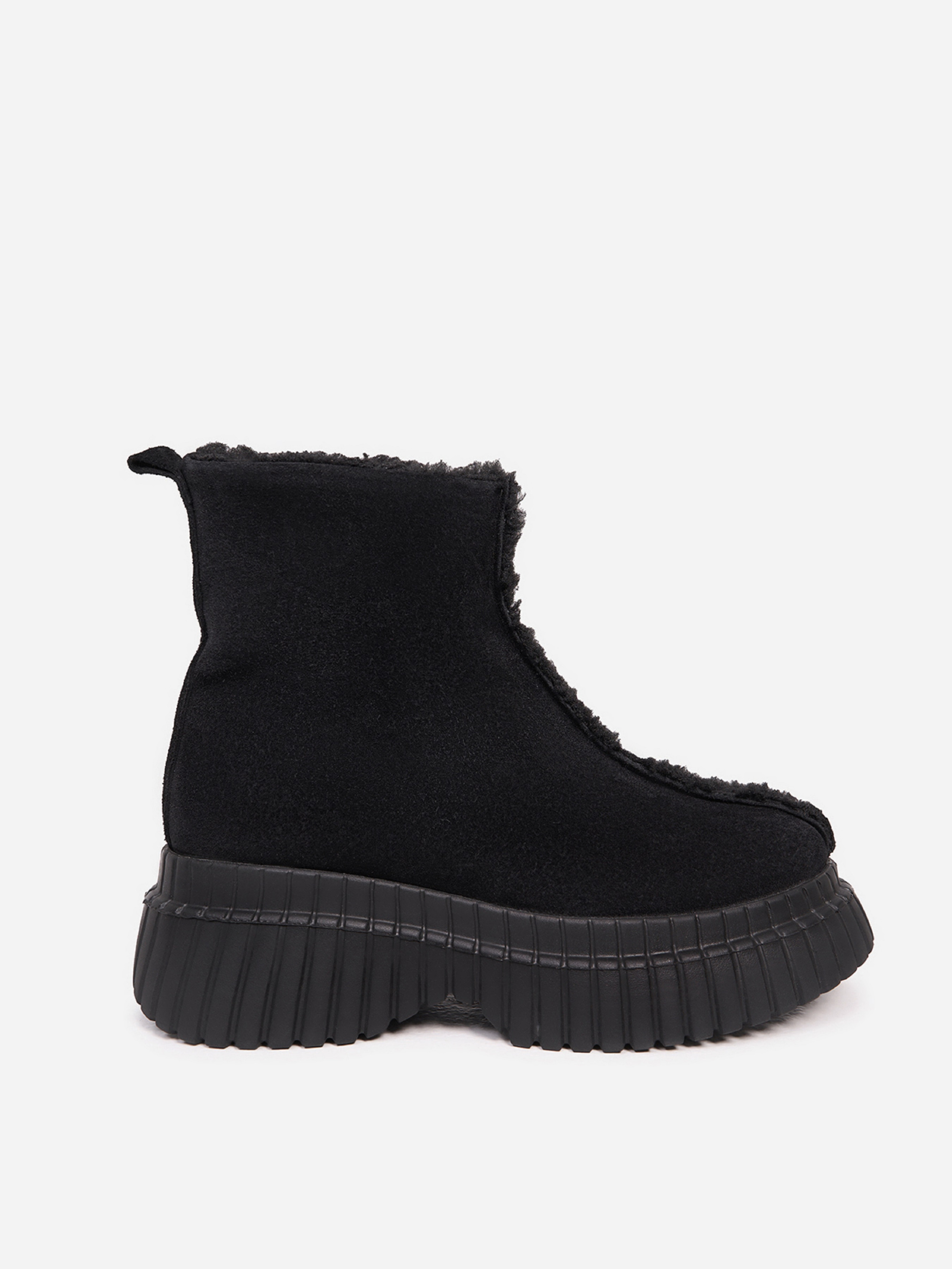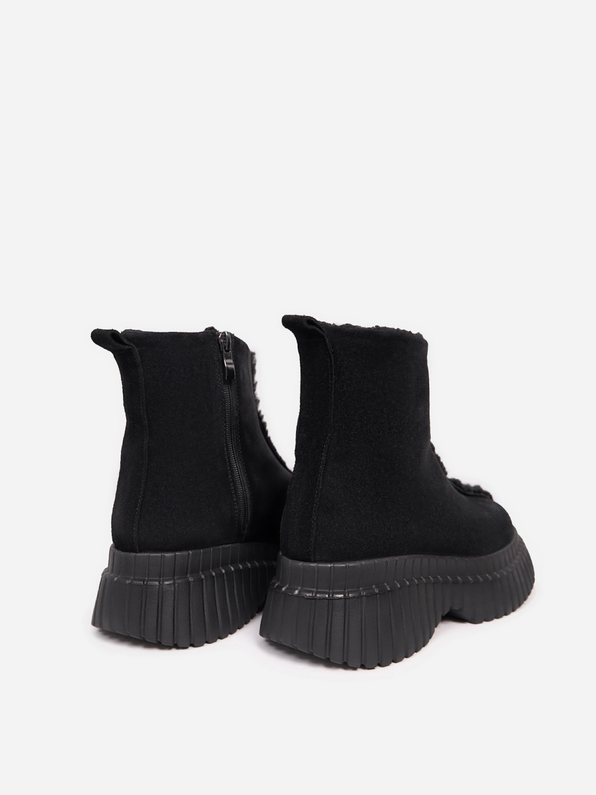 Теплые черные ботинки с внешним швом, выполненные из натуральной замши на меху. Модель на платформе с боковой молнией. Материал верха: натуральная замша. Подклад: мех искусственный. Подошва: ЭВА. Высота подошвы: 6 см и 4 см. Высота ботинок: 14 см. Замеры: 36 (23,5), 37 (24), 38 (24,5), 39 (25), 40 (25,5), 41 (26)