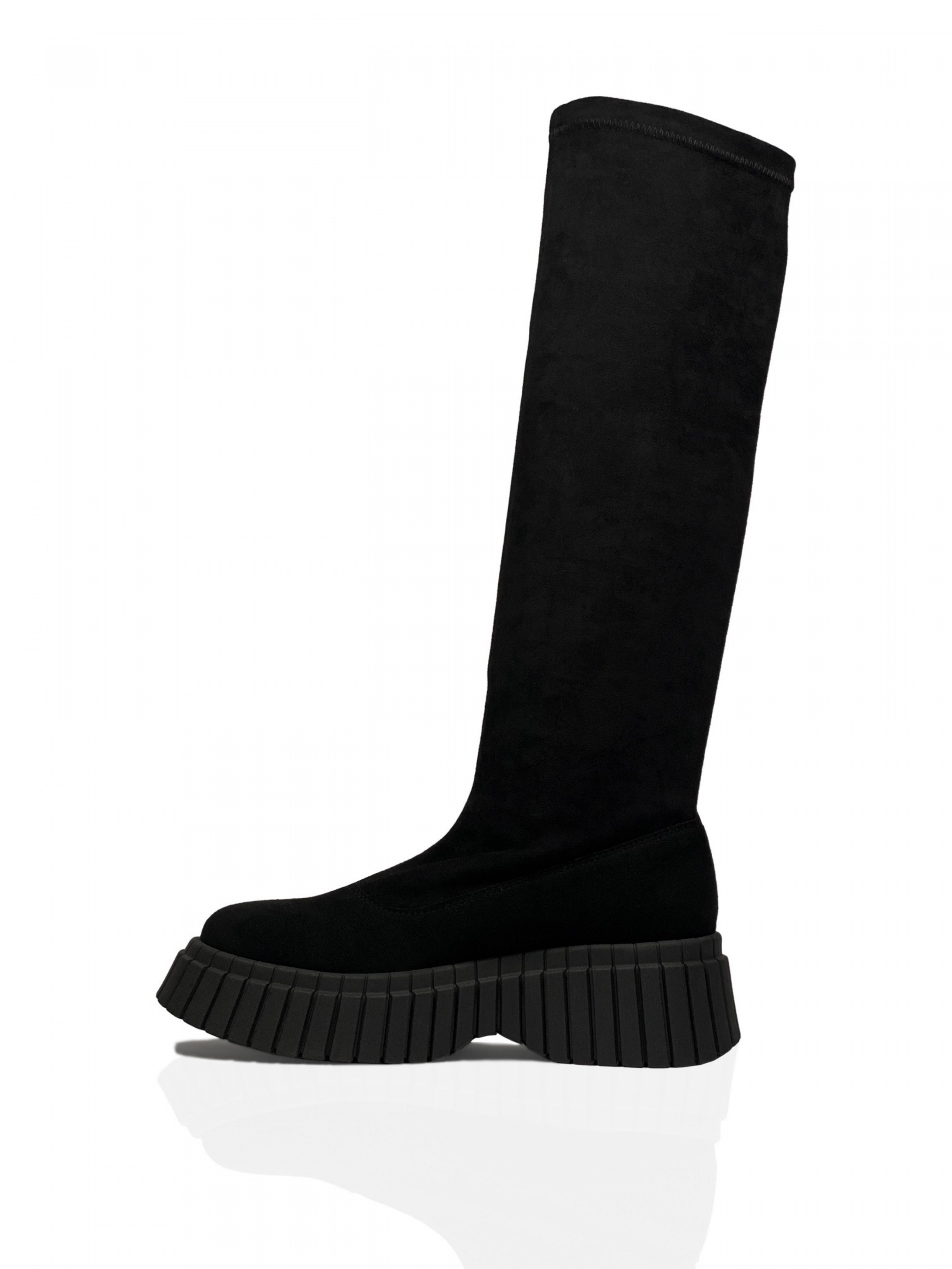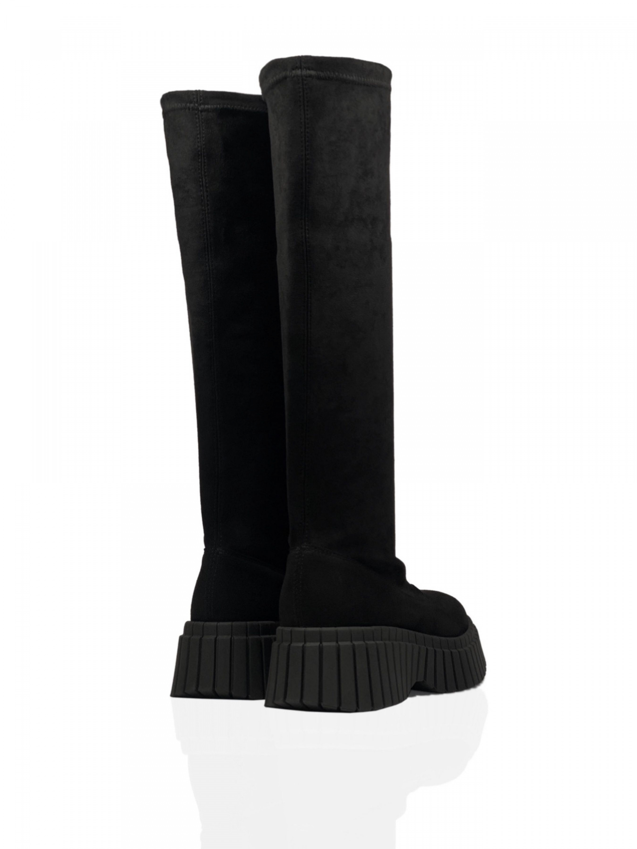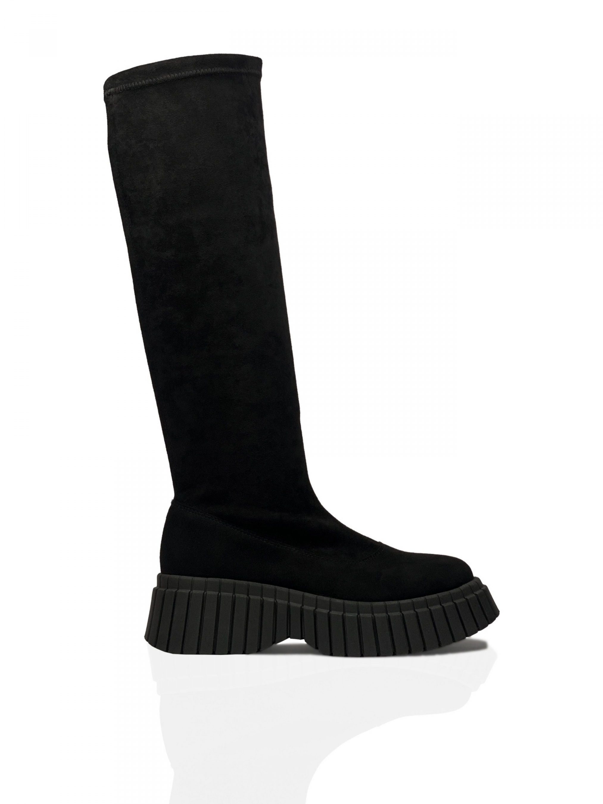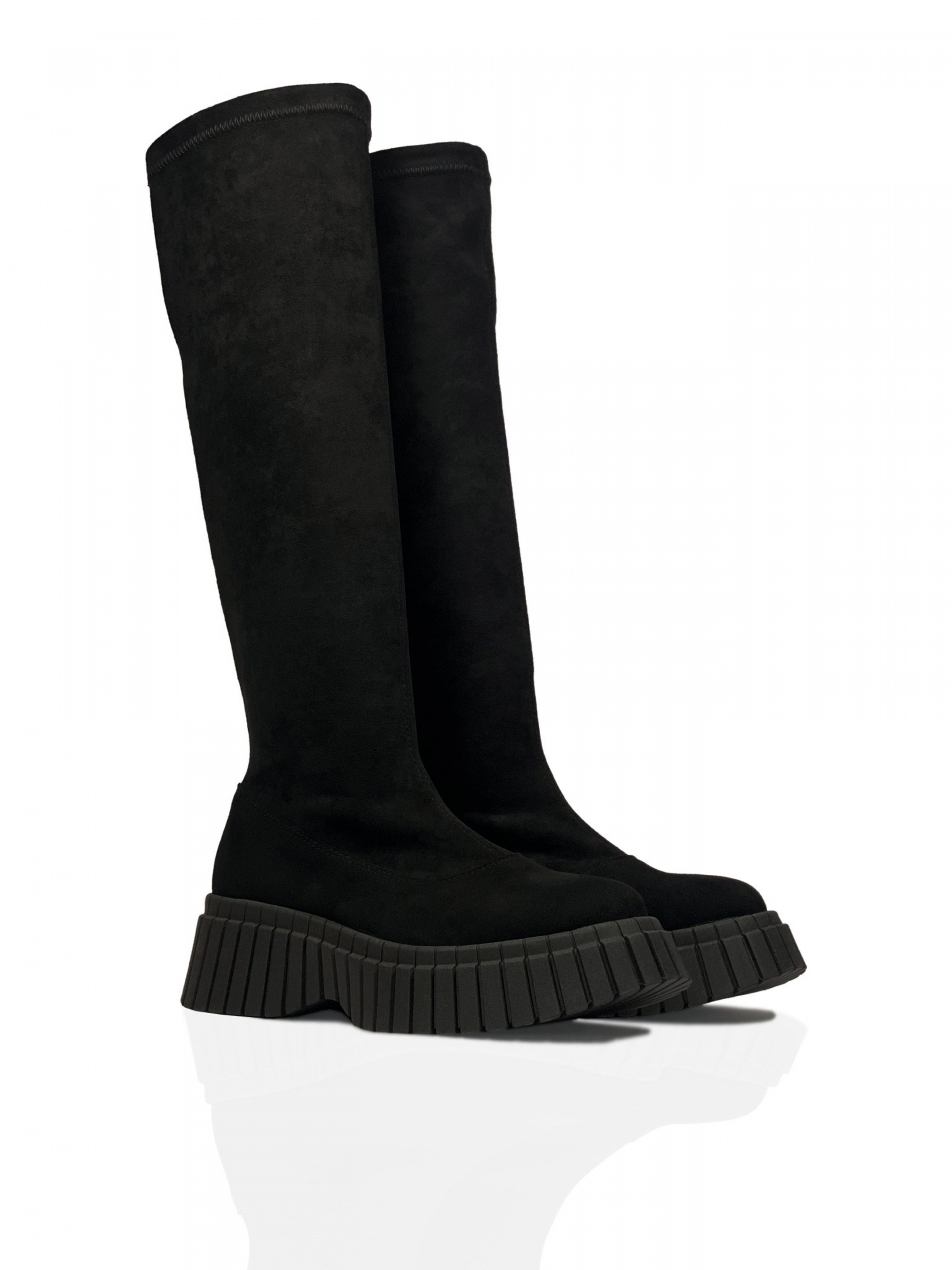 Зовнішній матеріал: Стрейч-велюр – це тканина з дрібним густим коротким ворсом, який робить її дуже приємною на дотик. Присутність стрейча (тобто вплетення еластичних ниток) надає їй еластичності. Велика щільність тканини гарантує його високу стійкість до зношування. Матеріал гарно облягає форму ноги, робить її візуально худішою, зберігає якість та не розтягується, добре зберігає тепло та «дихає».