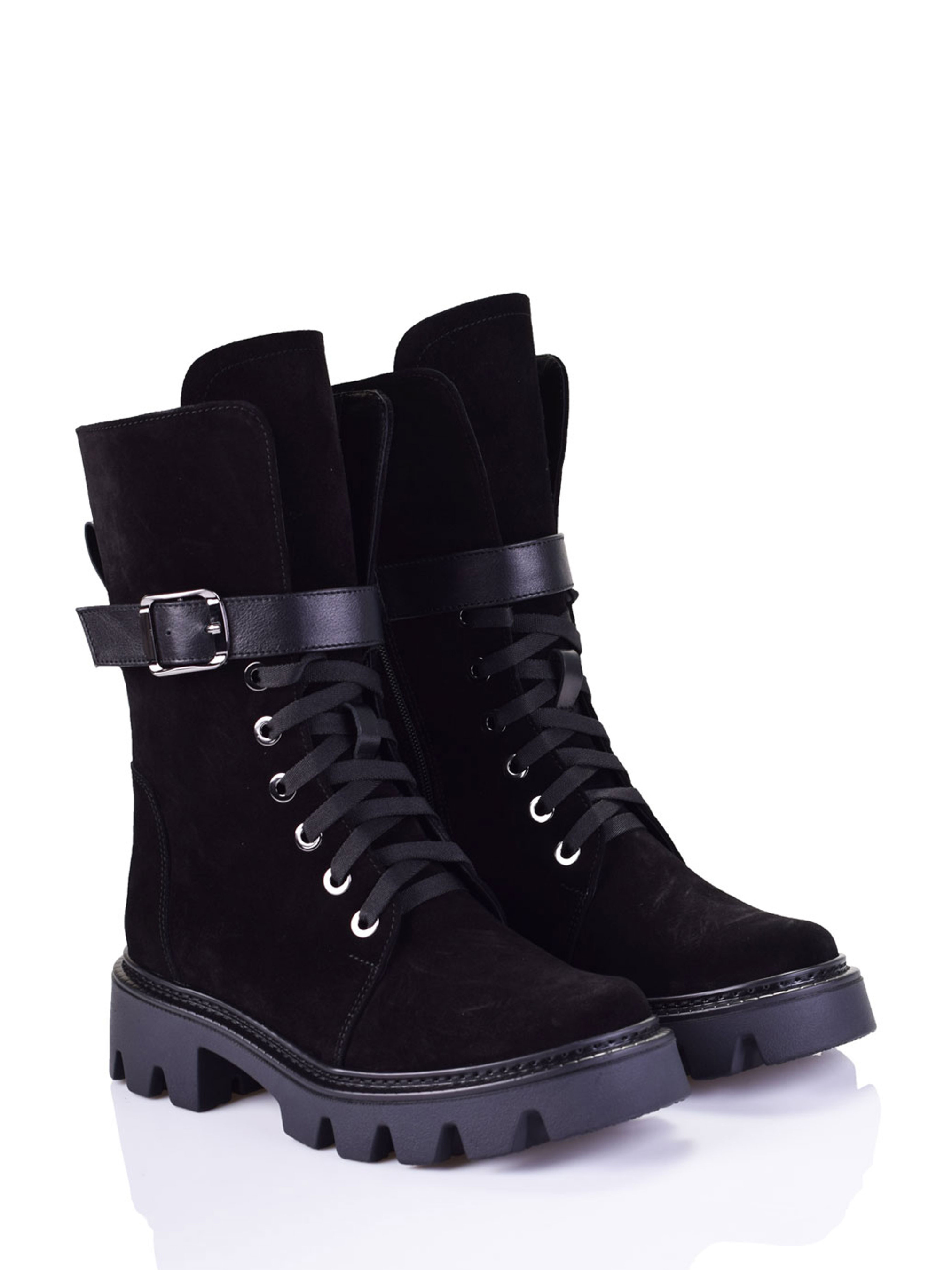 Зимние ботинки из натуральной замши на шнуровке. Высота каблука - 5 см. Высота ботинка - 22 см.