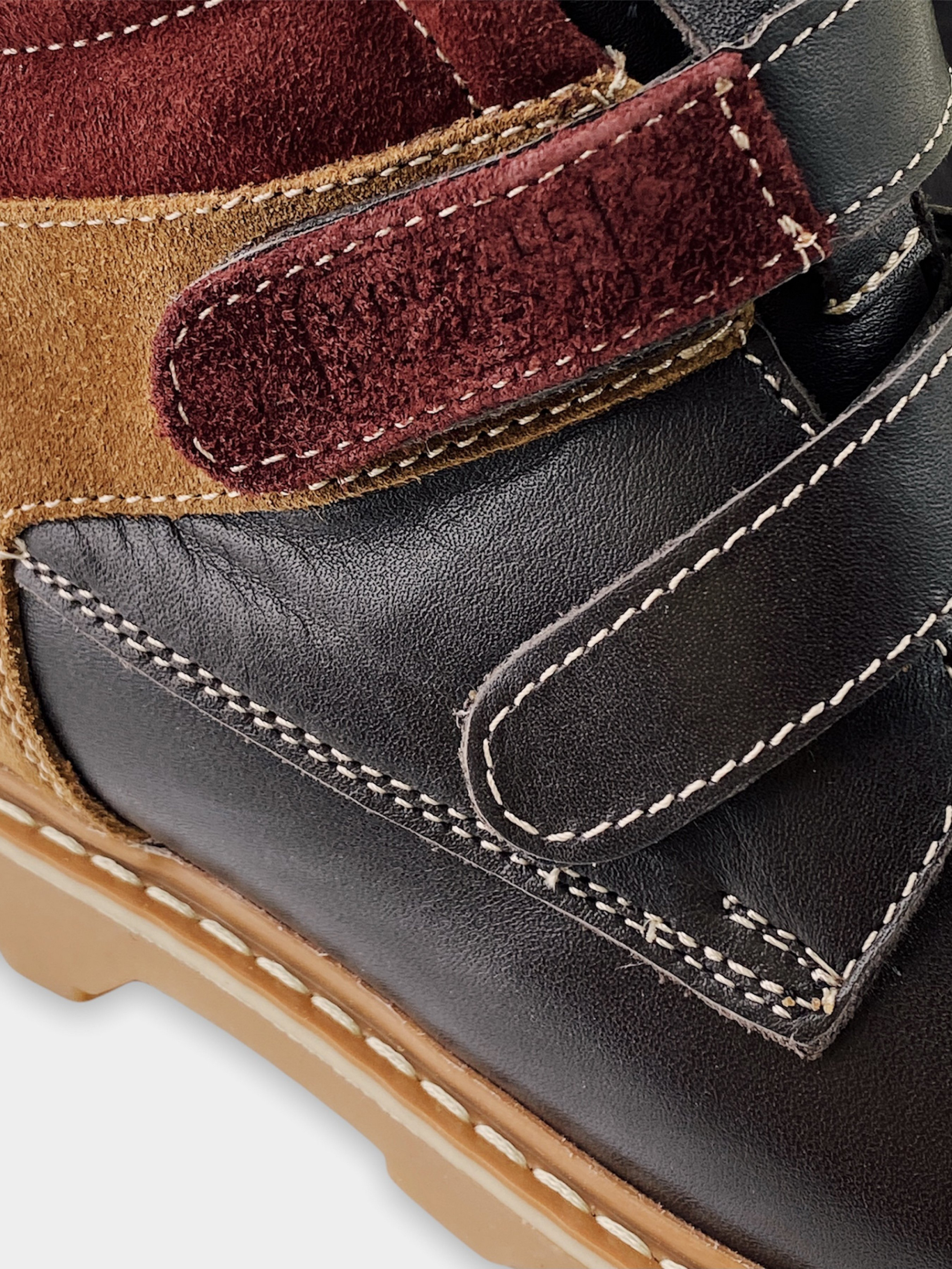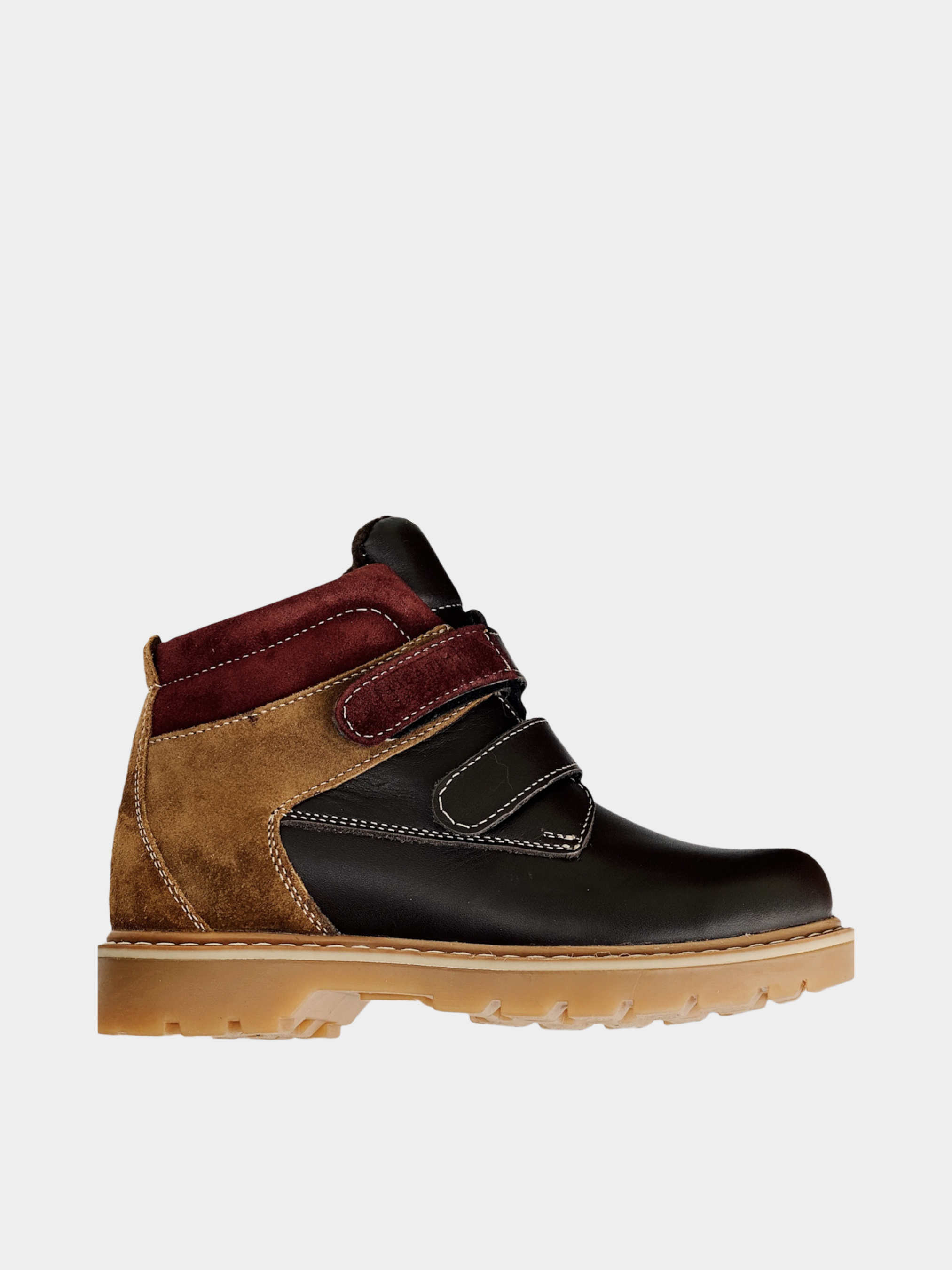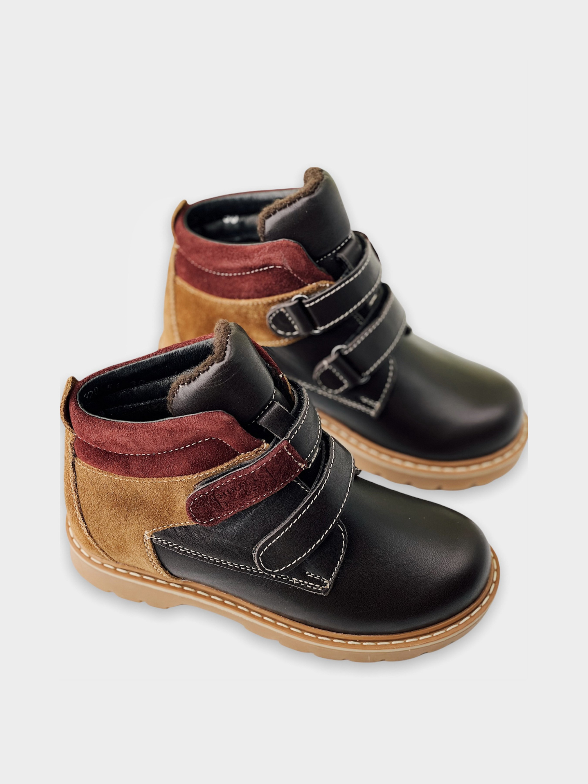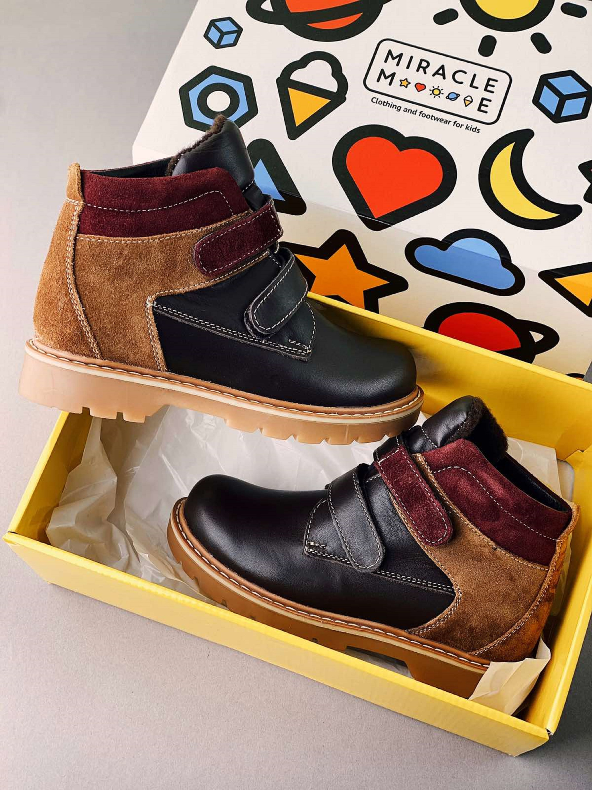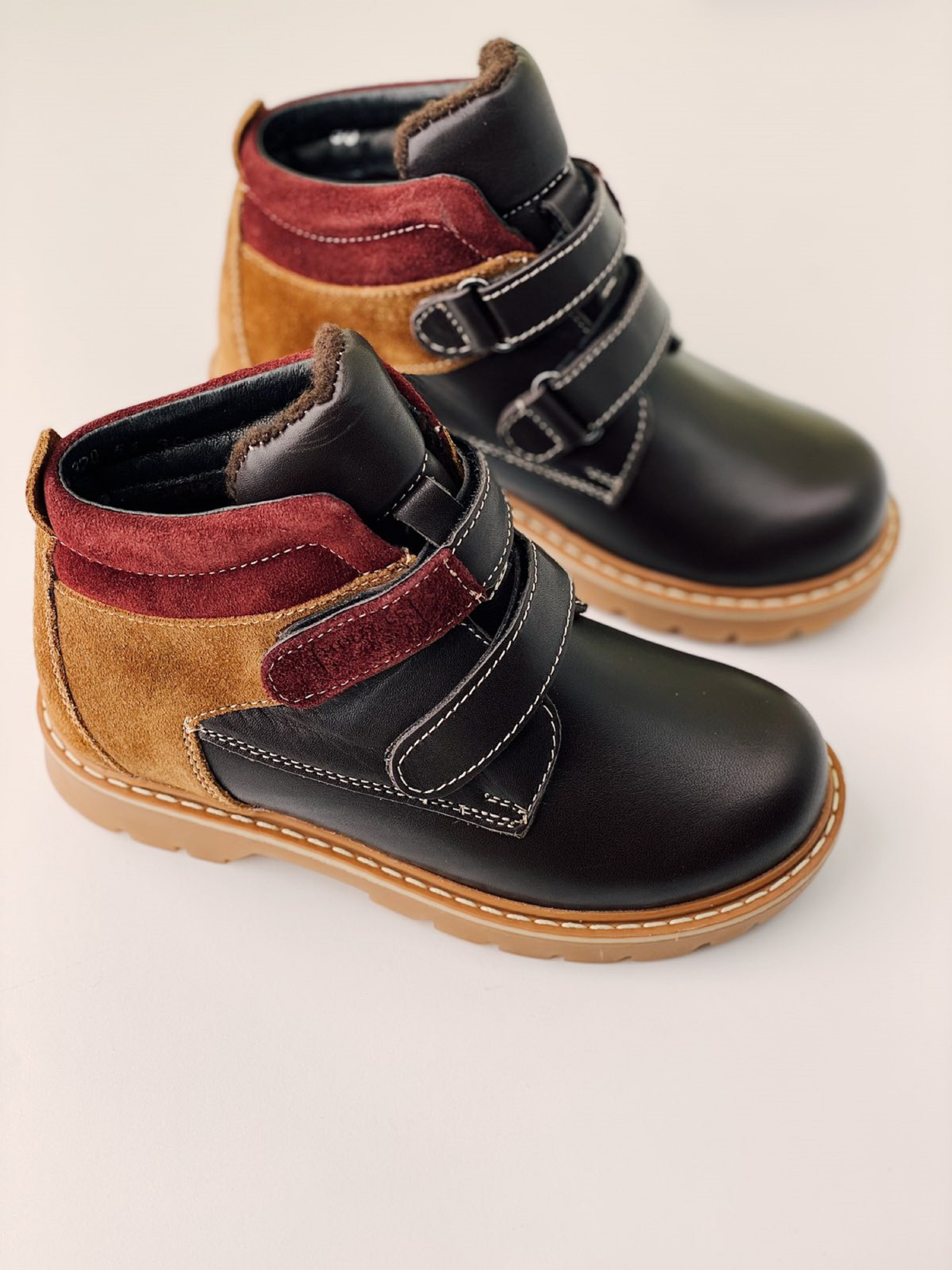 Модные коричневые ботинки из кожи и нубука с бордовыми элементами– лучший выбор при наступлении холодов. Подкладка из шерсти защищает ноги от перемерзания, а надежная подошва от промокания. Withstand temperature from -10 till -15℃. Ребенку очень удобно надевать такие ботинки – застежки на липучках позволяют быстро обуваться и разуваться самостоятельно.