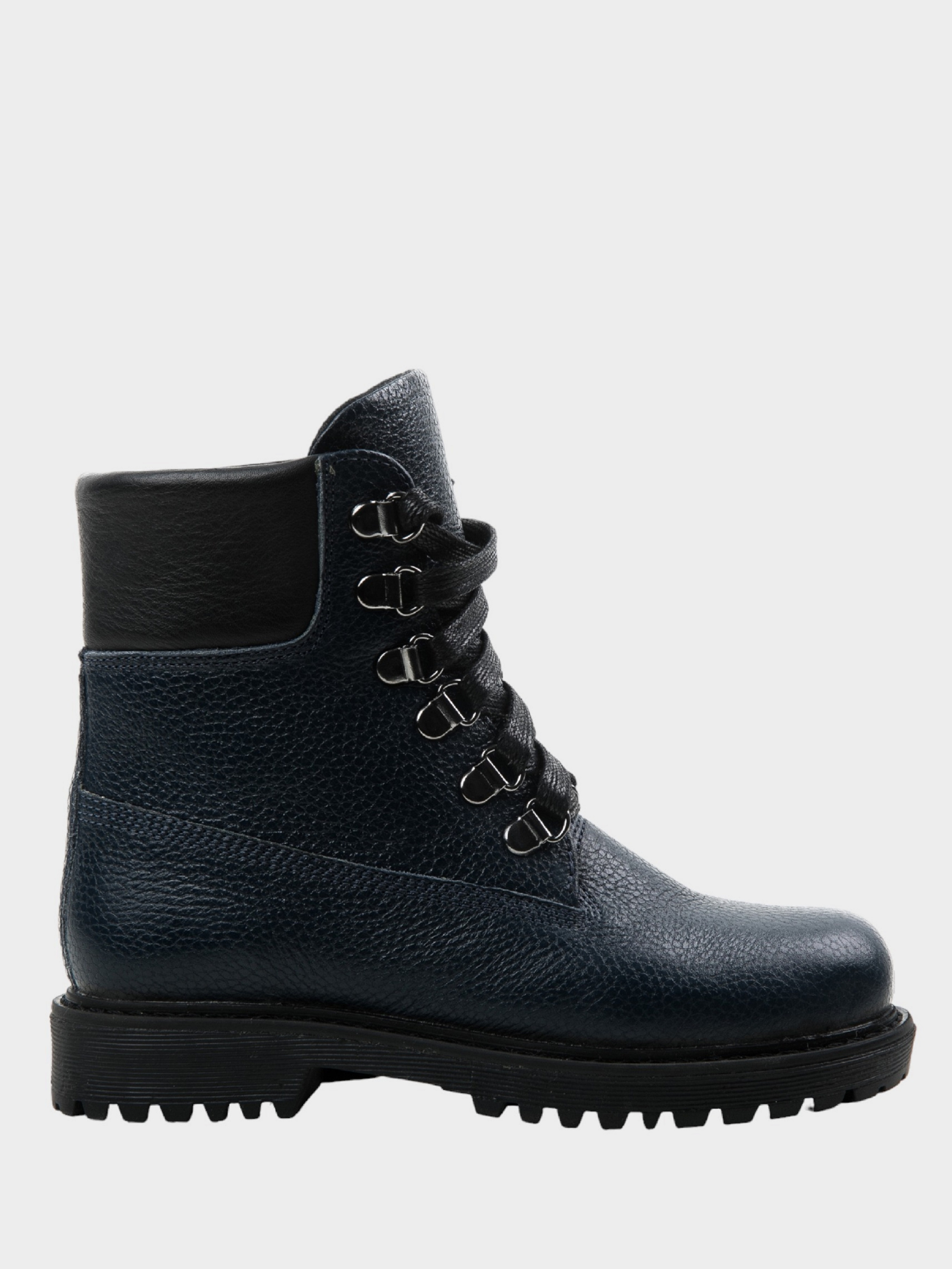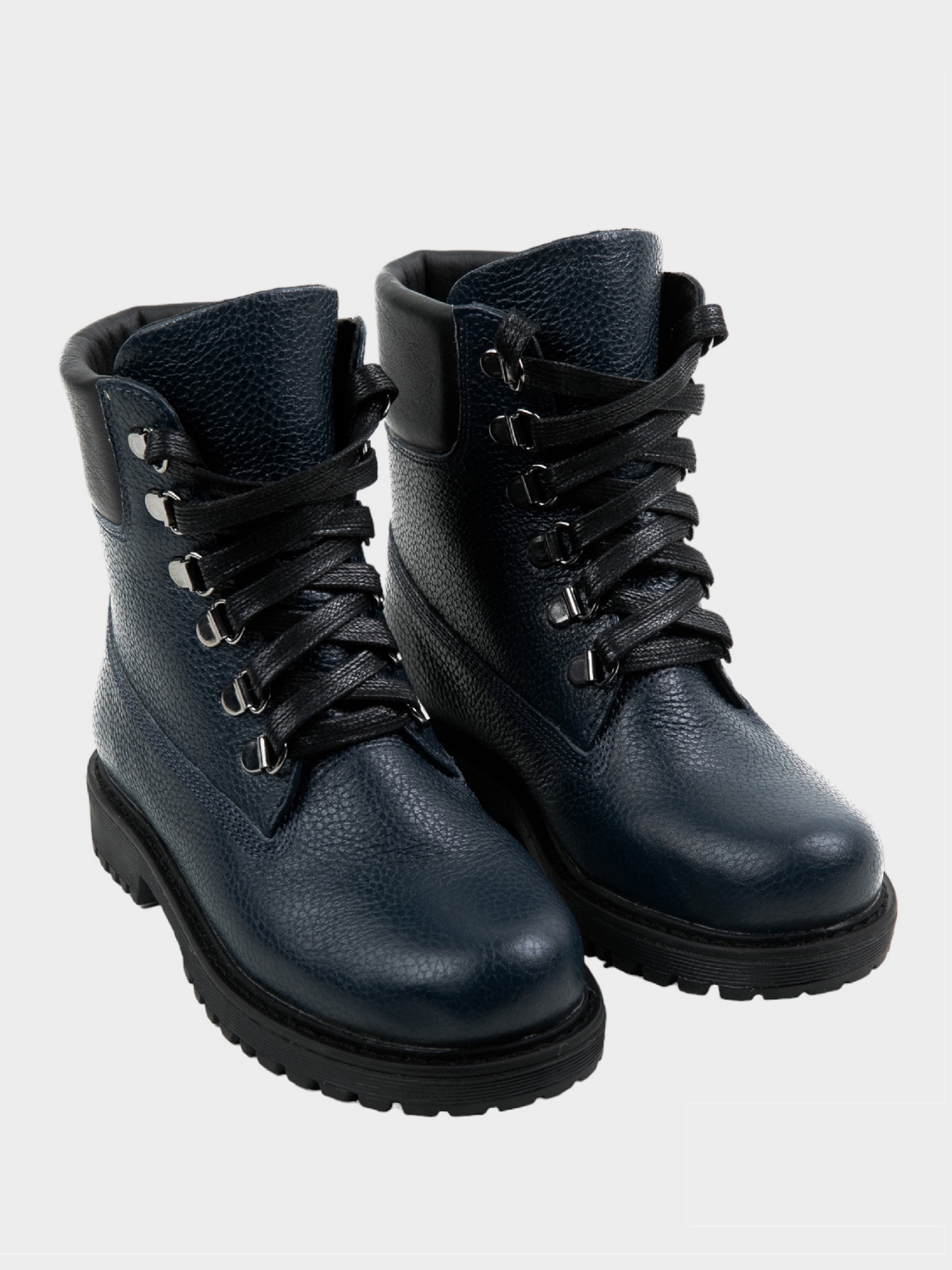 Эта модель ботинок изготовлена в глубоком синем цвете с черным манжетом.