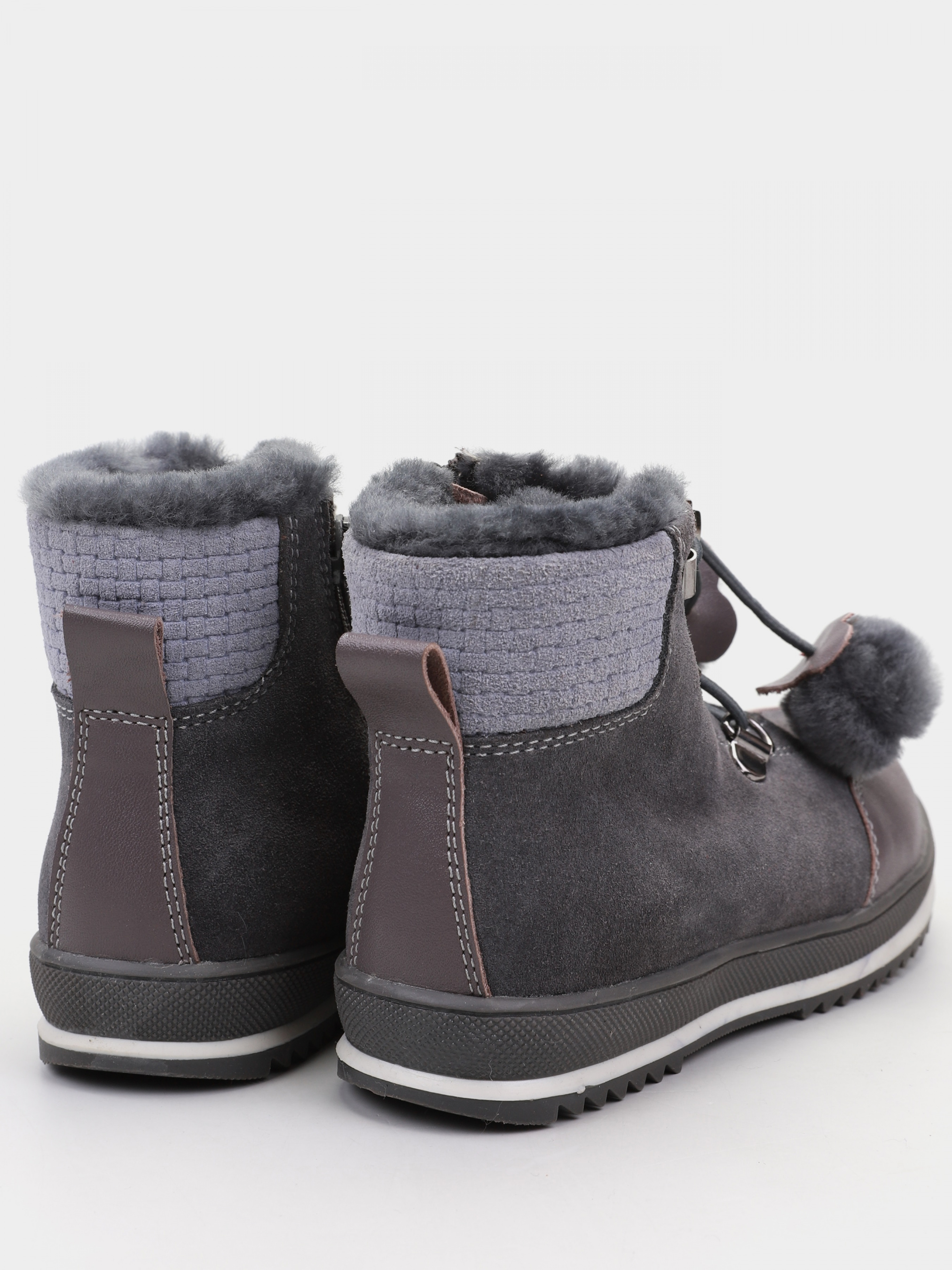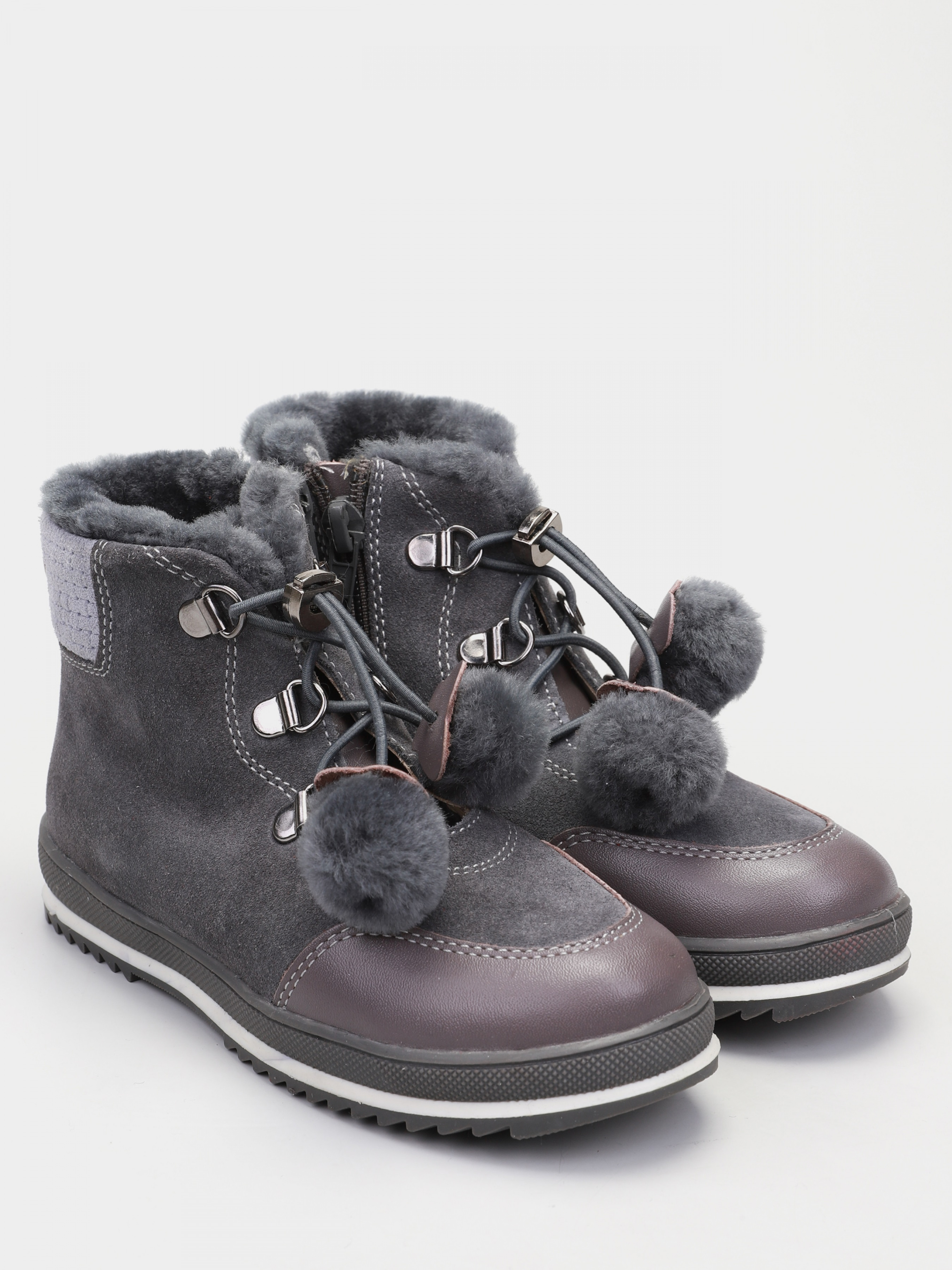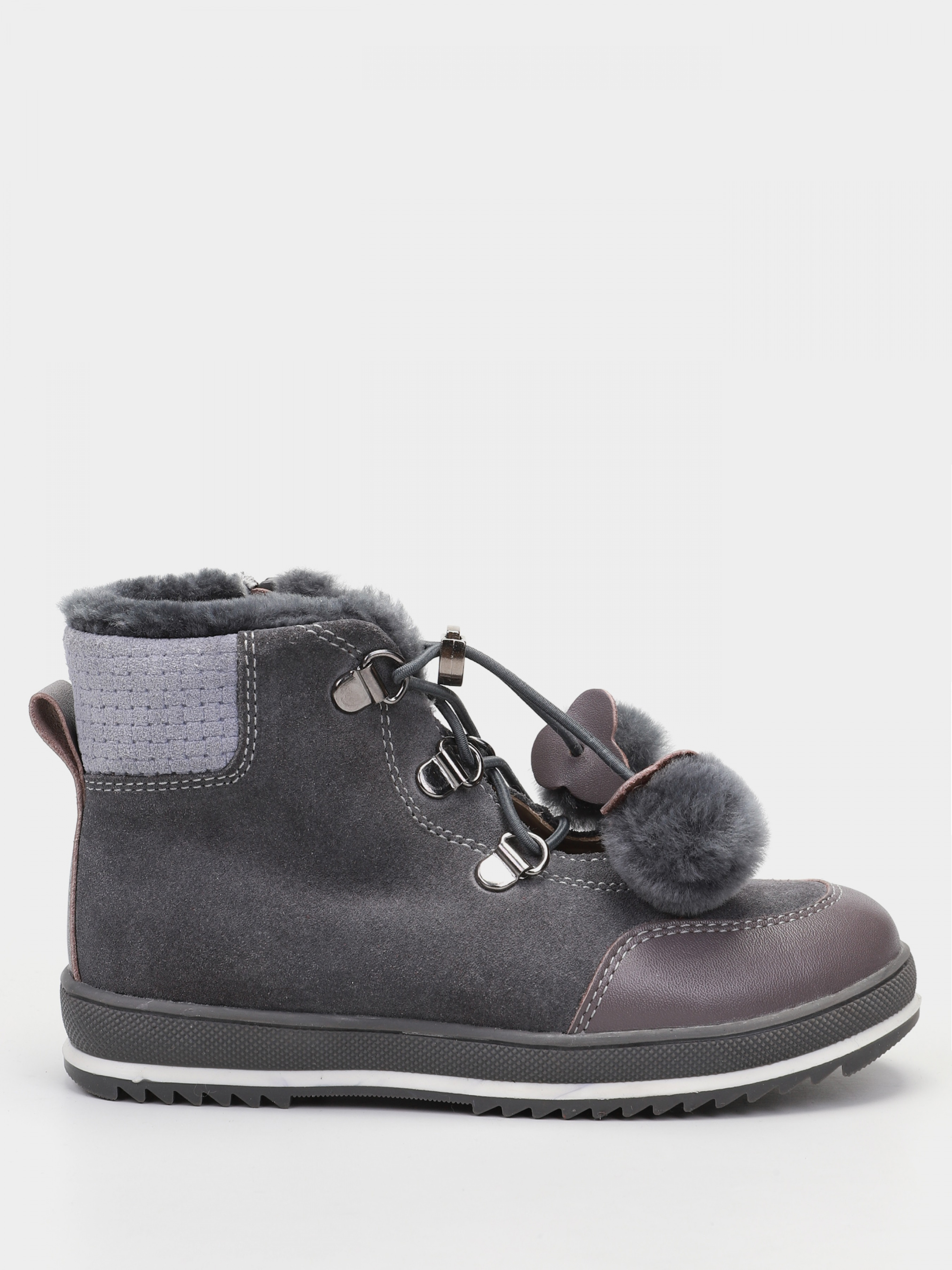 Стильные ботинки, выполненные в нескольких оттенках серого придадут не только красоты, но и тепла. Такой вариант обуви всегда будет в моде, и понравится любому ребенку. Данная модель имеет красивые помпоны, которые являются завязками вместо шнурков. Выполнена модель из качественного спилка, внутри имеется натуральная цигейка, а прочности и устойчивости придаёт подошва.