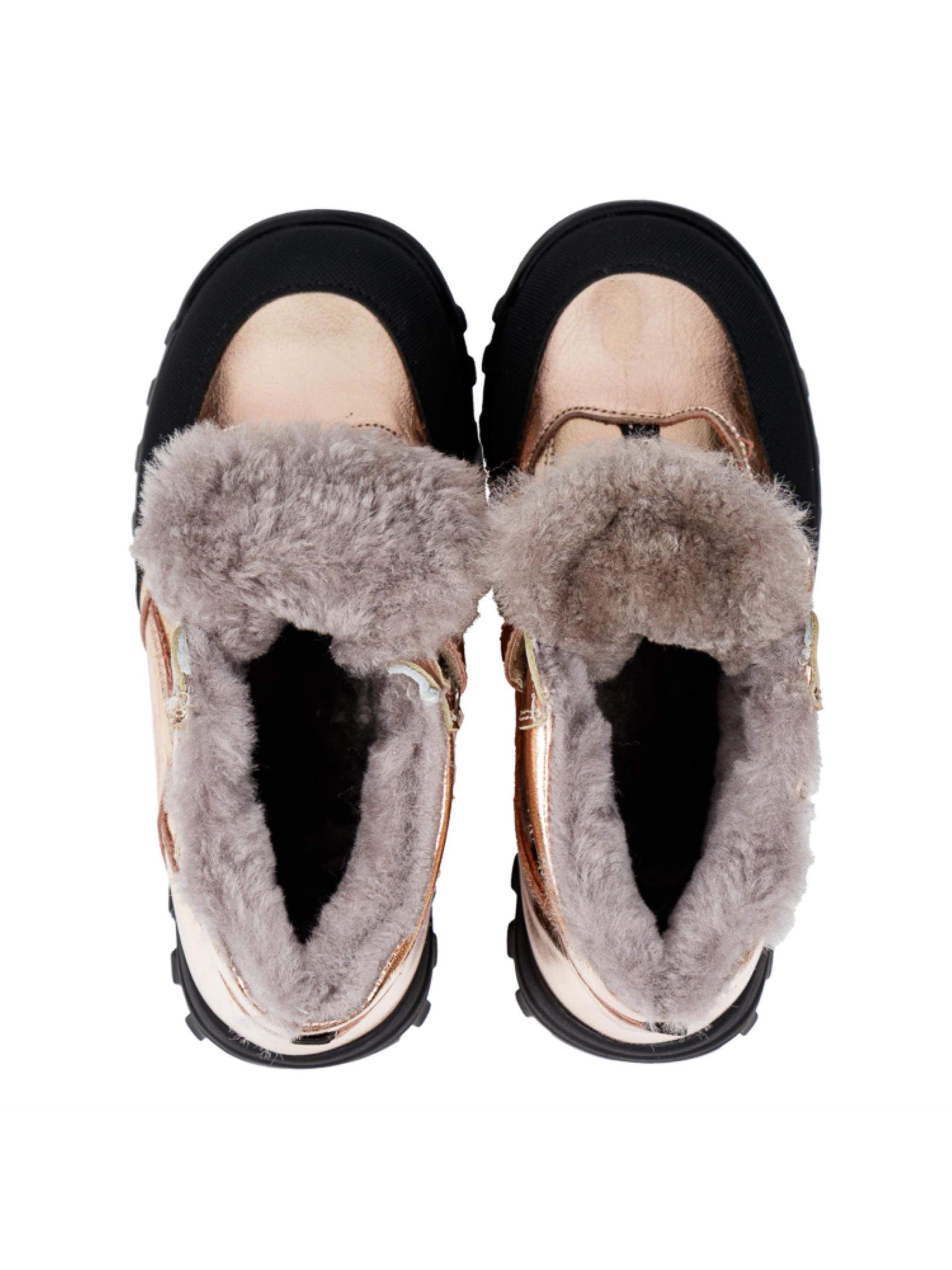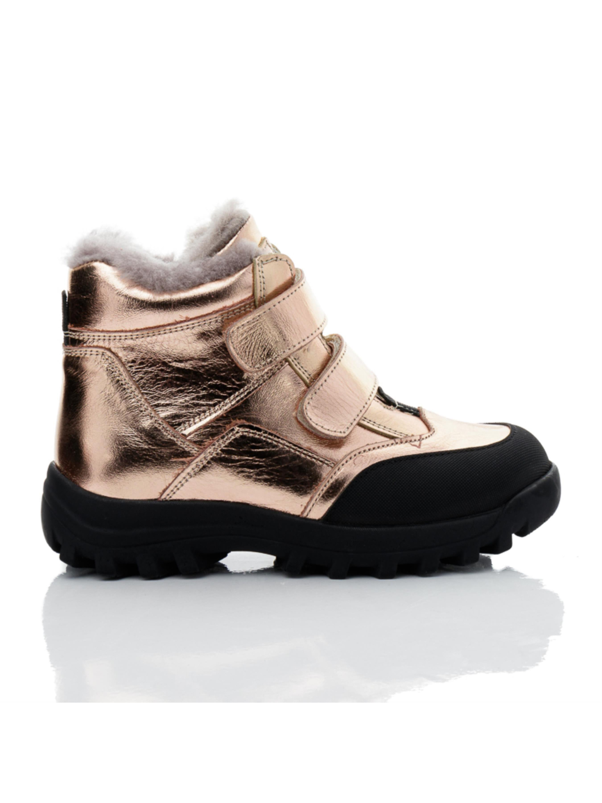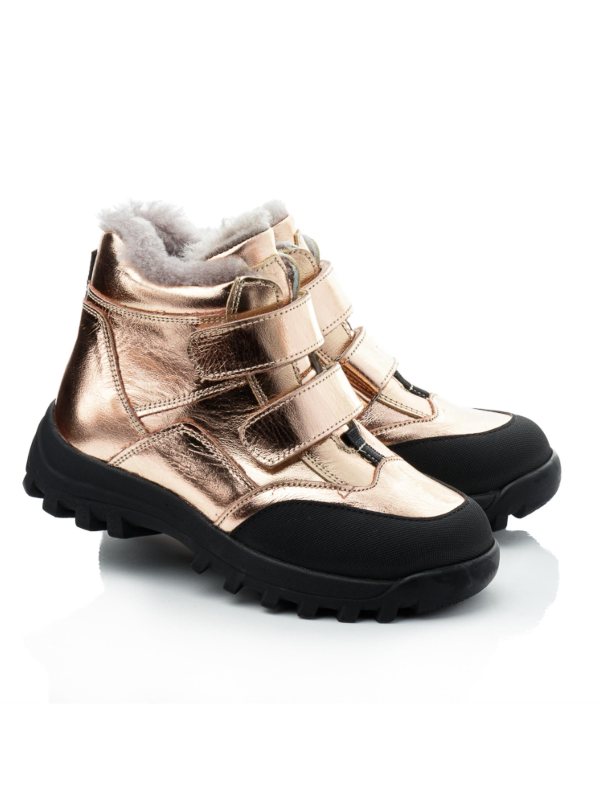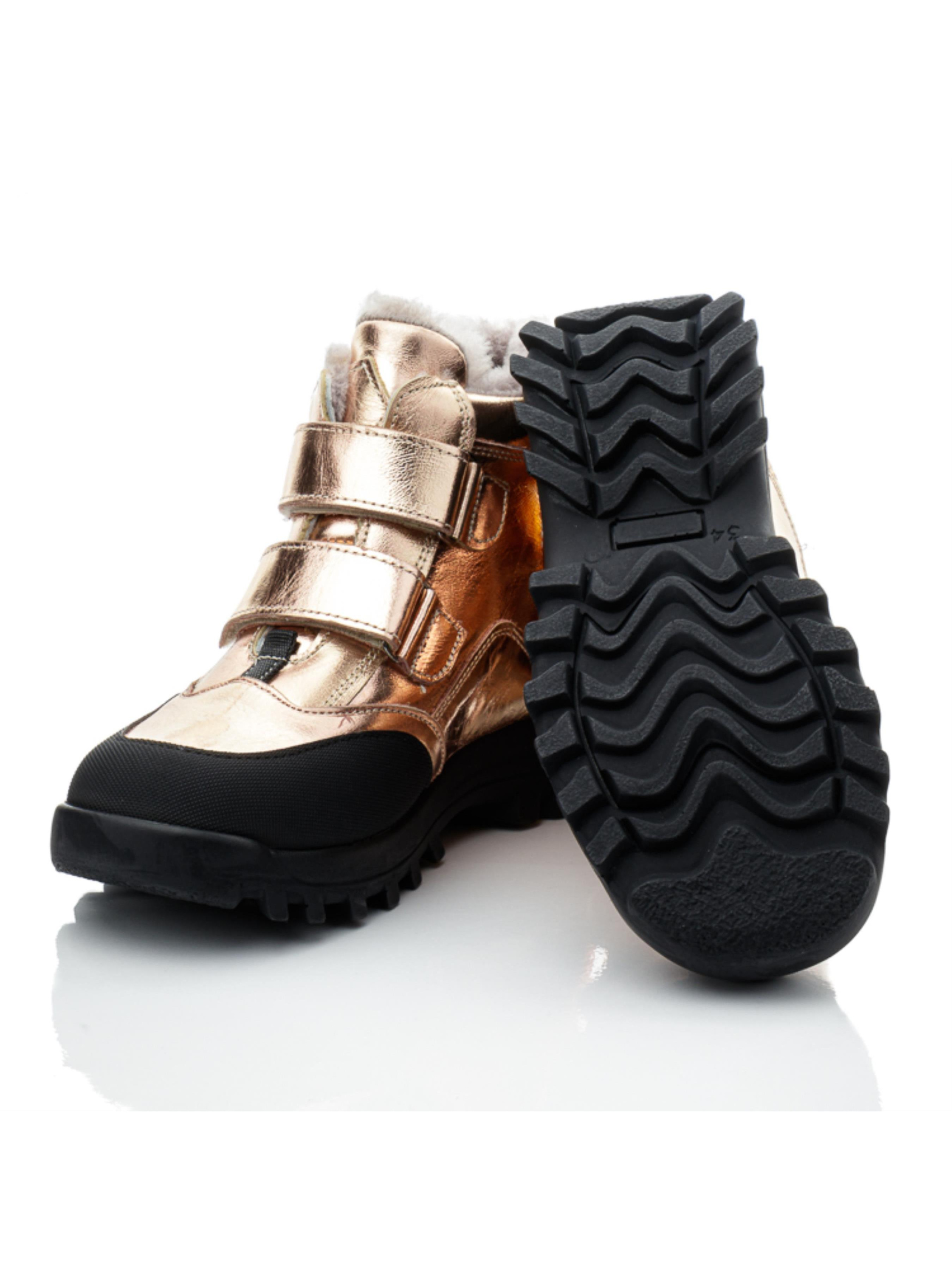 Эти стильные зимние ботинки для девочек от турецкого бренда Papi – идеальный выбор для холодного времени года. Выполненные в модном золотистом цвете, они привлекают внимание и добавляют яркости зимнему гардеробу. Верх изделия изготовлен из натуральной кожи, что обеспечивает долговечность и комфорт, а внутри ботинок – утеплитель из натуральной цигейки, который надёжно сохраняет тепло. Защищённый носок с усилением «неубивайка» обеспечивает дополнительную защиту от ударов и износа. Прочная подошва с протектором гарантирует устойчивость и надёжное сцепление на зимних поверхностях. Эта детская зимняя обувь сочетает стиль, тепло и удобство, идеально подходя для активных зимних прогулок и ежедневного ношения.