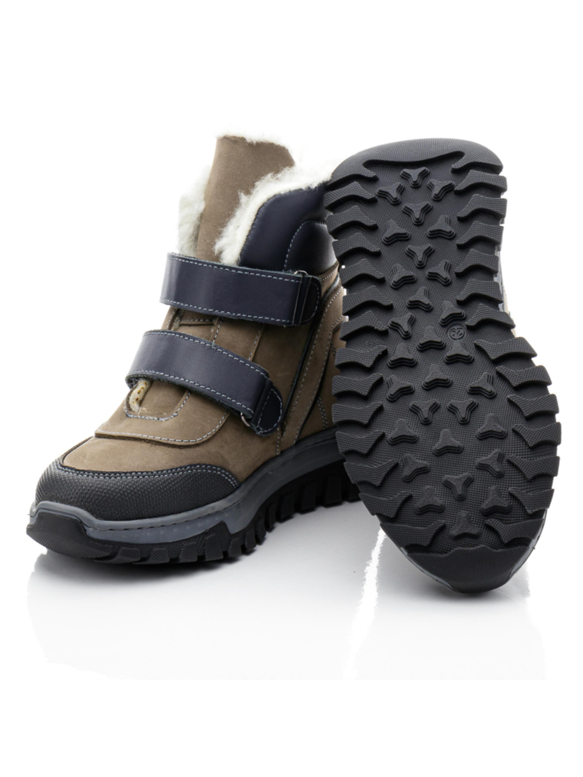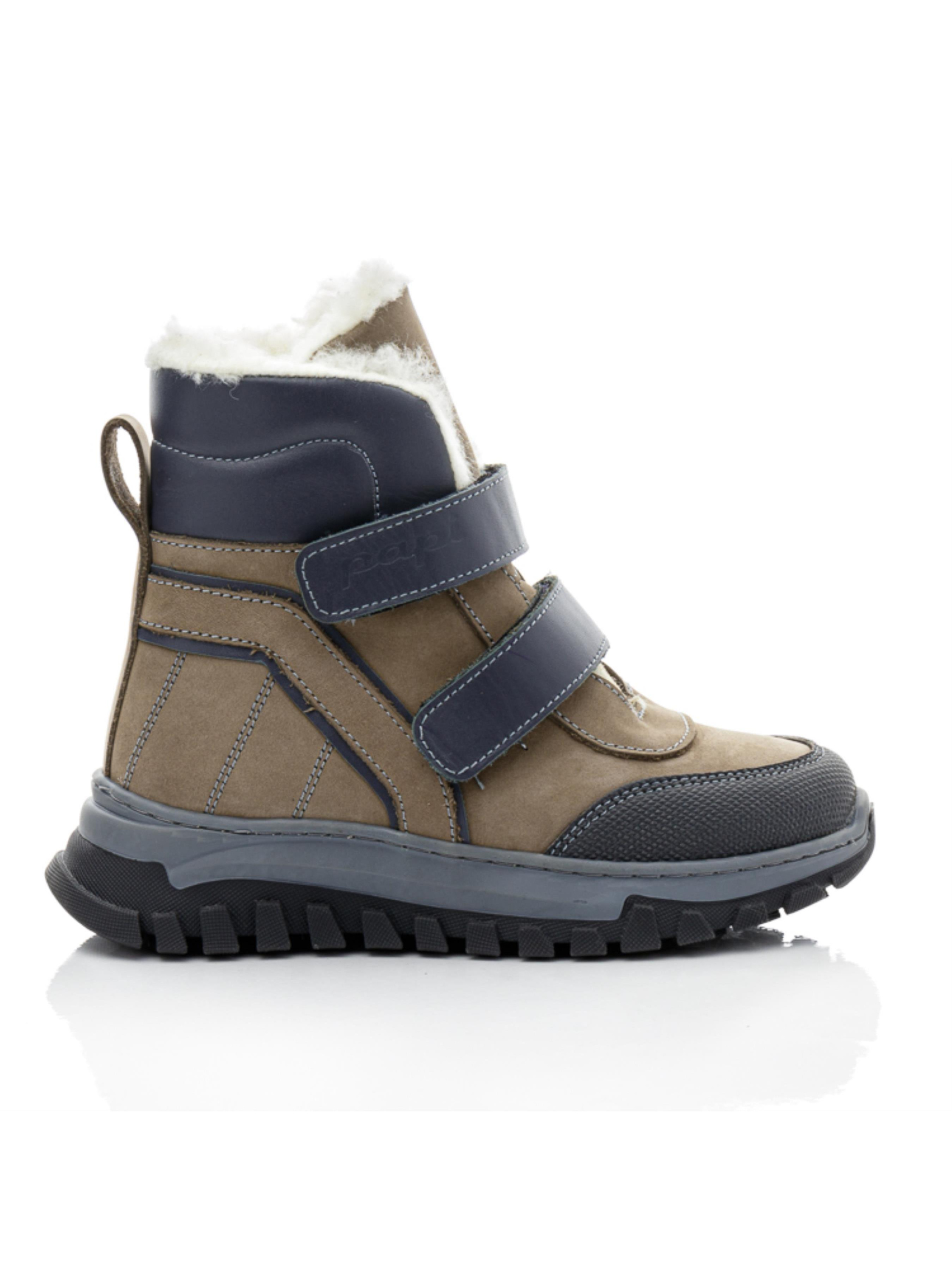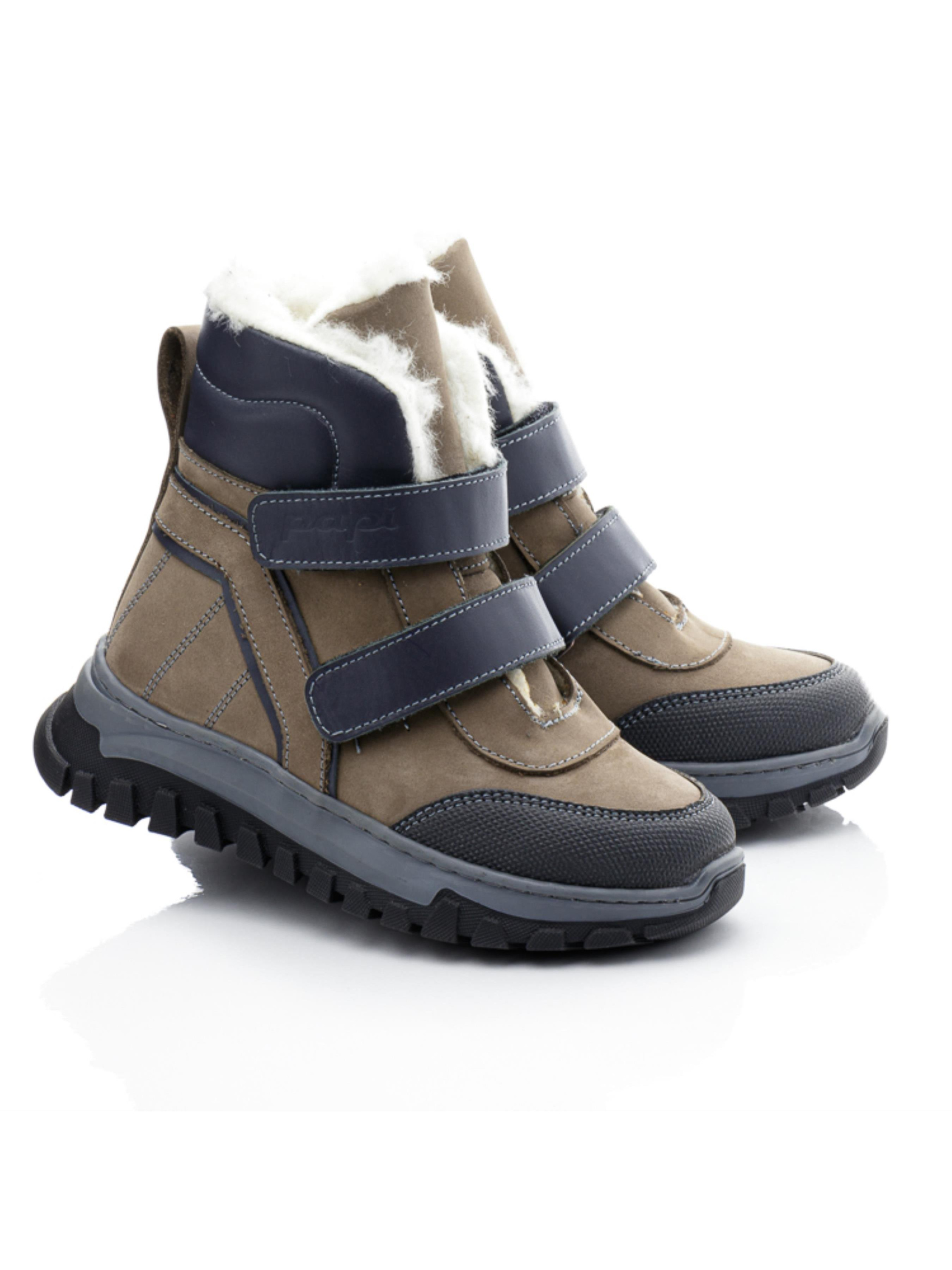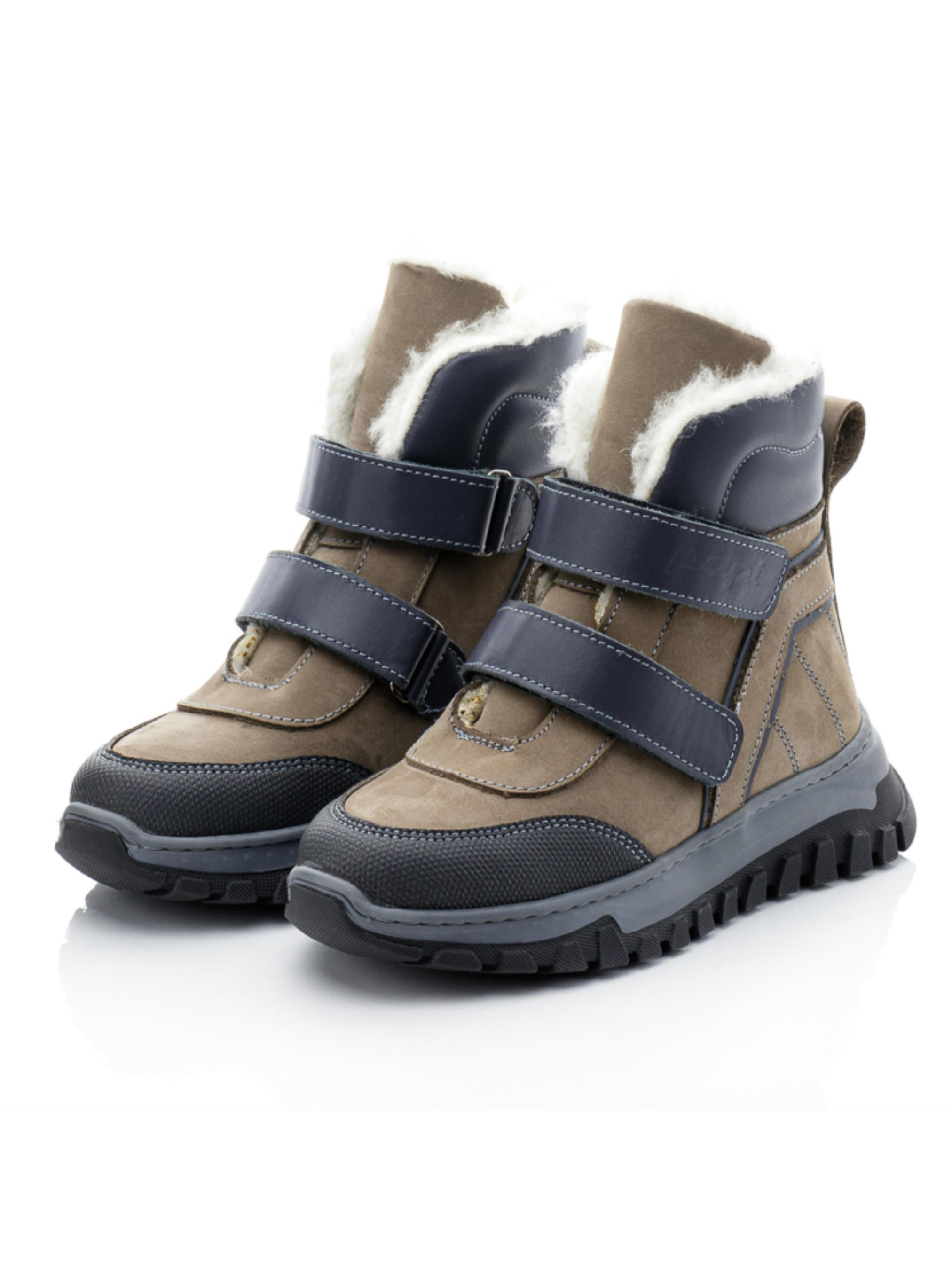 Эти практичные детские зимние ботинки для мальчиков от турецкого бренда Papi выполнены в приятном сочетании серого и темно-серого цветов. Натуральный нубук с кожаными вставками придает обуви стильный и современный вид, а также гарантирует долговечность и устойчивость к зимним условиям. Внутренняя подкладка из натуральной шерсти обеспечивает тепло и комфорт, что делает эти ботинки отличным выбором для холодных дней. Усиленная часть на носке, "неубивайка", защищает от износа и повышает износостойкость. Две липучки позволяют легко надевать и снимать обувь, при этом надежно фиксируя ботинки на ноге ребенка. Прочная рельефная подошва обеспечивает хорошее сцепление с поверхностью, что делает эту детскую зимнюю обувь идеальной для активных прогулок и игр на свежем воздухе.