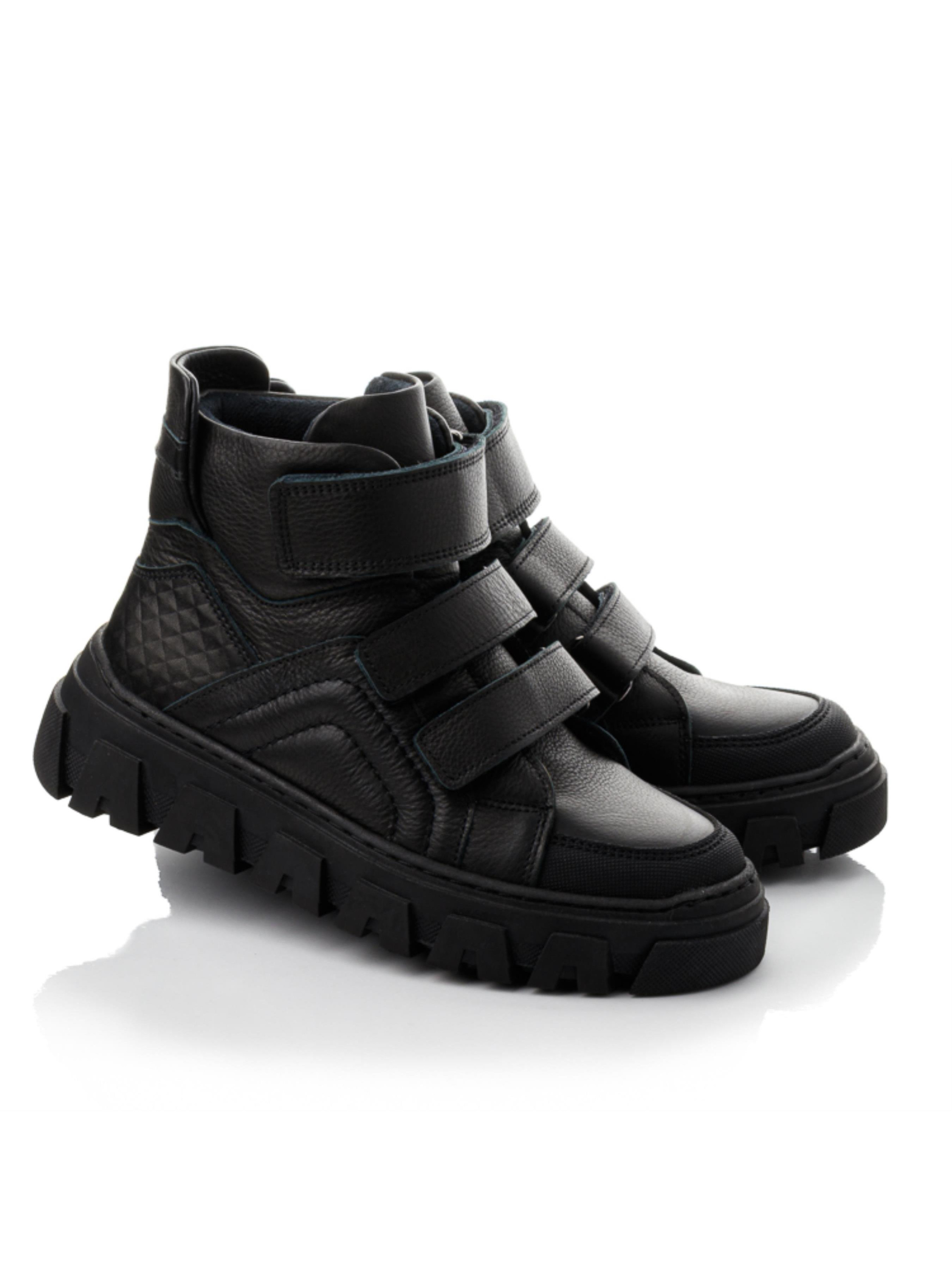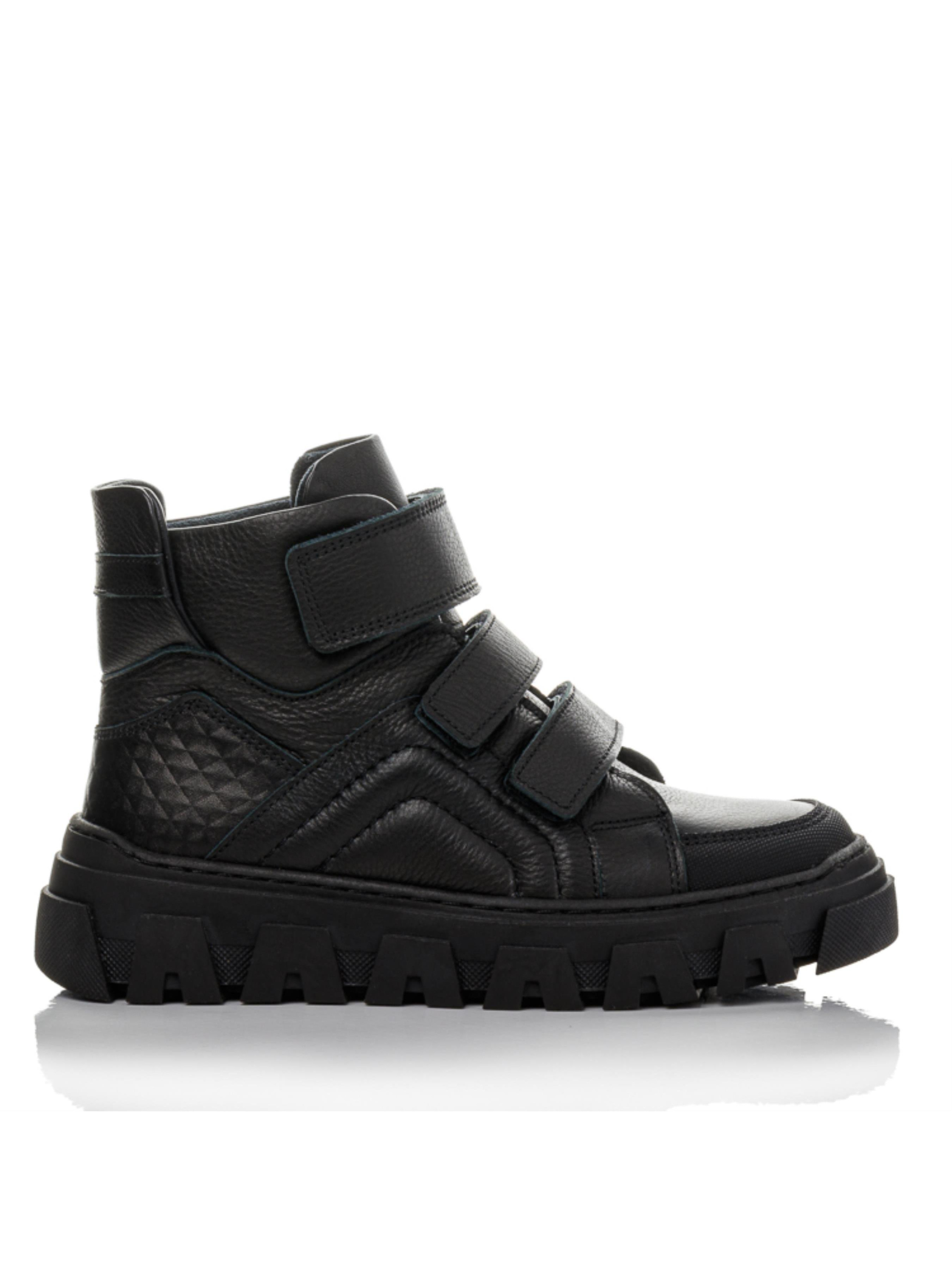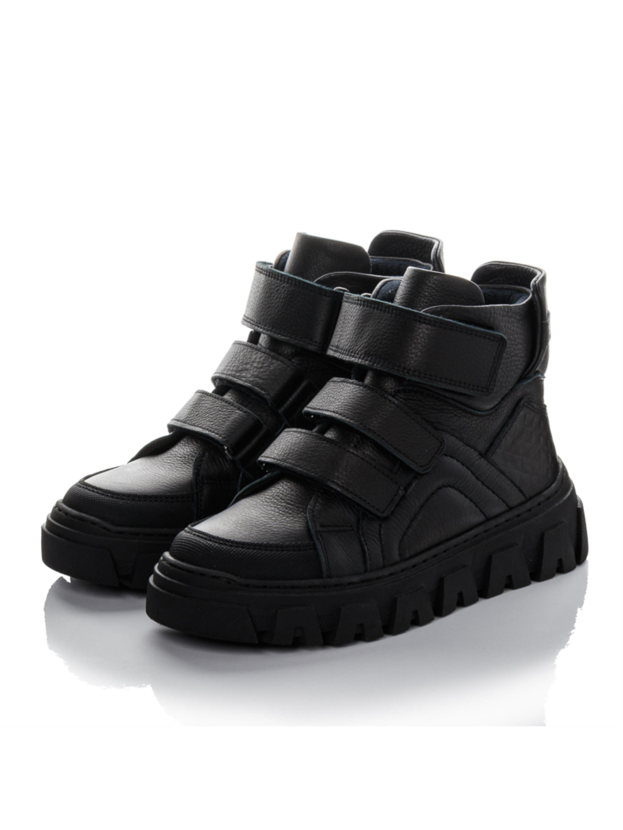 Смелые, городские, уверенные — ботинки из натуральной чёрной кожи созданы для тех, кто ценит стиль и надёжность. Массивная подошва придаёт модели современный вид и отлично подходит для осенне-зимнего сезона. Носок и пятка усилены материалом «неубивайка», который защищает обувь от истирания. Внутри — тёплый флис, анатомическая стелька с супинатором и жёсткий задник, обеспечивающие правильную поддержку стопы. Три липучки делают обувание простым и удобным. Эта подростковая демисезонная обувь из натуральной кожи представлена в размерах 32–40 — отличный выбор для школьников и подростков, которые хотят выглядеть стильно каждый день.
