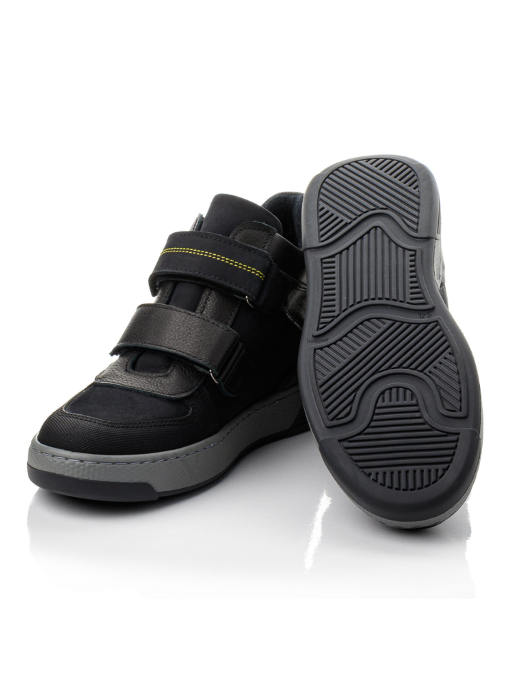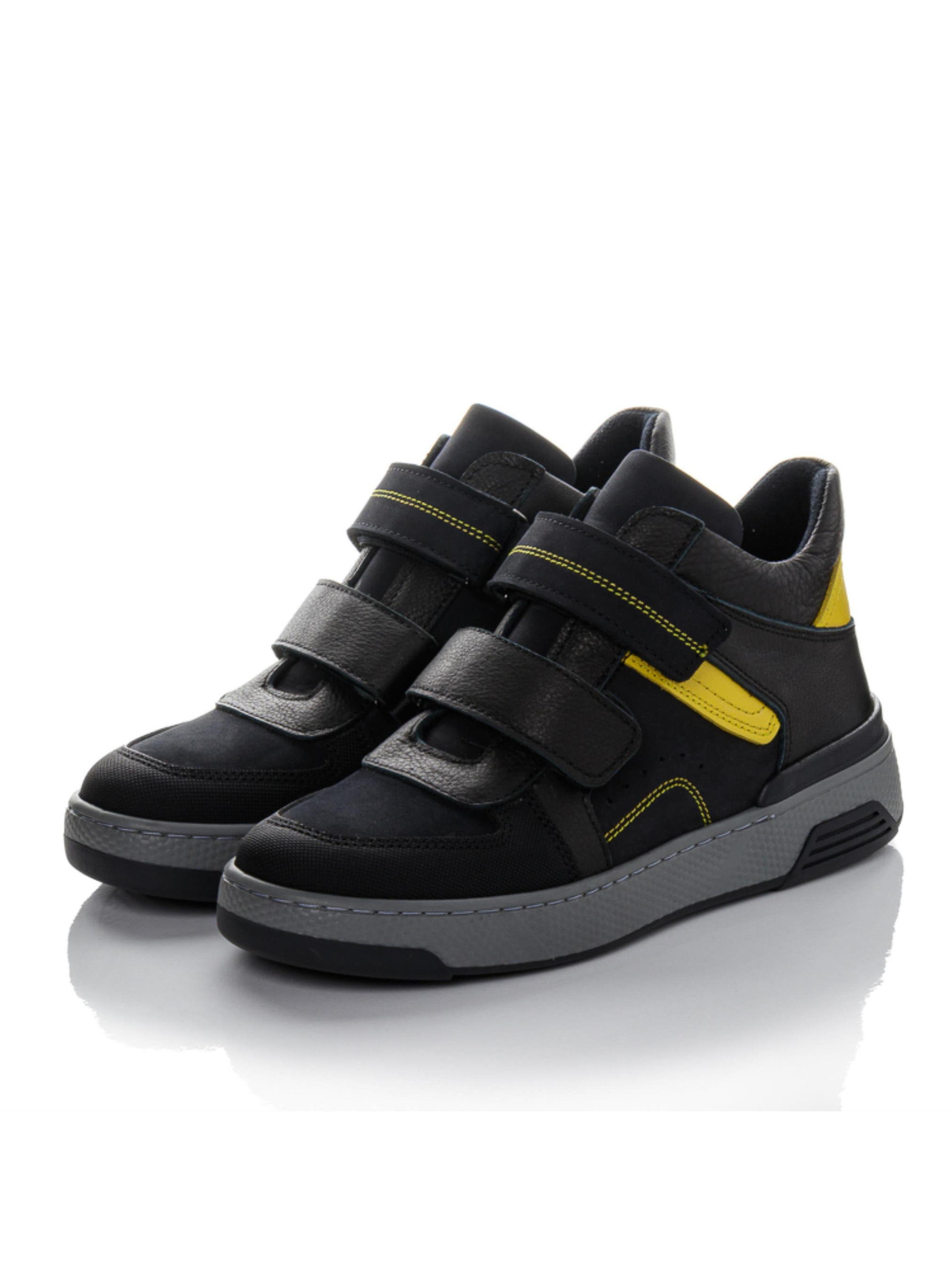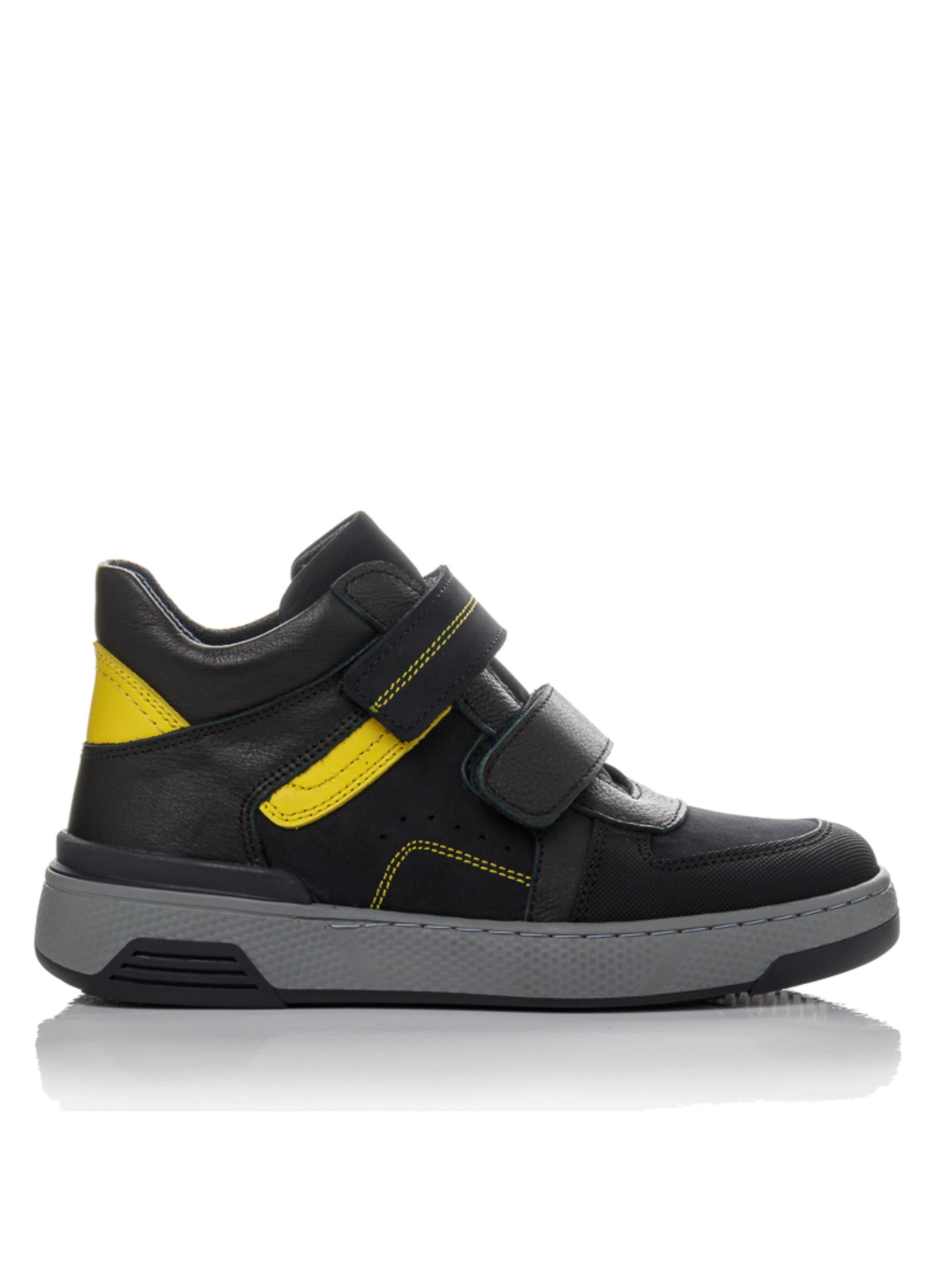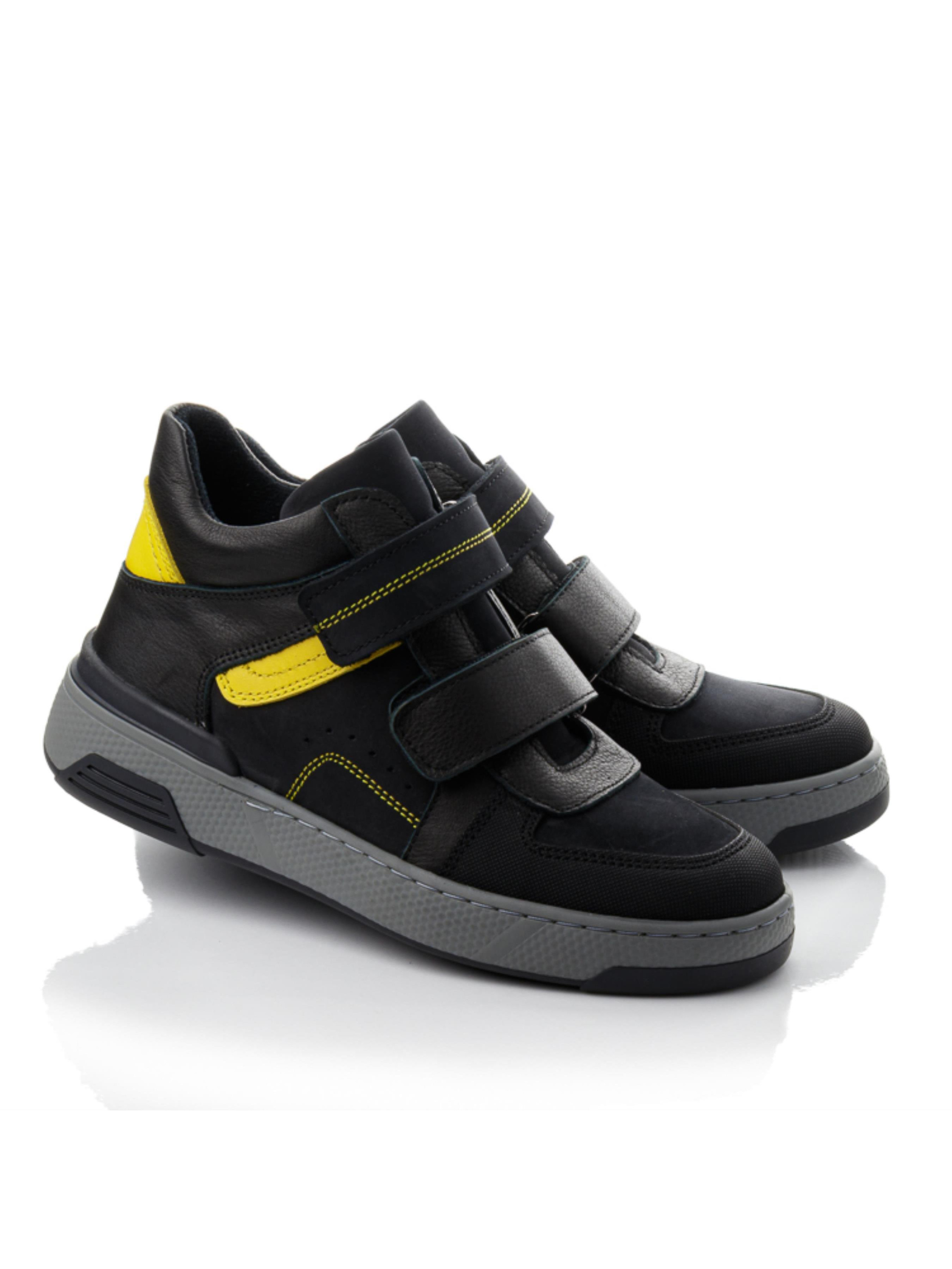 Сильные, выносливые, уверенные — именно такие детские и подростковые ботинки созданы для активных мальчиков. Изготовлены из натурального нубука чёрного цвета с жёлтыми вставками, они сочетают стиль и надёжность. Внутри — тёплый флис, анатомическая стелька с супинатором и жёсткий задник, обеспечивающие правильное развитие стопы. Три липучки позволяют быстро зафиксировать обувь на ноге, а серая рельефная подошва гарантирует устойчивость при активных движениях. Эта осенняя обувь из натурального нубука доступна в размерах 31–40 — отличный выбор для школьников и подростков, ценящих городской стиль и удобство.
