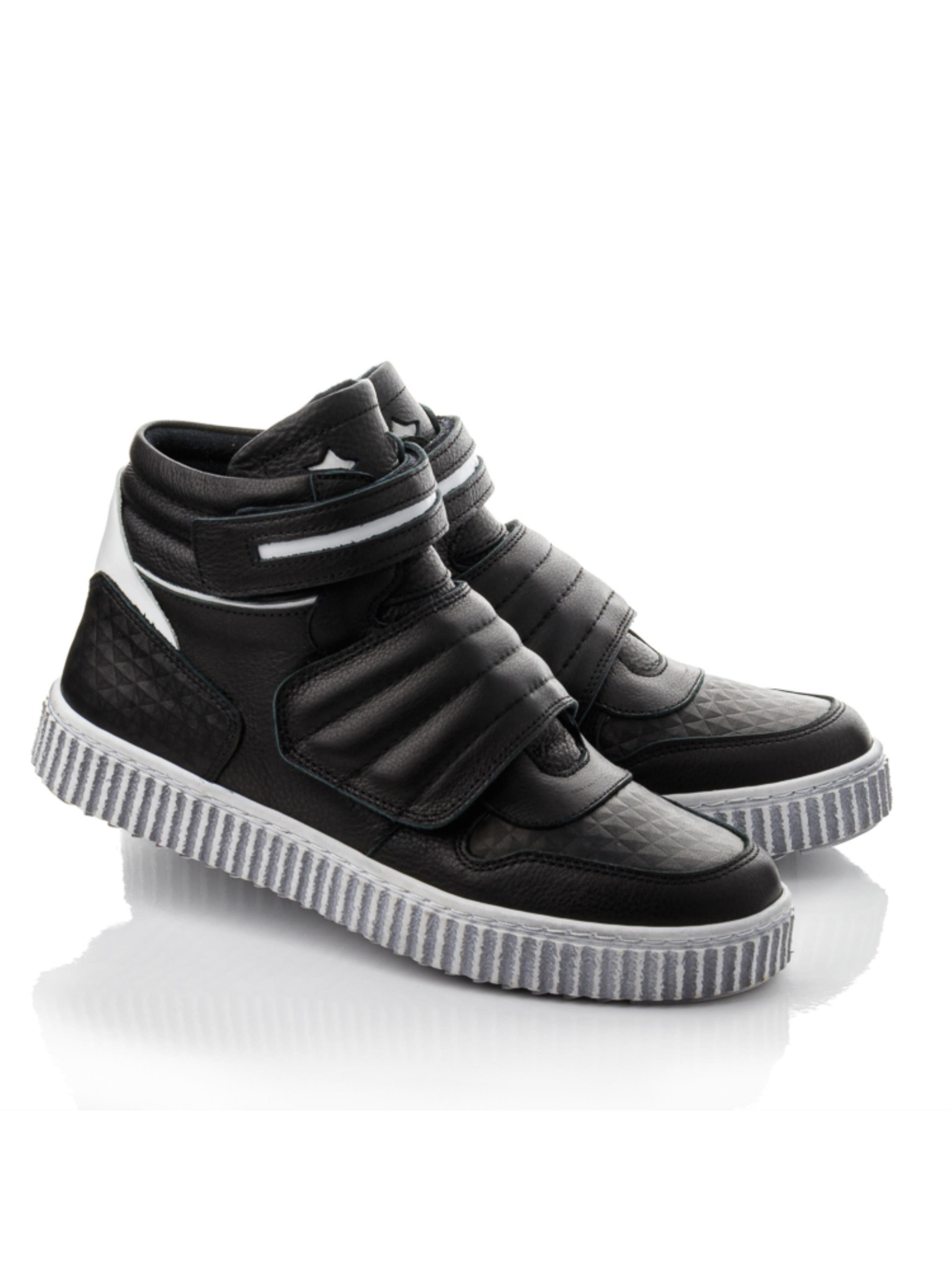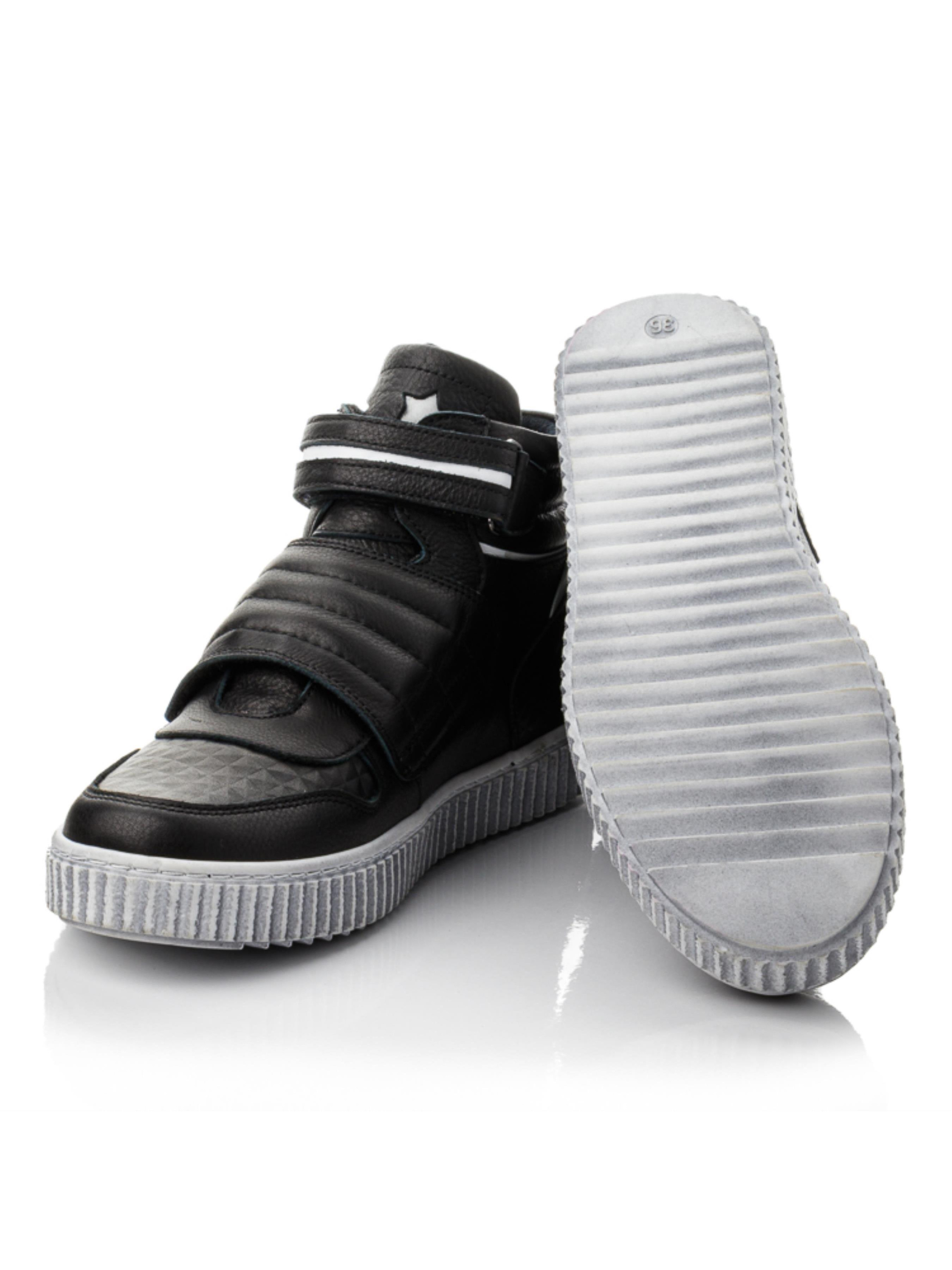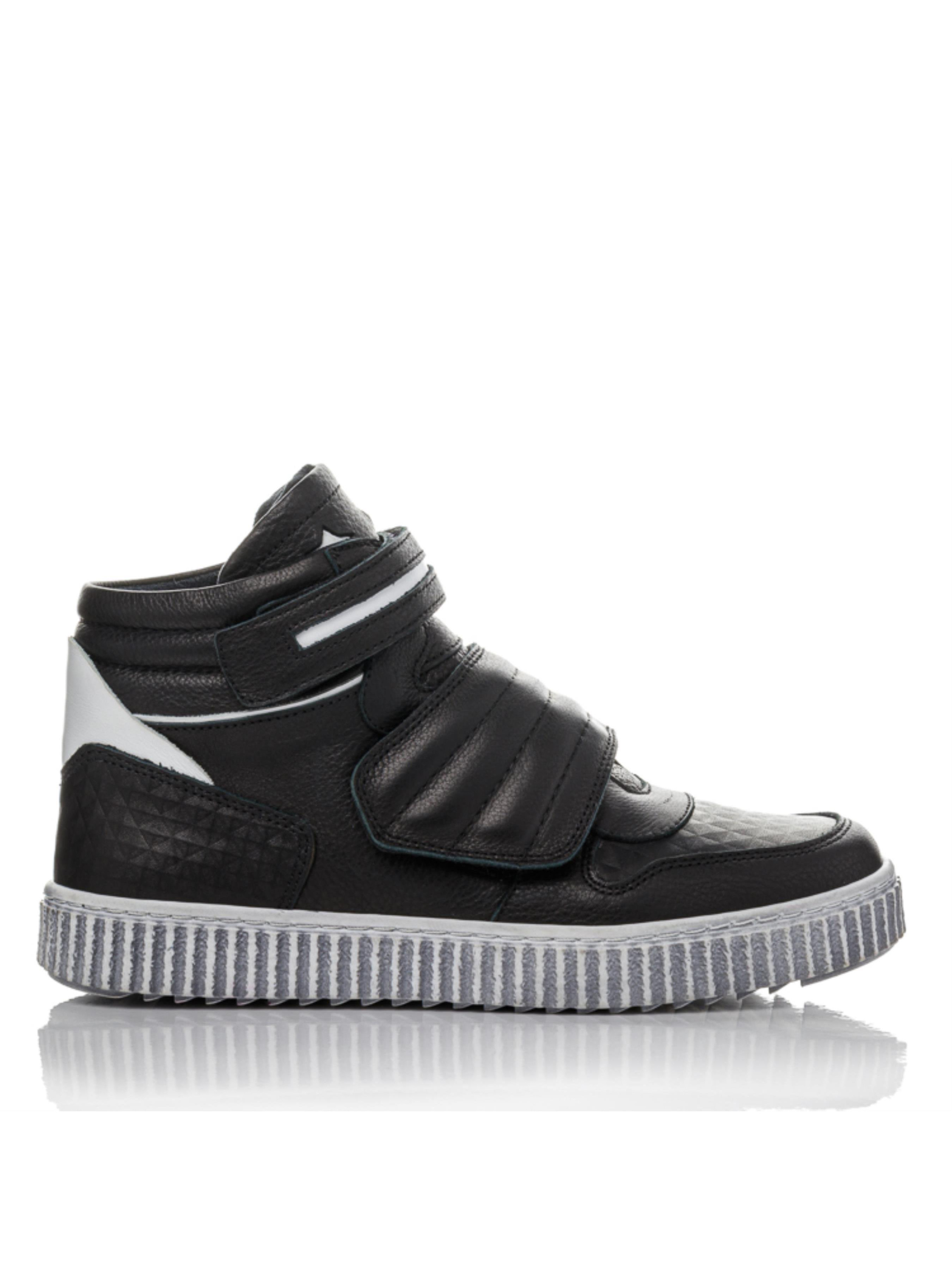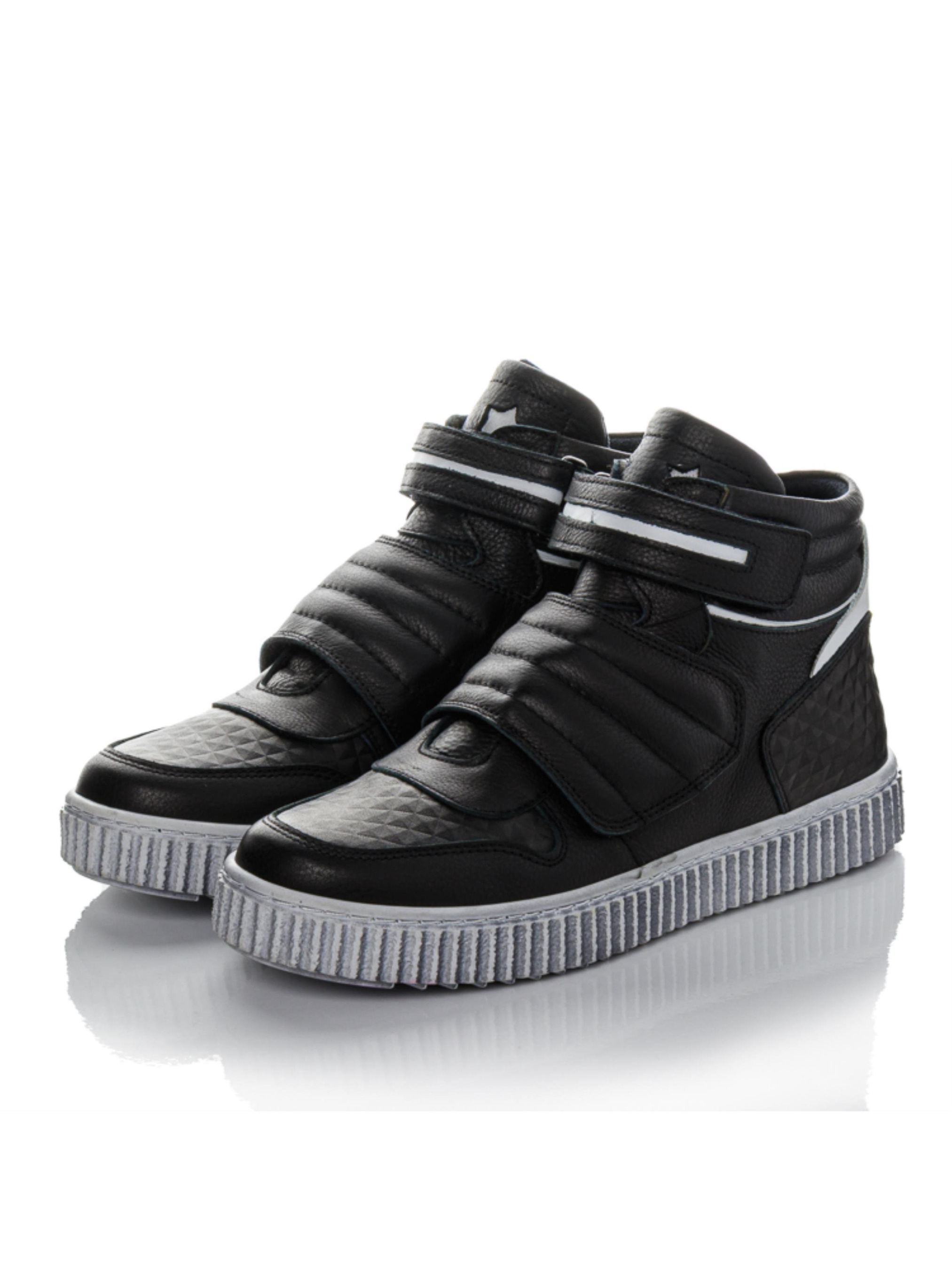 Удобные детские осенние ботинки изготовлены из натуральной чёрной кожи с контрастными вставками из белой кожи. Это тёплая демисезонная обувь для мальчиков, созданная для активных прогулок и ежедневного ношения. Внутри — мягкий флис, сохраняющий тепло даже в прохладную погоду. Анатомическая стелька с супинатором и жёсткий задник обеспечивают правильную поддержку стопы. Удобные две липучки делают обувание лёгким, а серая рельефная подошва гарантирует устойчивость на любой поверхности. Такие детские ботинки из натуральной кожи идеально подойдут для школы и повседневного использования.