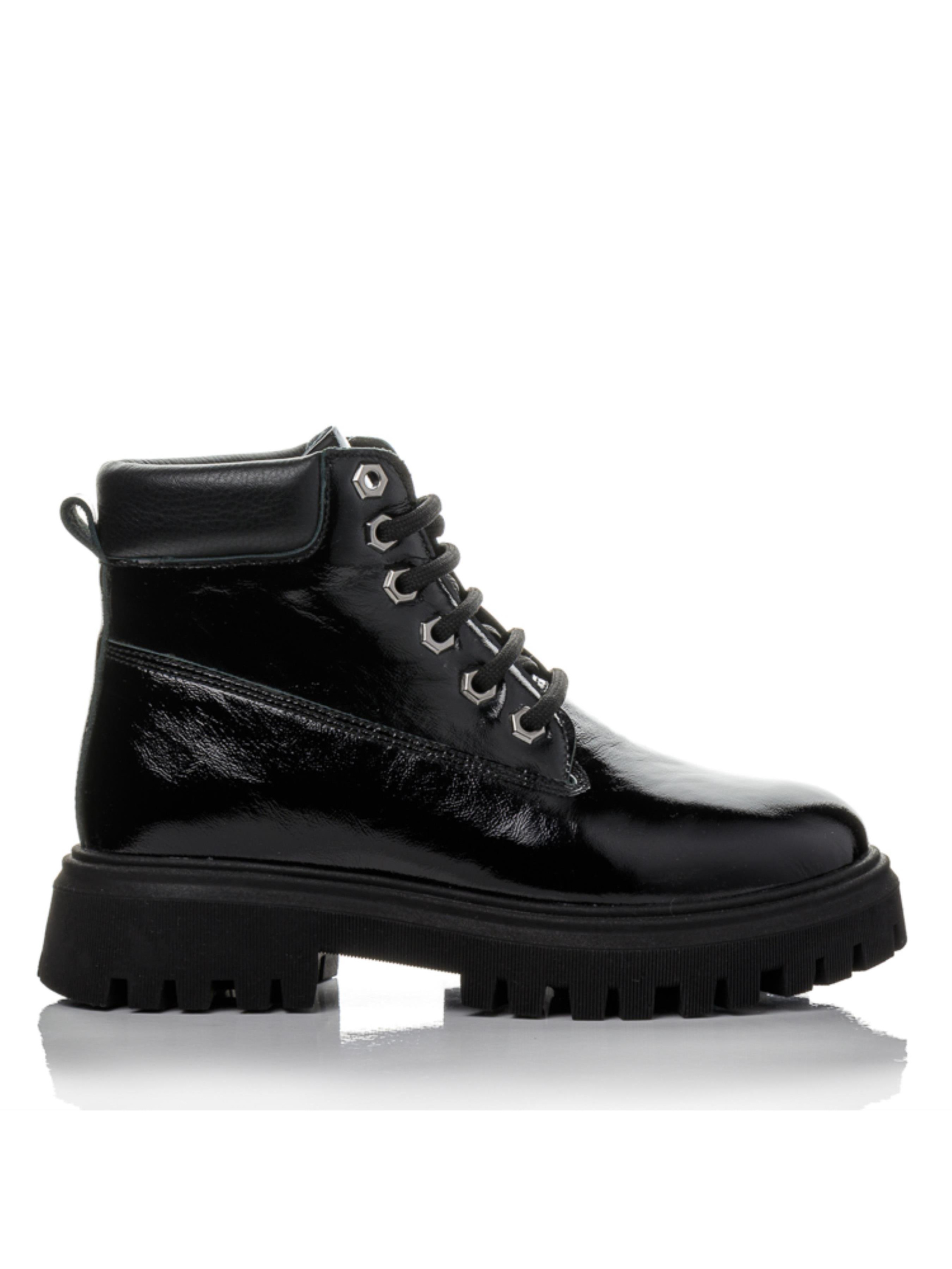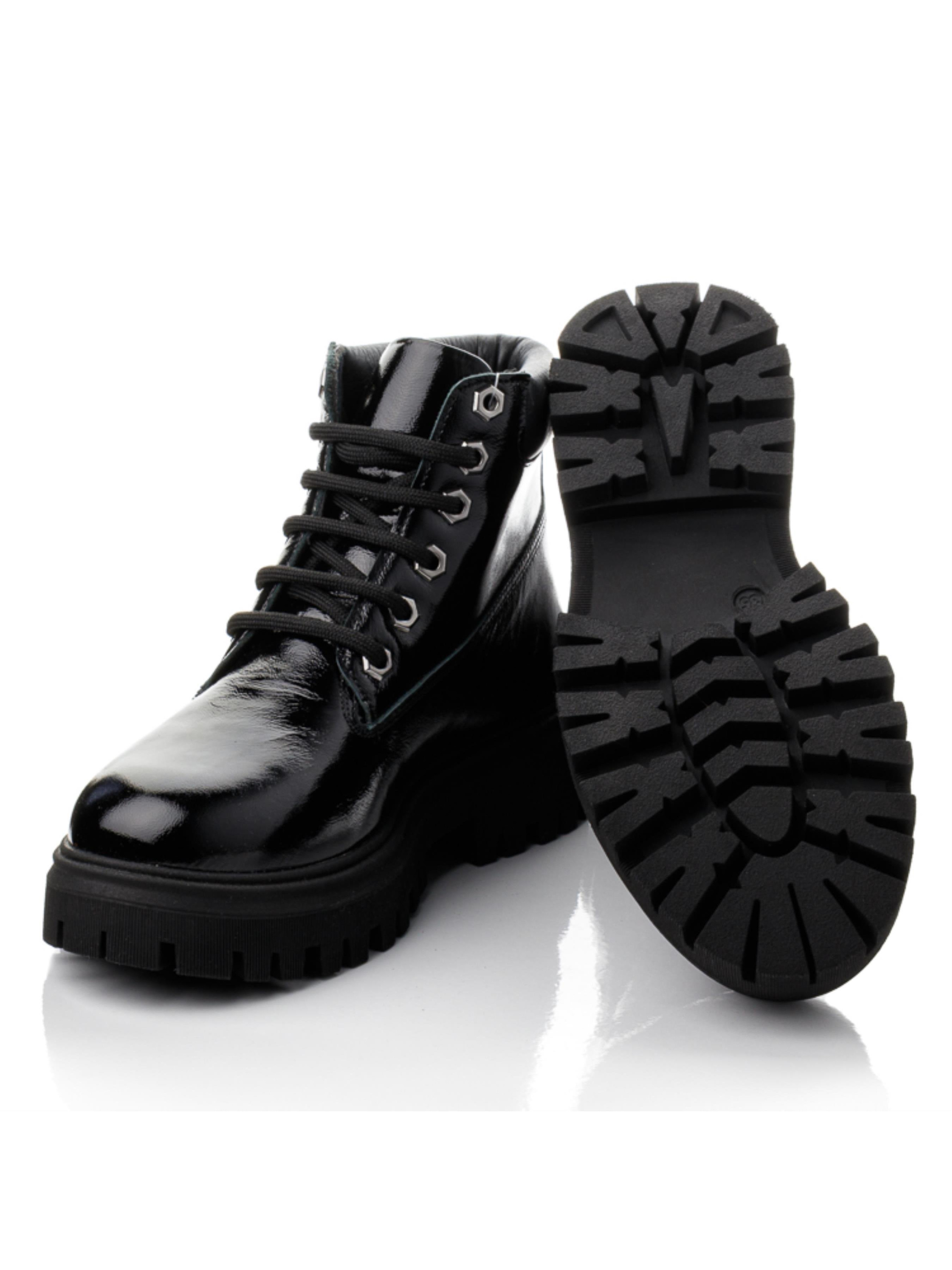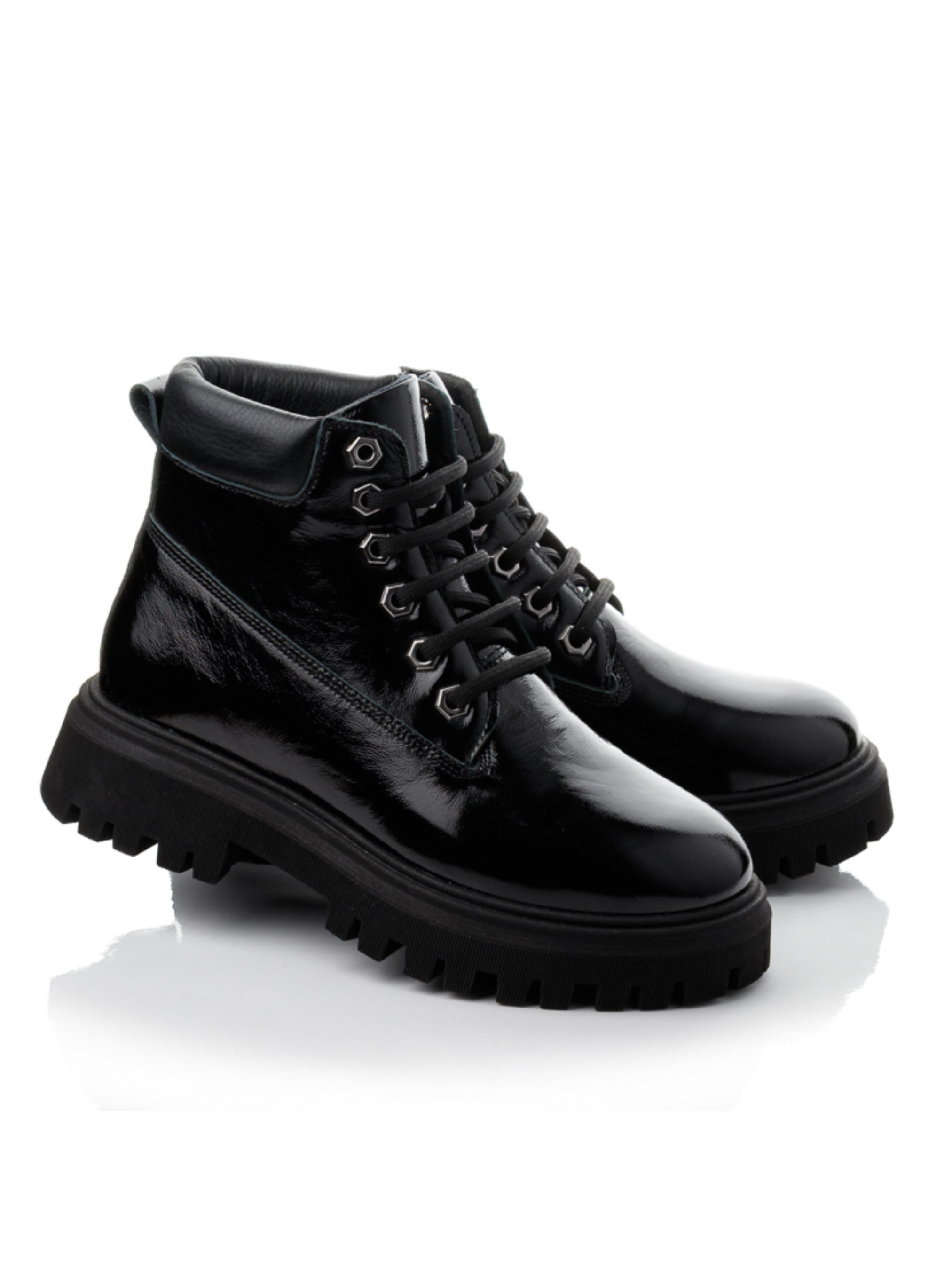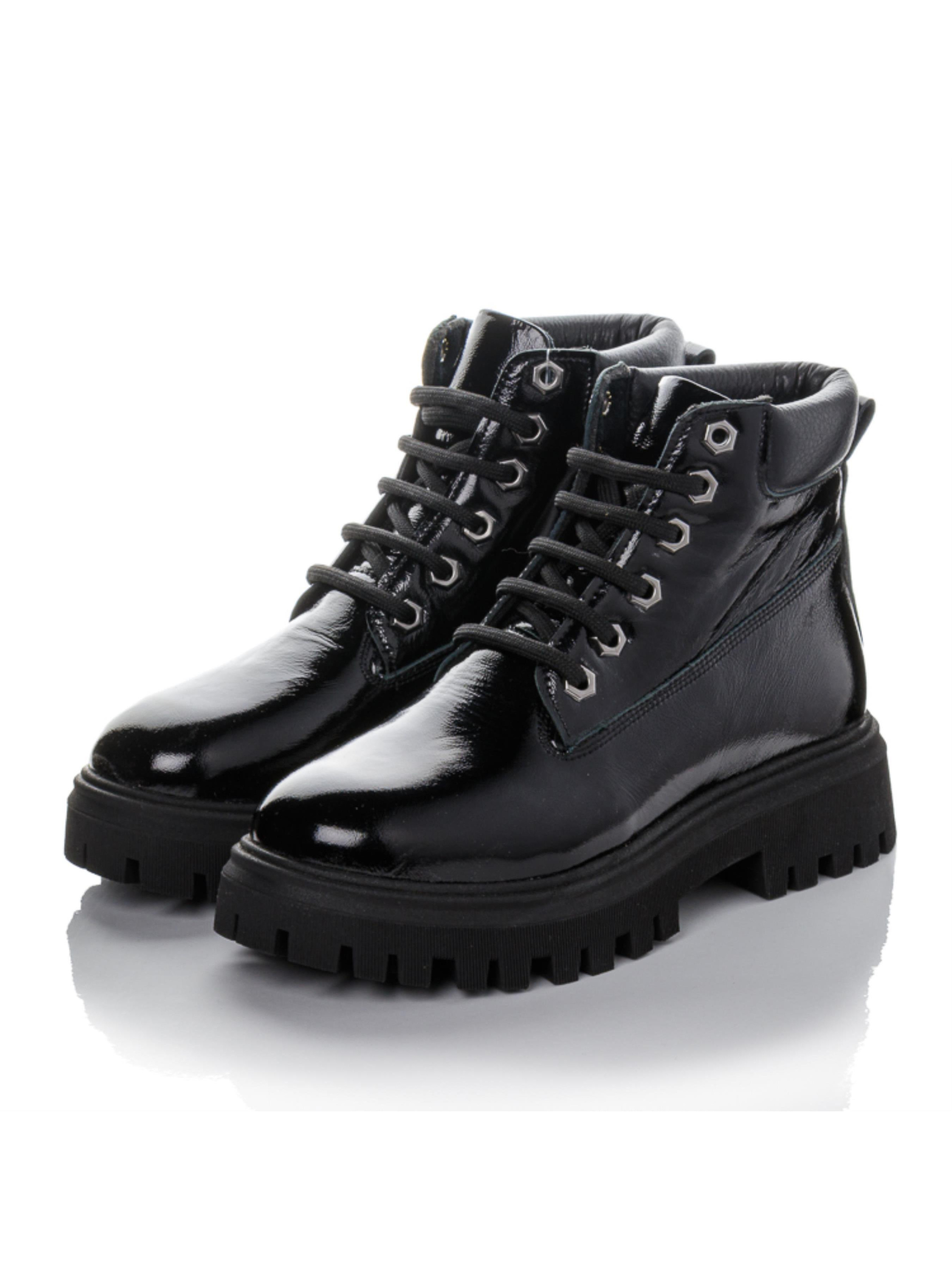 Изисканые подростковые ботинки изготовлены из натуральной лакированной кожи глубокого чёрного цвета. Внутри — тёплый флис, сохраняющий комфорт в прохладный сезон. Анатомическая стелька с супинатором и жёсткий задник обеспечивают правильную поддержку стопы. Удобная шнуровка фиксирует ногу, а модная массивная подошва придаёт современный вид и надёжное сцепление с поверхностью. Это демисезонная обувь из натуральной кожи доступна в размерах 35–40 — отличный выбор для девочек, подростков и их мам, ценящих качество и долговечность.