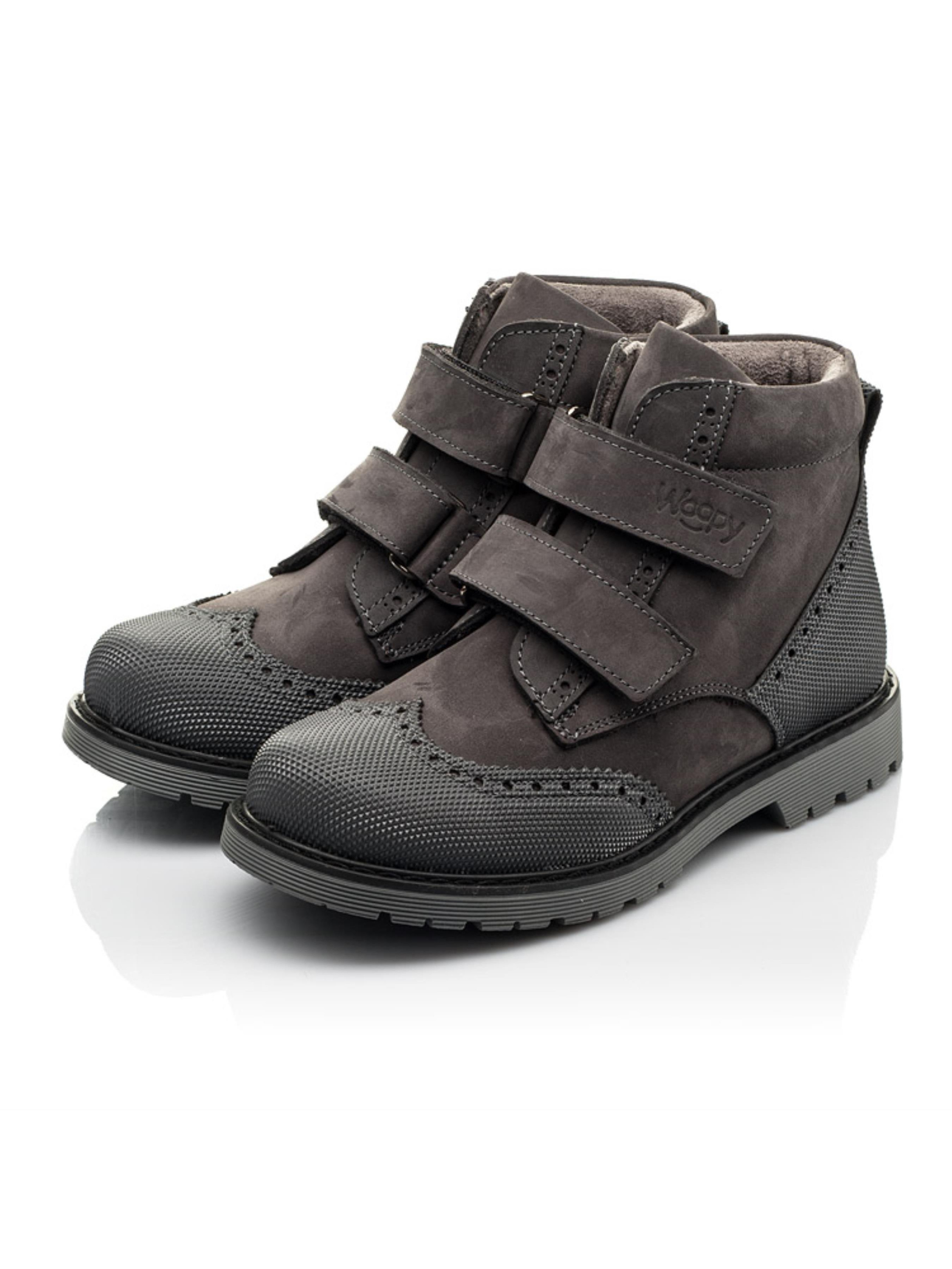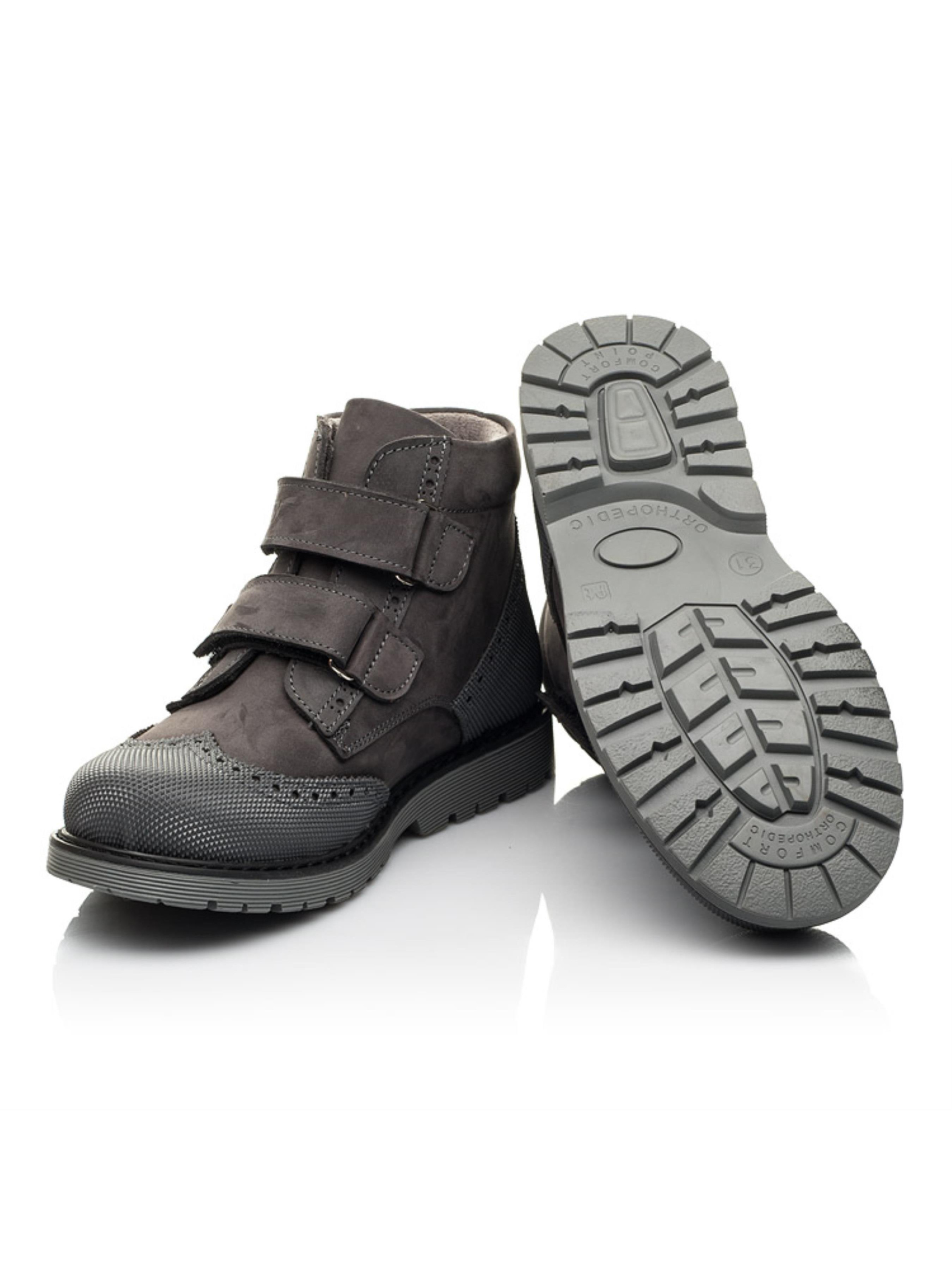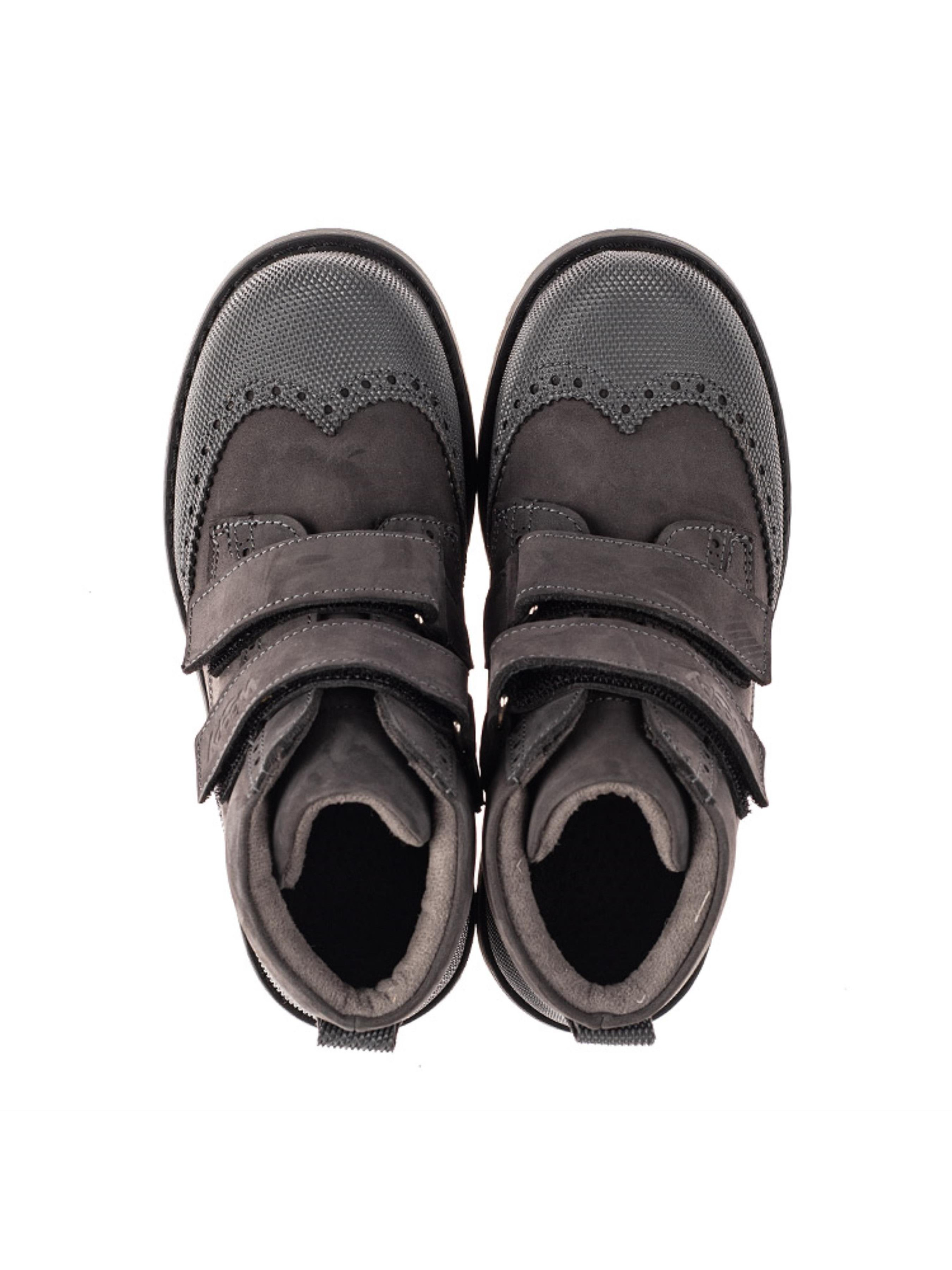 Практичные детские демисезонные ботинки для мальчика. Ботинки изготовлены из натурального нубука темно-серого цвета. Декорирована обувь заметной контрастной строчкой и металлическими элементами. Утеплены ботинки флисовой подкладкой, застегиваются на две надежные липучки. Важной деталью выступает уплотняющая кожаная вставка на носке изделия, которая продлевает срок службы ботиночек. Эта обувь имеет профилактические элементы: твердый задник, супинатор, съемная стелька, широкий носок и скошенный каблук Томаса. Они способствуют правильному положению ножки внутри ботиночка, и препятствуют заваливанию стопы внутрь. Подошва изготовлена из качественной термопластичной резины. Нейтральный дизайн этих детских ботинок позволит носить их и под строгую классическую одежду, и под look в стиле уличной моды.