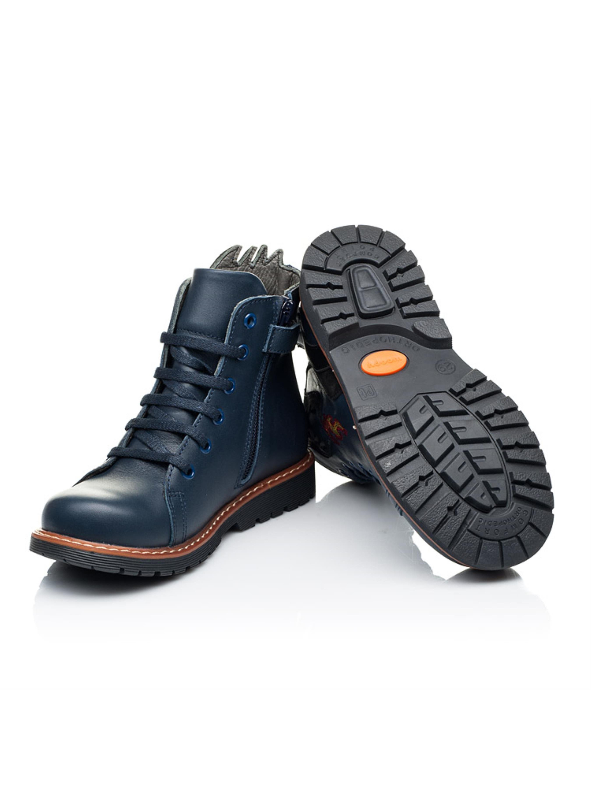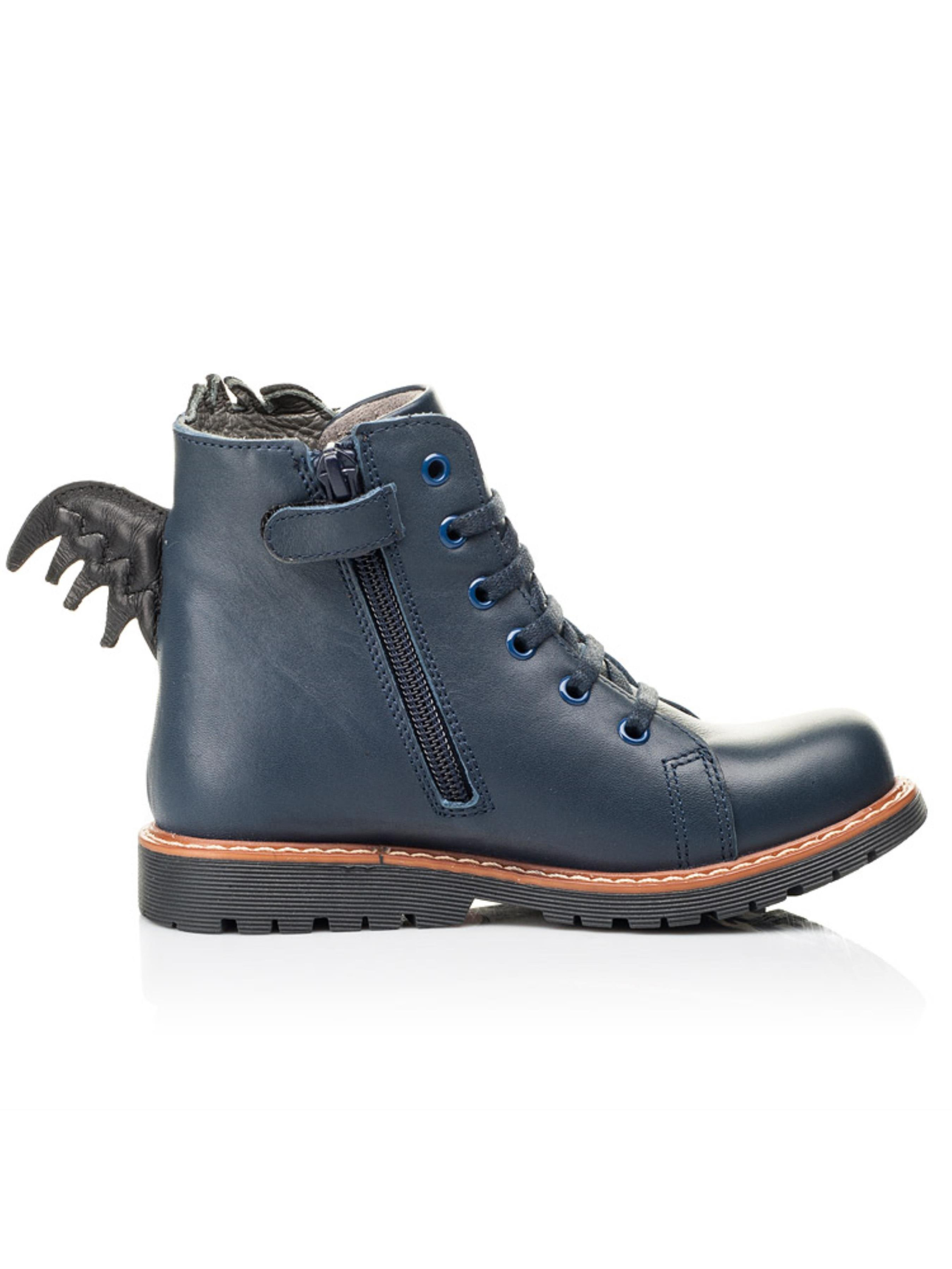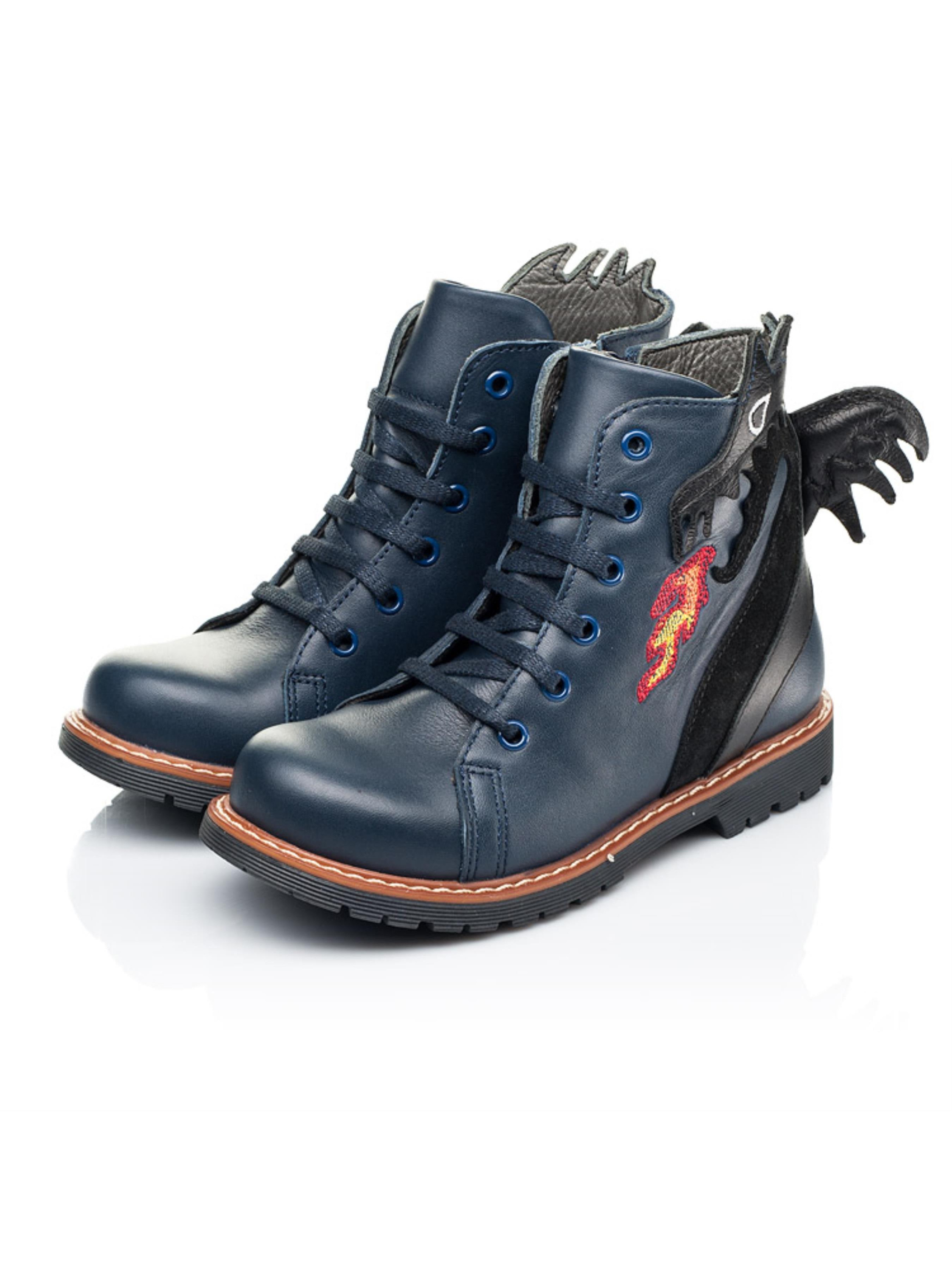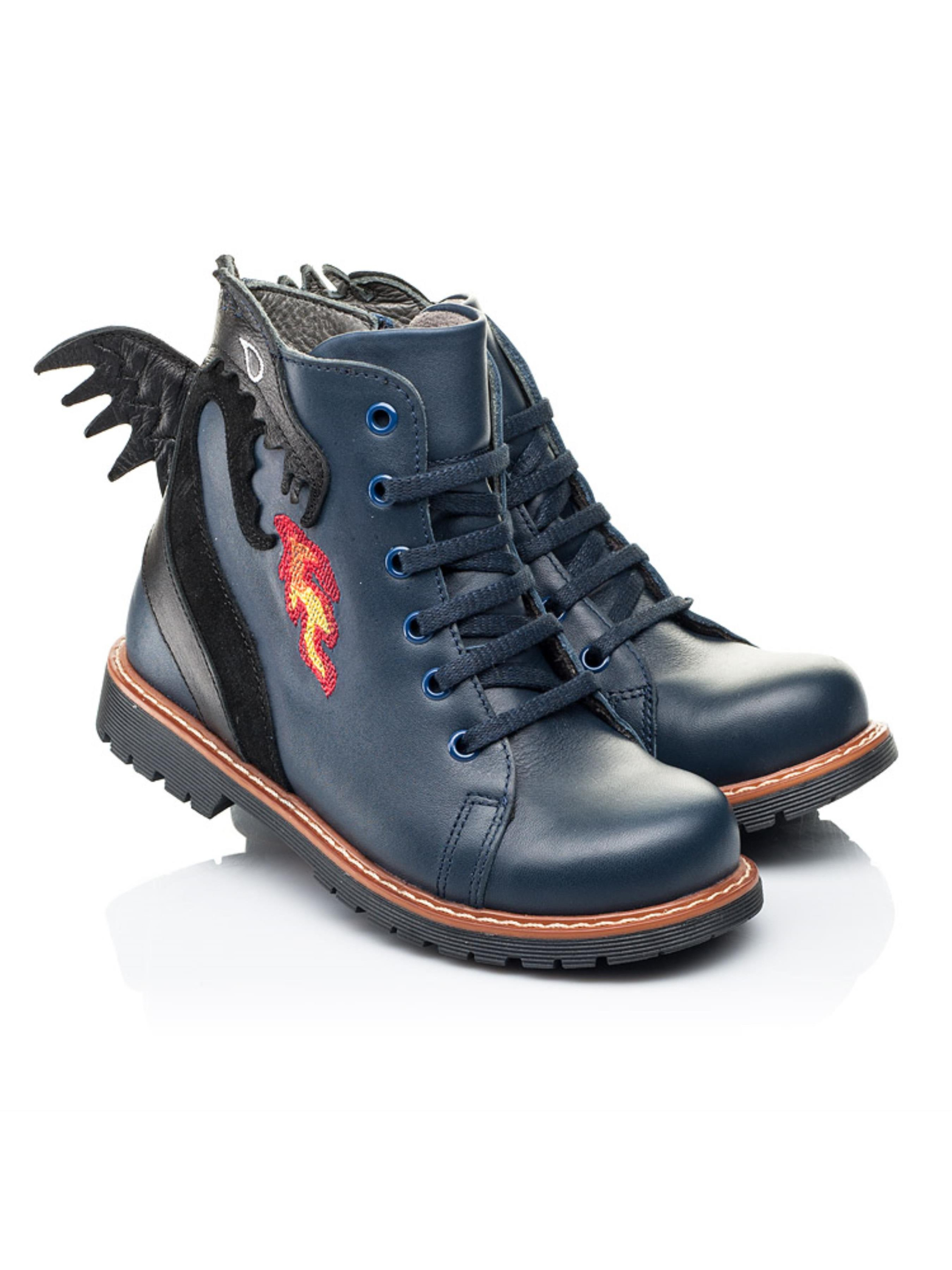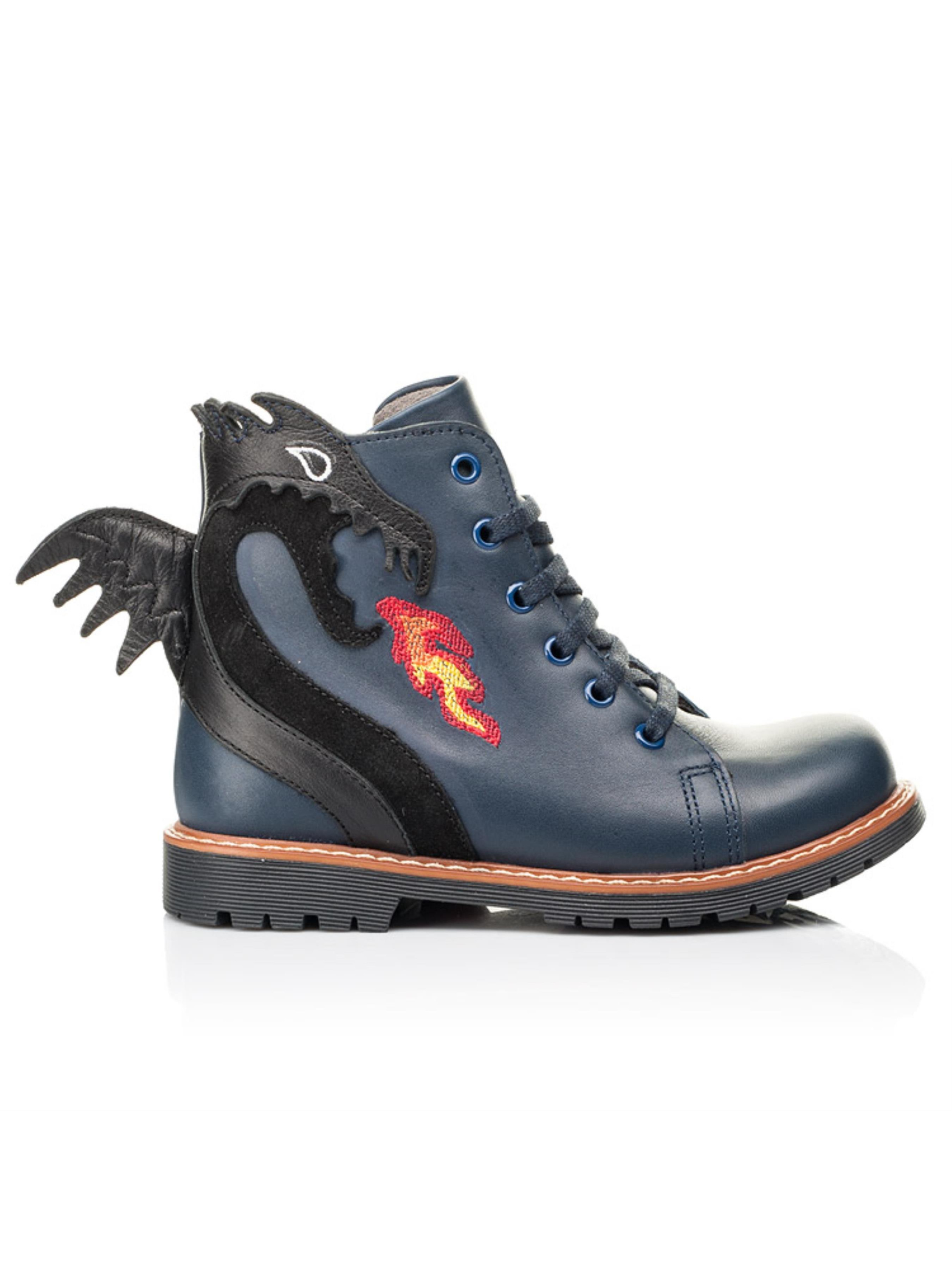 Это не просто модель - это произведение обувного искусства. Вы тоже оценили такую удивительную пару ботинок? Детские демисезонные ботинки созданные для смелых и креативных мальчиков, которые хотят быть в центре внимания. Мы гарантируем, что с такой парой в обувном гардеробе Ваш маленький модник не останется без внимания среди сверстников. Детские демисезонные ботинки для мальчика пошиты из натуральной кожи синего цвета. Кроме чрезвычайного дизайна демисезонные ботинки бренда Woopy поражают качеством пошива. Ботинки создано с учетом всех важных ортопедических элементов детской обуви: каблук Томаса, жесткий задник, супинатор и анатомическая стелька. В качестве застежки используется боковая молния, которая дополнена шнуровкой для лучшей фиксации ножки и урегулирования полноты. Главным акцентом и изюминкой пары выступает изображение дракона (выполнено из натуральной замши), который дышит пламенем. Особенно эффектно выглядит милый хвостик дракона на пятке.