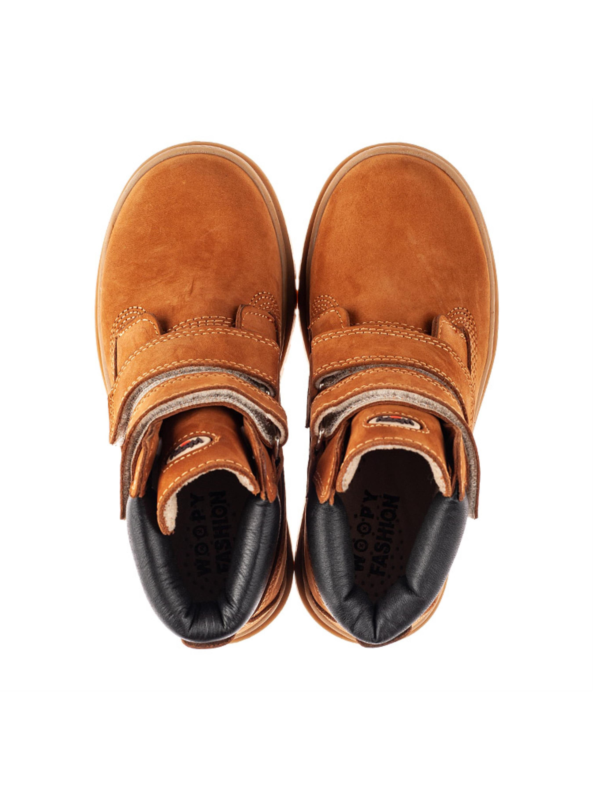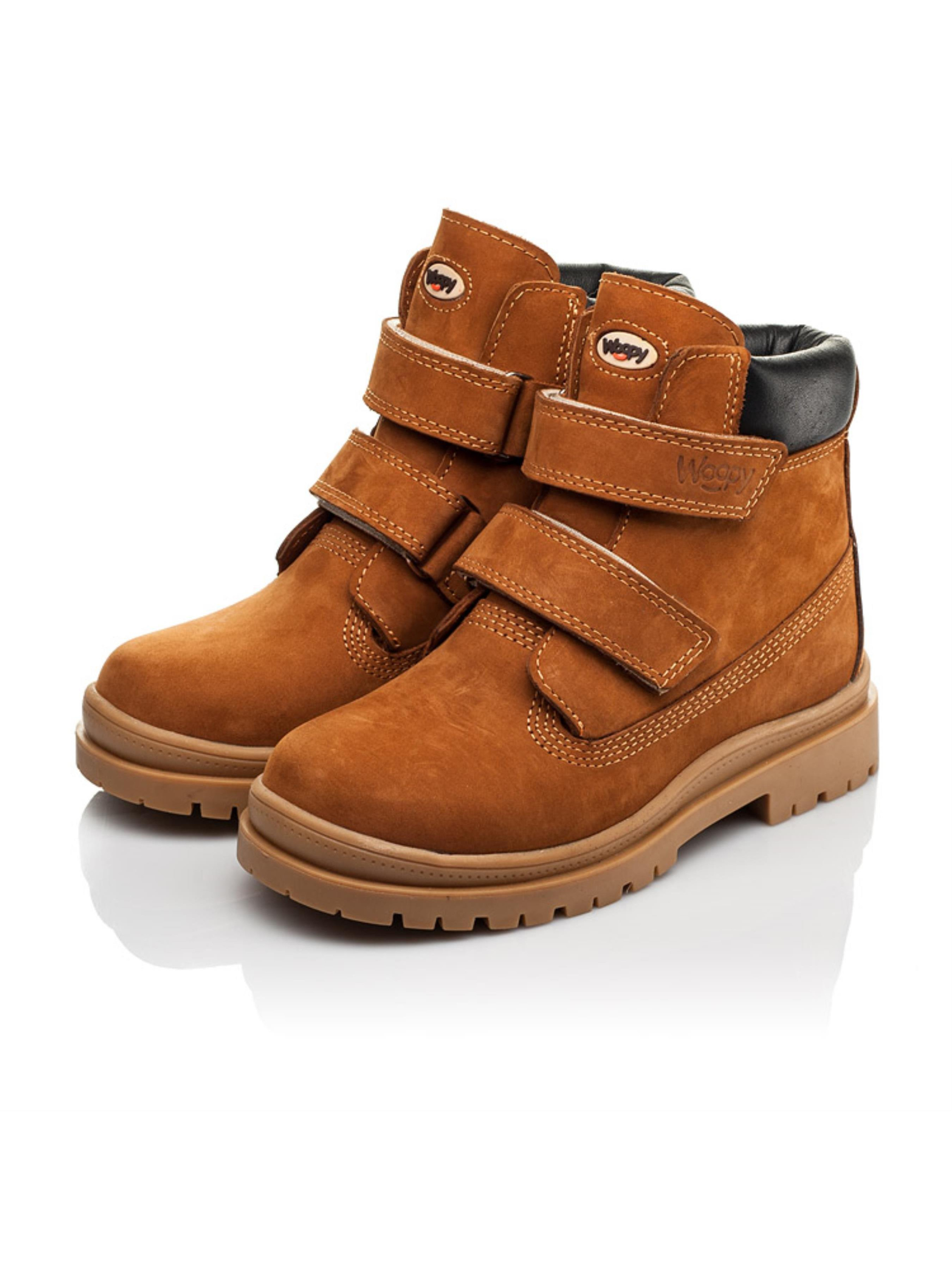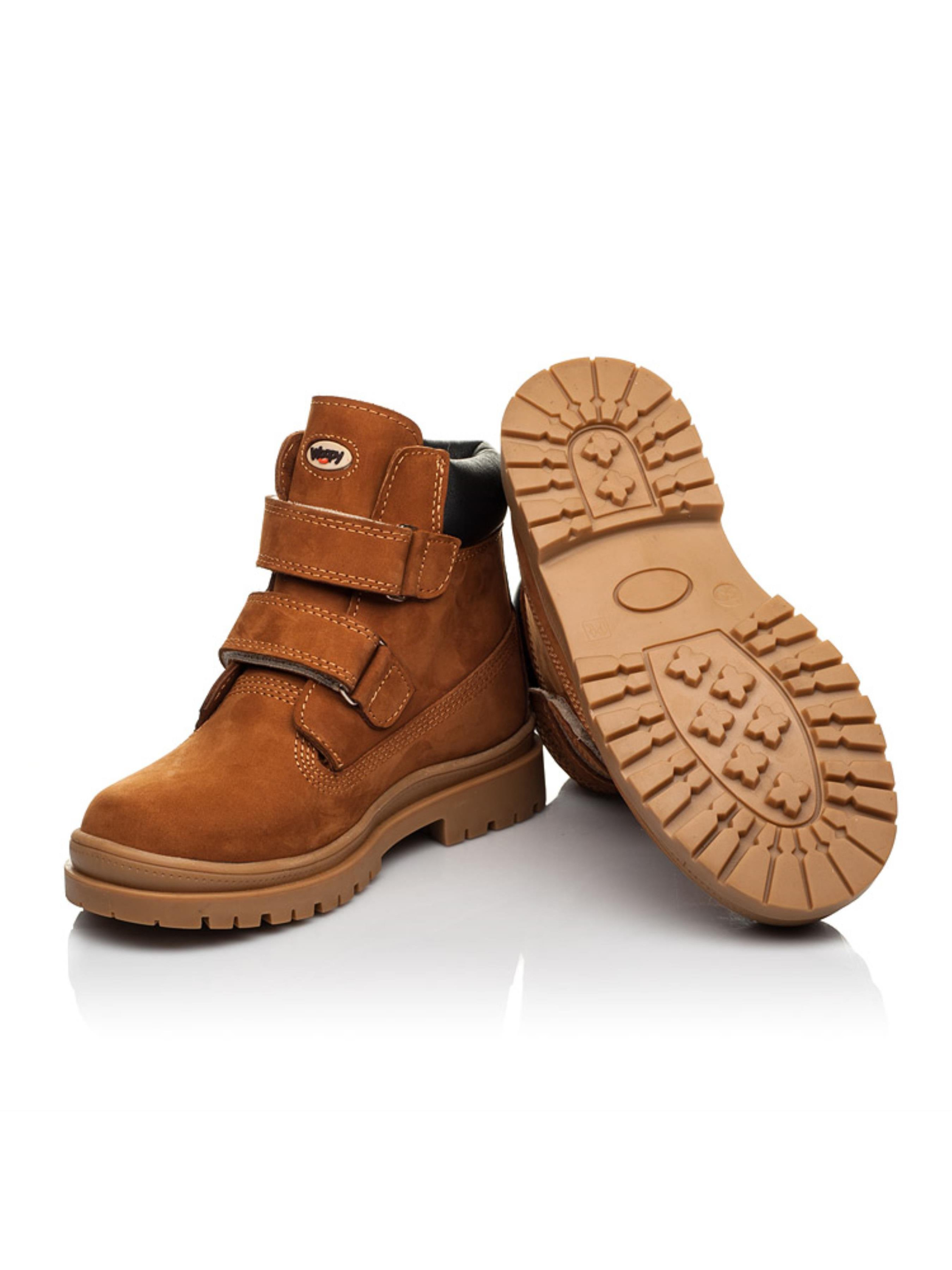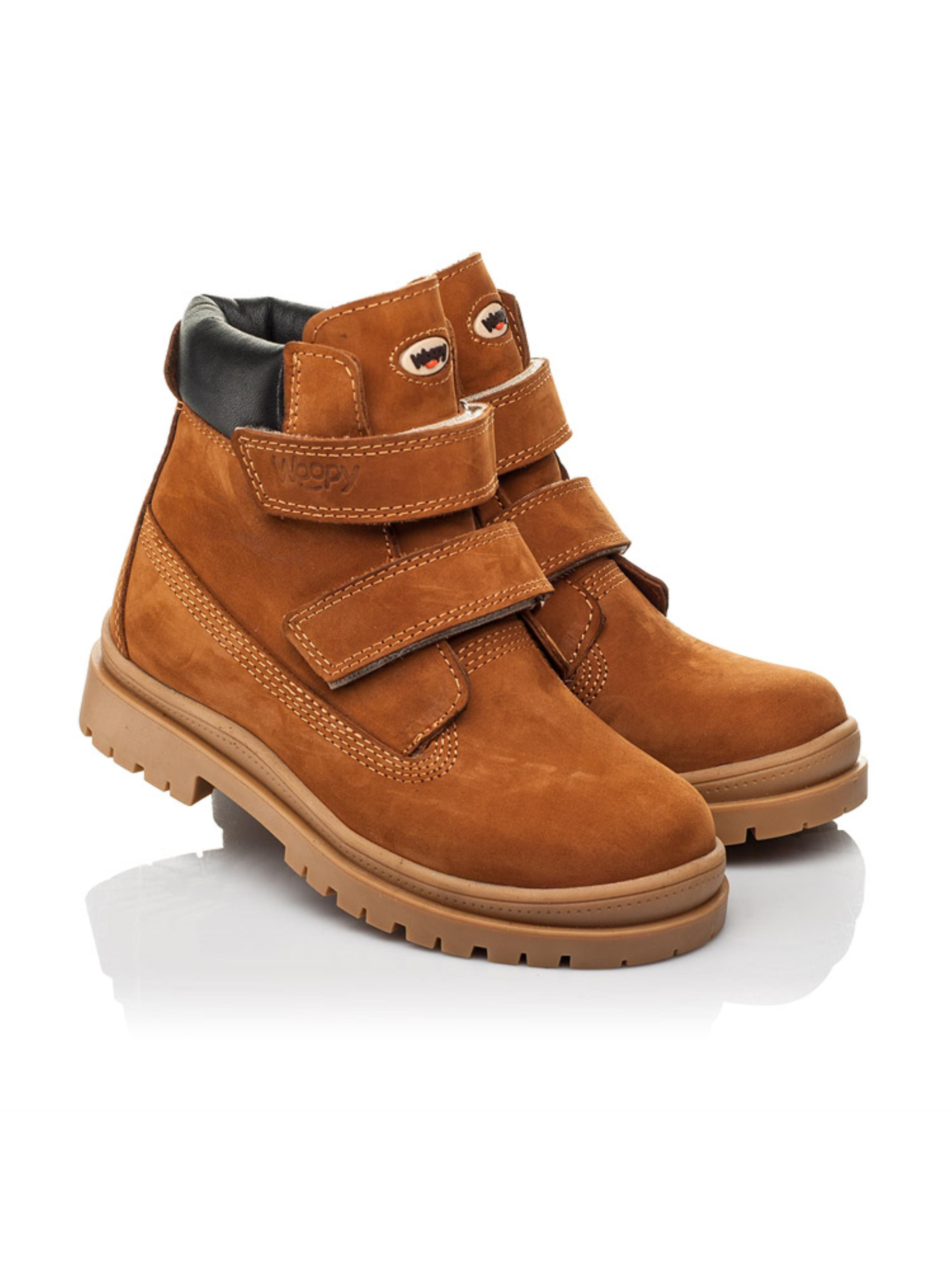 Модель демисезонной обуви в таком исполнении долгое время на волне популярности. Детские демисезонные ботинки для мальчика пошиты из натурального нубука рыжего цвета. Демисезонные ботинки увлекают минималистичным дизайном и изысканным цветом. Внутри подростковые ботинки утеплены флисом, стелька кожаная. Подошва в ботинках легкая, гибкая, отлитая из качественной термопластичной резины. В качестве застежки используются две надежные липучки. Комфорт детским стопам обеспечат такие ортопедические элементы, как жесткий задник, супинатор и анатомически правильная стелька. Контрастно на фоне рыжего нубука смотрится вставка из натуральной кожи черного цвета. Язычок обуви и верхняя липучка-застежка украшены фирменным логотипом производителя "Woopy".