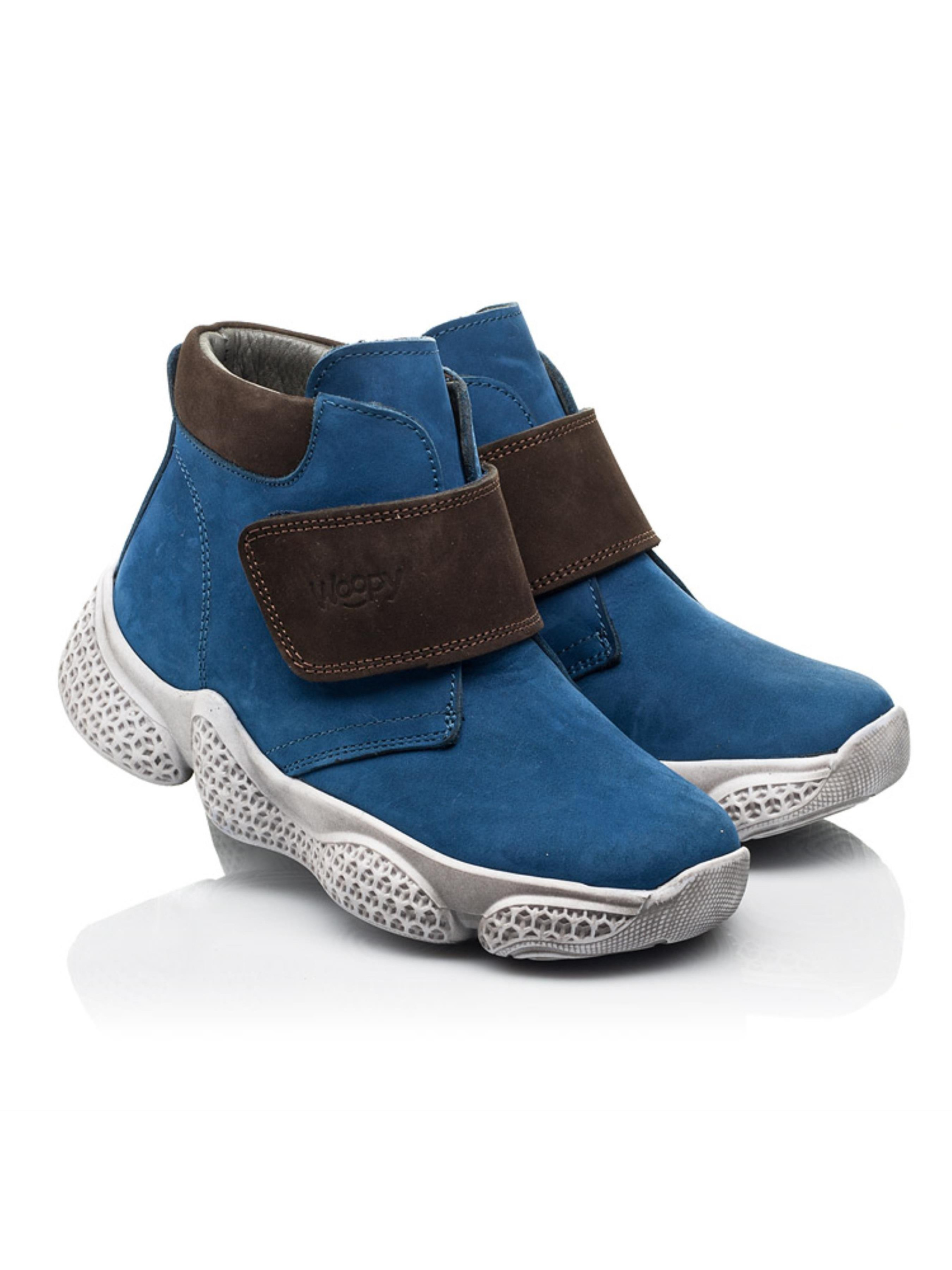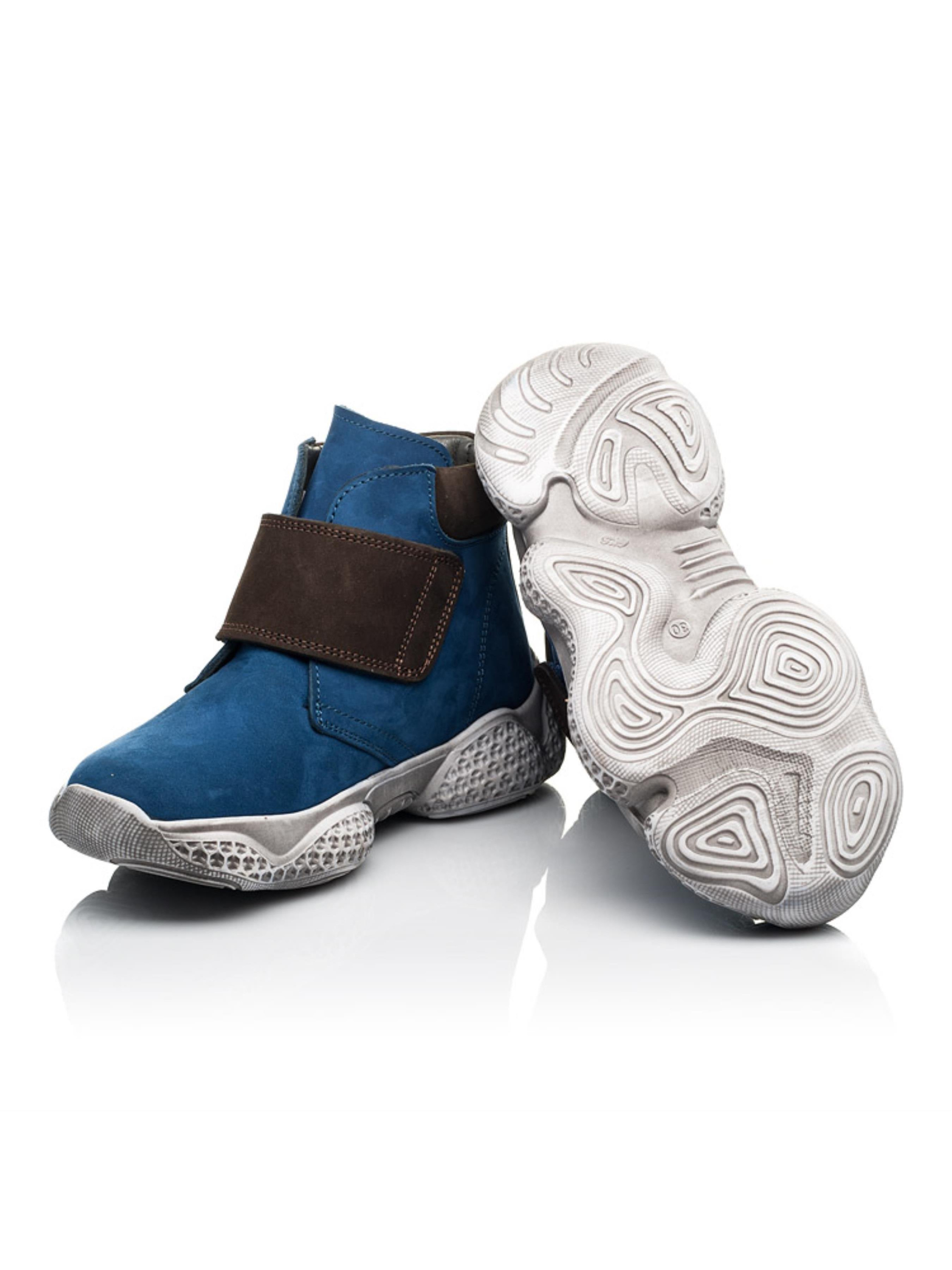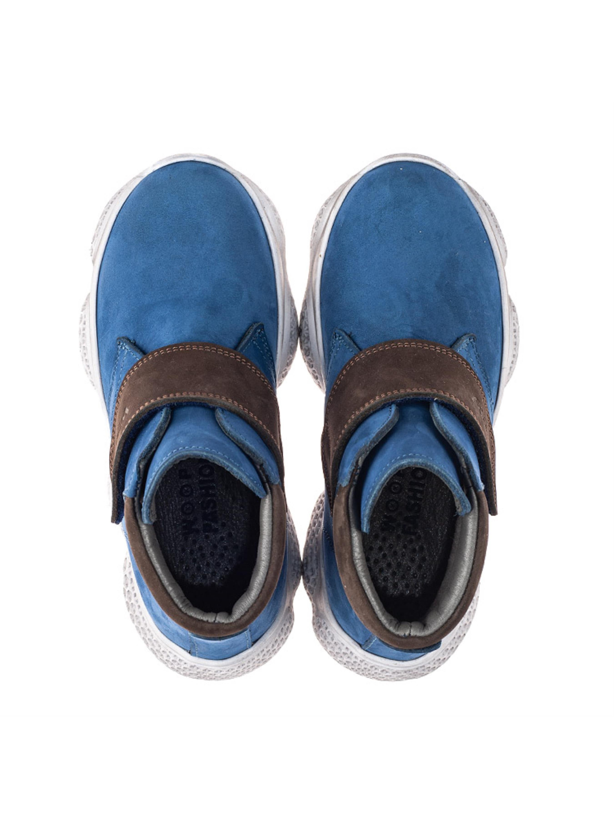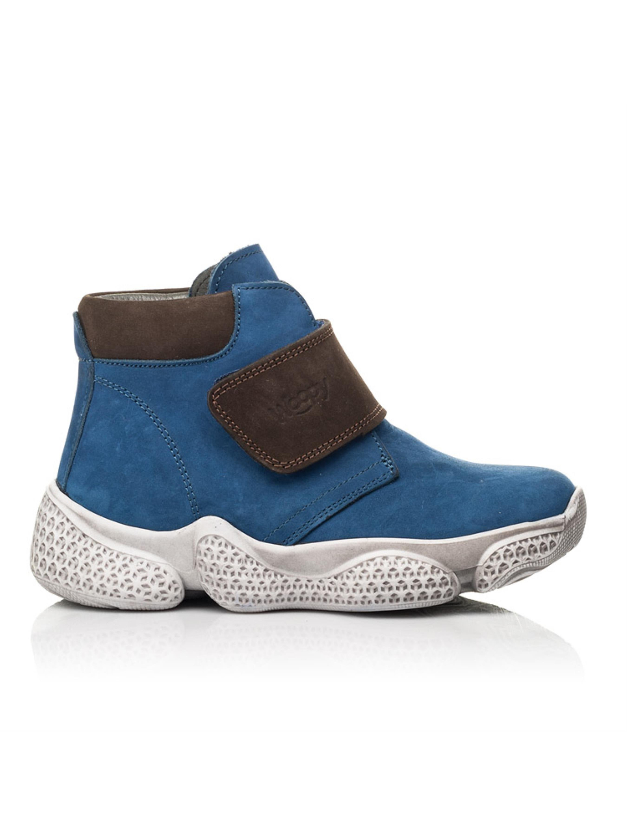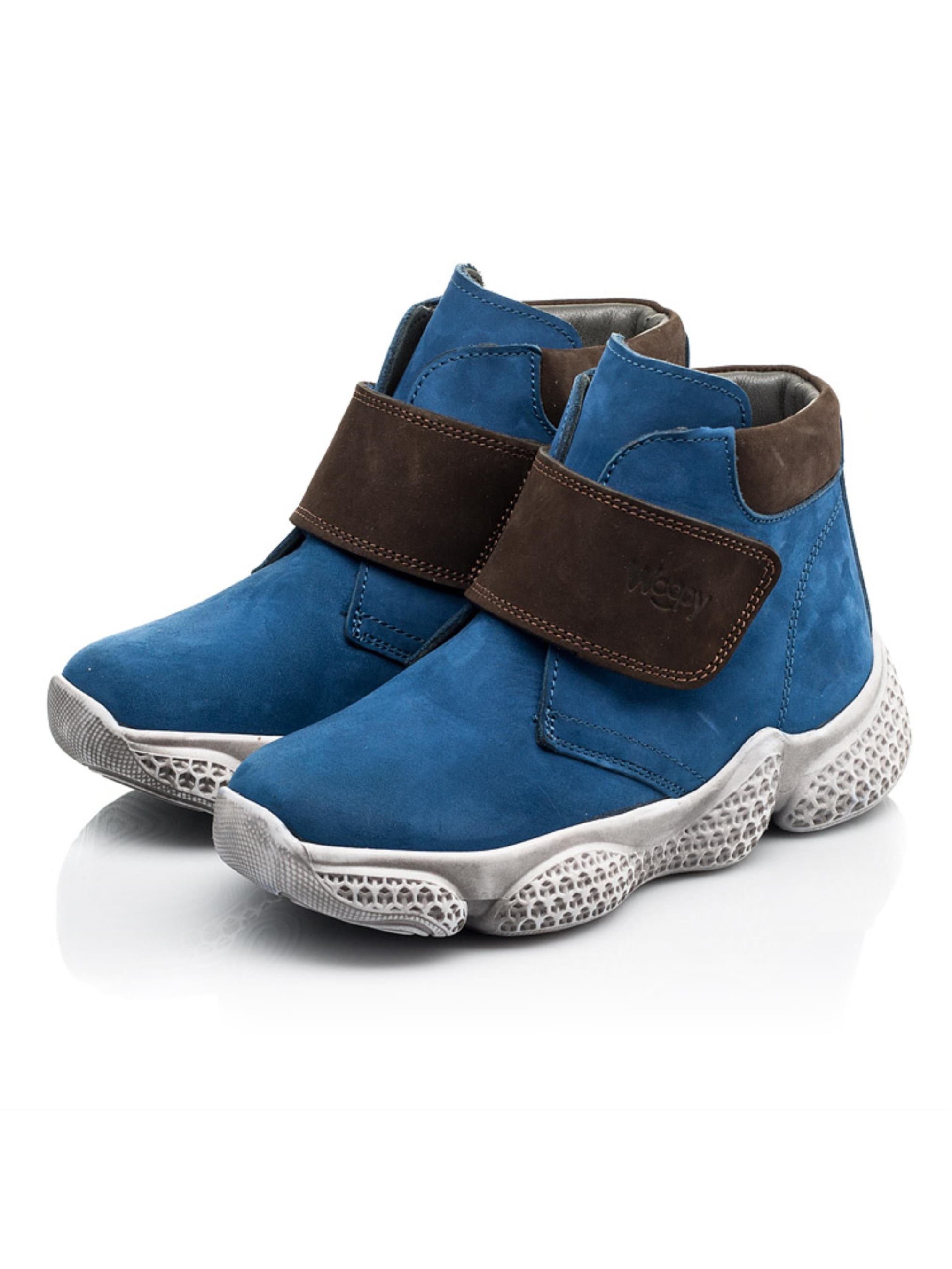 Фактурные детские демисезонные ботинки для мальчика от бренда Woopy пошиты из натурального нубука синего цвета. Материал подкладки - флис, стелька кожаная. Контрастно на фоне синего цвета выглядит вставка на пяточной зоне и застежка-липучка коричневого цвета, которые пошиты из натурального нубука. 100% изюминкой пары выступает спортивная рельефная подошва, которая отлита из качественной термопластичной резины. Демисезонные ботинки для мальчика созданные с учетом важных ортопедических элементов детской обуви. Жесткий задник, супинатор и анатомически правильная стелька обеспечат правильное положение ножки в обуви.