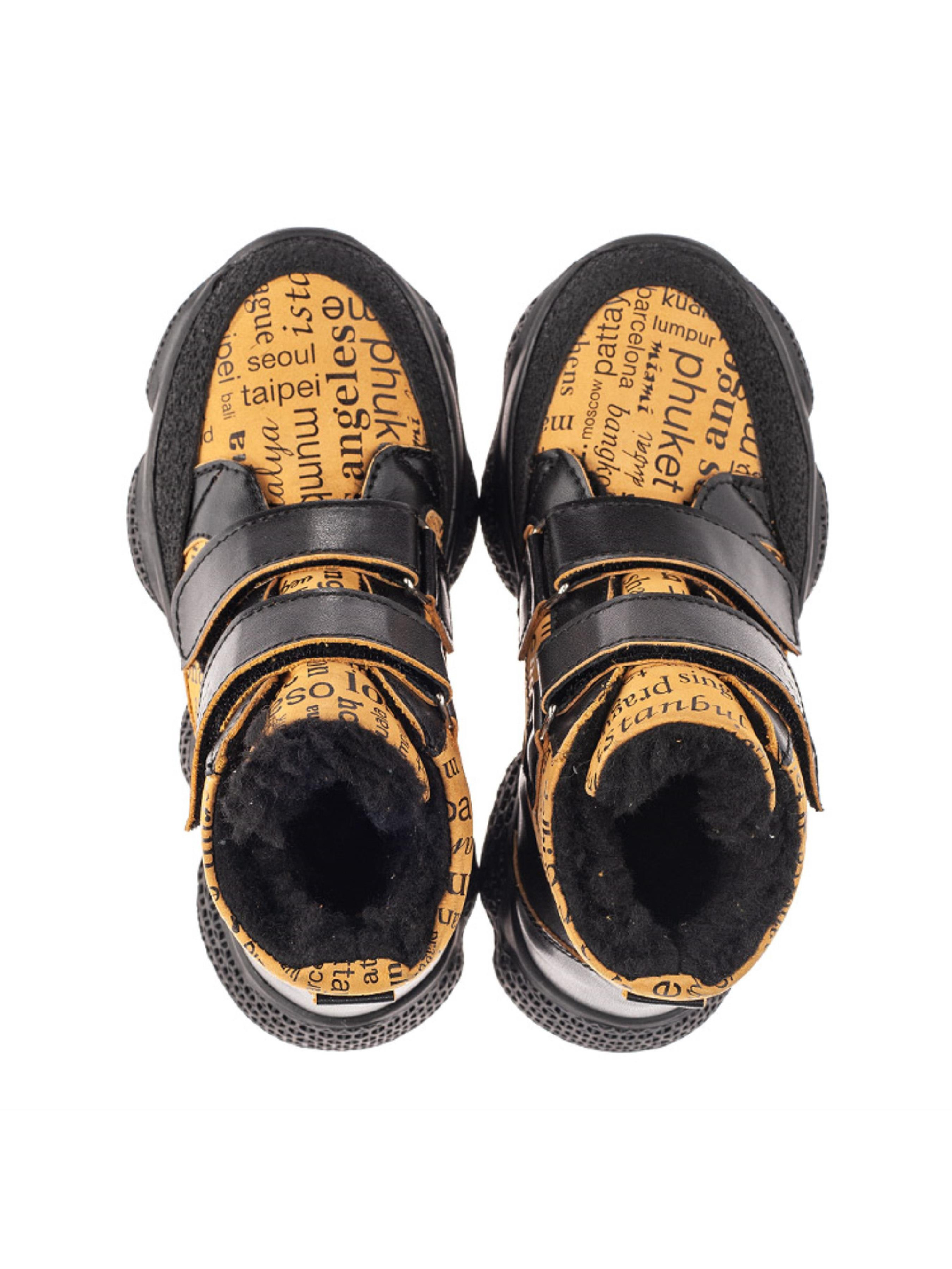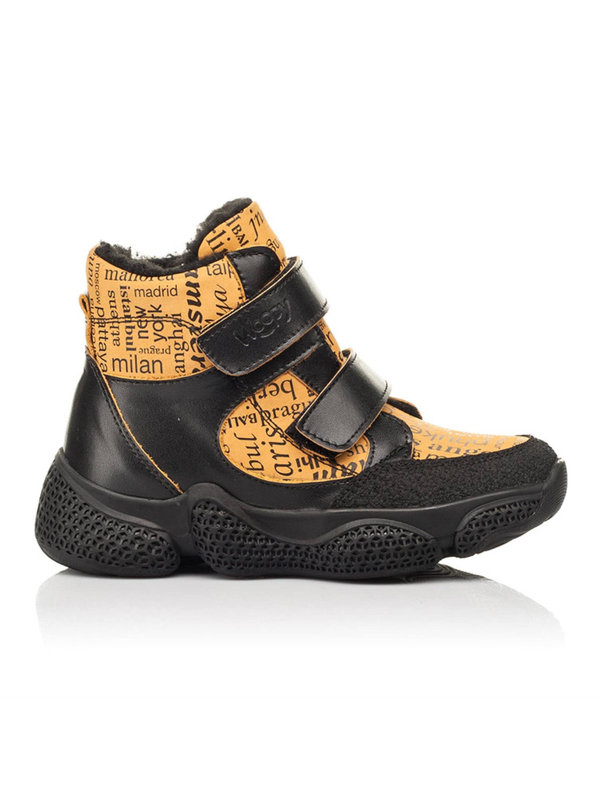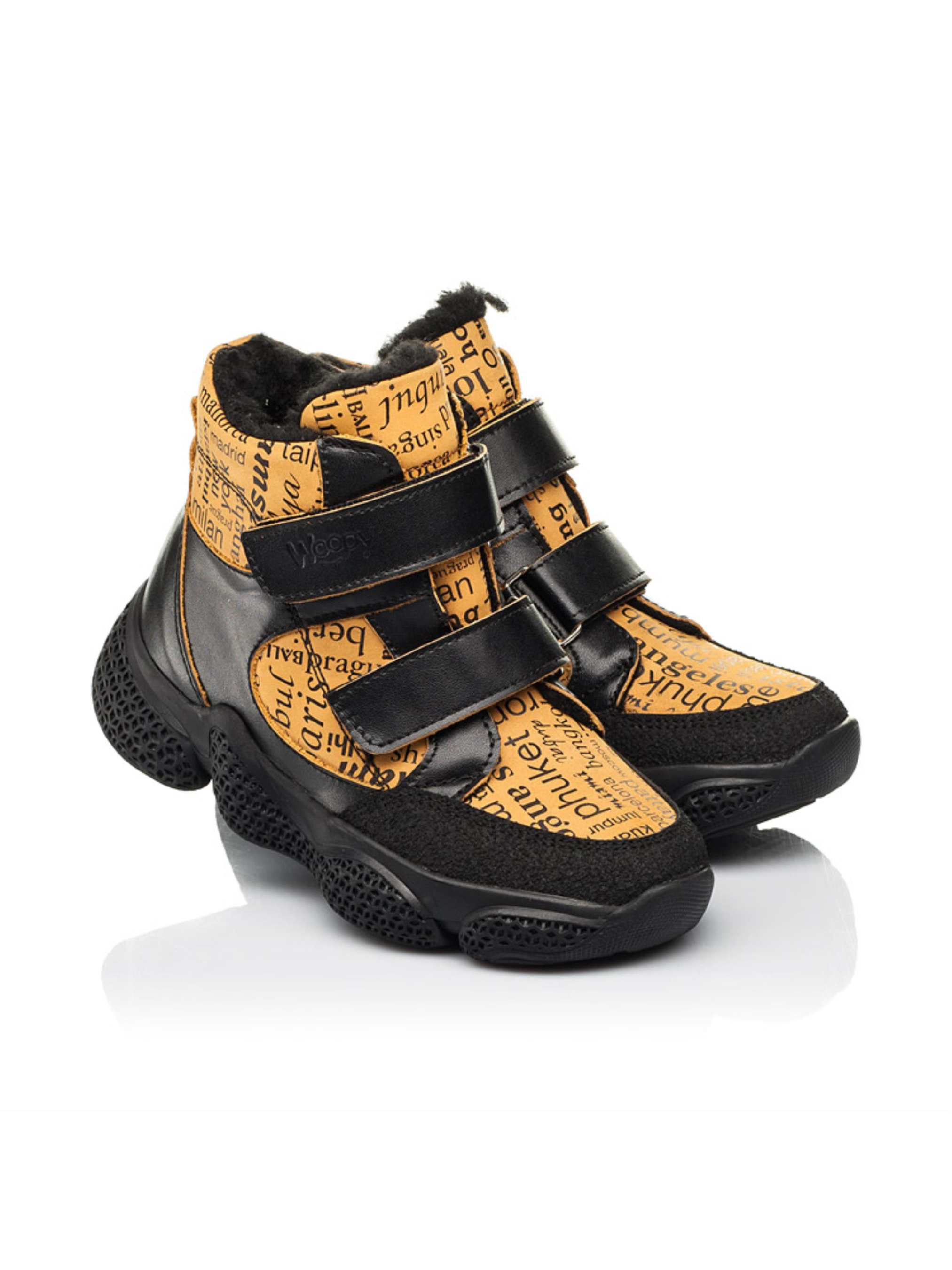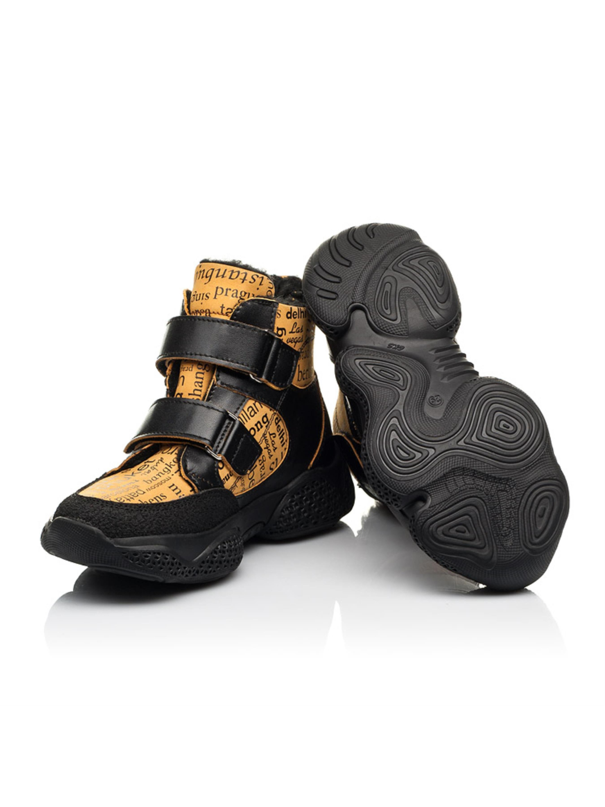 Рады представить Вам современную и мега комфортную зимнюю пару ботинок для активного модника. Контрастная модель пошита из натуральной кожи черного цвета и дополнена вставкой из натурального нубука рыжего цвета с современным газетным принтом. Детские зимние ботинки для мальчика утепленные натуральной шерстью. Такая модель пошита в спортивном стиле, она очень комфортная, легкая и теплая. Максимальный комфорт детским ножкам обеспечат такие ортопедические составляющие детской обуви: жесткий задник, супинатор и анатомически правильная стелька. Значительно облегчат и ускорят процесс обувания две надежные застежки-липучки. Наиболее уязвимую часть защищено вставкой из современного искусственного материала "неубивайкой". Неоспоримым украшением модели выступает трендовая рифленая подошва.