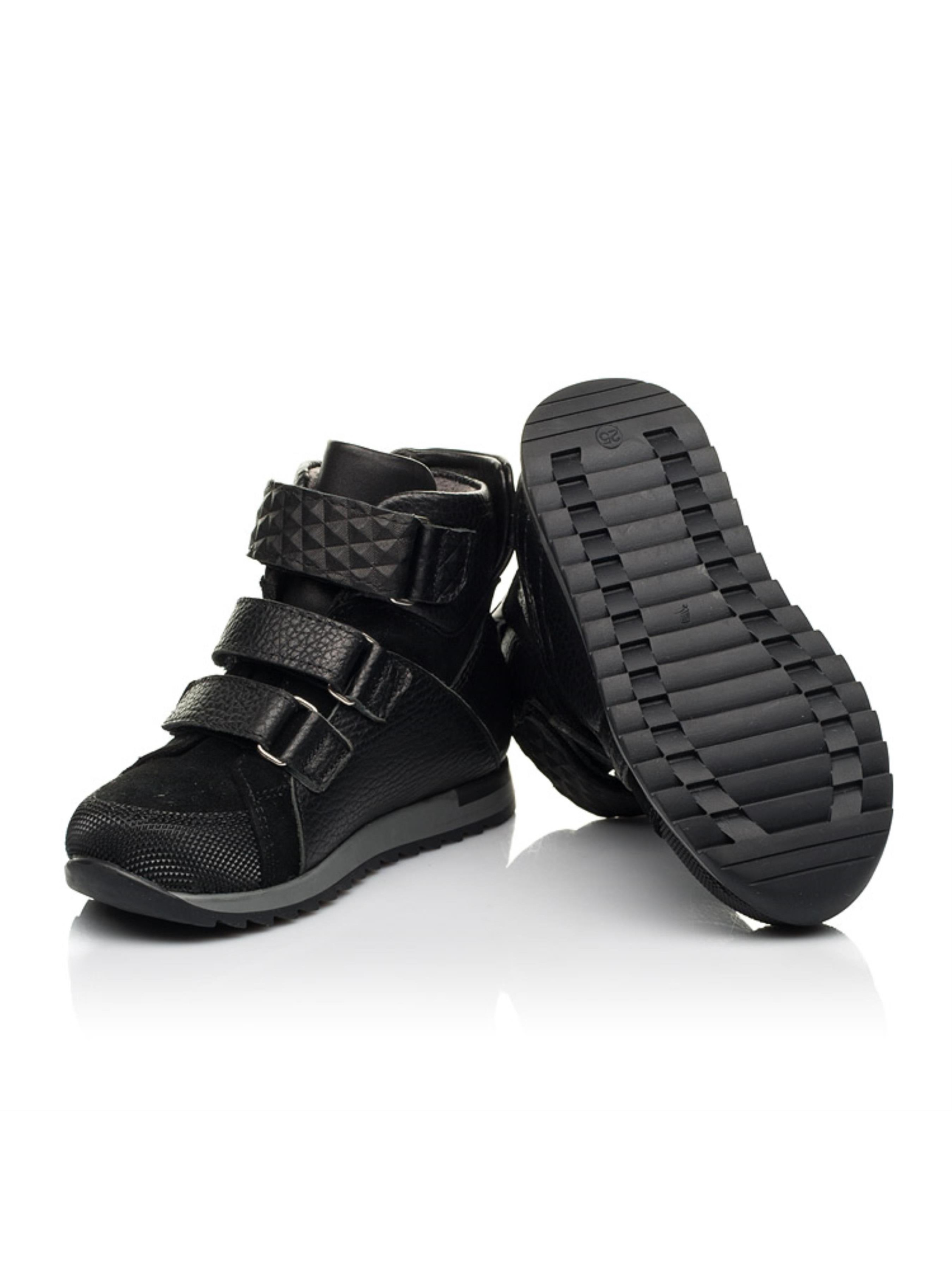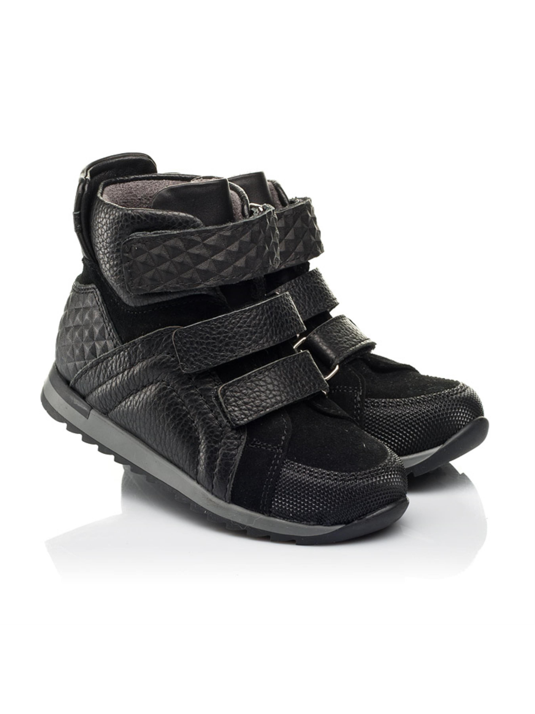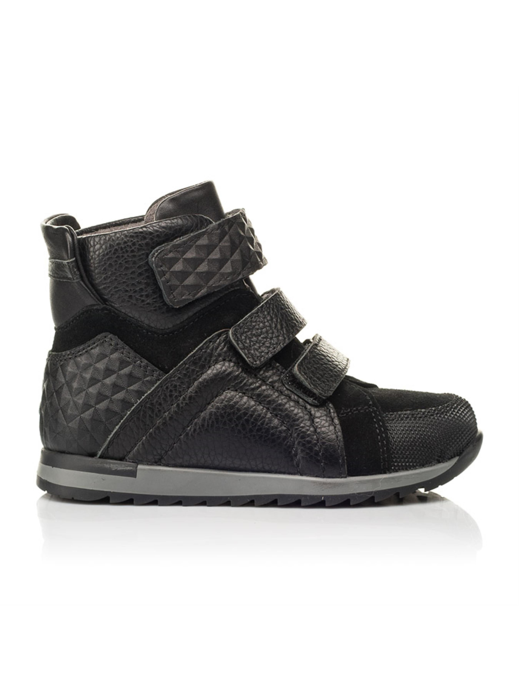 Мы с гордостью представляем Вам невероятную демисезонную пару для мальчика. С каждым годом обувь спортивного стиля покоряет все больше сердец ценителей комфорта и практичности. Детские демисезонные ботинки для мальчика пошиты из натуральной кожи классического черного цвета. Материал подкладки - флис, стелька кожаная. В модели мастерски сочетается несколько фактур и материалов. Дизайн дополнен вставкой из натуральной замши и вставкой из натуральной кожи с тиснением. Современная демисезонная пара пошита с учетом таких ортопедических элементов детской обуви: жесткий задник, супинатор и анатомически правильная стелька. Надежную фиксацию ножки обеспечат две липучки-застежки, которые еще и значительно ускорят процесс обувания.
