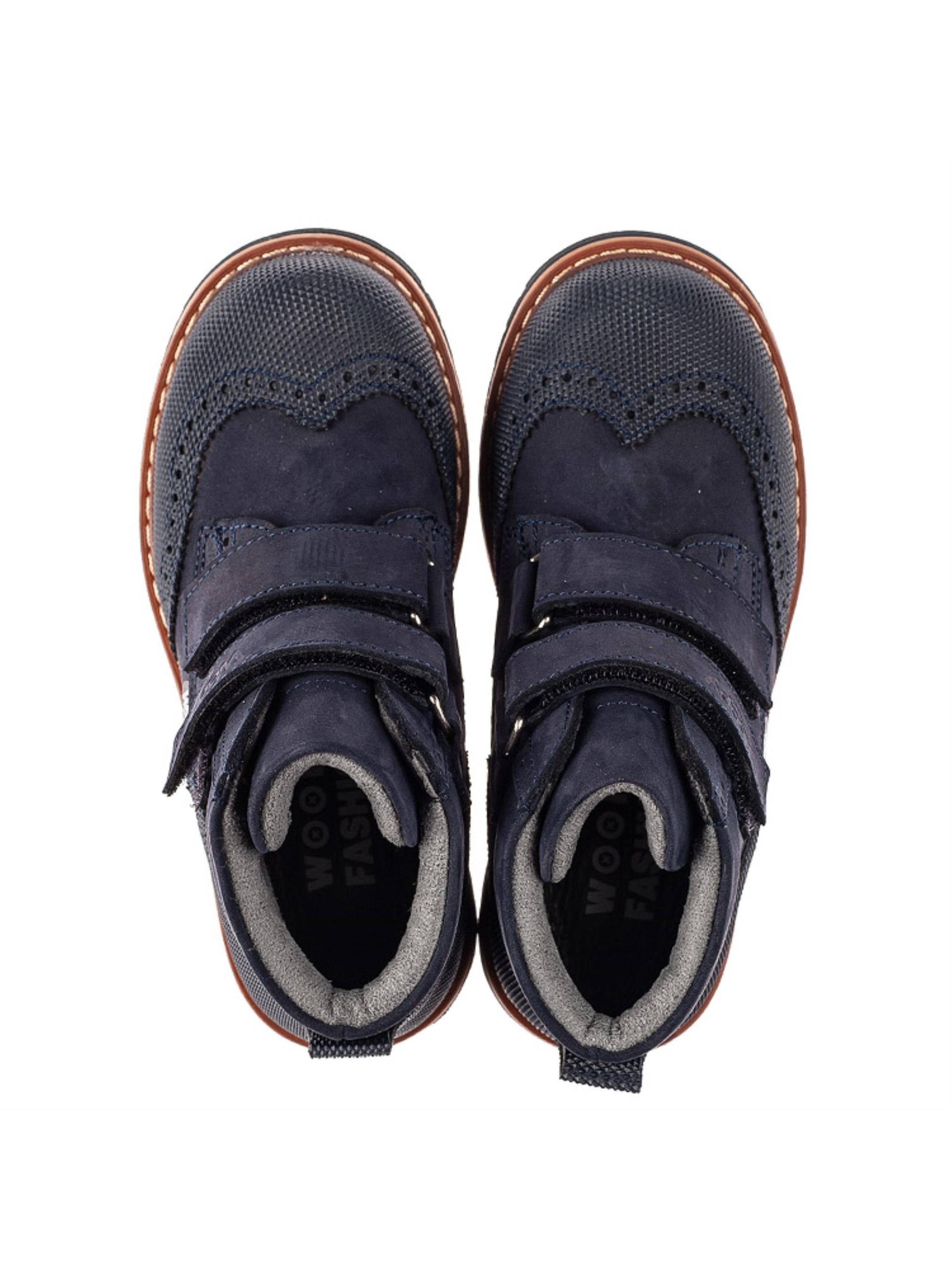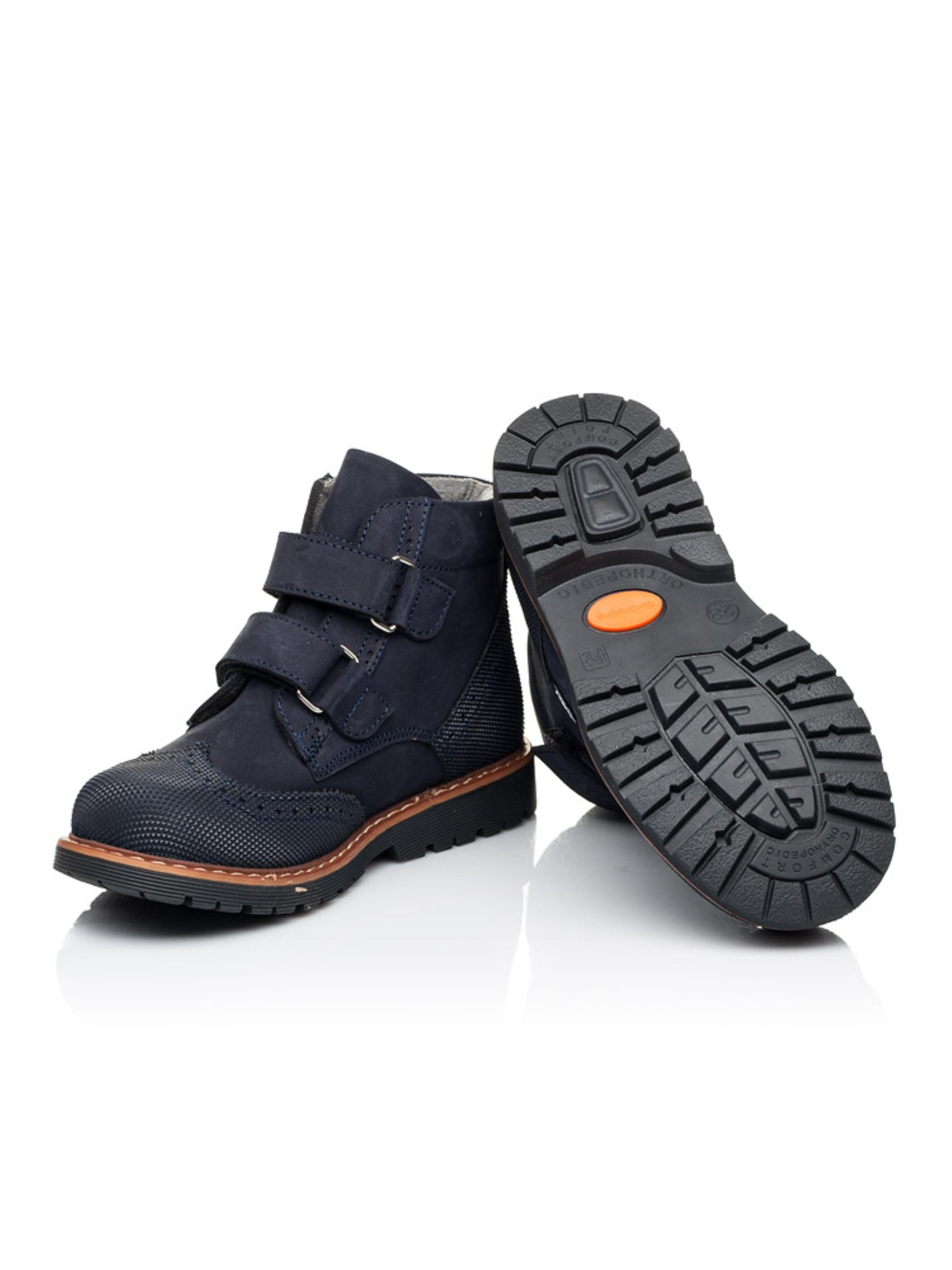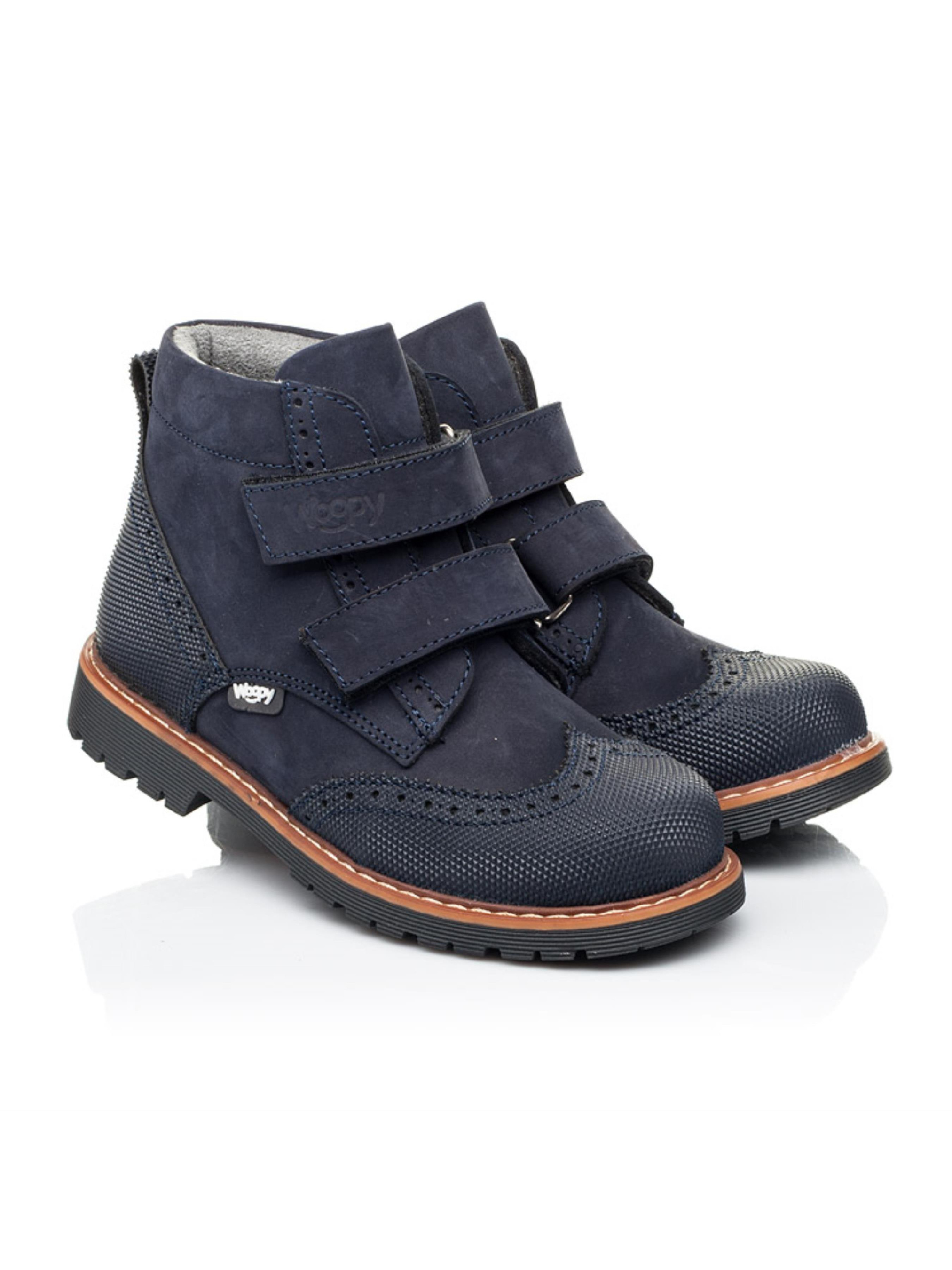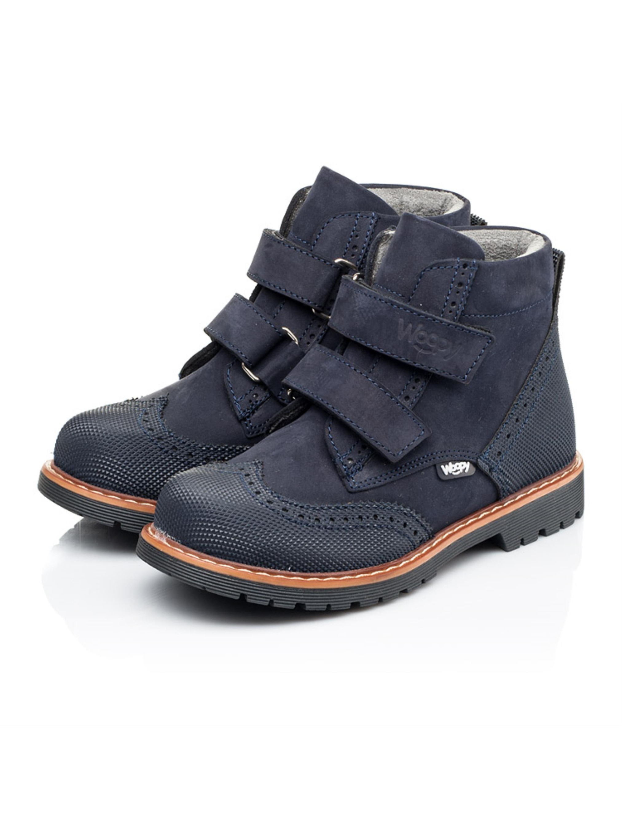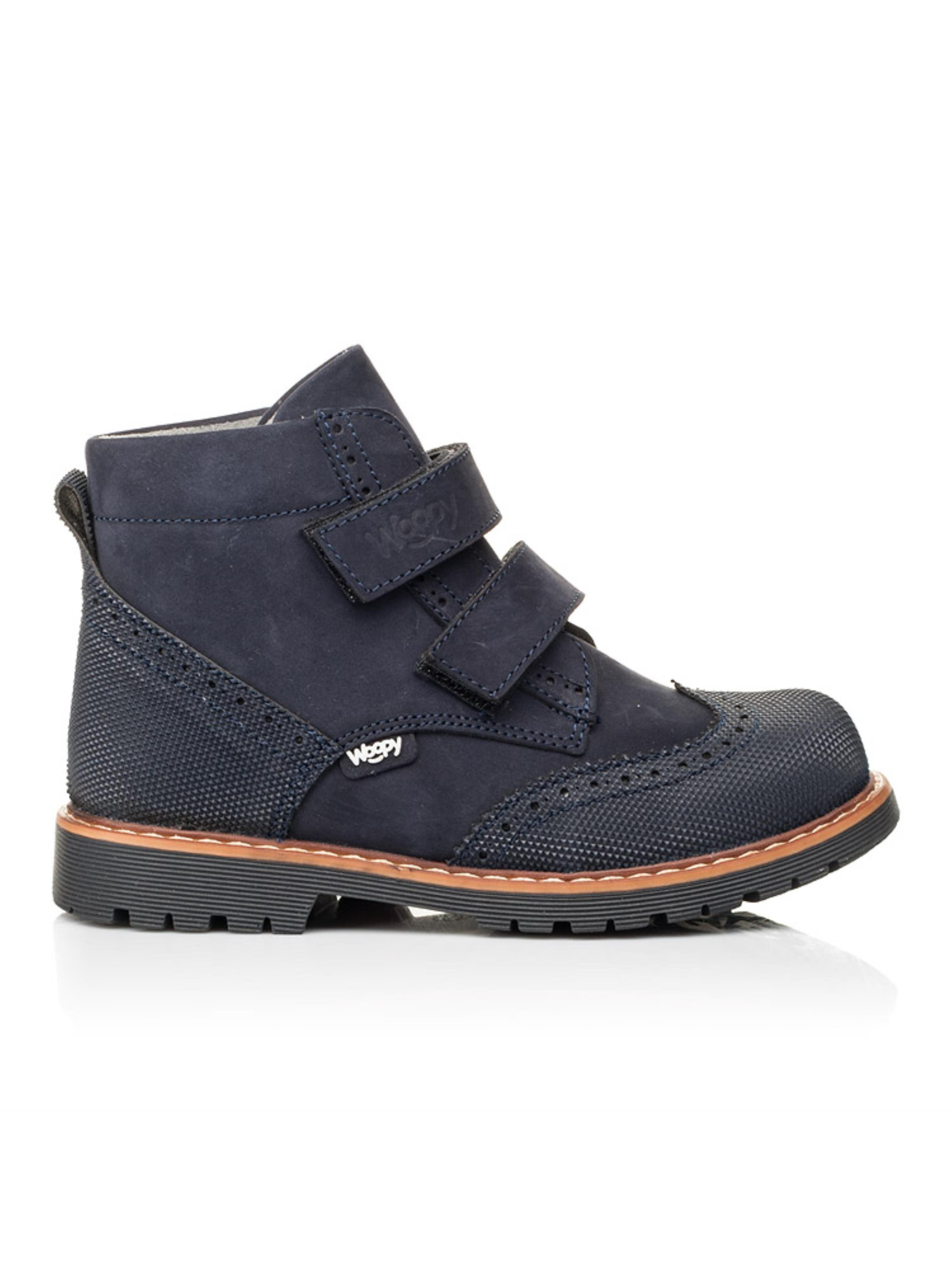 Детские демисезонные ботинки от бренда "Woopy" такой модели просто не могут не понравиться малышам и их родителям. Демисезонные ботинки пошиты из натурального нубука темно-синего цвета, подкладка флисовая, стелька кожаная. Ваш мальчик полюбит ботинки за скорость обувания, ведь в качестве застежки используются две надежные липучки, а родители оценят модель за качество пошива. Детские демисезонные ботинки отвечают всем важным требованиям детской ортопедической обуви. Каблук Томаса, жесткий задник, супинатор и анатомическая стелька обеспечат физиологически правильное положение ножки в обуви. Наличие "неубивайки" на носовой части и пятке убережет обувь от механических повреждений и царапин и тем же продлит срок ношения обуви. А нубук при надлежащей обработке долгое время будет хранить надлежащий внешний вид. В качестве отделки выступает перфорация, а дизайн дополнен контрастной прошивкой по периметру подошвы.