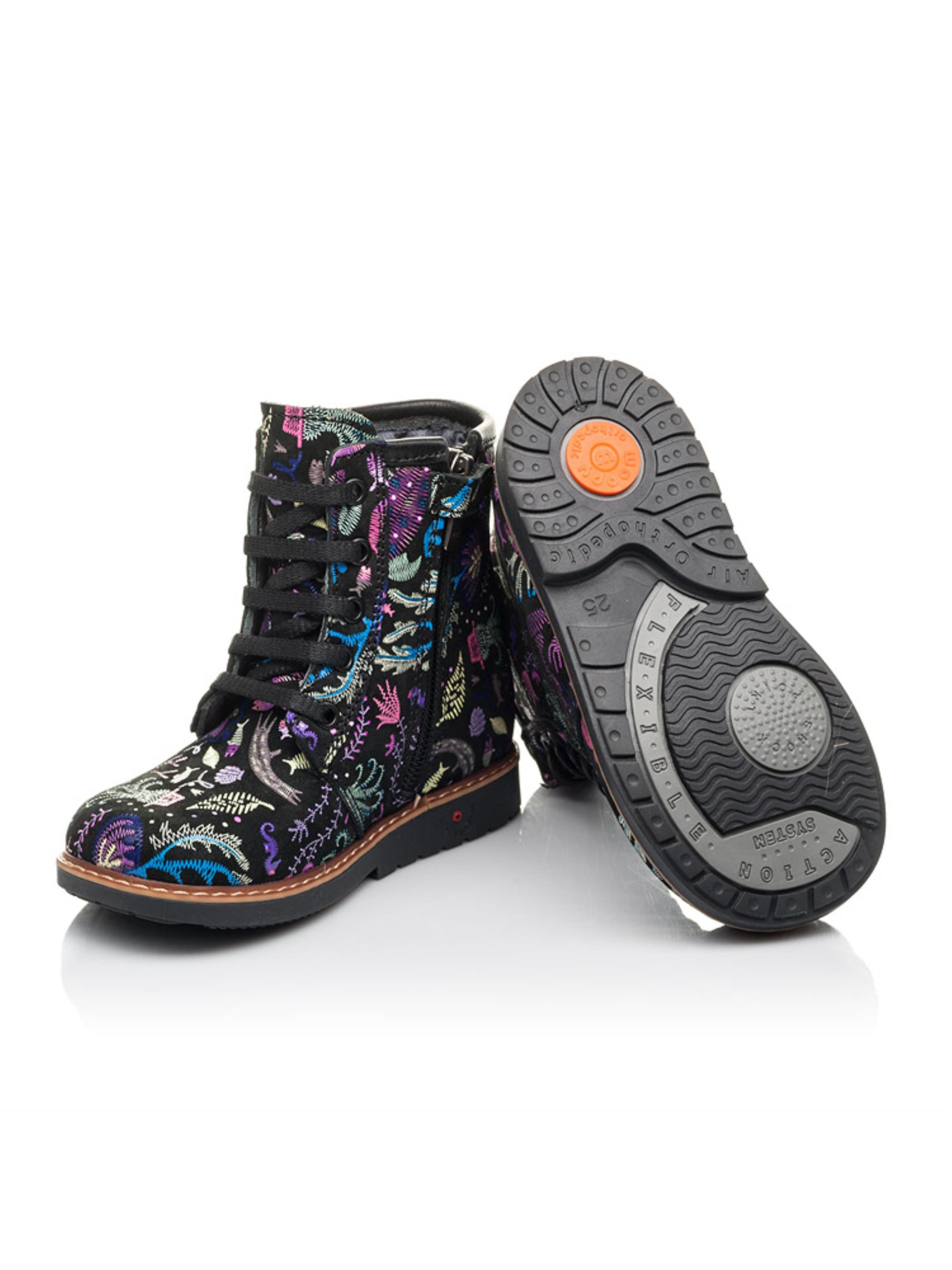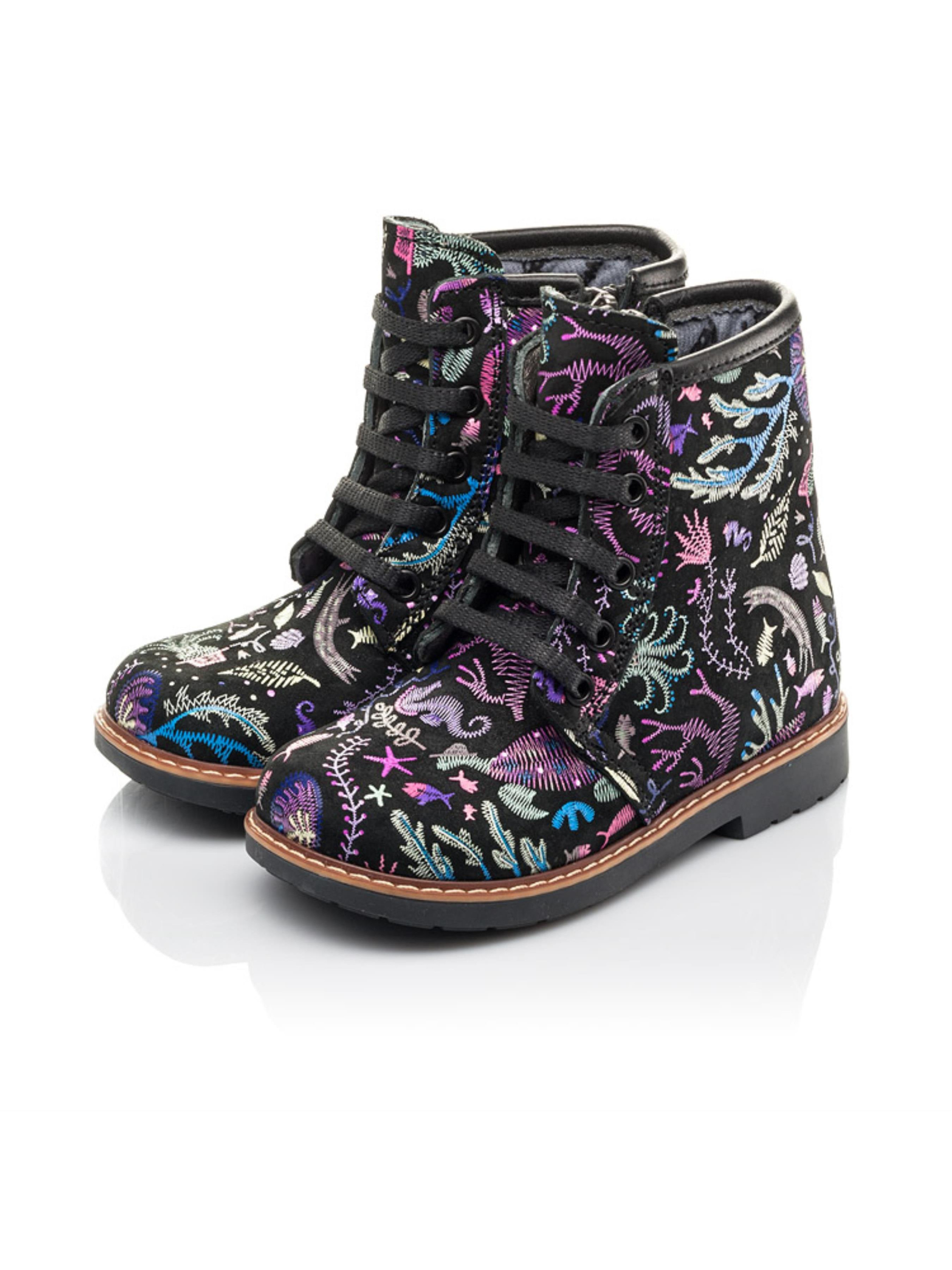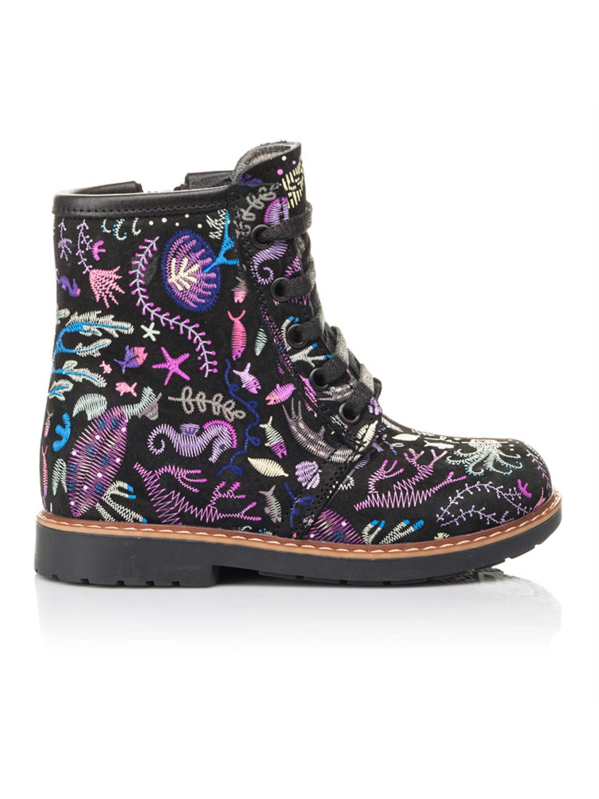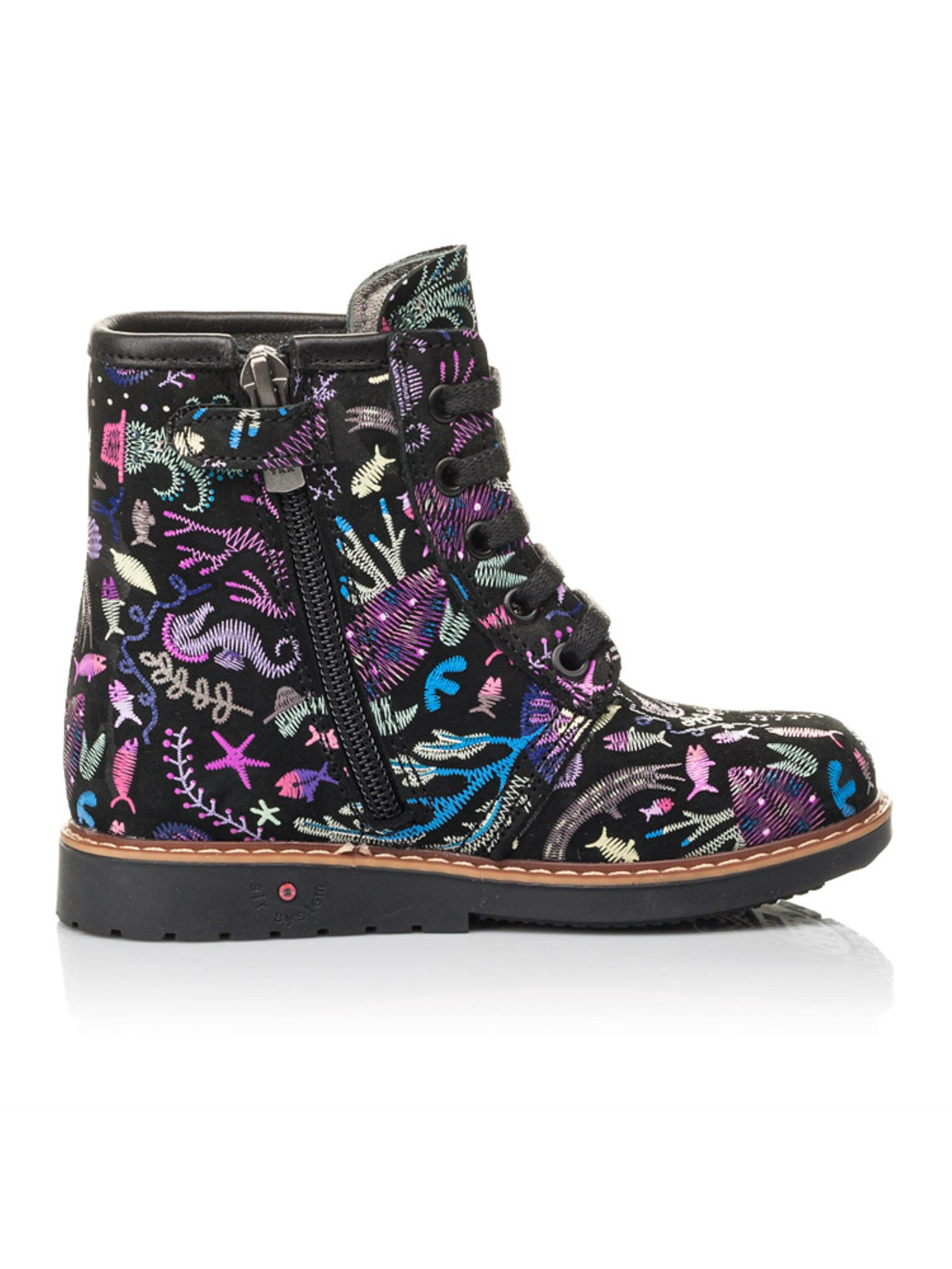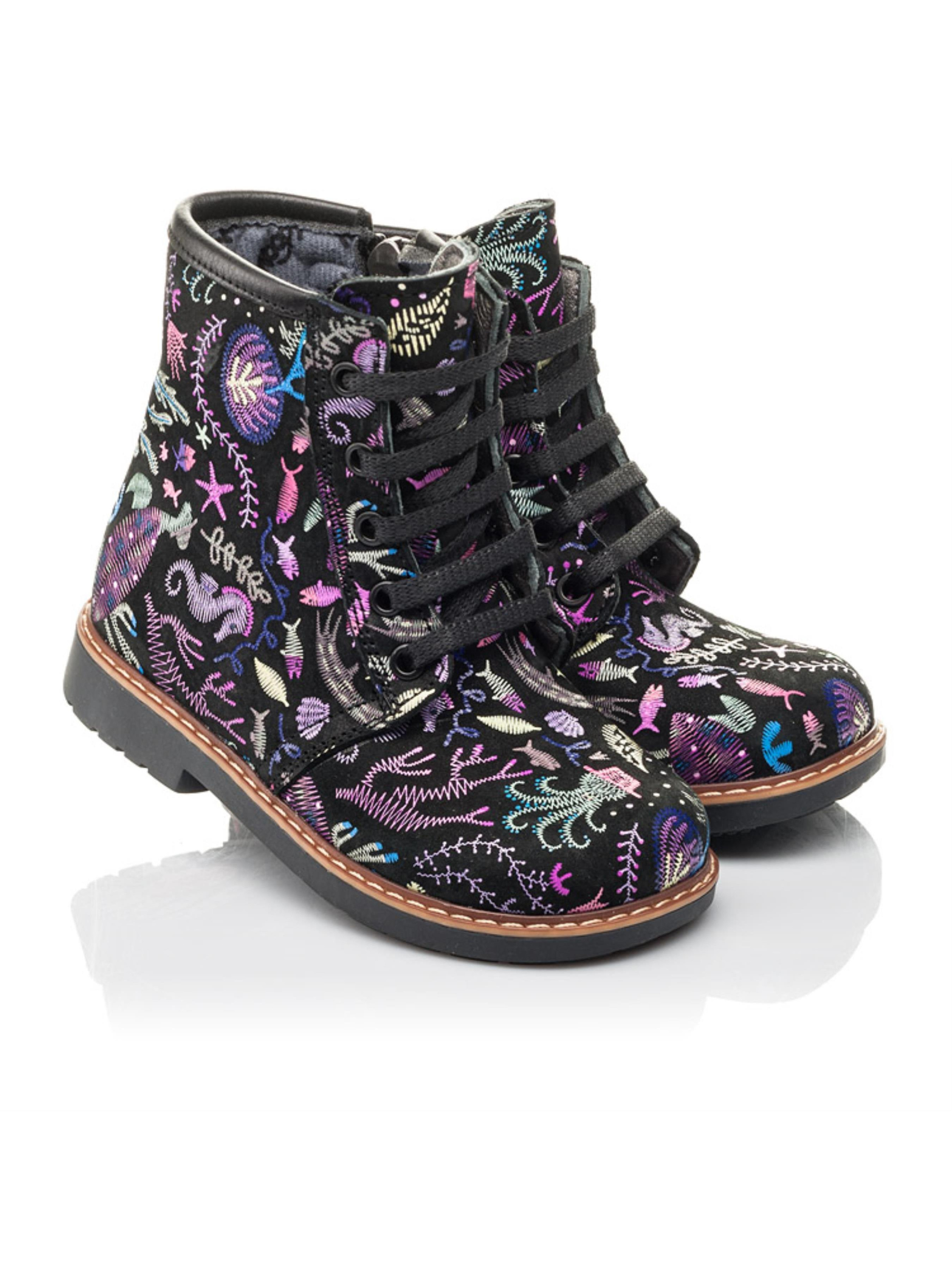 Чтобы Ваши малышки осенью не скучали по морю, мы с нашими партнерами – фабрикой Woopy Fashion, придумали эту стильную модель демисезонных ботинок с невероятной вышивкой на морскую тематику! Натуральный нубук черного цвета покрывают сиренево-голубые жители морских глубин. Утеплена модель флисом, что не позволит мерзнуть детским ножкам. Шнуровка и застежка-молния позволят существенно сэкономить время на обувании. Благодаря завышенному голенищу, твердому заднику, анатомической кожаной стельке и каблуку Томаса детские стопы будут зафиксированы в физиологически правильном положении. Равномерно распределить нагрузку на стопы при ходьбе поможет термопластичная, зонированная подошва. Ни одна девчонка не останется равнодушной от этой невероятной модели детских ботинок!