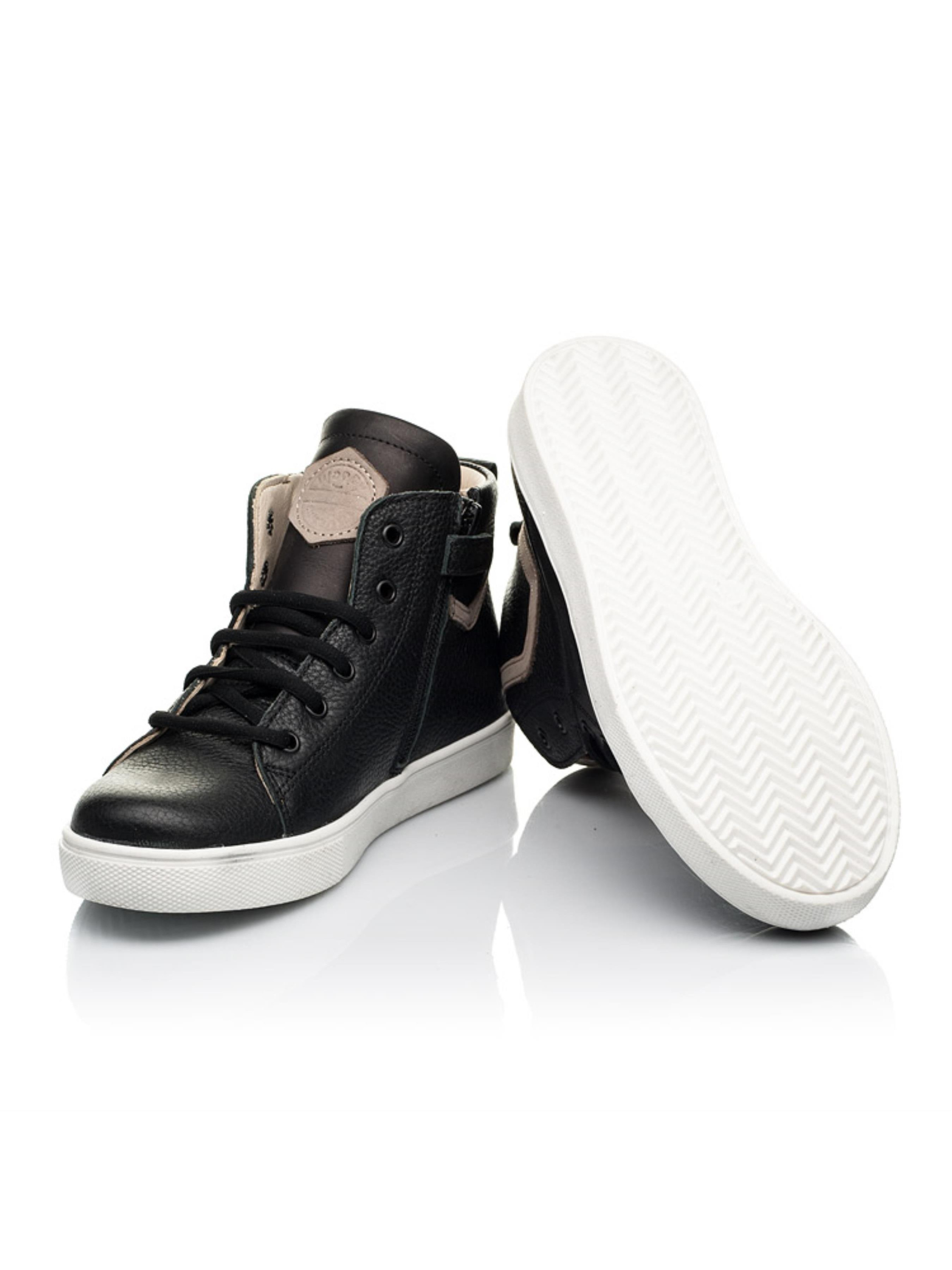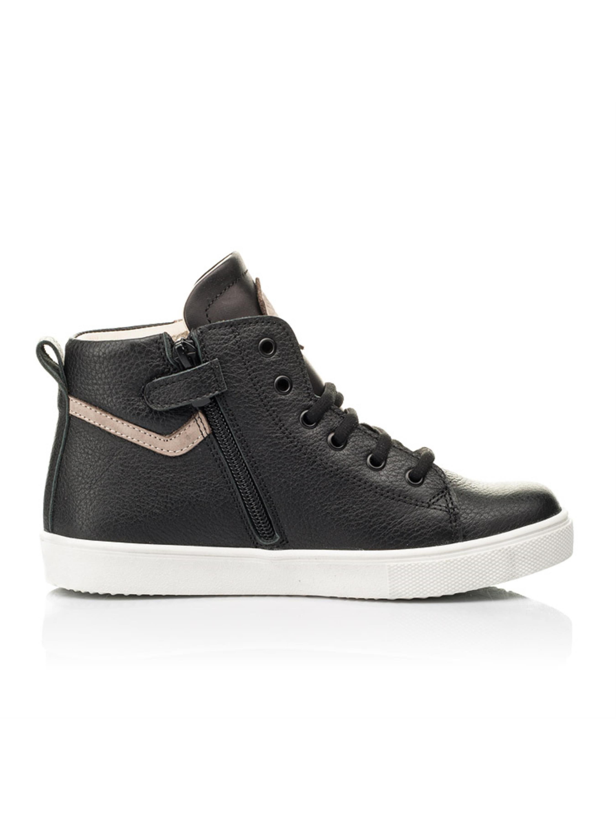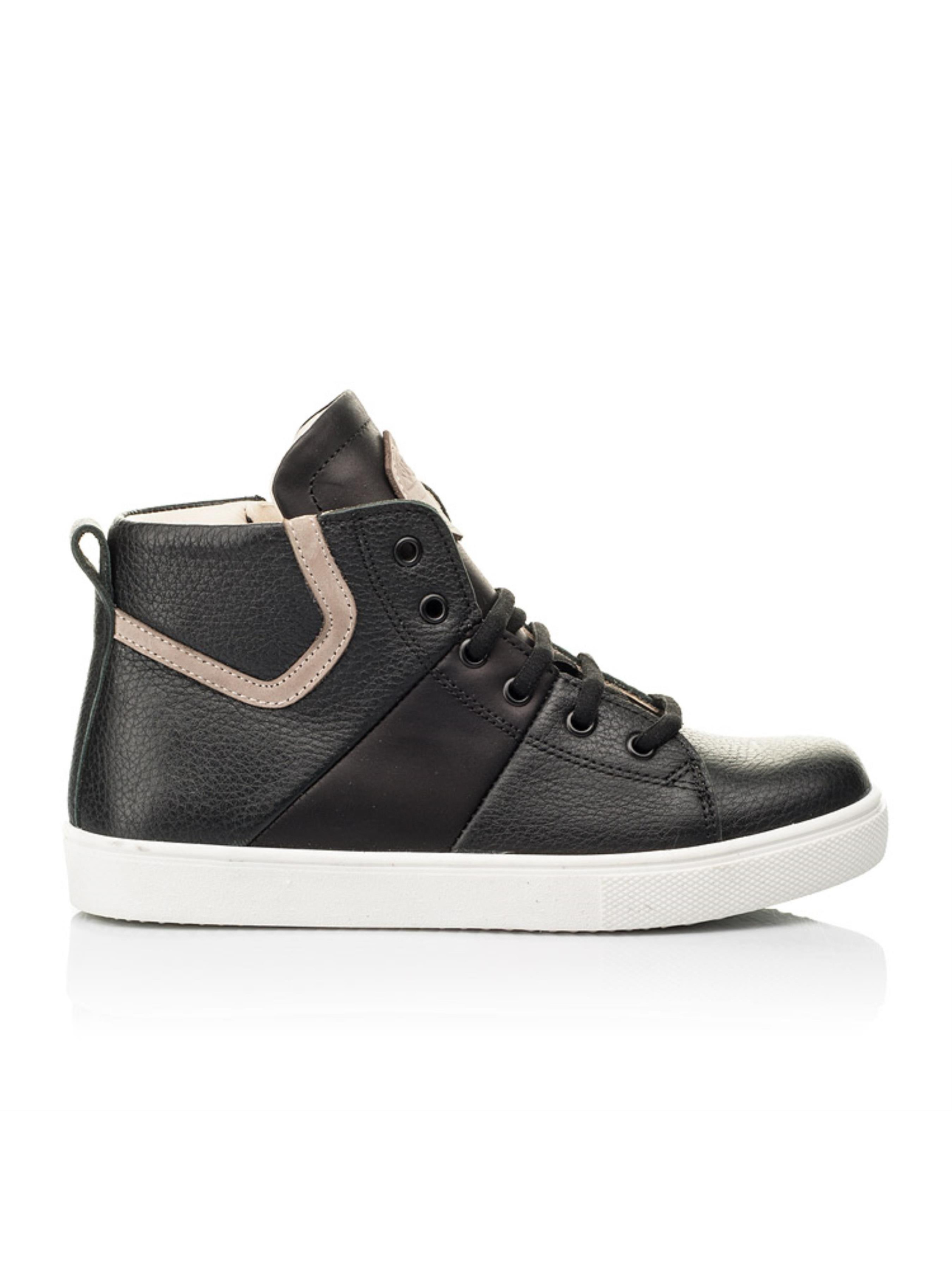 Максимально комфортные и очень стильные детские демисезонные ботинки для мальчика пошиты из исключительно натуральных материалов. Материал верха - натуральная кожа угольно-черного цвета, материал подкладки и стельки - высококачественная натуральная кожа. Украшением такой подростковой модели выступает декоративная вставка из натурального нубука контрастного бежевого цвета в виде геометрической линии. Для максимального ускорения процесса обувания и надежной фиксации стопы в этой модели предусмотрена застежка в виде боковой молнии, которая дополнена шнуровкой. Правильное положение ножки в ботинках обеспечат такие важные ортопедические элементы детской обуви как жесткий задник, супинатор и анатомически правильная стелька.