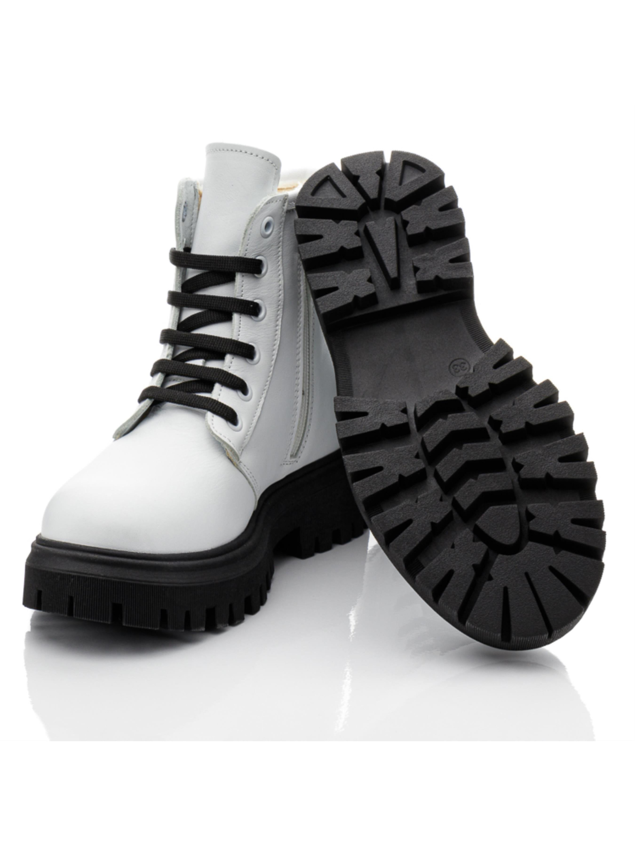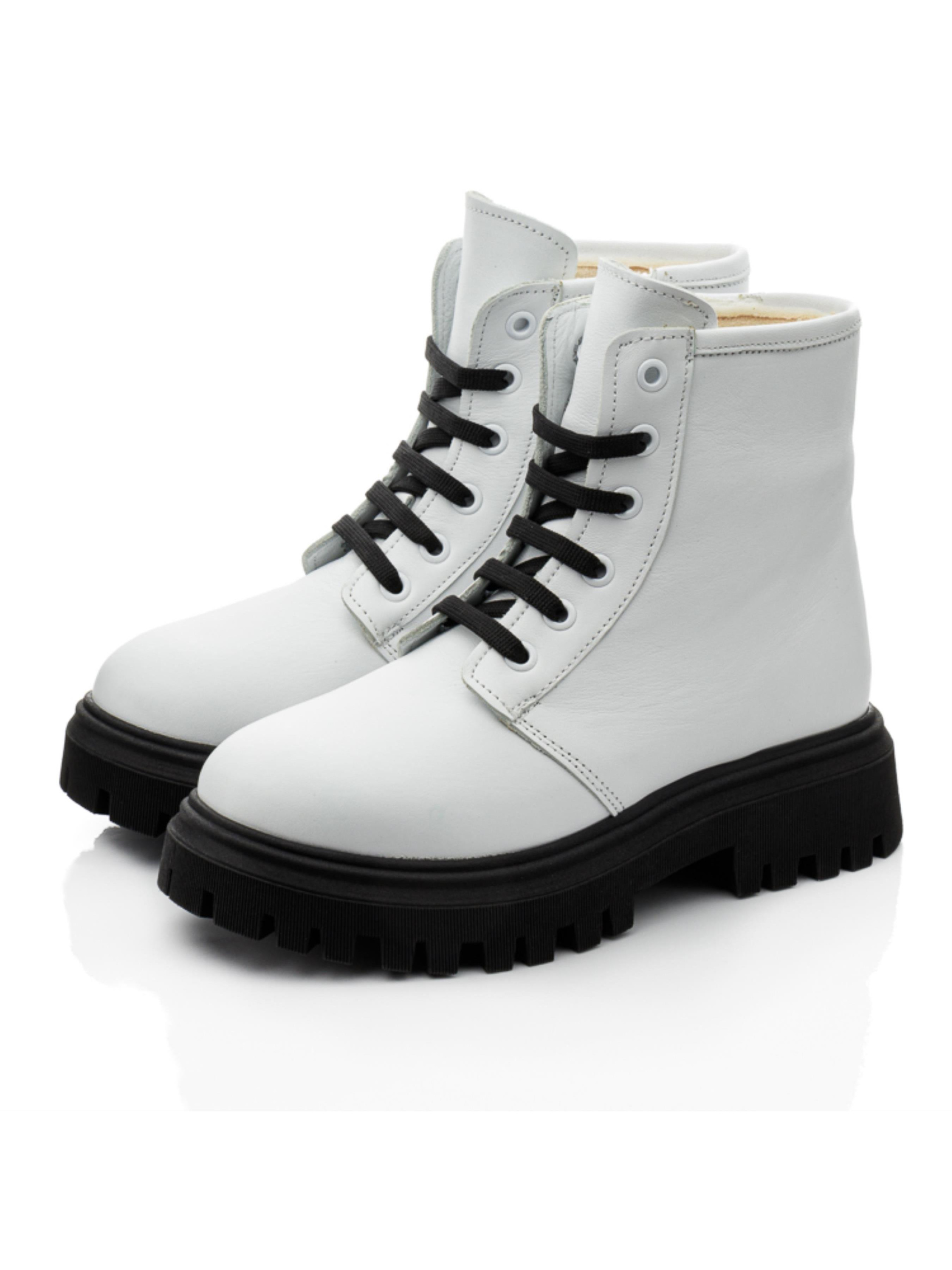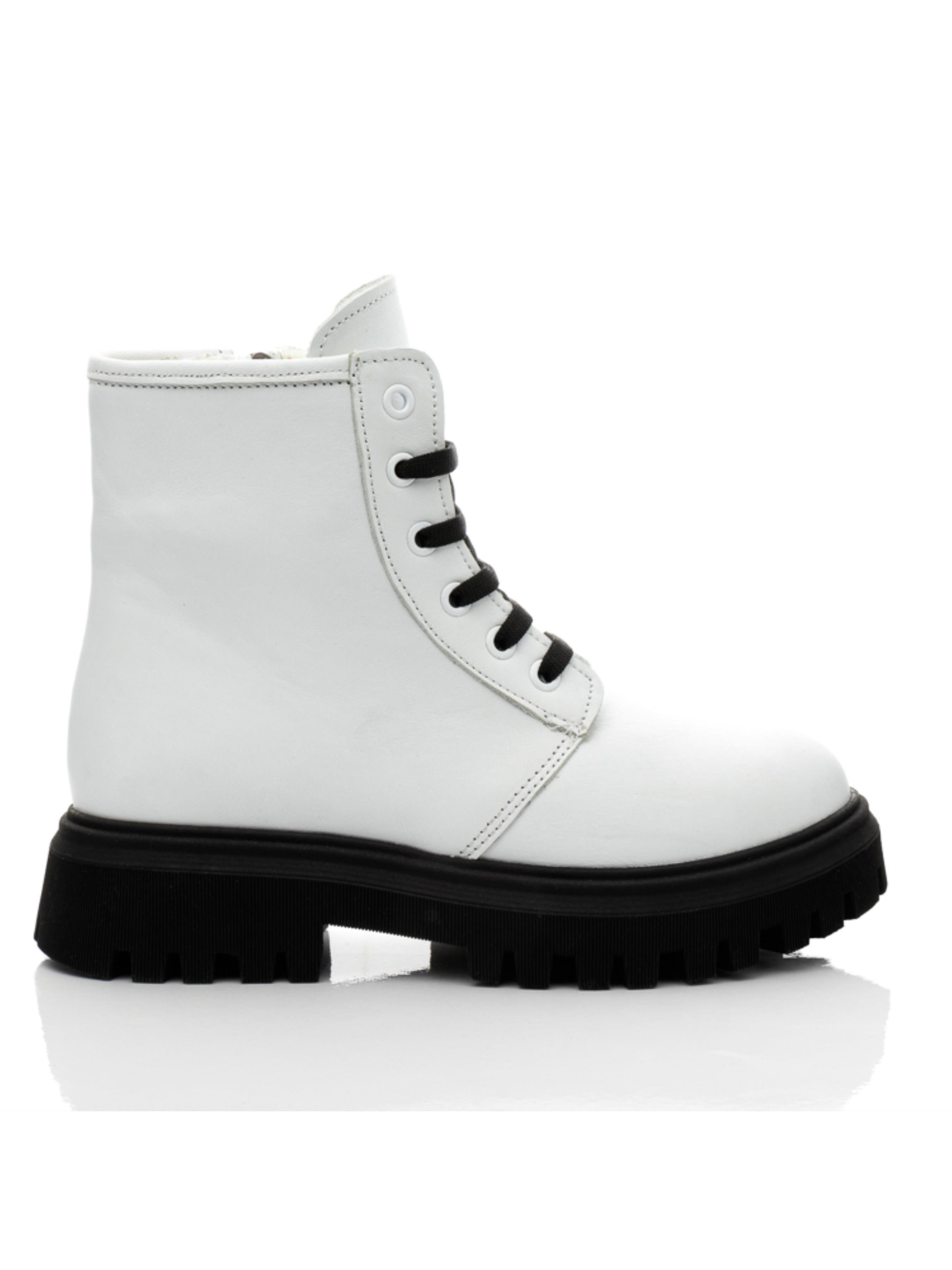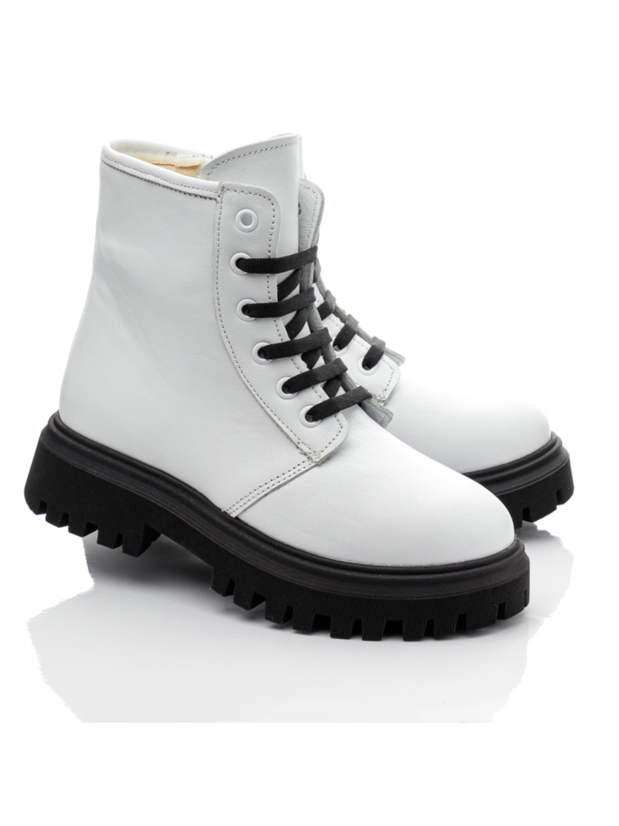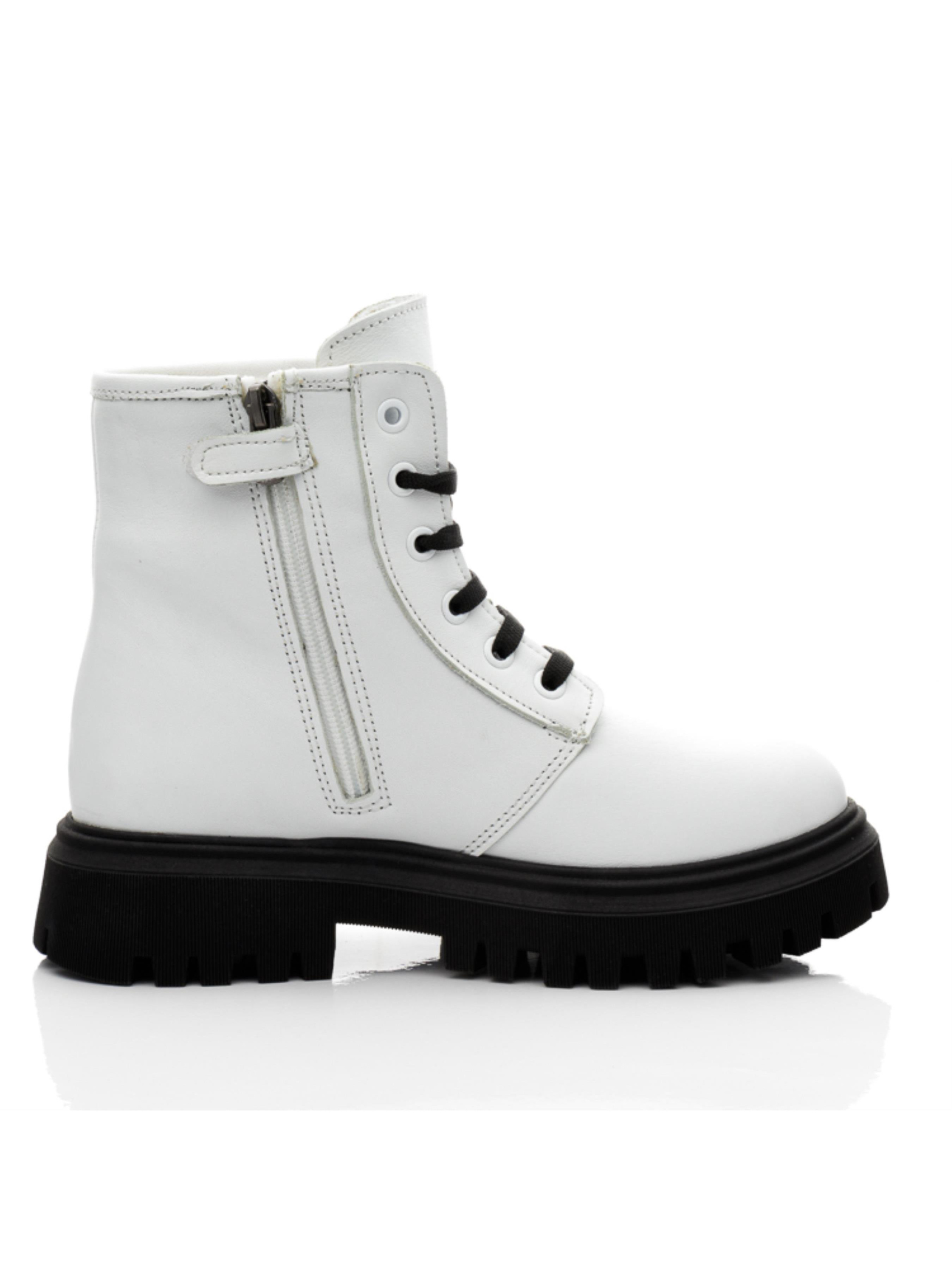 Современные детские демисезонные ботинки для девочки пошиты из натуральной кожи классического белого цвета. Изюминкой модели выступает контрастная рифленая подошва из термопластической резины черного цвета. Наши дизайнеры дополнили модель черной шнуровкой, которая кроме надежной фиксации ножки в ботинках придает паре особый шарм. Ботинки для девочки утеплены флисом, имеют кожаную стельку. Для облегчения обувания в качестве застежки используется боковая молния. При создании впечатляющей демисезонной пары были учтены и важные комфортные элементы детской обуви. Ботинки имеют твердый задник, супинатор и анатомически правильную стельку с подушечкой под свод стопы.