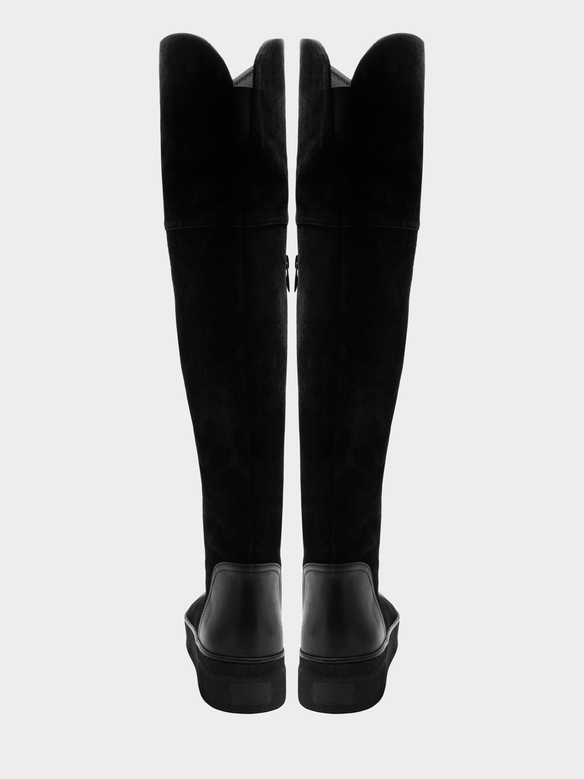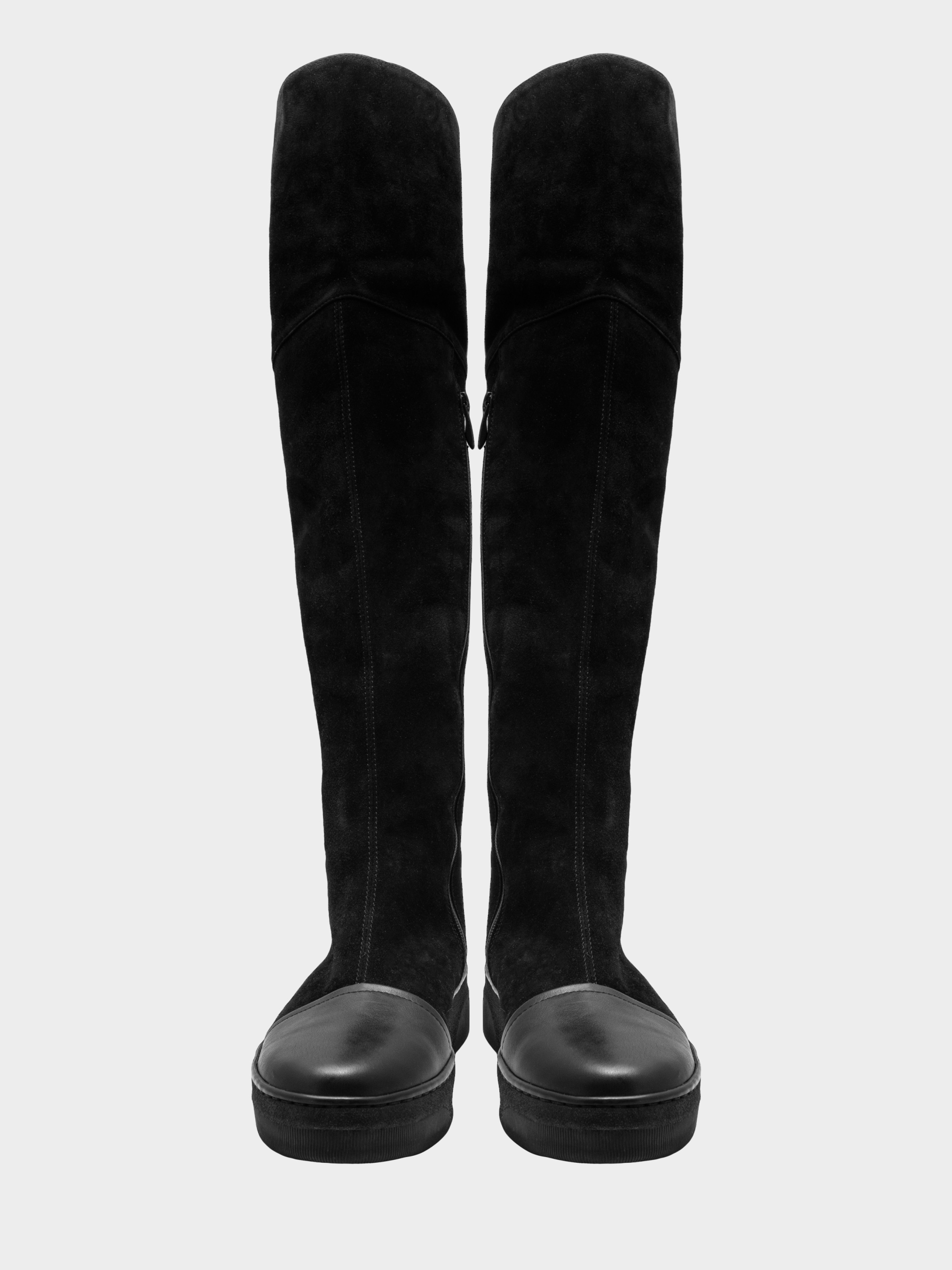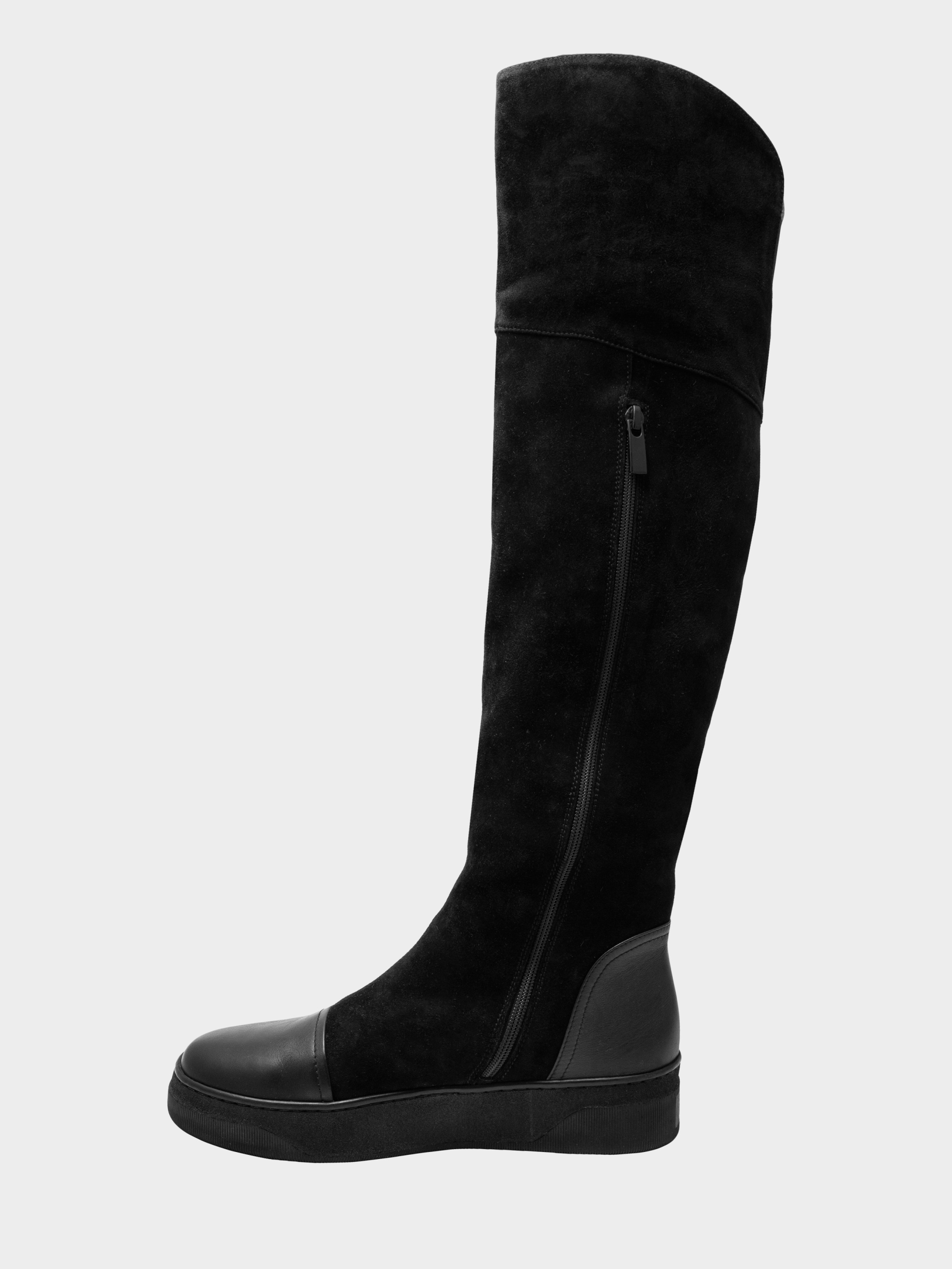 Высокие сапоги, высота голенища выше коленей - по переднему краю 50 см, по заднему краю - 45 см. Под коленом - вырез и эластичная вставка для комфорта при згибании колена. С внутренней стороны - молния до колена. Ботфорты выполнены из мягкого велюра и кожаных вставок в носочной и пяточной частях . Высота подошвы 3,5 см. Очень удобные и теплые ботфорты для холодной зимы: высокие голенища, которые закрывает колени и высокая подошва уберегут вас от морозов и ветров.