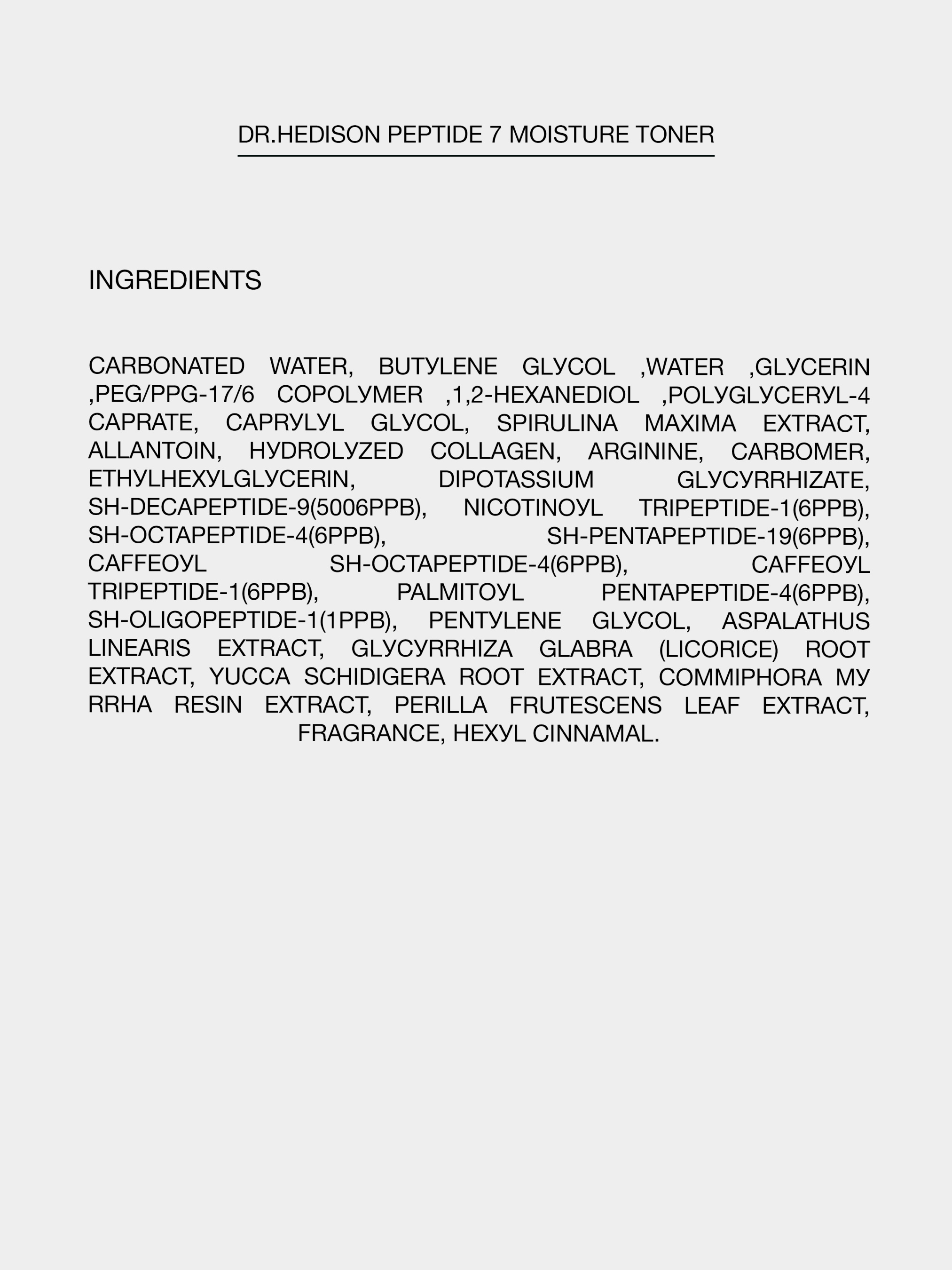 Многофункциональный тонер с 7 пептидами Dr. HEDISON Peptide 7 Moisture Toner для повышения упругости кожи и эффектом лифтинга Замечали ли Вы ощущение стянутости и сухости кожи после умывания? Это жесткая вода нарушает ph-баланс эпидермиса, из-за чего разрушается защитный барьер. Последствия нарушенного барьера кожи проявляются тусклостью, шелушениями, морщинами. Многофункциональный безспиртовой тонер с 7 пептидами за несколько секунд выравнивает Ph-уровень, обеспечивает глубокое интенсивное увлажнение, и благоприятно влияет на барьер кожи. А также становится проводником активных компонентов в последующих этапах ухода. Он действует как бустер-проводник, усиливая проникновение сывороток и кремов, подготавливая кожу к нанесению активных средств. КАКИЕ ПРОБЛЕМЫ РЕШАЕТ Глубоко увлажняет и предотвращает трансэпидермальную потерю влаги; Разглаживает морщины благодаря пептидному комплексу; Замедляет процессы фото- и хроностарения; Защищает кожу от свободных радикалов благодаря антиоксидантам; Повышает защитные функции; Улучшает упругость и укрепляет тургор кожи. Тонер основан на минеральной воде, которая насыщает кожу влагой и полезными микроэлементами, нормализует работу сальных желез. Морской коллаген и экстракт спирулины обладают антиоксидантным и омолаживающим свойствами, разглаживают микрорельеф эпидермиса, стимулируют процессы обновления и регенерации клеток, а также повышают защитные функции и упругость кожи. Концентрированный пептидный комплекс, гиалуроновая кислота, экстракты листьев чая ройбуш, и корня юкки и солодки эффективно восстанавливают кожу и укрепляют защитный барьер. АКТИВНЫЕ КОМПОНЕНТЫ Тонер 7 пептидов Dr.Hedison Peptide 7 moisture toner Сложный пептидный компонент (5%) – эффективно устраняет мимические морщины, глубоко увлажняет и восстанавливает кожу. Воздействует, как на поверхностные участки, так и глубокие слои эпидермиса.Продлевает молодость и заботится о здоровье кожи. Минеральная вода (Mineral water) – интенсивно увлажняет кожу, и насыщает кожу ценными минералы и микроэлементами. Сохраняет кожный барьер здоровым, а поры чистыми. EGF – активный белок, который способен стимулировать клеточный рост эпидермиса, а это сохраняет целостность поврежденной кожи и укрепляет кожный барьер. Экстракт спирулины (Spirulina extract) – самые древнейшие водоросли, которые содержат линоленовую кислоту, витамины B, E, и множество полиненасыщенных жирных кислот, которые просто незаменимы для сохранения упругости кожи. Экстракт спирулины поддерживает структурную целостность кожи и помогает уменьшить воспаление. Укрепляет тургор кожи и повышает упругость. Морской Коллаген (Marine Collagen) – имеет структуру, схожую с коллагеном человеческой кожи. Полезен в борьбе с морщинами благодаря его способности саморегуляции. Глубоко увлажняет и регенерирует кожу на клеточном уровне. Гиалуроновая кислота (Hyaluronic acid) – является главным регулятором водного баланса в межклеточном пространстве, удерживает свыше пятисот молекул воды, необходимых для нормальной жизнедеятельности кожи. Стимулирует выработку коллагена и эластина, предотвращает трансэпидермальную потерю влаги. УПАКОВКА, БРЕНД Объем: 150 мл Dr. Hedison, Юж. Корея, премиум-класс