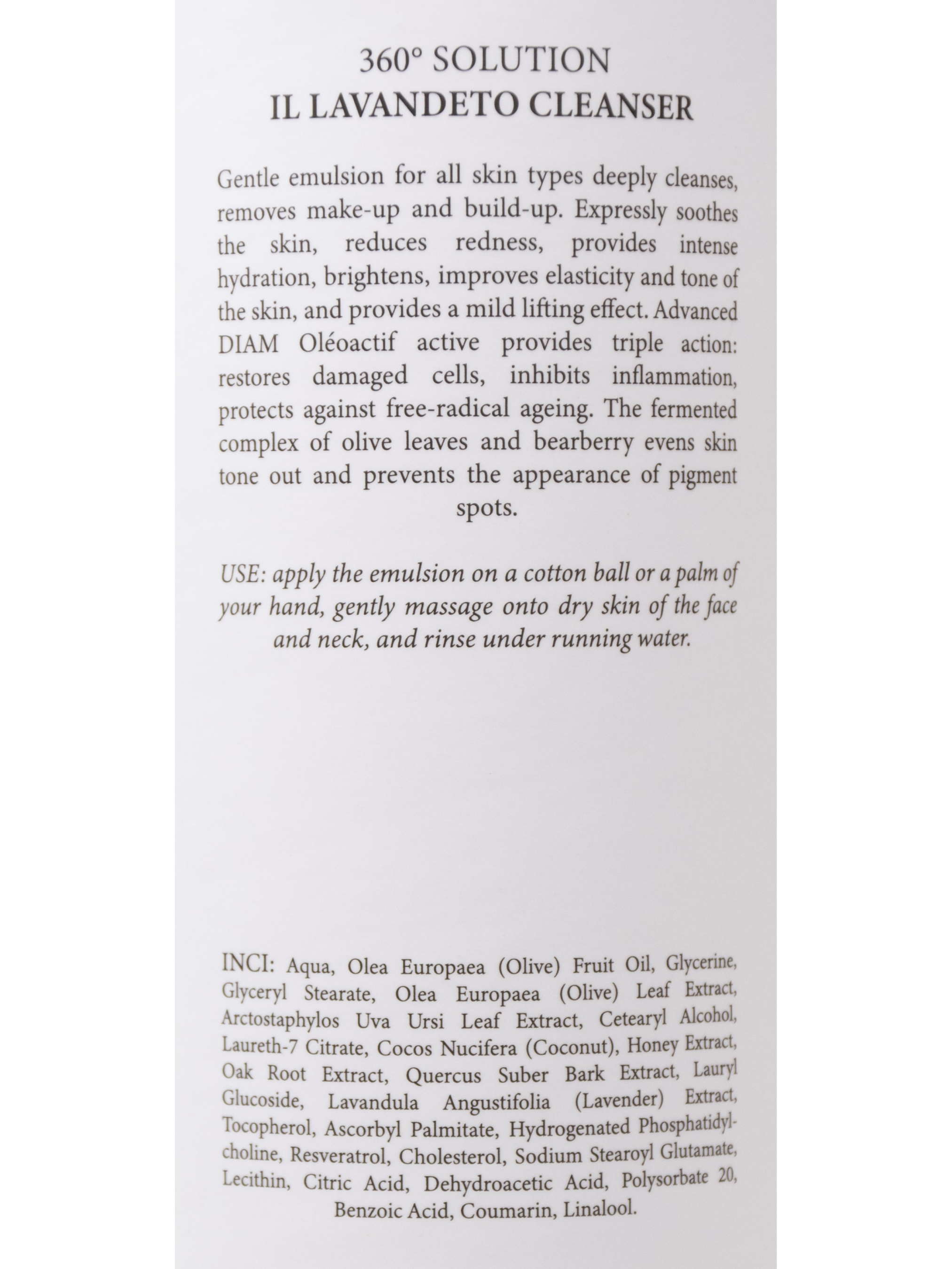 Нежная эмульсия для всех типов кожи глубоко очищает, удаляет макияж и загрязнения. Выражено успокаивает кожу, уменьшает покраснения, обеспечивает интенсивное увлажнение, освещает, улучшает упругость и тонус кожи, обеспечивает мягкий лифтинг-эффект. Передовой актив DIAM Oléoactif обеспечивает тройное действие: восстанавливает поврежденные клетки, ингибирует воспаление, защищает от свободнорадикального старения. Ферментированный комплекс оливковых листьев и толокнянки выравнивает тон кожи и предотвращает образование пигментных пятен.
