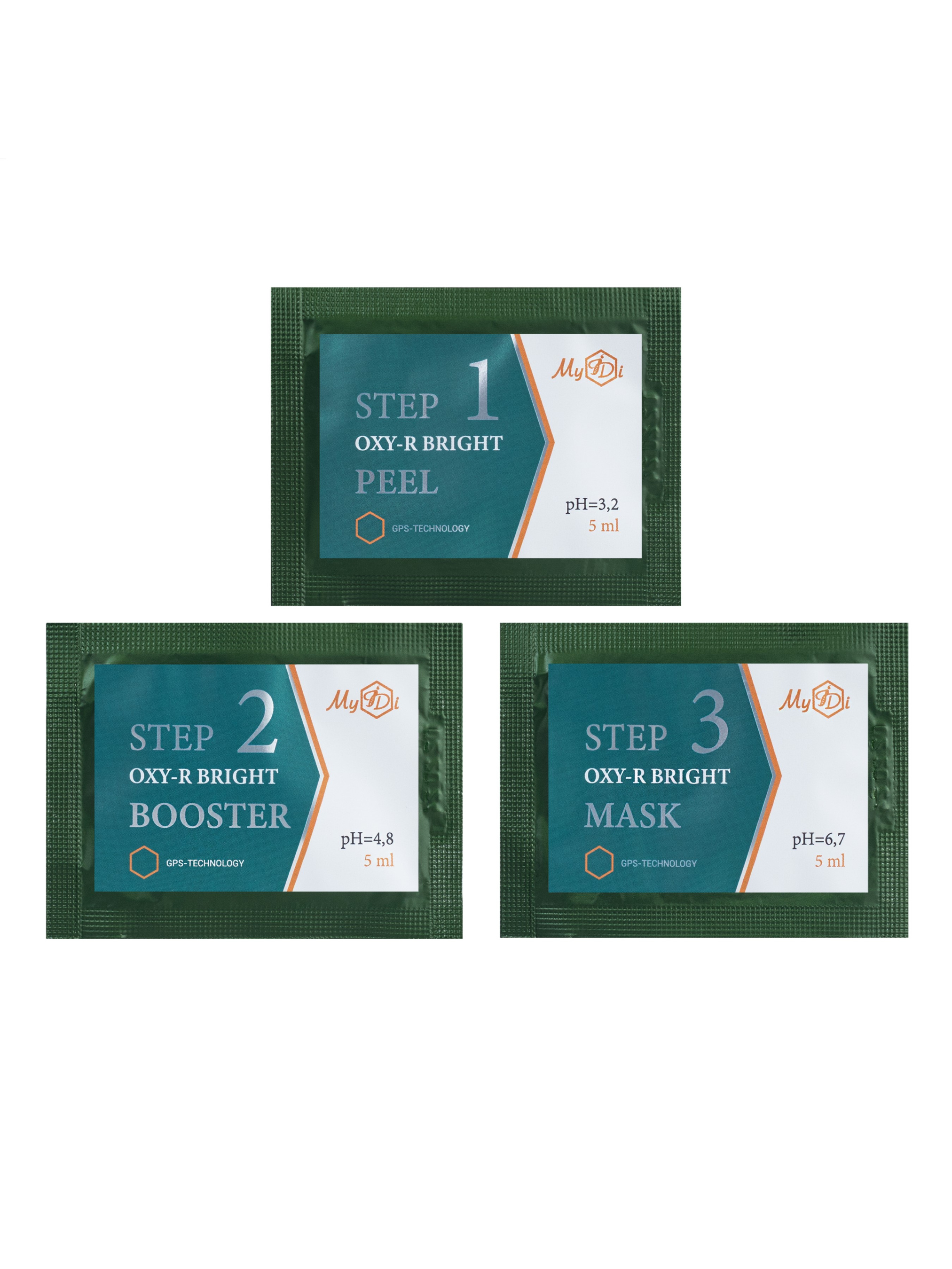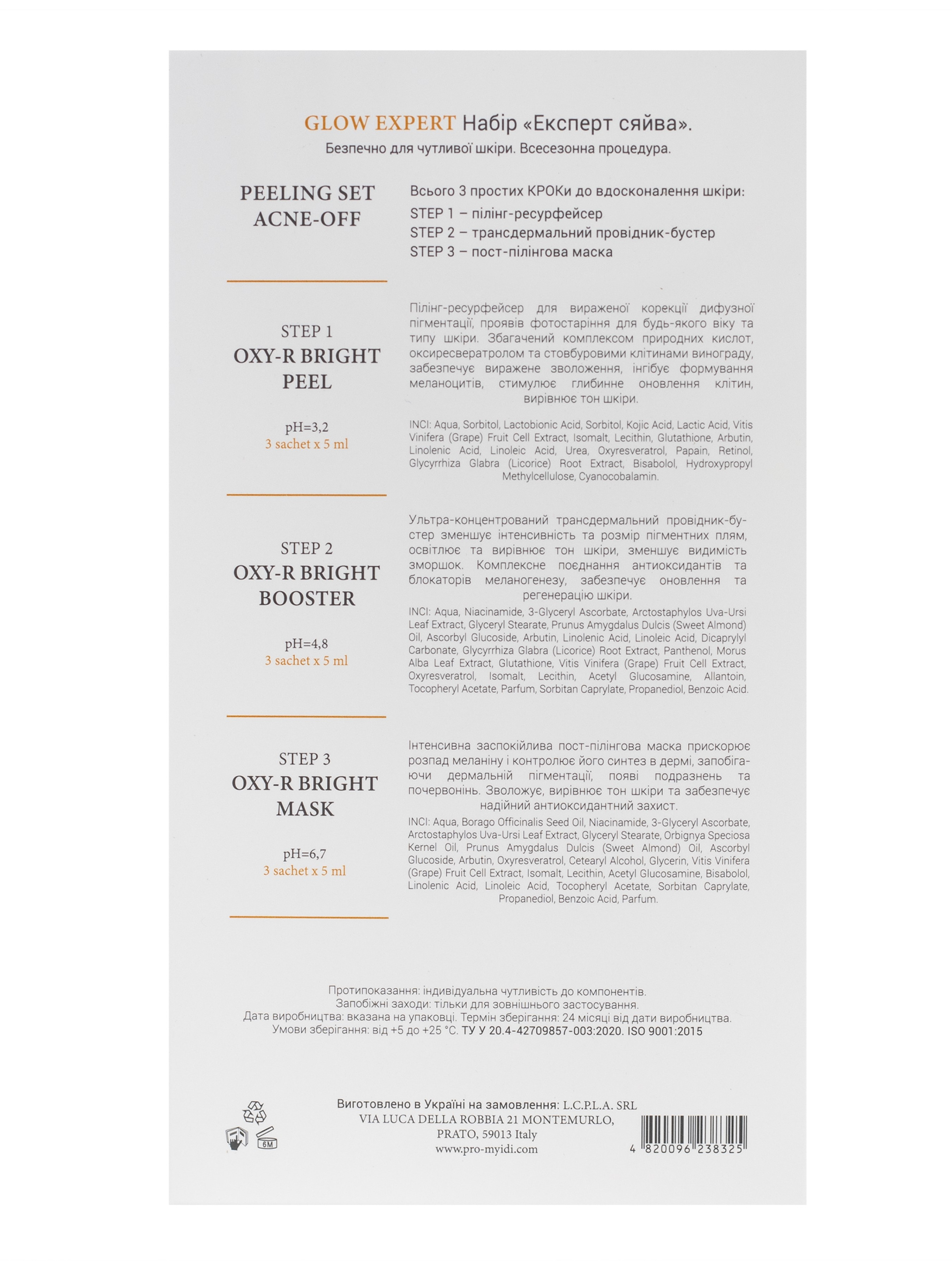 Глобальная осветляющая программа тройного действия: отбеливает, увлажняет и обеспечивает мощную антиоксидантную защиту. Салонный уход за кожей на дому. Всего 3 простых ШАГА к усовершенствованию кожи. ШАГ 1: пилинг-ресурфейсер ШАГ 2: трансдермальный проводник-бустер ШАГ 3: постпилингова маска ПОКАЗАНИЯ: Гиперпигментация разного генеза; Комплексная коррекция фотостарения; Тусклая кожа всех типов; Возрастная атоническая кожа; Гиперкератоз, пост-акне; Тусклая кожа всех типов; Простая 3-х шаговая процедура, состоящая из поэтапного нанесения пилинга-ресурфейсера, трансдермального проводника-бустера и восстанавливающей маски. Безопасный для чувствительной кожи, всесезонный. ШАГ 1. Пилинг-ресурфейсер OXY-R BRIGHT PEEL pH=3,2 Пилинг-ресурфейсер для выраженной коррекции диффузной пигментации, проявлений фотостарения для всех возрастов и типа кожи. Обогащен комплексом природных кислот, оксиресвератролом и стволовыми клетками винограда, обеспечивает выраженное увлажнение, ингибирует формирование меланоцитов, стимулирует глубинное обновление клеток, выравнивает тон кожи. Шаг 2. Ультра-концентрированный трансдермальный проводник-бустер OXY-R BRIGHT BOOSTER pH=4,8 Ультра-концентрированный трансдермальный проводник-бустер уменьшает интенсивность и размер пигментных пятен, освещает и выравнивает тон кожи, уменьшает видимость морщин. Комплексное сочетание антиоксидантов и блокаторов меланогенеза обеспечивает обновление и регенерацию кожи. ШАГ 3. Интенсивная успокаивающая постпилинговая маска OXY-R BRIGHT MASK pH=6,7 Интенсивная успокаивающая постпилинговая маска ускоряет распад меланина и контролирует его синтез в дерме, предотвращая дермальную пигментацию, появление раздражений и покраснений. Увлажняет, выравнивает тон кожи и обеспечивает надежную антиоксидантную защиту.
