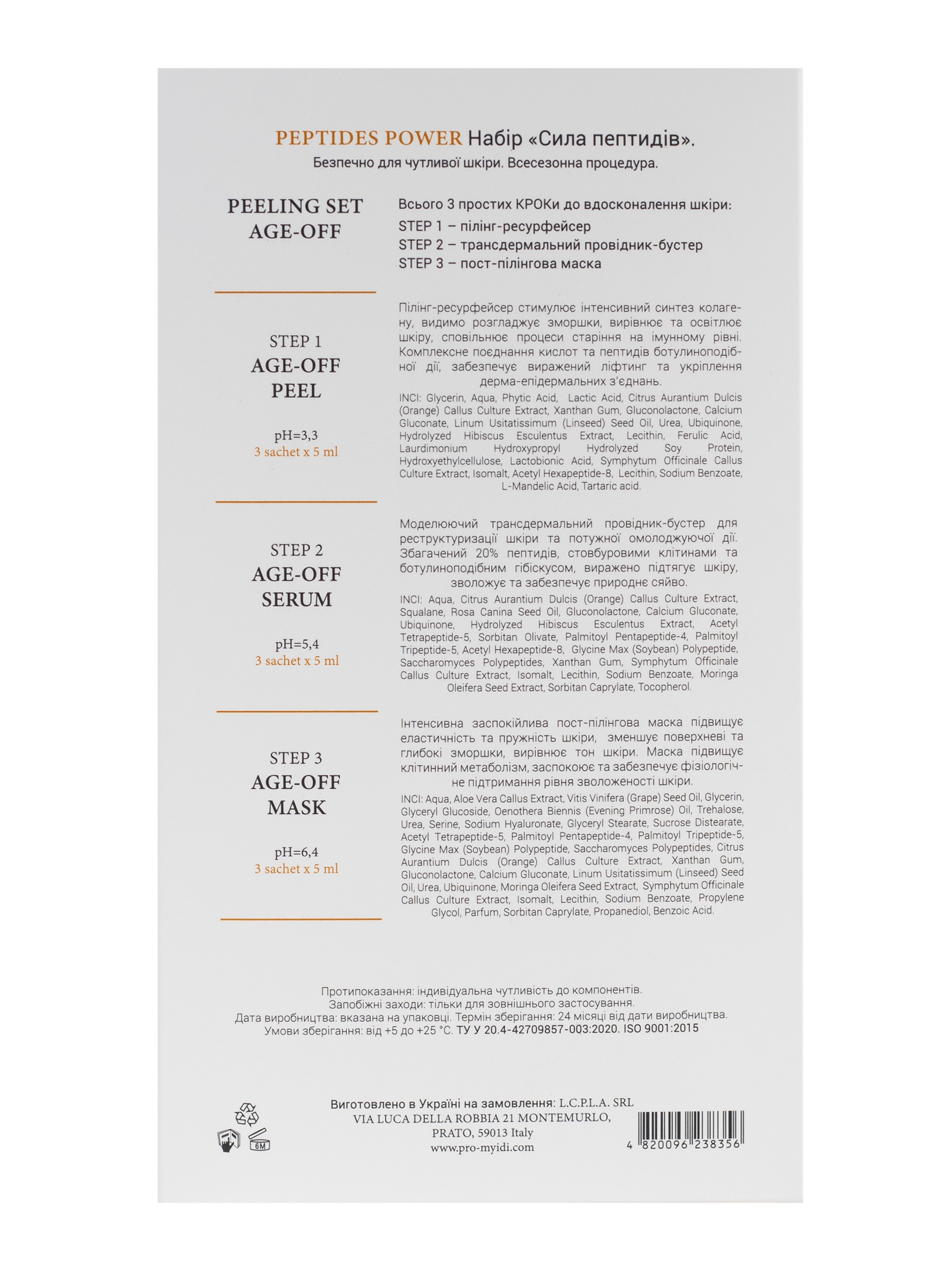 Простая 3-х шаговая процедура, состоящая из поэтапного нанесения пилинга-ресурфейсера, трансдермального проводника-бустера и восстанавливающей маски. Безопасный для чувствительной кожи, всесезонный. Выполните всего 3 простых ШАГА к усовершенствованию кожи: ШАГ 1. пилинг-ресурфейсер ШАГ 2. трансдермальный проводник-бустер ШАГ 3. постпилингова маска ПОКАЗАНИЯ -Кожа с возрастными изменениями всех типов -Морщины, изломы, потеря эластичности -Купероз и гиперкератоз -Лифтинг и моделирование овала -Фото- и хроностарение ШАГ 1. Пилинг-ресурфейсер AGE-OFF PEEL pH=3,3 Пилинг-ресурфейсер стимулирует интенсивный синтез коллагена, видимо разглаживает морщины, выравнивает и осветляет кожу, замедляет процессы старения на иммунном уровне. Комплексное сочетание кислот и пептидов ботулинообразного действия обеспечивает выраженный лифтинг и укрепление дерма-эпидермальных соединений. ШАГ 2. Моделирующий трансдермальный проводник-бустер AGE-OFF SERUM рН=5,4 Моделирующий трансдермальный проводник-бустер для реструктуризации кожи и мощного омолаживающего действия. Обогащенный 20% пептидов, стволовыми клетками и ботулинообразным гибискусом, выраженно подтягивает кожу, увлажняет и обеспечивает природное сияние. ШАГ 3. Успокаивающая постпилинговая маска AGE-OFF MASK pH=6,4 Интенсивная успокаивающая постпилинговая маска повышает эластичность и упругость кожи, уменьшает поверхностные и глубокие морщинки, выравнивает тон кожи. Маска повышает клеточный метаболизм, успокаивает и обеспечивает физиологическое поддержание уровня увлажненности кожи.