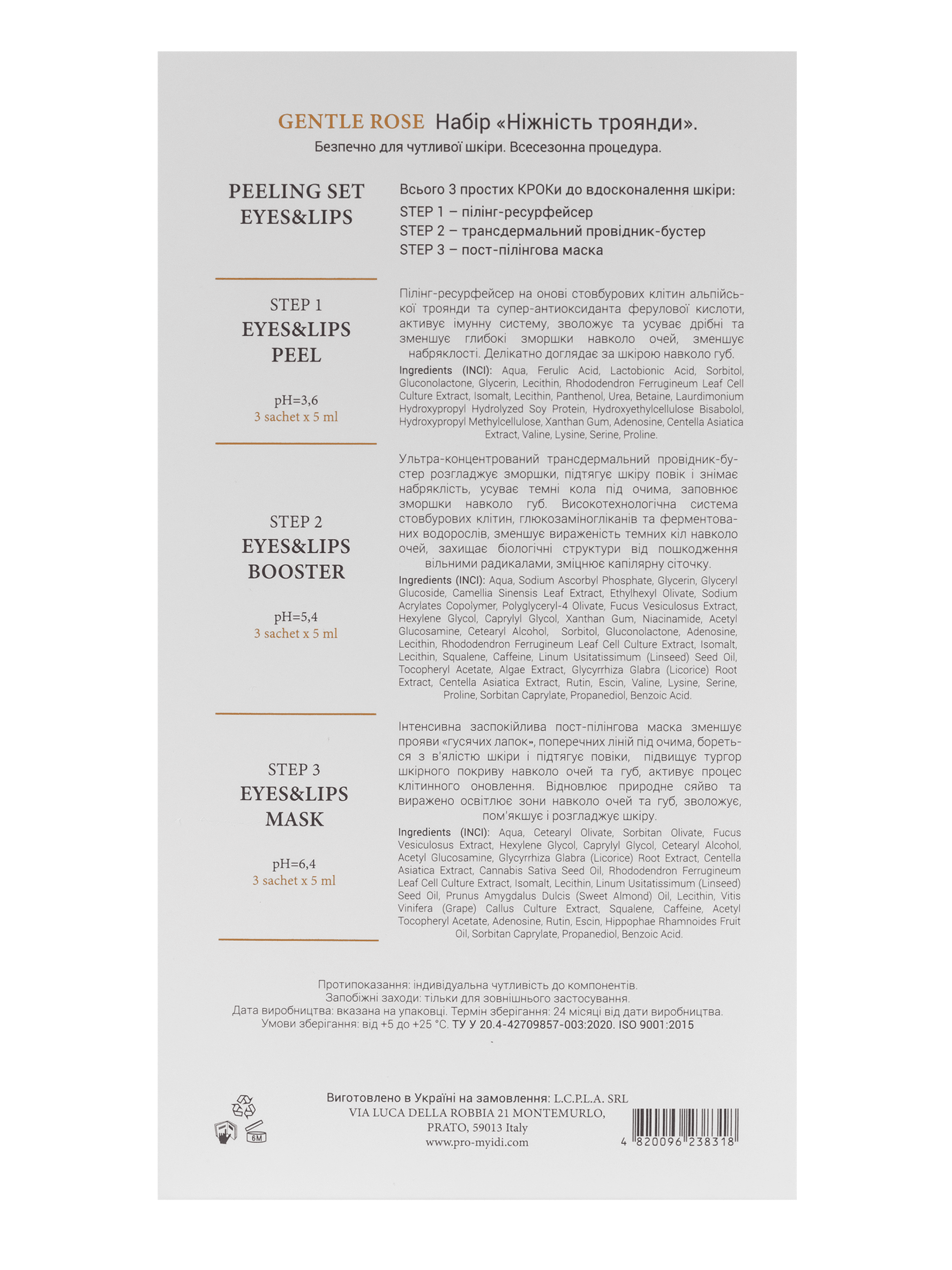 Наполняющий пилинг набор для губ и глаз Нежность розы MYIDI Peeling SET Eyes&Lips, 9x5 ml Салонный уход за кожей на дому. Всего 3 простых шага к усовершенствованию кожи STEP 1 – пилинг-ресурфейсер STEP 2 – трансдермальный проводник-бустер STEP 3 – постпилингова маска ПОКАЗАНИЯ Коррекция возрастных проявлений переорбитальной зоны Отеки, темные круги и видимые сосуды вокруг глаз Фото- и хроностарение Утрата тонуса переорбитальной зоны Догляд за губами та носогубною зоною ШАГ 1. Пилинг-ресурфейсер EYES&LIPS PEEL Пилинг-ресурфейсер на основе стволовых клеток альпийской розы и супер-антиоксиданта феруловой кислоты, активирует иммунную систему, увлажняет и устраняет мелкие и уменьшает глубокие морщинки вокруг глаз, уменьшает отечность. Нежно ухаживает за кожей вокруг губ. INCI: Aqua, Ferulic Acid, Lactobionic Acid, Sorbitol, Gluconolactone, Glycerin, Lecithin, Rhododendron Ferrugineum Leaf Cell Culture Extract, Isomalt, Lecithin, Panthenol, Urea, Betaine, Laurdimonium Hydroxypropyl Hydrolyzed Ava Proline. Шаг 2. Ультраконцентрированный трансдермальный проводник-бустер EYES&LIPS BOOSTER Ультраконцентрированный трансдермальный проводник-бустер разглаживает морщины, подтягивает кожу век и снимает отечность, устраняет темные круги под глазами, заполняет морщины вокруг губ. Высокотехнологичная система стволовых клеток, глюкозаминогликанов и ферментированных водорослей, уменьшает выраженность темных кругов вокруг глаз, защищает биологические структуры от повреждения свободными радикалами, укрепляет капиллярную сеточку. INCI: Aqua, Sodium Ascorbyl Phosphate, Glycerin, Glyceryl Glucoside, Camellia Sinensis Leaf Extract, Ethylhexyl Olivate, Sodium Acrylates Copolymer, Polyglyceryl-4 Olivate, Fucus Vesiculosus Extract, Hexylene Glycol, Xexylene Glycol , Rhododendron Ferrugineum Leaf Cell Culture Extract, Isomalt, Lecithin, Squalene, Caffeine, Linum Usitatissimum (Linseed) Seed Oil, Tocopheryl Acetate, Alga Asiatica Extract, Rutin, Escin, Valine, Lysine, Serine, Proline, Sorbit . Шаг 3. Интенсивная успокаивающая постпилинговая маска EYES&LIPS MASK Интенсивная успокаивающая постпилинговая маска уменьшает проявления «гусиных кавычек», поперечных линий под глазами, борется с дряблостью кожи и подтягивает веки, повышает тургор кожного покрова вокруг глаз и губ, активирует процесс клеточного обновления. Восстанавливает природное сияние и выраженно осветляет зоны вокруг глаз и губ, увлажняет, смягчает и разглаживает кожу. INCI: Aqua, Cetearyl Olivate, Sorbitan Olivate, Fucus Vesiculosus Extract, Hexylene Glycol, Caprylyl Glycol, Cetearyl Alcohol, Acetyl Glucosamine, Glycyrrhiza Glabra (Licorice) Root Extract, Centella Asiatica Extract culture Extract, Oil, Prunus Amygdalus Dulcis (Sweet Almond) Oil, Lecithin, Vitis Vinifera (Grape) Callus Culture Extract, Squalene, Caffeine, Acetyl Tocopheryl Aceta Rhamnoides Fruit Oil, Sorbitan Caprylate, Propanediol, Benzoic Acid.